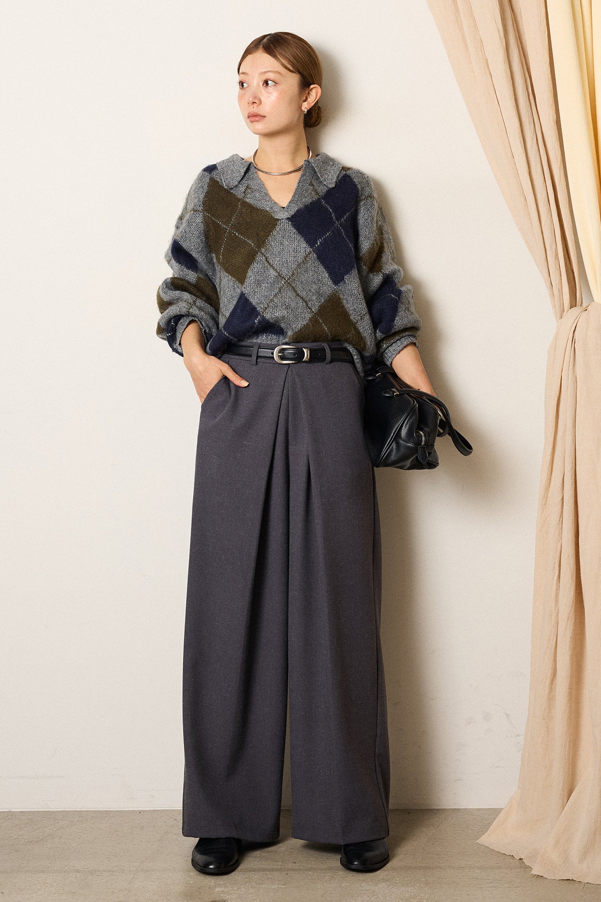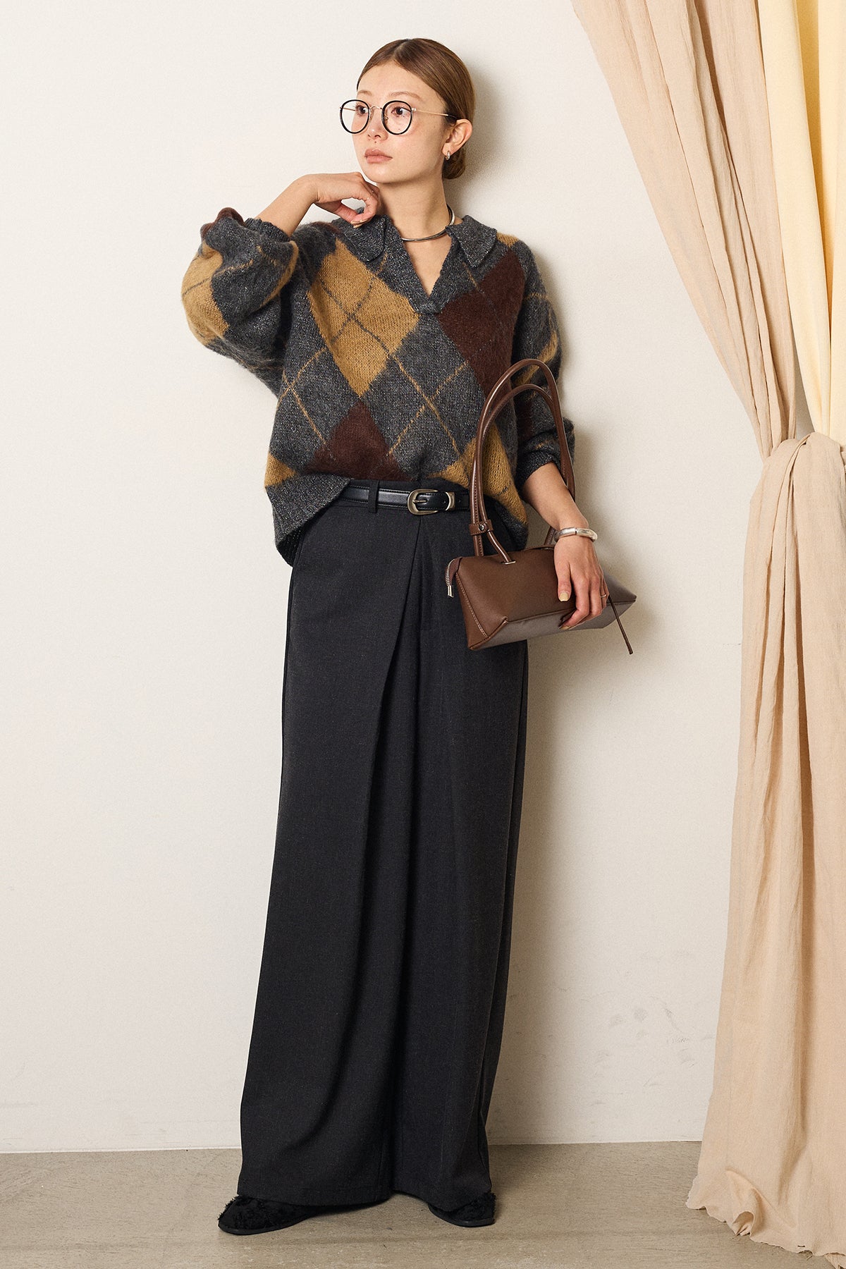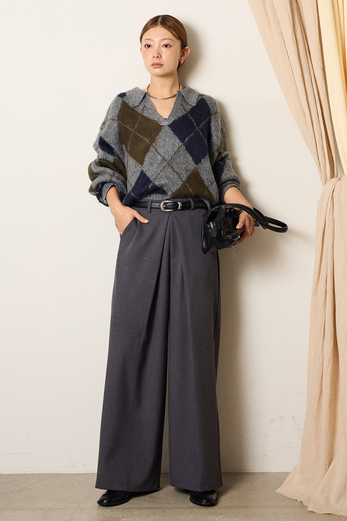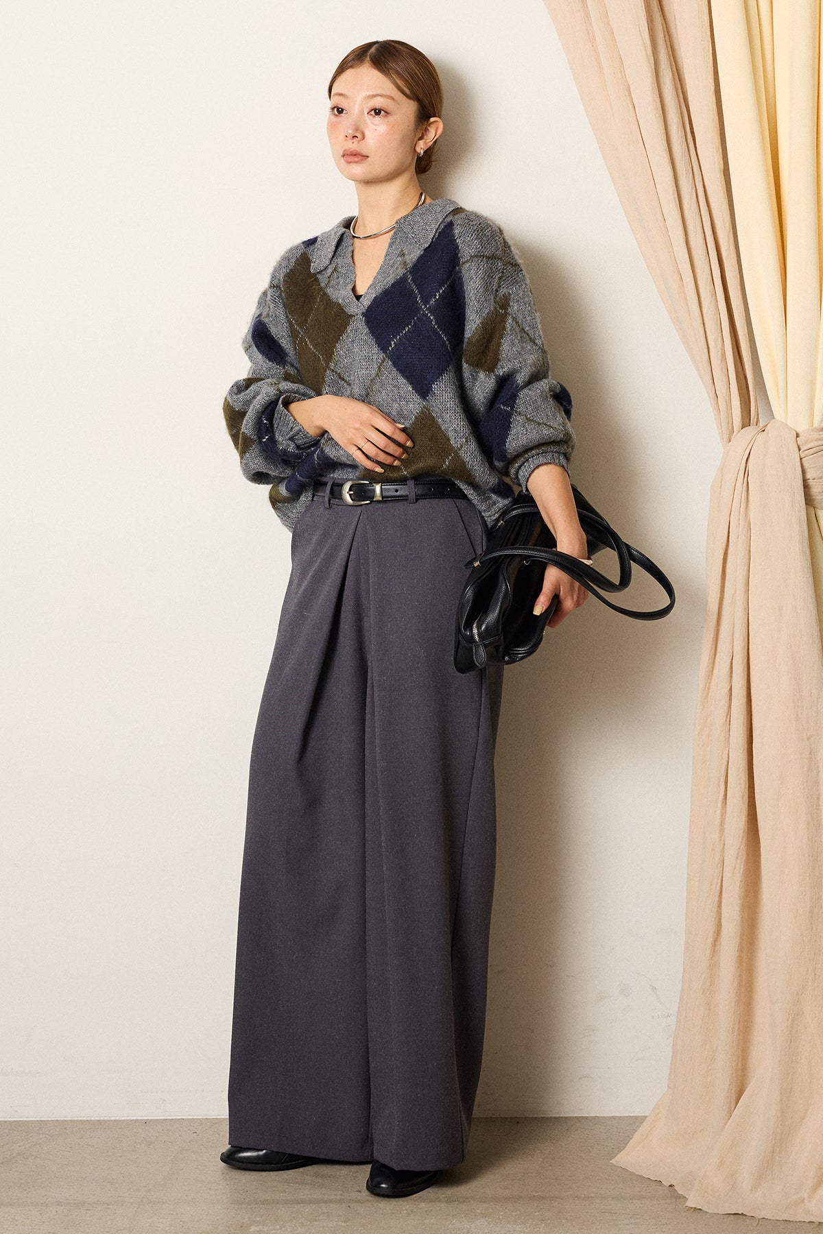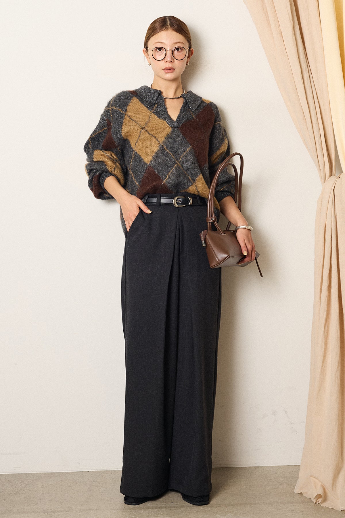 [SET]アクリルモヘアアーガイルキーネックプルオーバー+フロントワイドタックネップ入ワイドパンツ(2set)