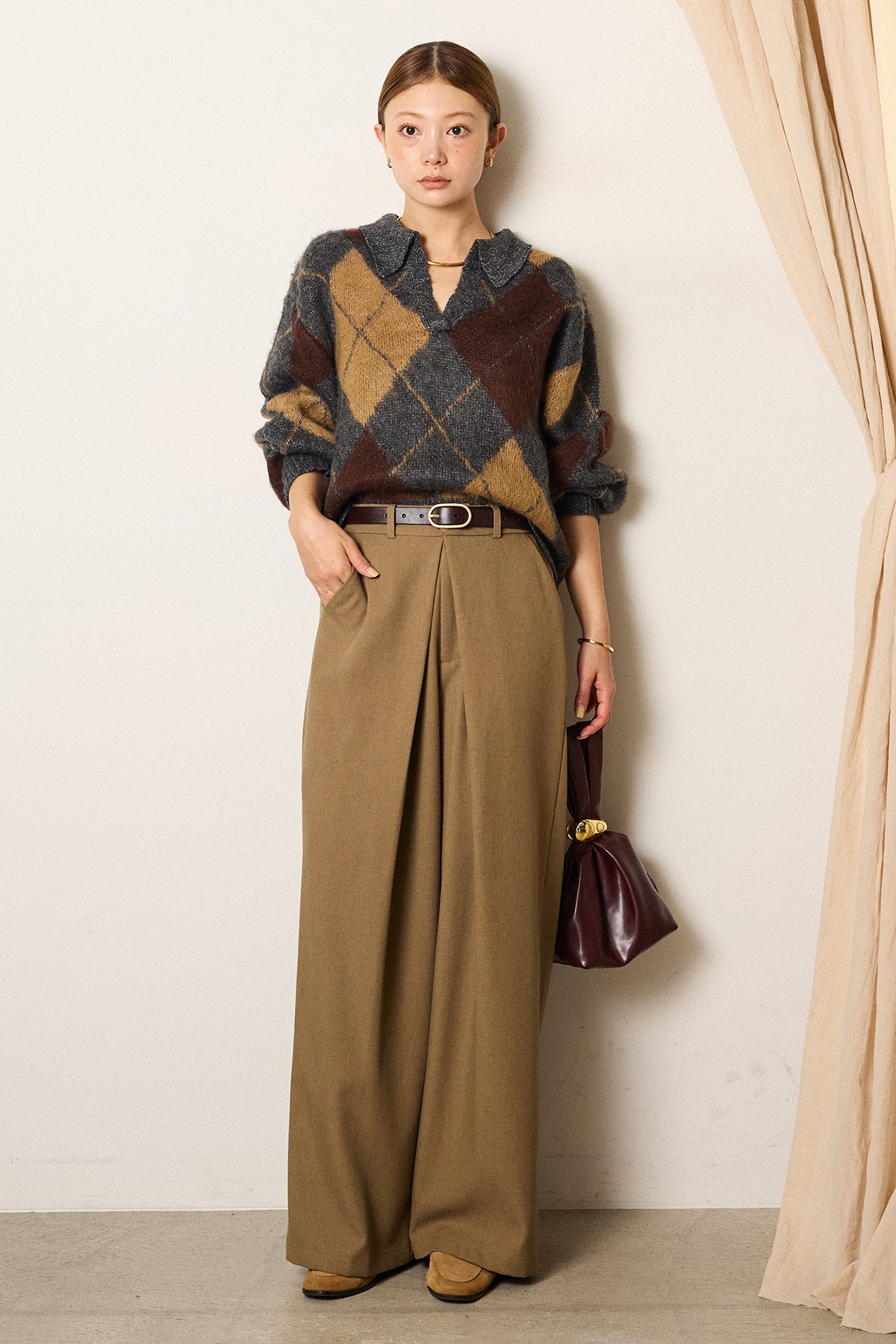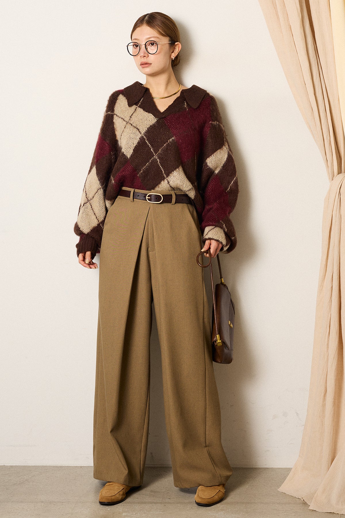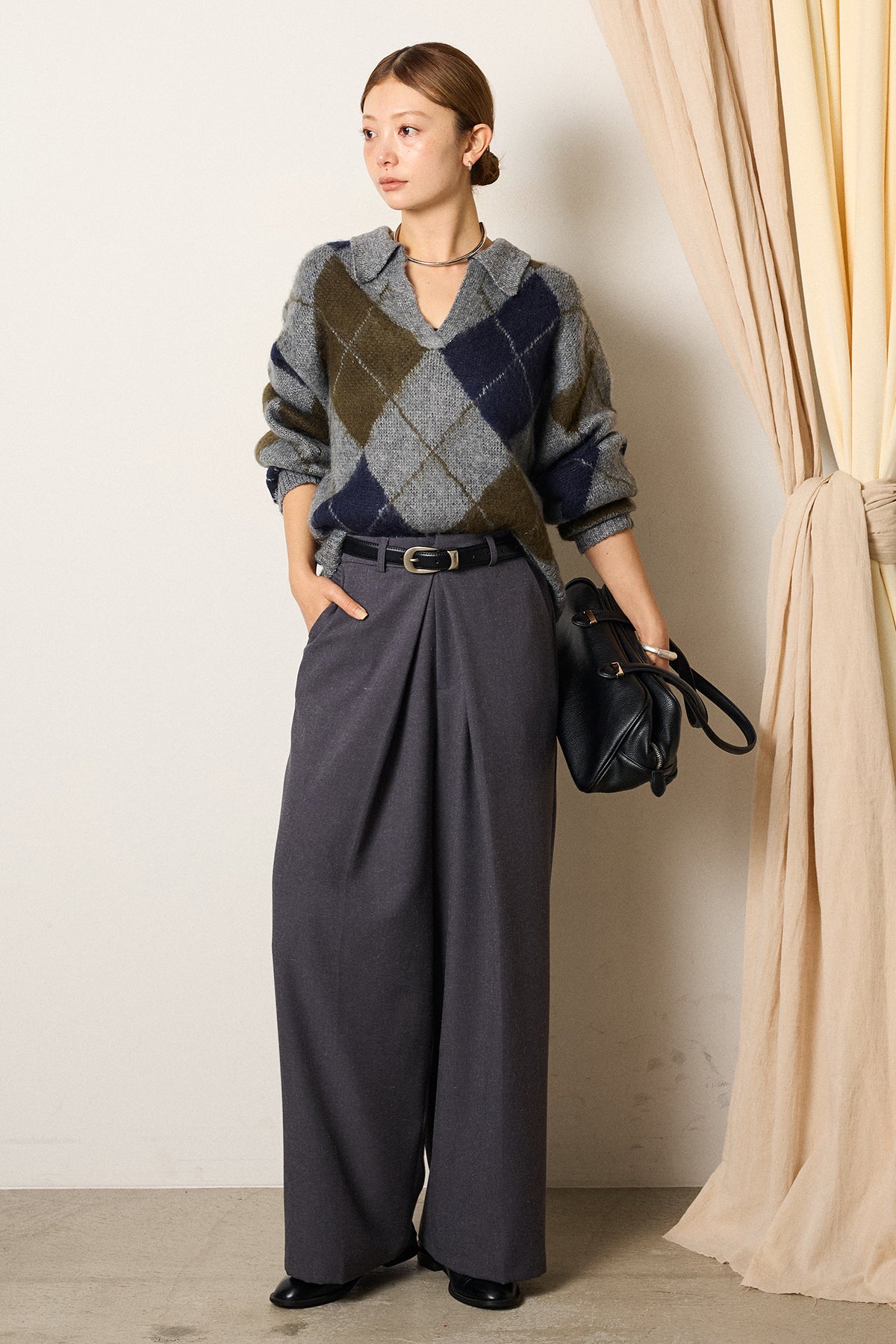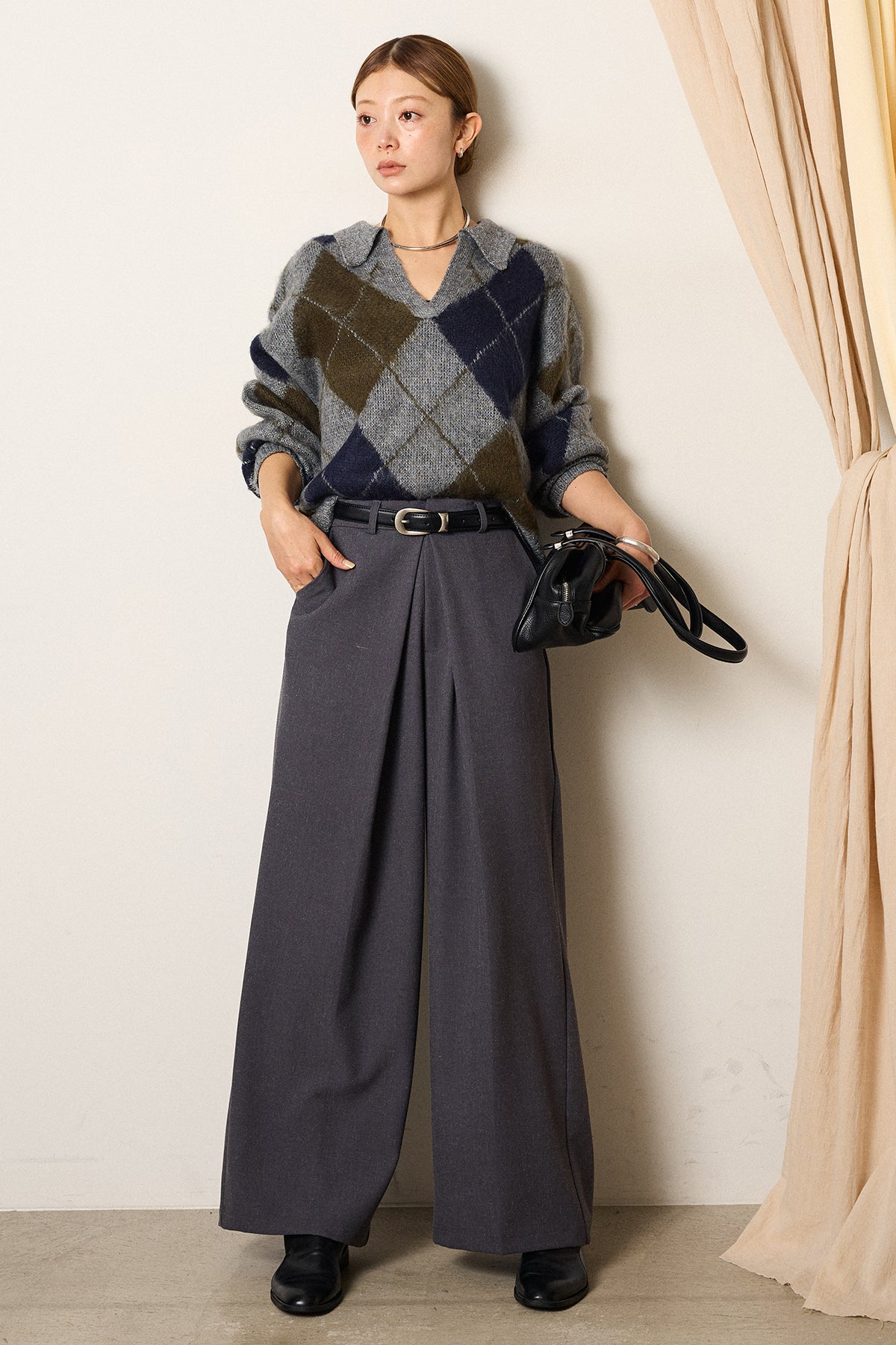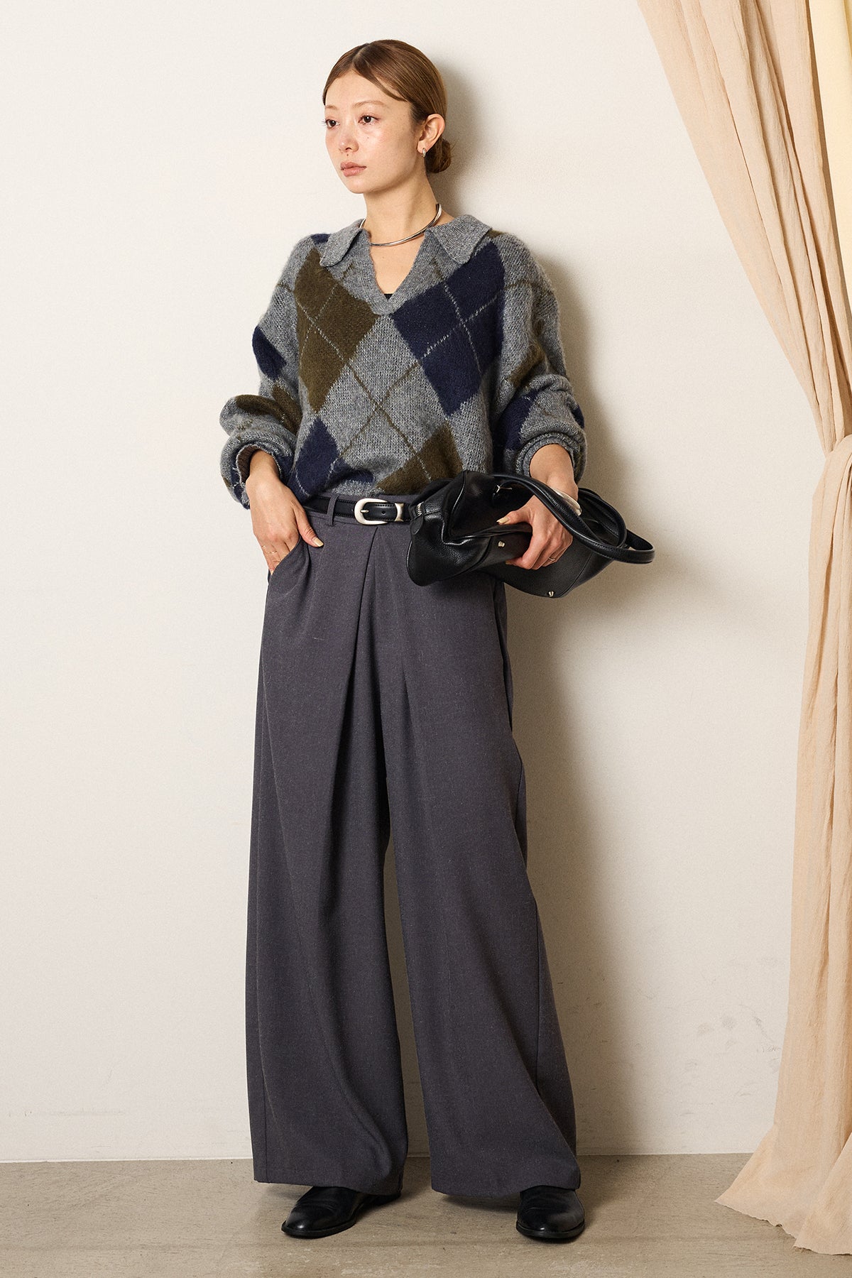 [SET]アクリルモヘアアーガイルキーネックプルオーバー+フロントワイドタックネップ入ワイドパンツ(2set)