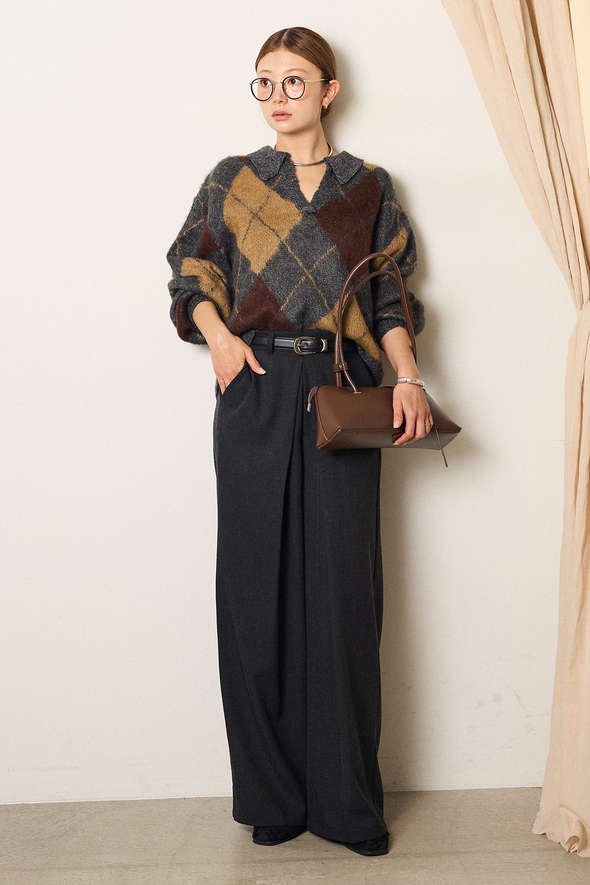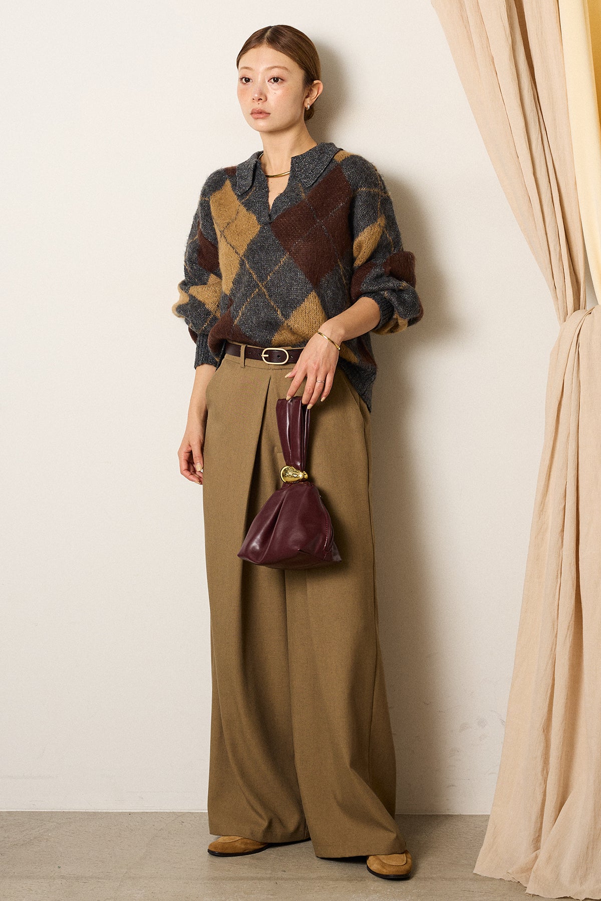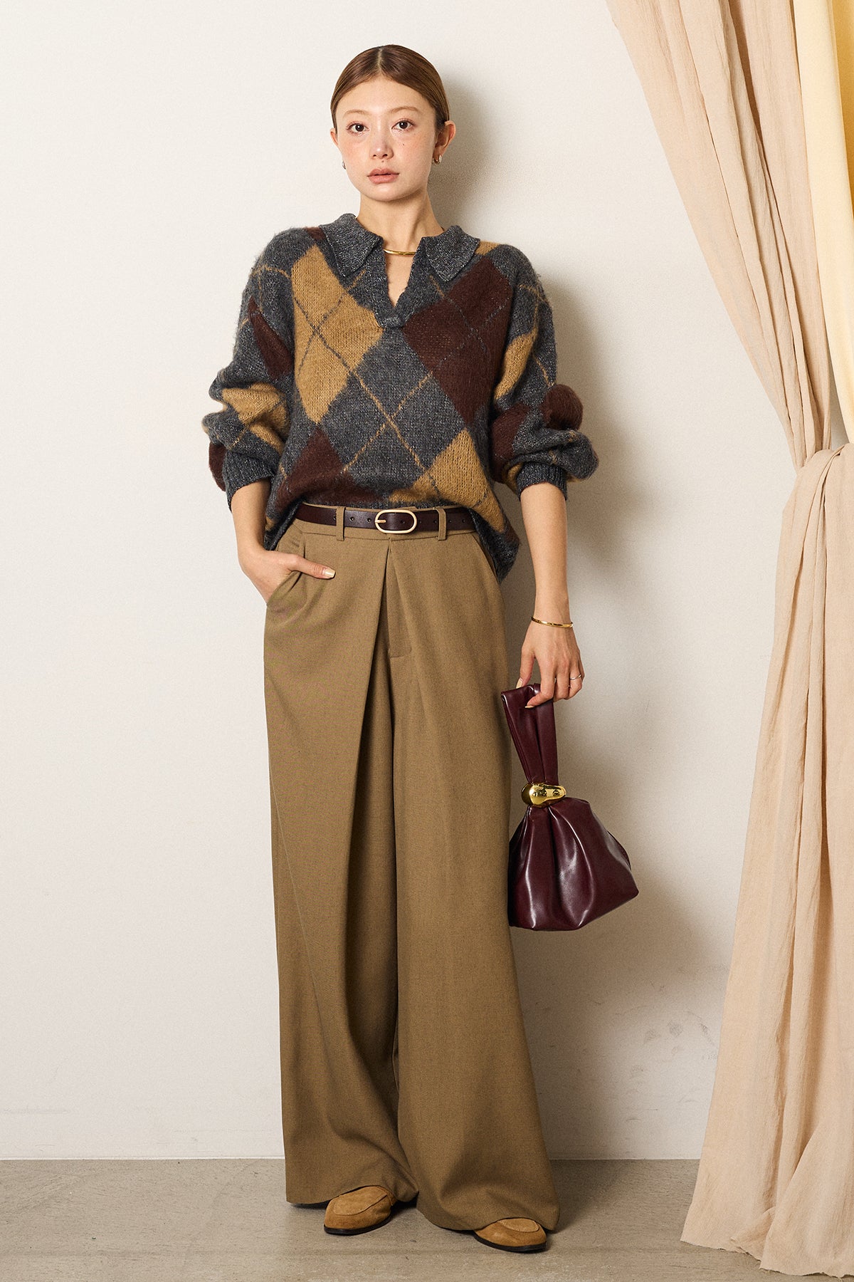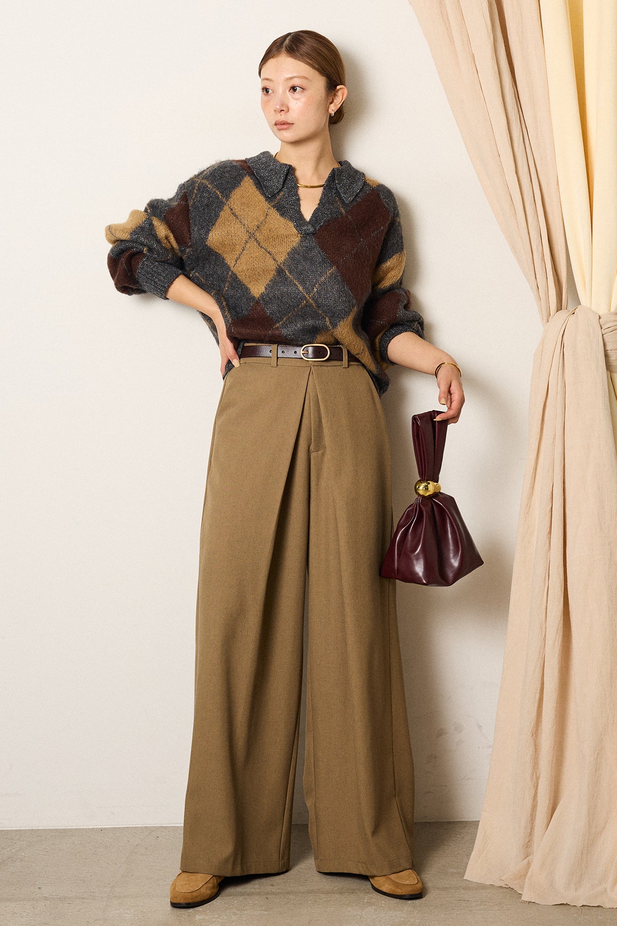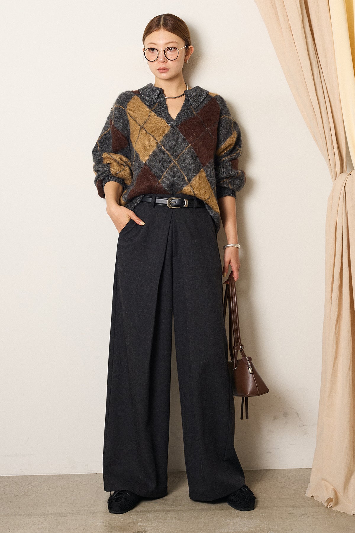 [SET]アクリルモヘアアーガイルキーネックプルオーバー+フロントワイドタックネップ入ワイドパンツ(2set)