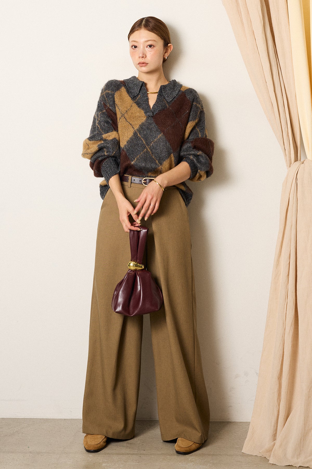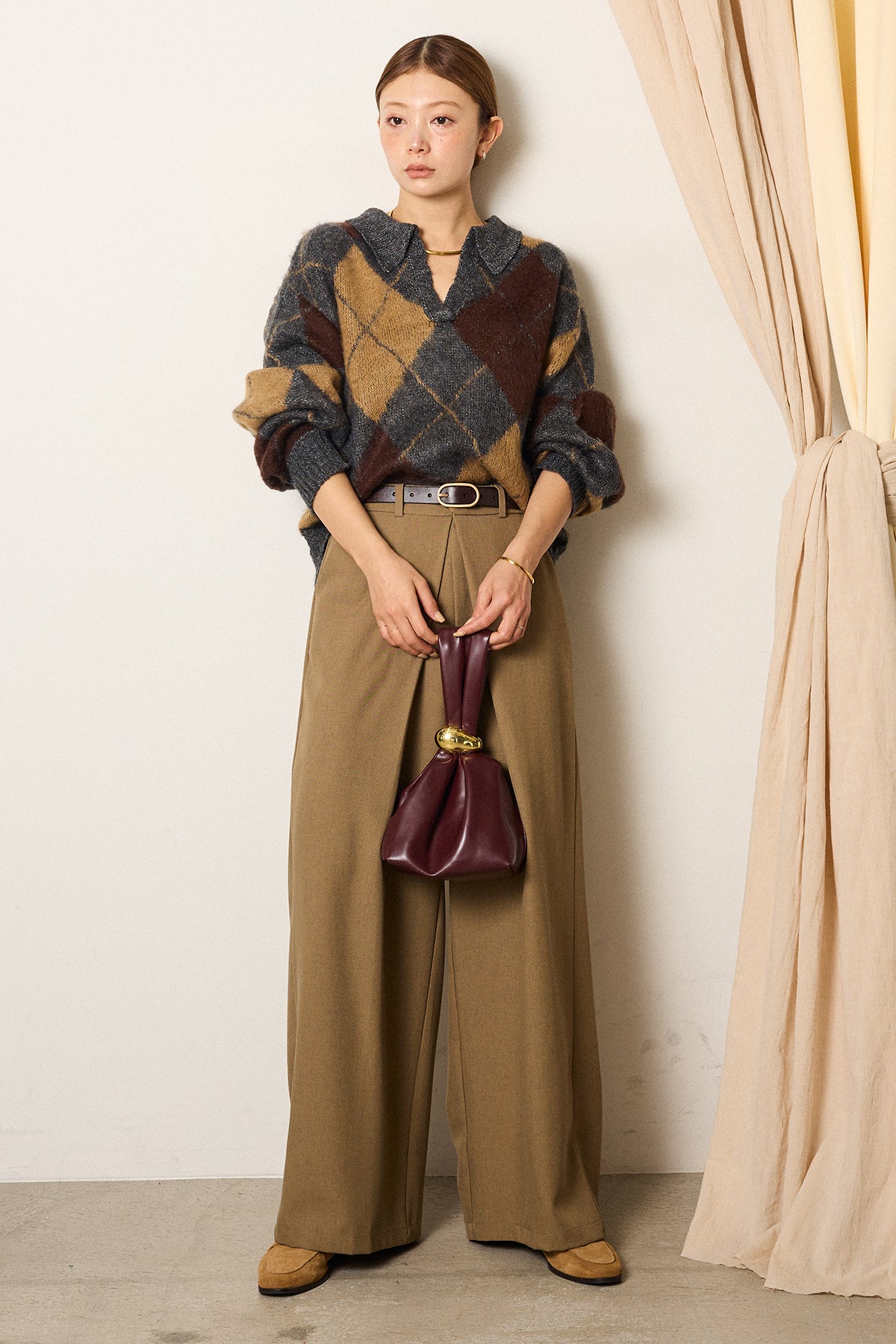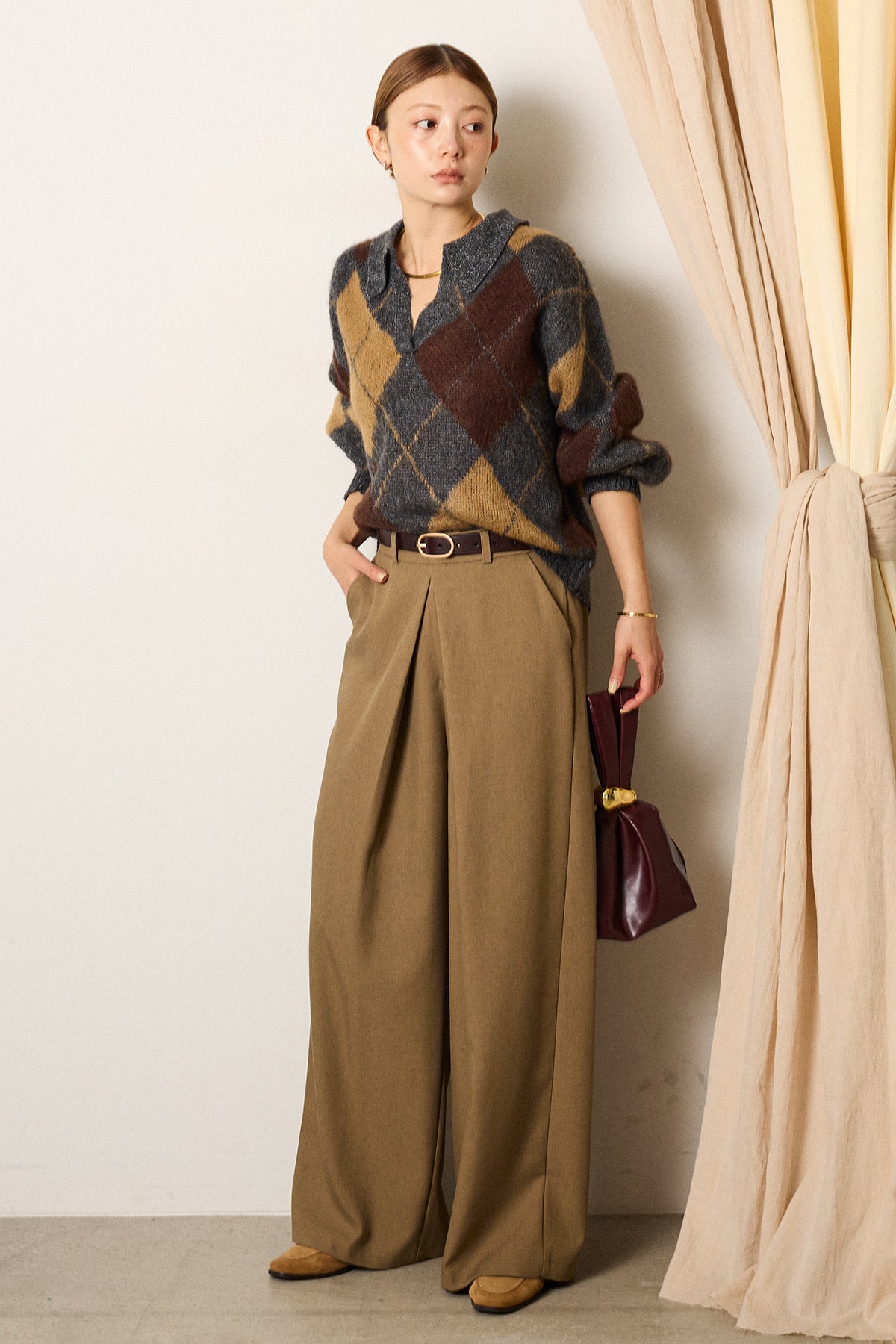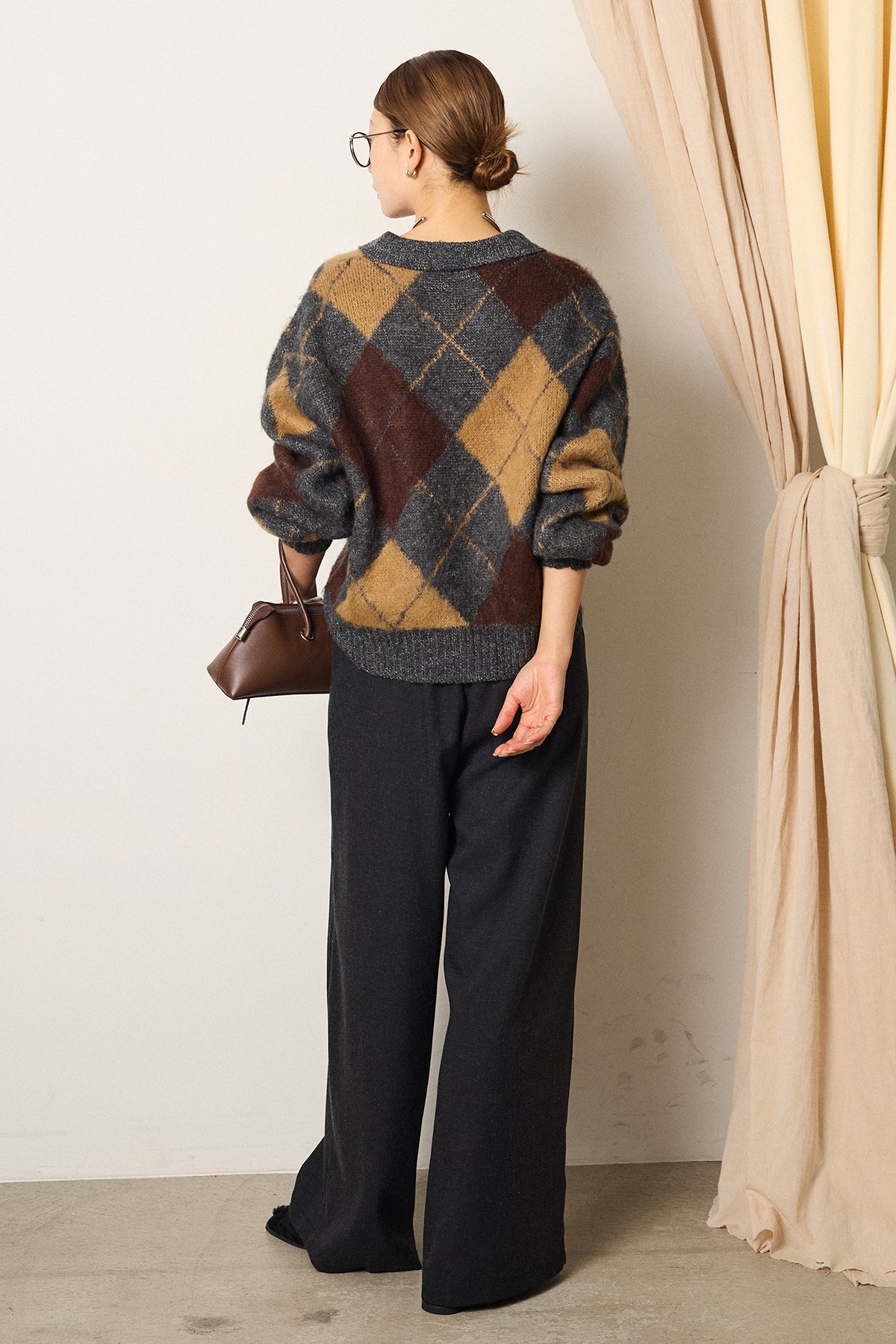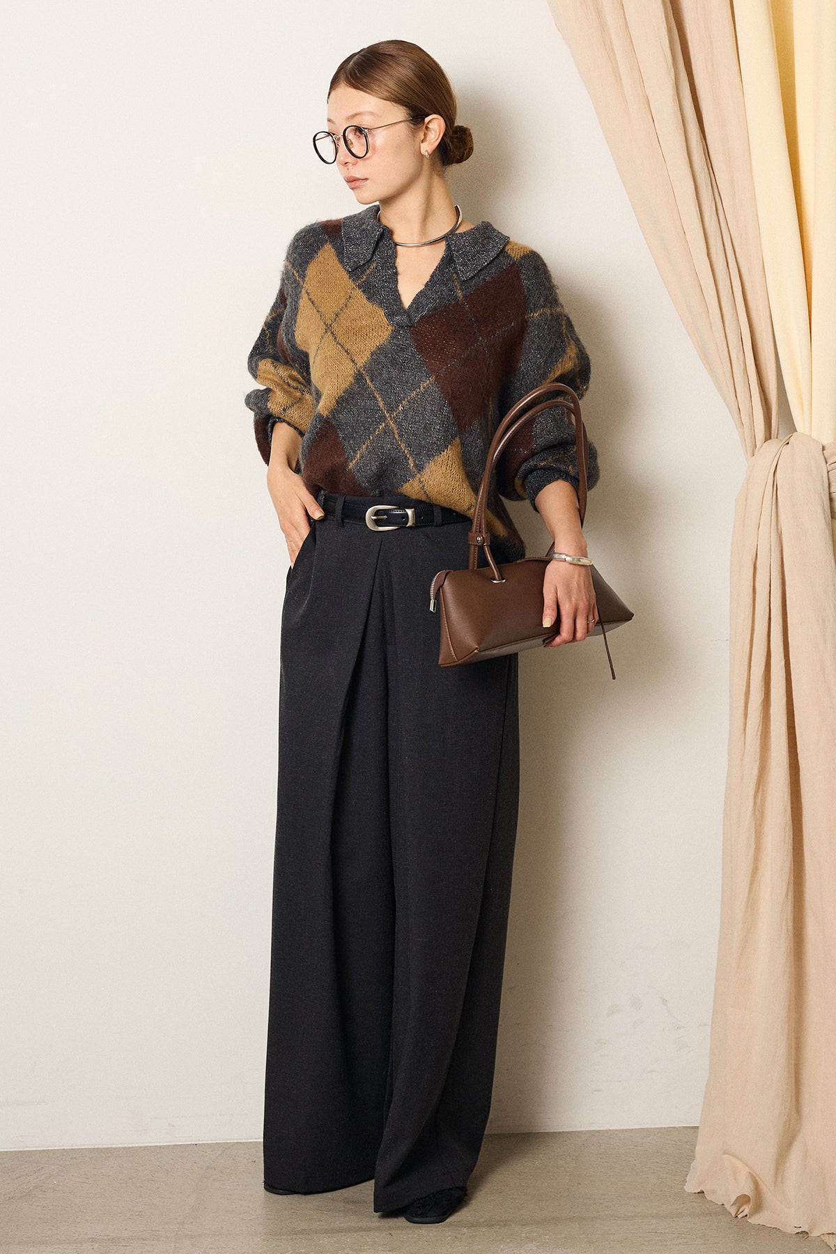 [SET]アクリルモヘアアーガイルキーネックプルオーバー+フロントワイドタックネップ入ワイドパンツ(2set)