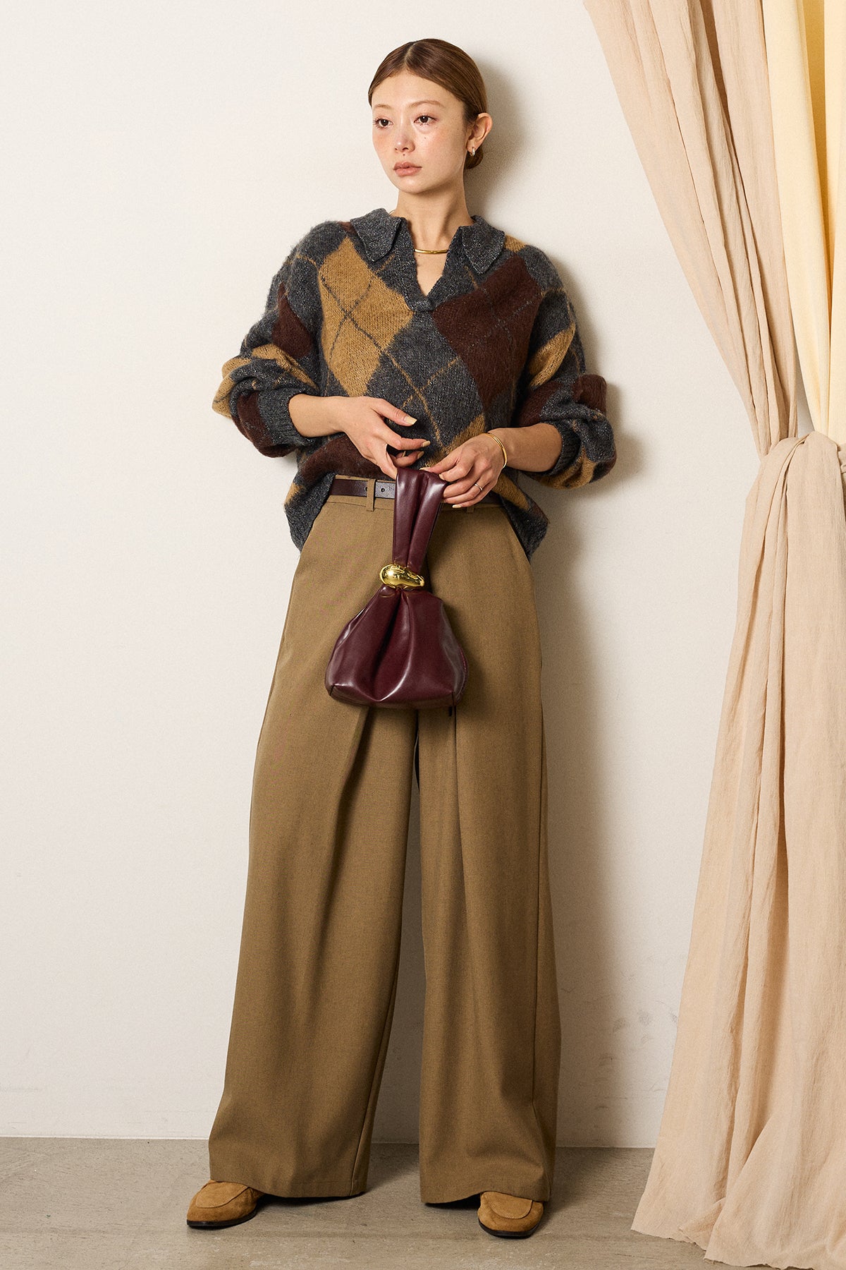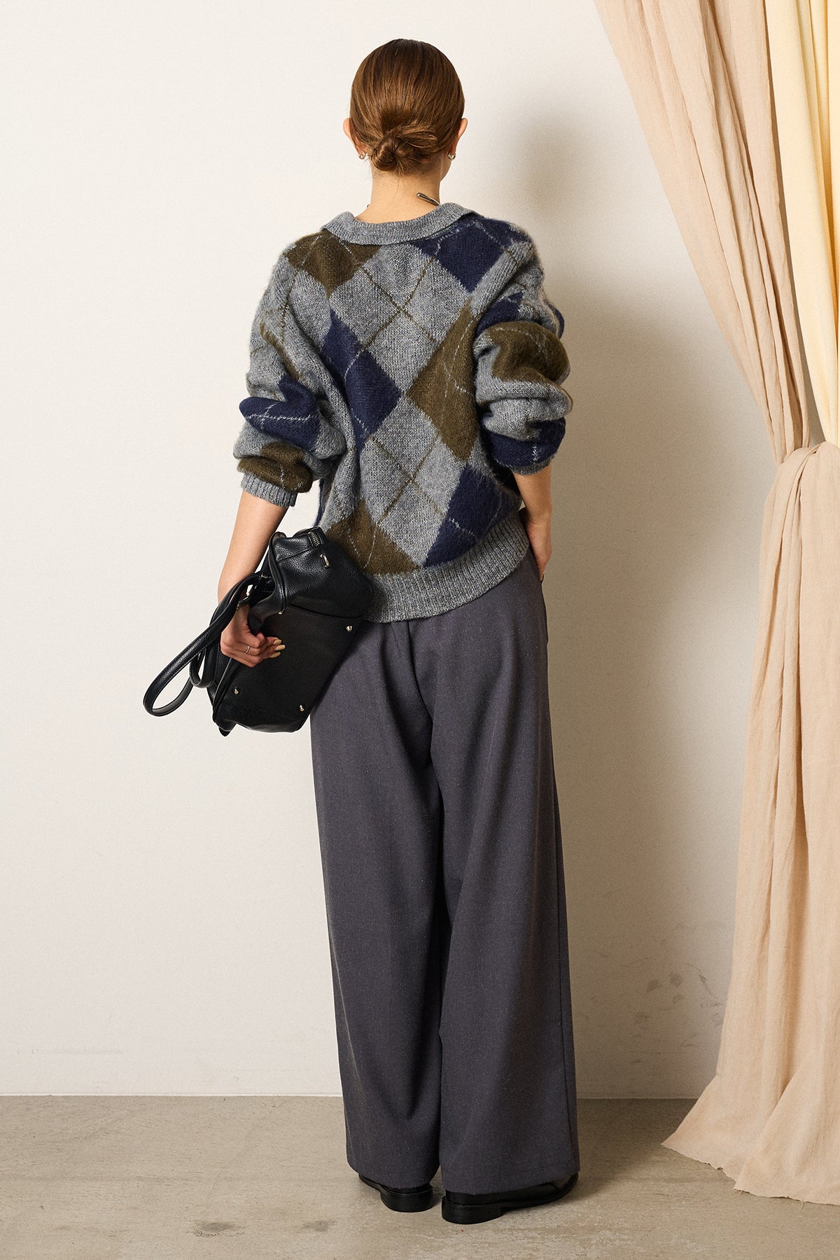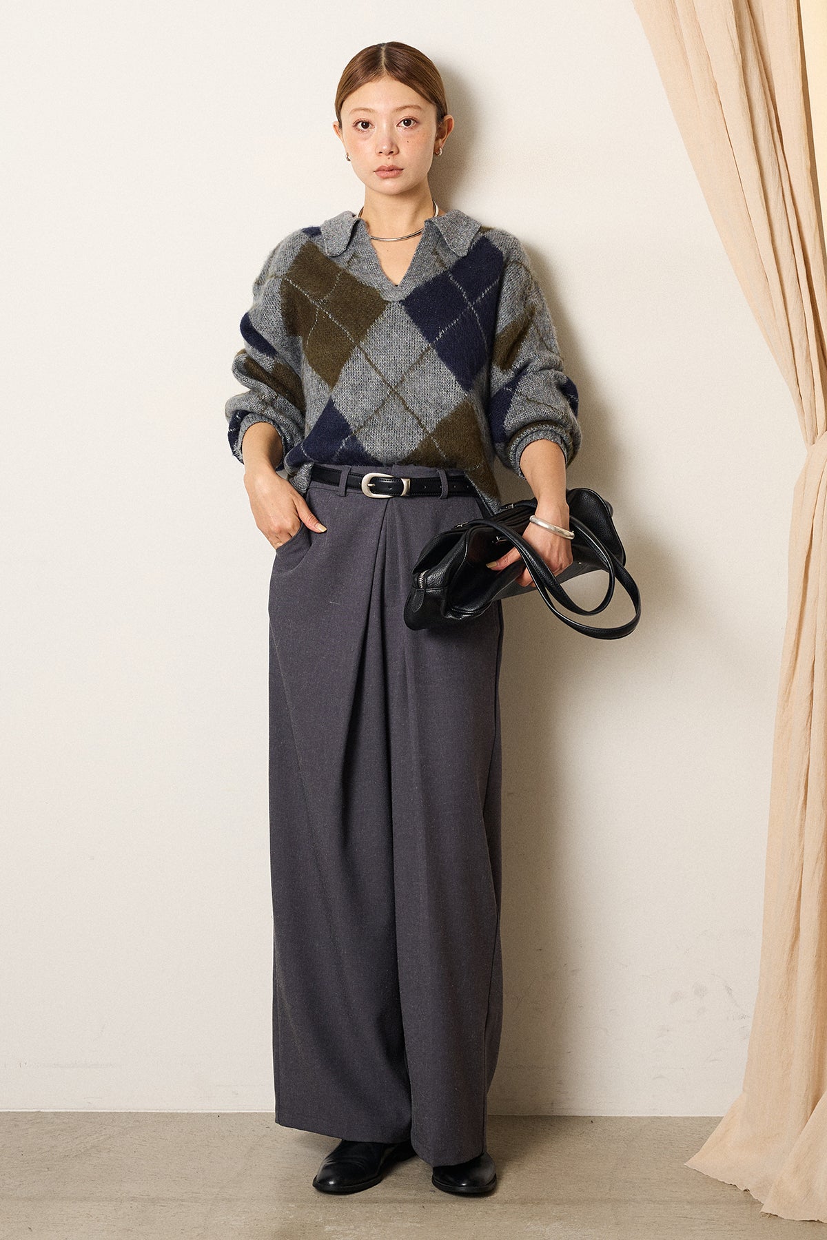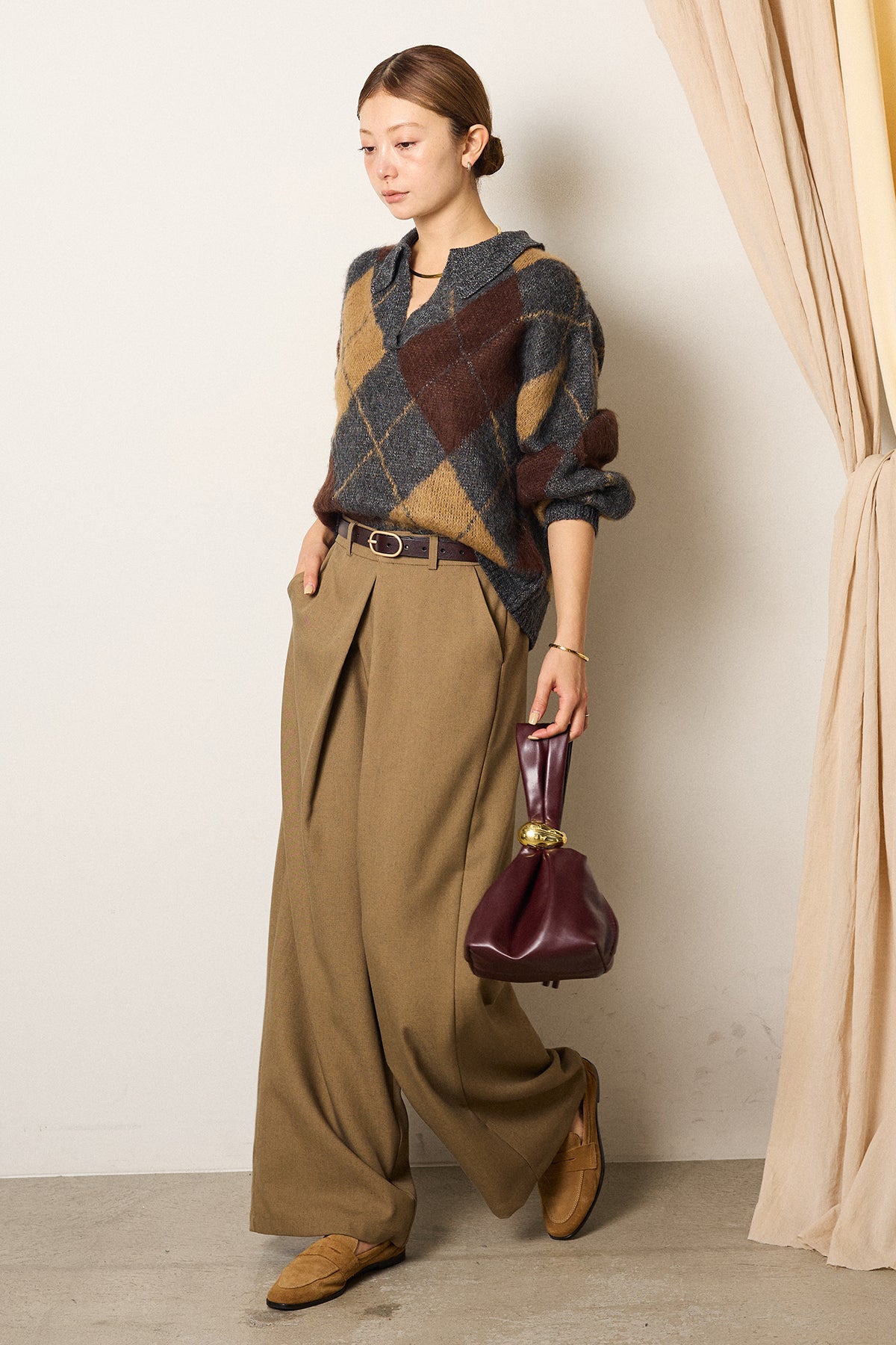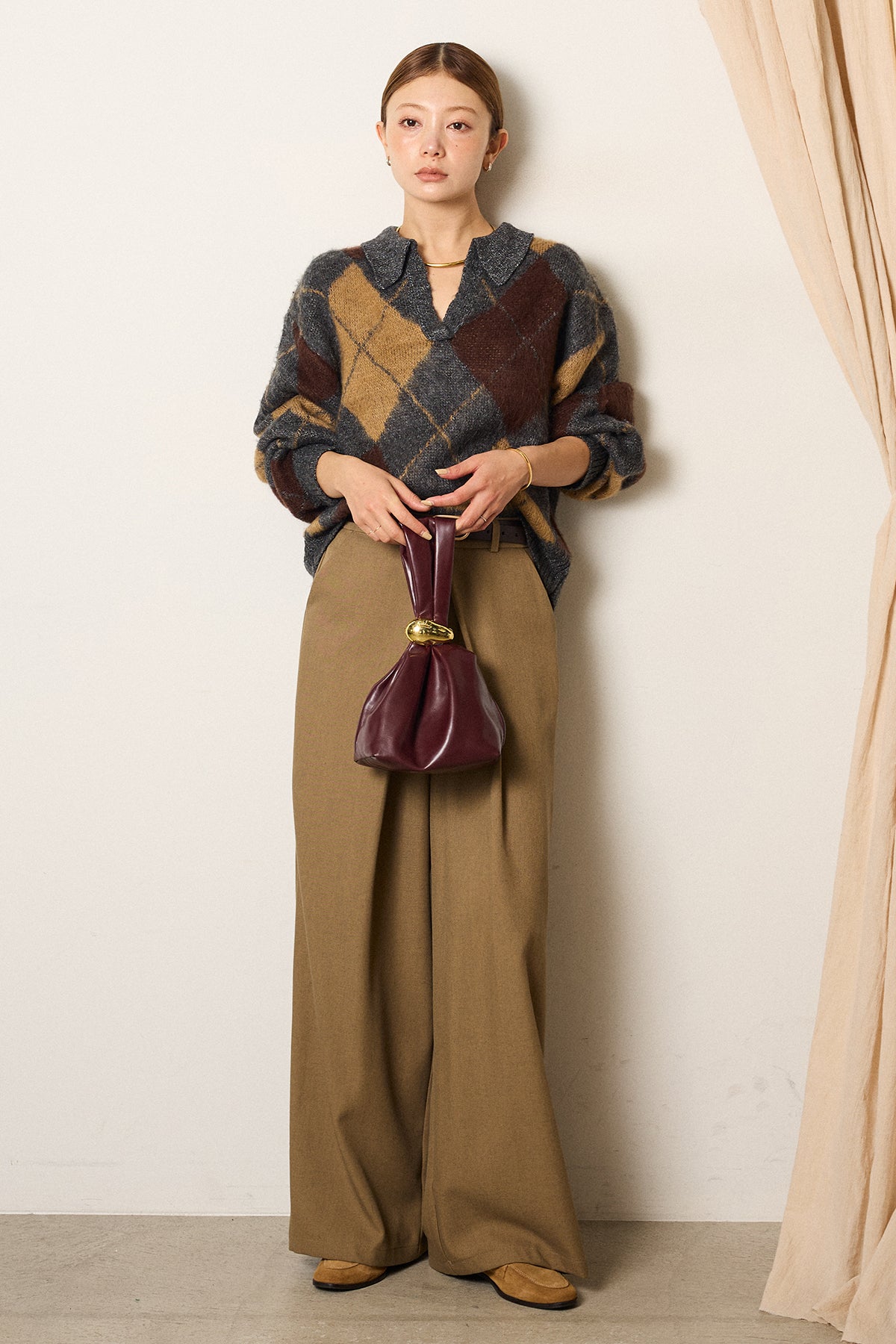 [SET]アクリルモヘアアーガイルキーネックプルオーバー+フロントワイドタックネップ入ワイドパンツ(2set)