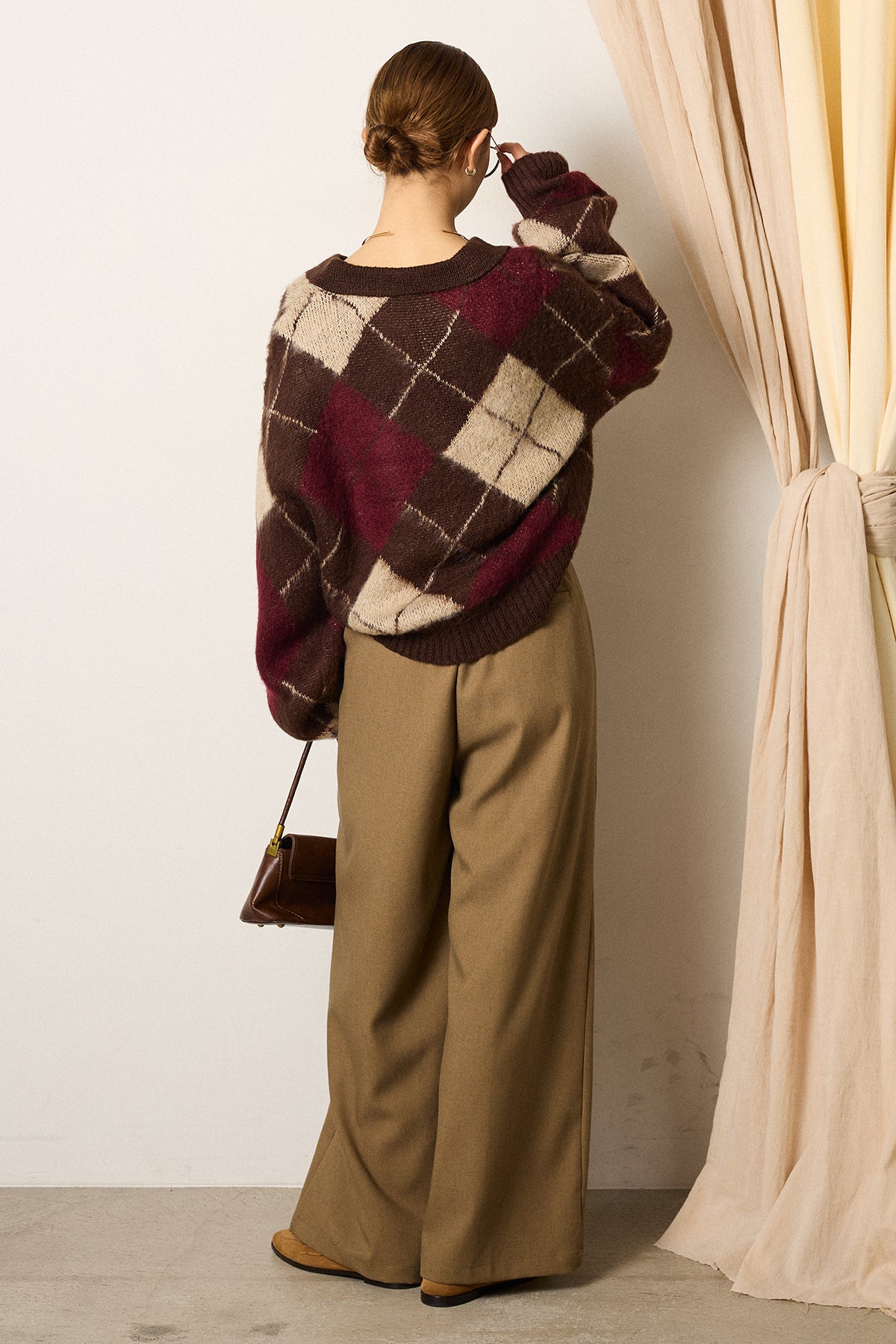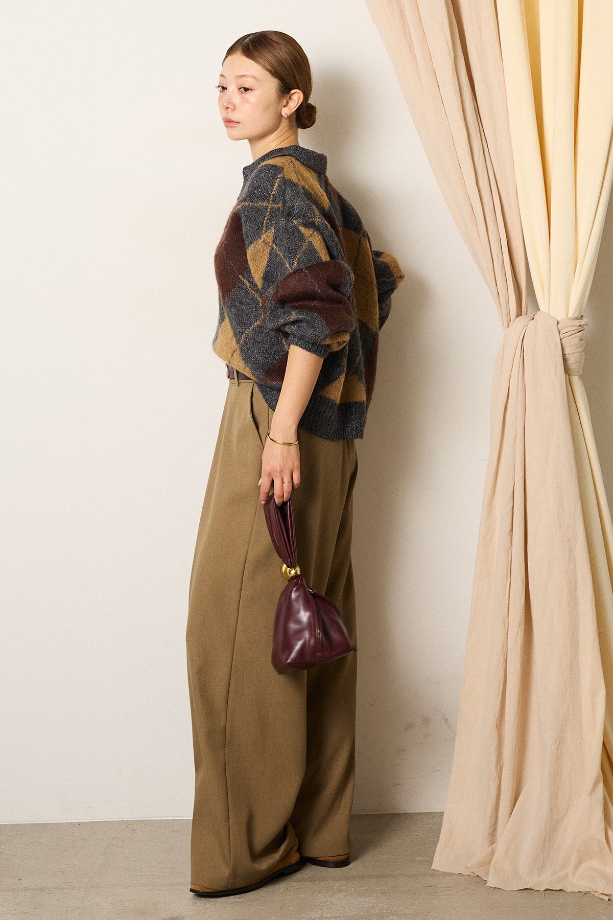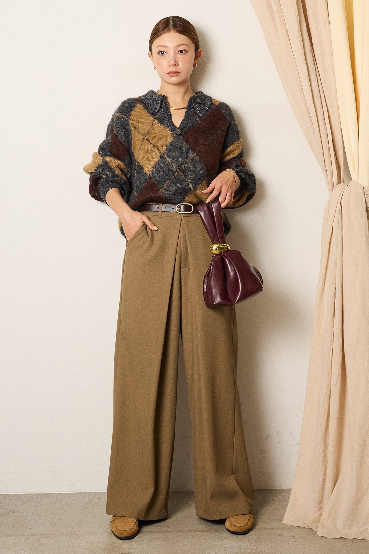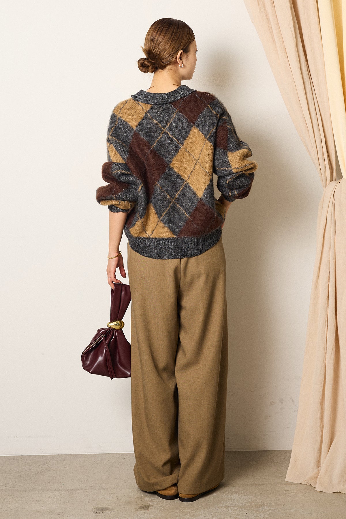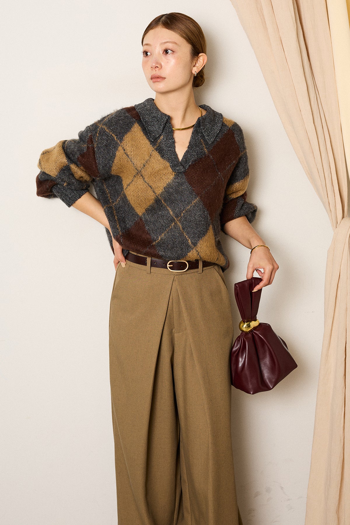 [SET]アクリルモヘアアーガイルキーネックプルオーバー+フロントワイドタックネップ入ワイドパンツ(2set)