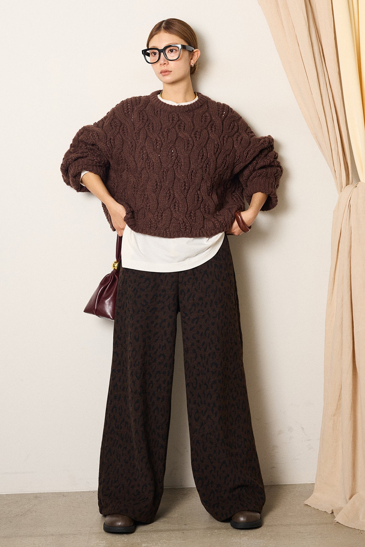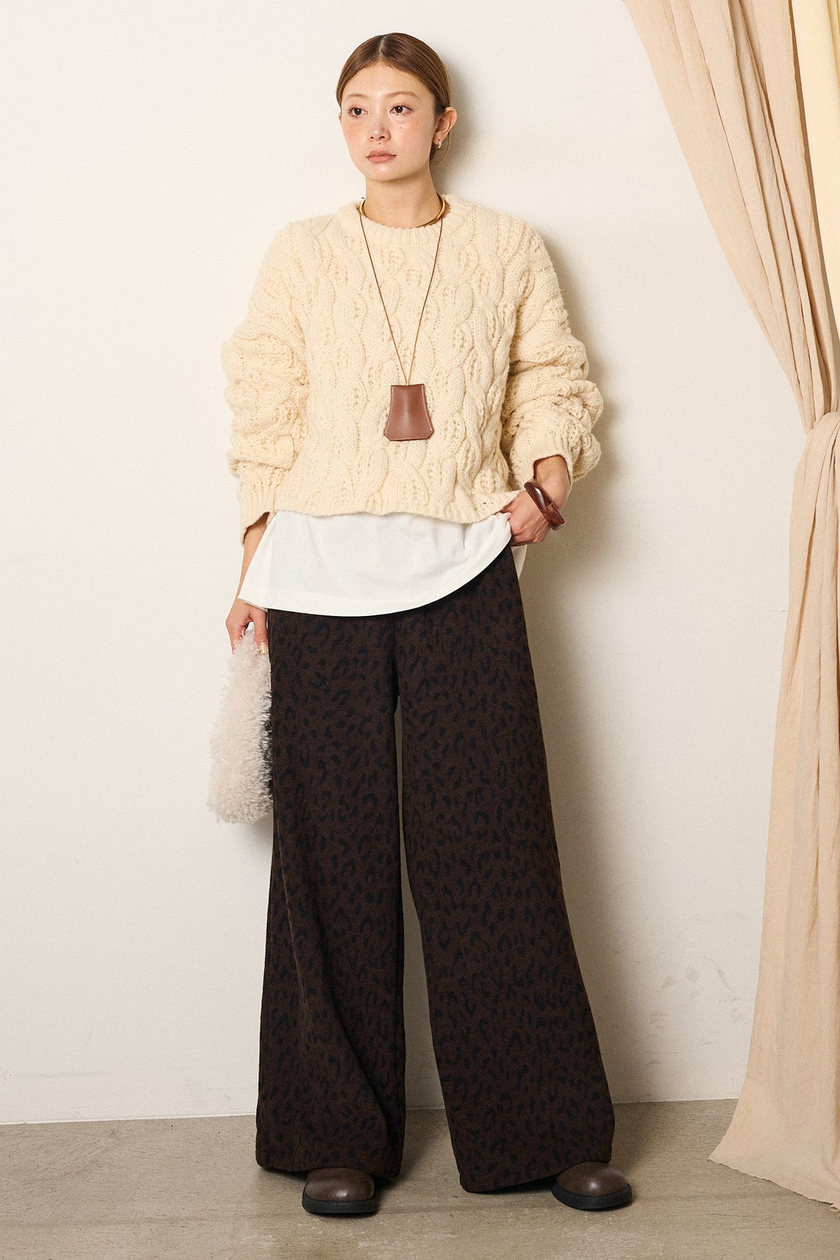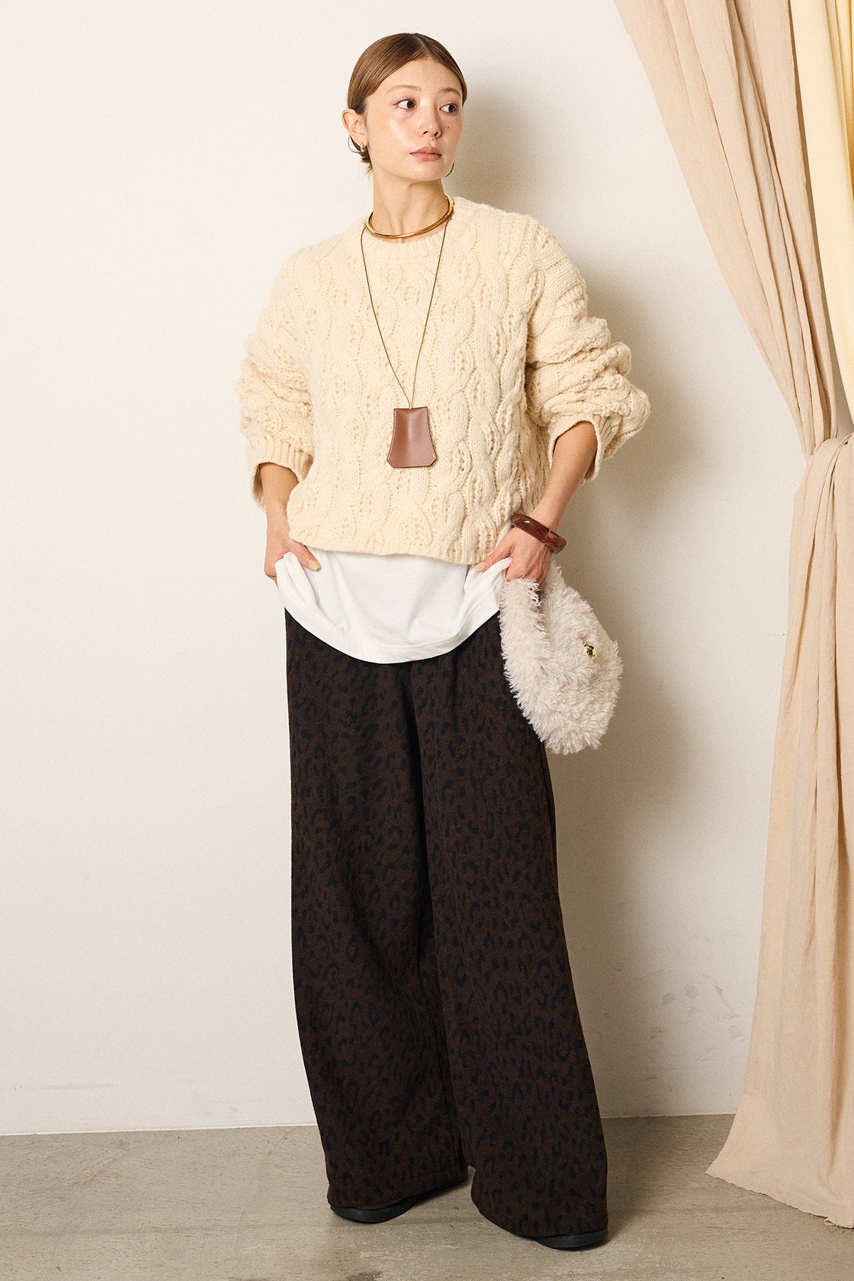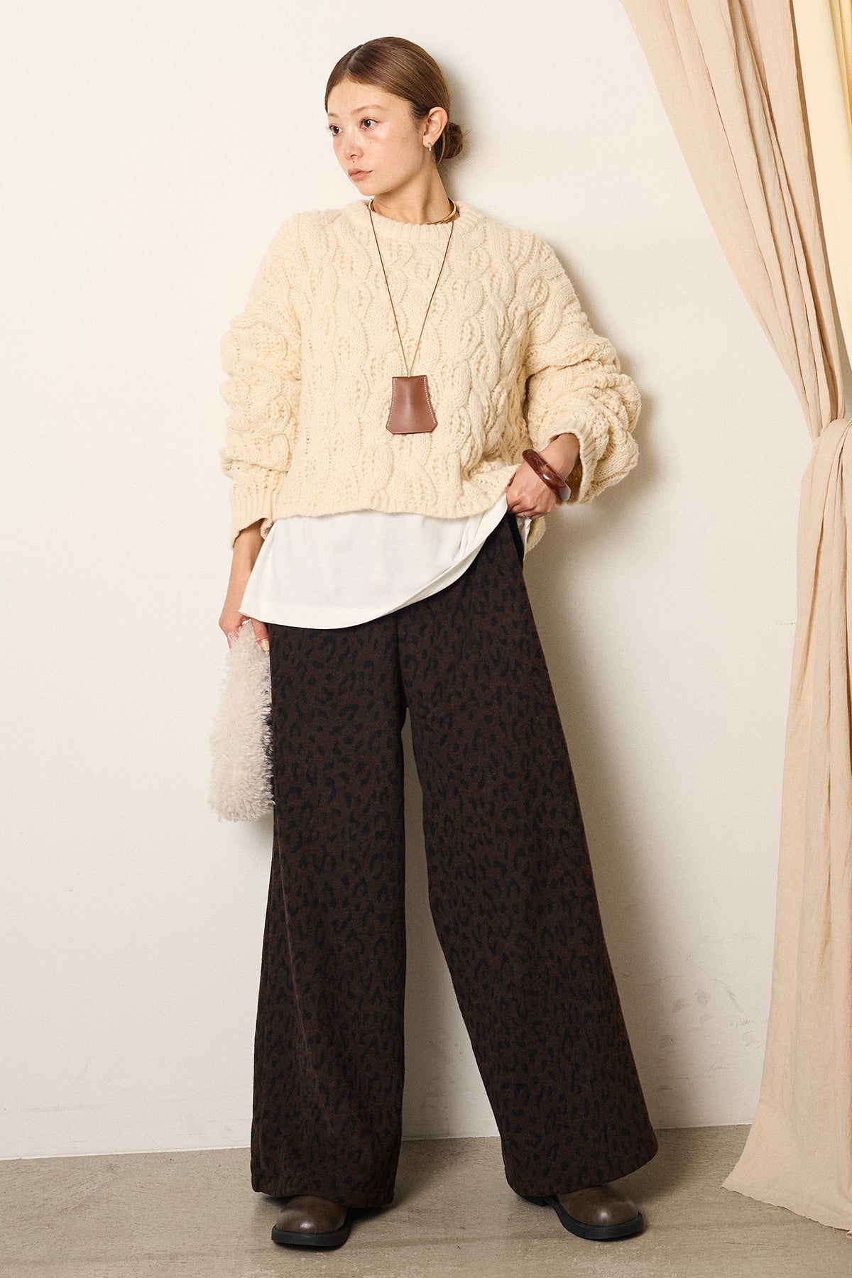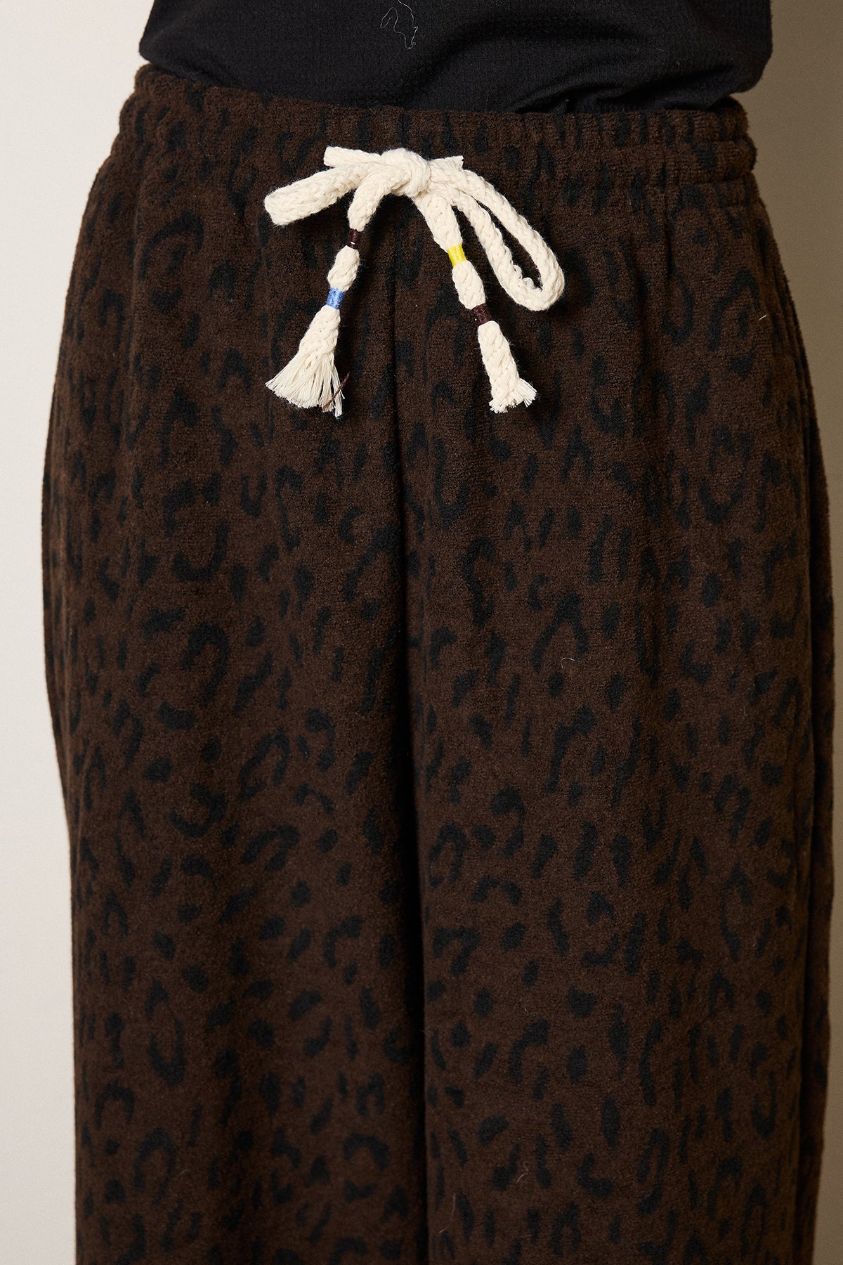 レオパード柄をジャガードで表現したニットパンツ。 程よい厚みと柔らかさのある素材で、リラックス感のある穿き心地が魅力です。 ウエストはドローストリング仕様で調整がしやすく、こなれた雰囲気をプラス。 シンプルなトップスを合わせるだけで、存在感のあるスタイルが完成します。 大人の抜け感を楽しめる、シーズンムード漂うアイテムです。
