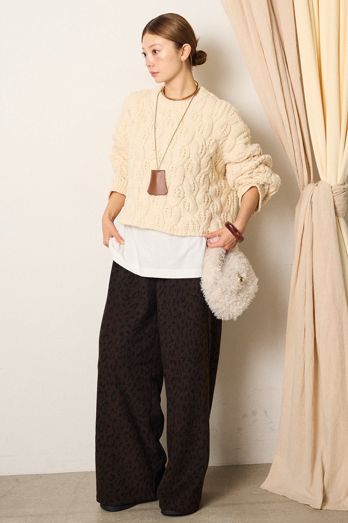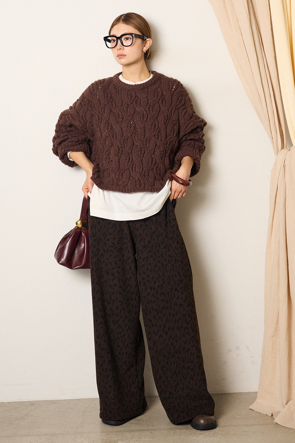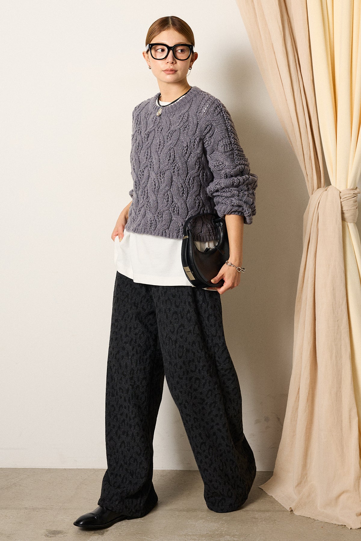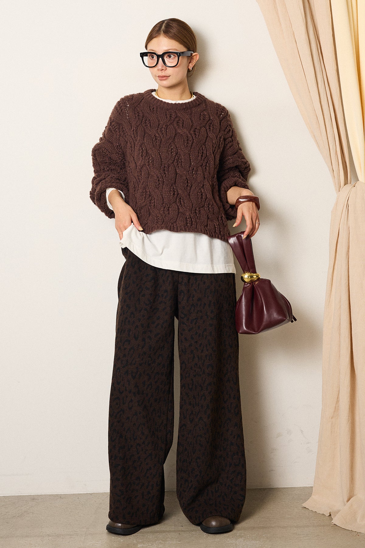 レオパード柄をジャガードで表現したニットパンツ。 程よい厚みと柔らかさのある素材で、リラックス感のある穿き心地が魅力です。 ウエストはドローストリング仕様で調整がしやすく、こなれた雰囲気をプラス。 シンプルなトップスを合わせるだけで、存在感のあるスタイルが完成します。 大人の抜け感を楽しめる、シーズンムード漂うアイテムです。