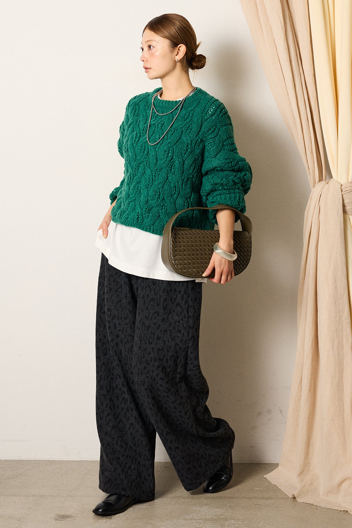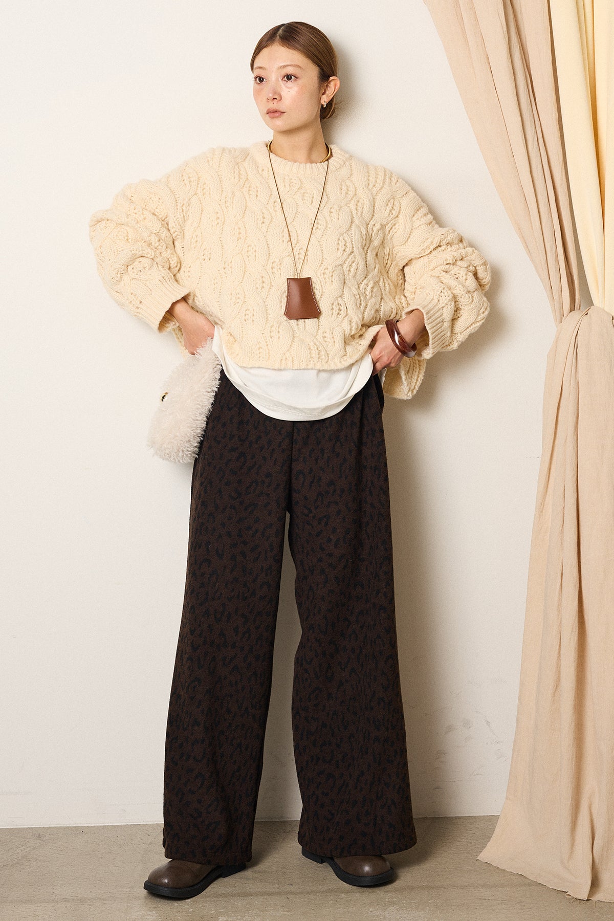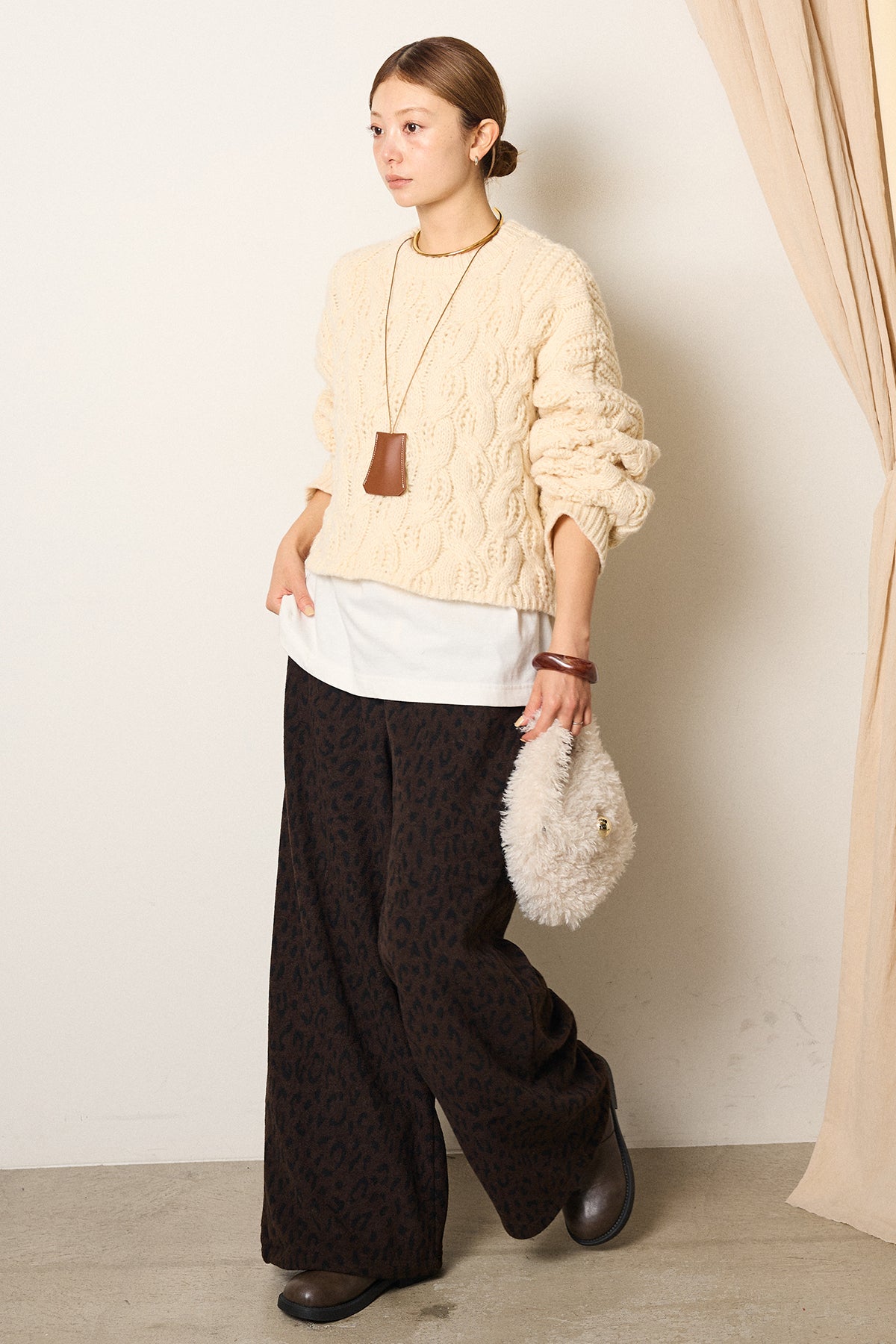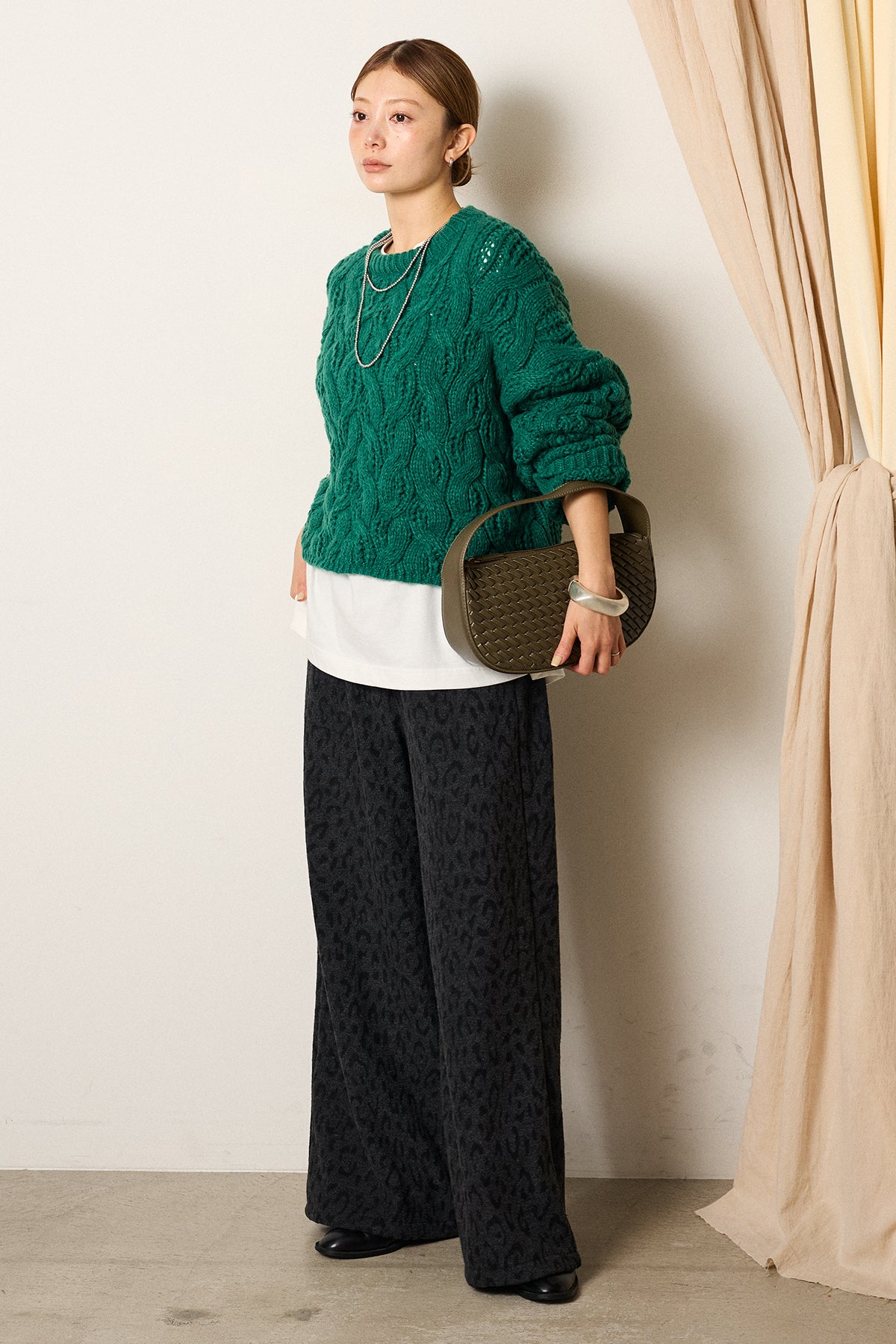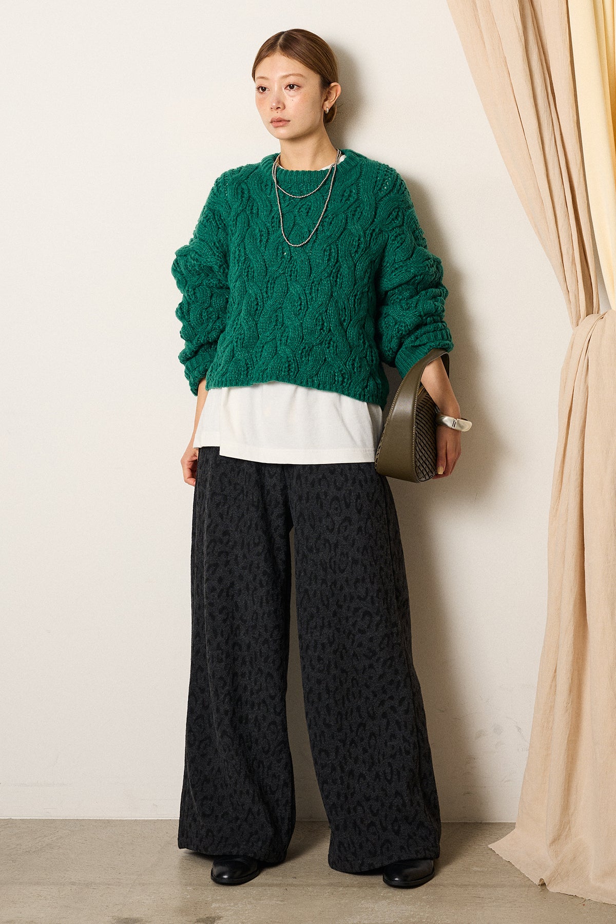 レオパード柄をジャガードで表現したニットパンツ。 程よい厚みと柔らかさのある素材で、リラックス感のある穿き心地が魅力です。 ウエストはドローストリング仕様で調整がしやすく、こなれた雰囲気をプラス。 シンプルなトップスを合わせるだけで、存在感のあるスタイルが完成します。 大人の抜け感を楽しめる、シーズンムード漂うアイテムです。