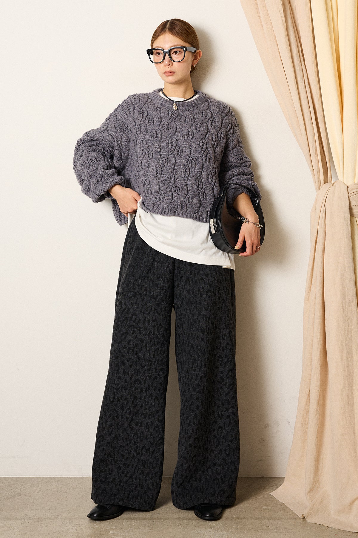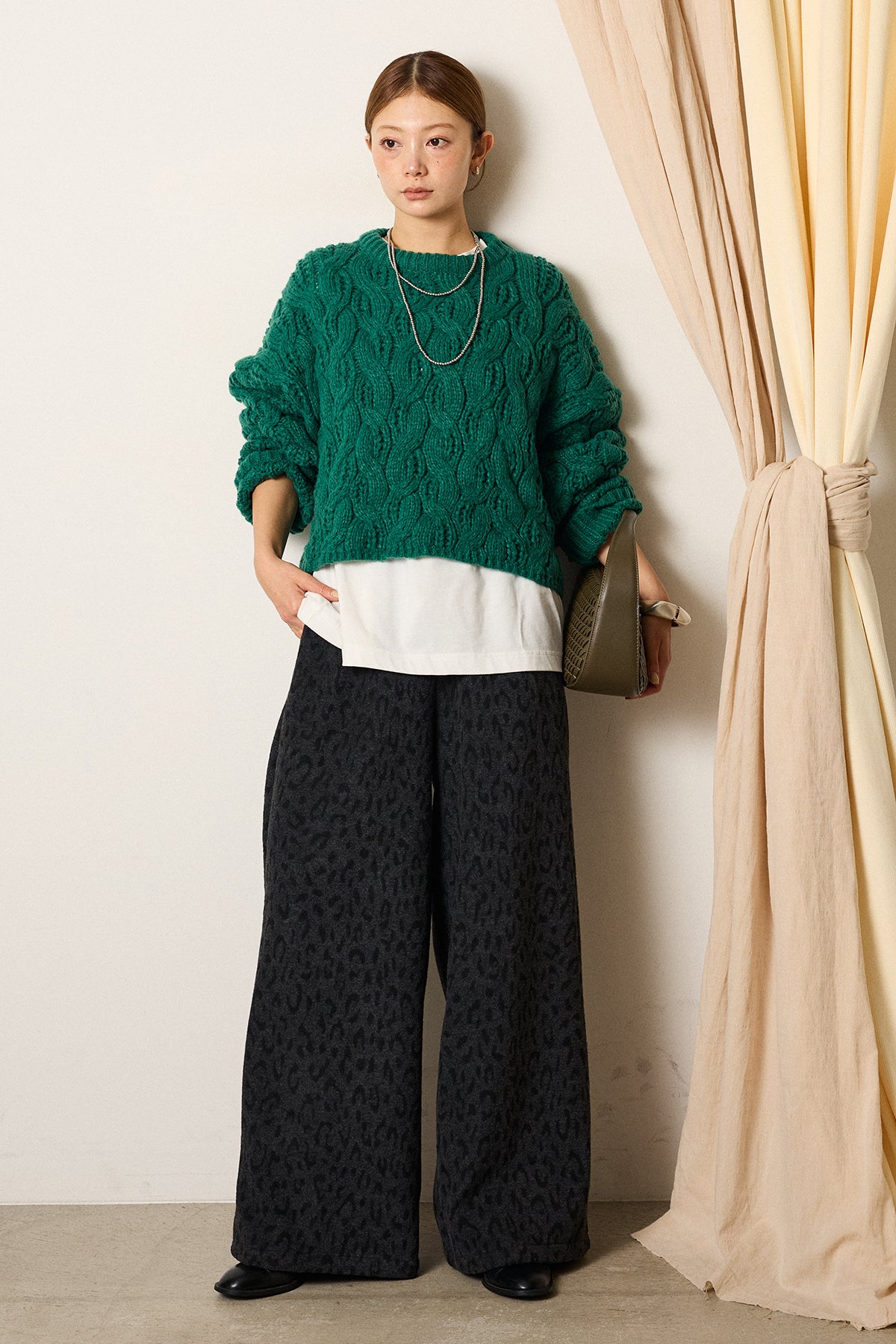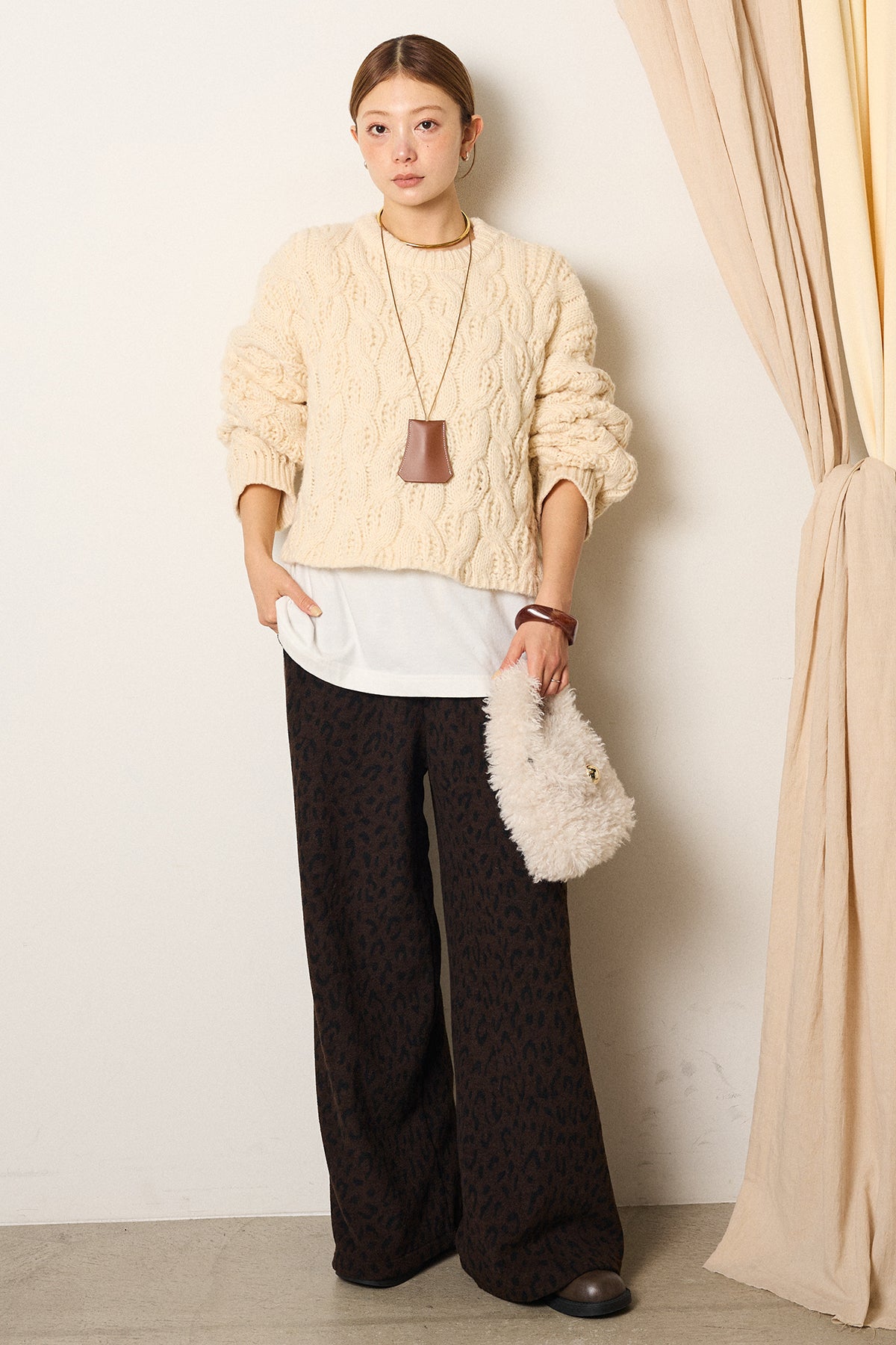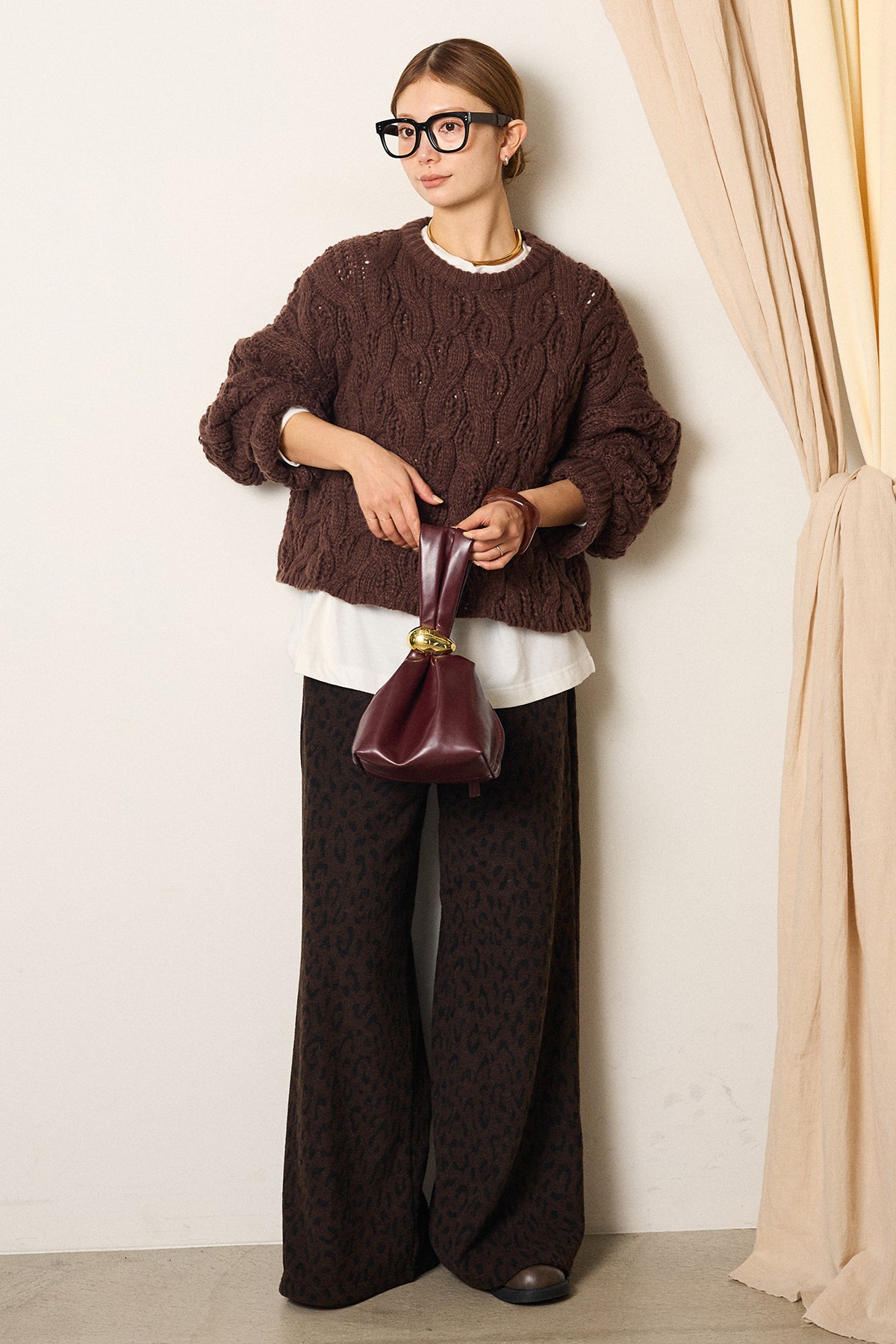 レオパード柄をジャガードで表現したニットパンツ。 程よい厚みと柔らかさのある素材で、リラックス感のある穿き心地が魅力です。 ウエストはドローストリング仕様で調整がしやすく、こなれた雰囲気をプラス。 シンプルなトップスを合わせるだけで、存在感のあるスタイルが完成します。 大人の抜け感を楽しめる、シーズンムード漂うアイテムです。