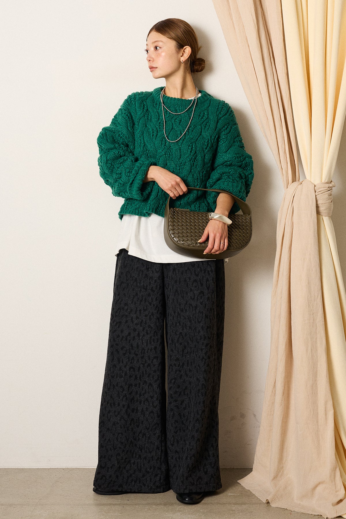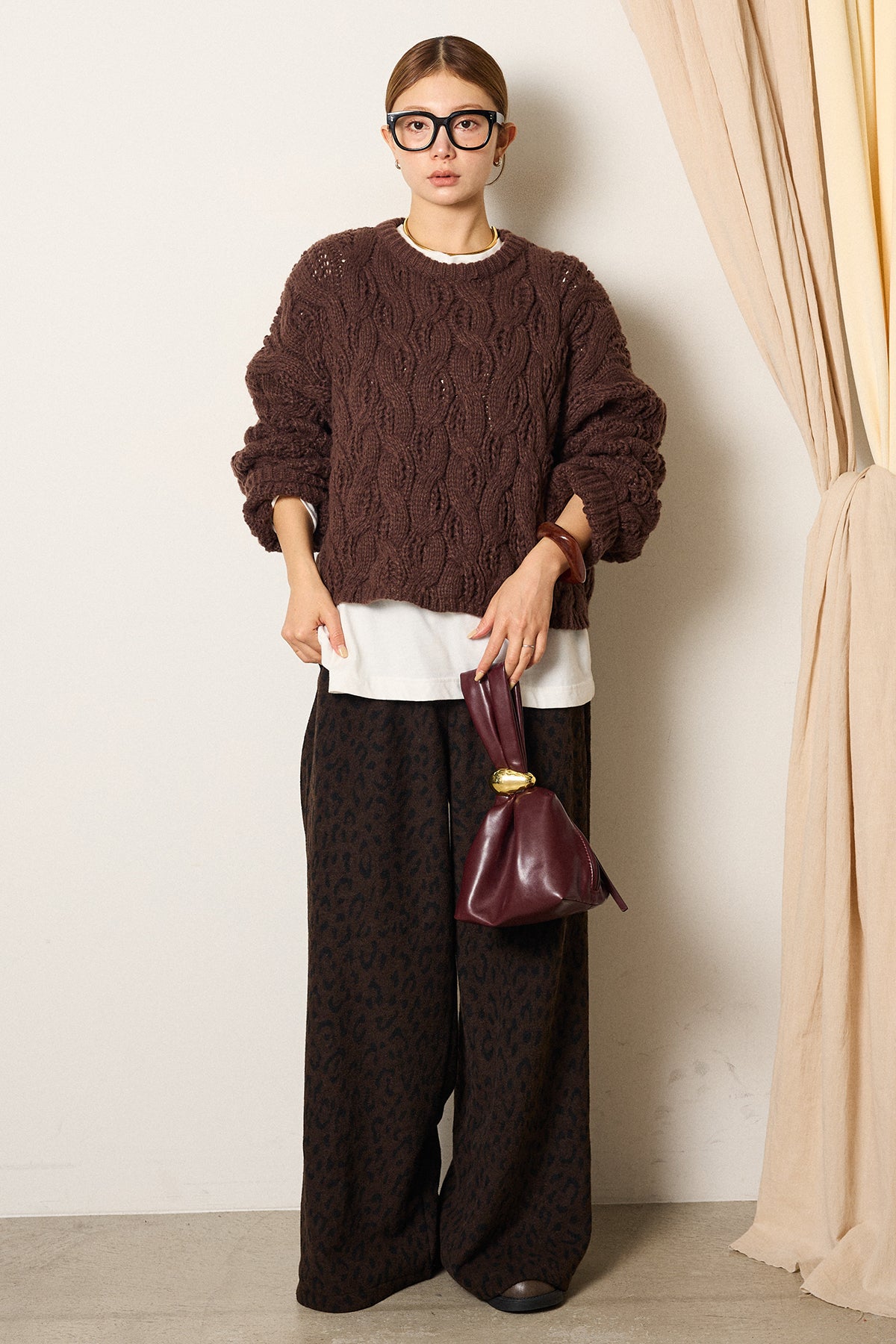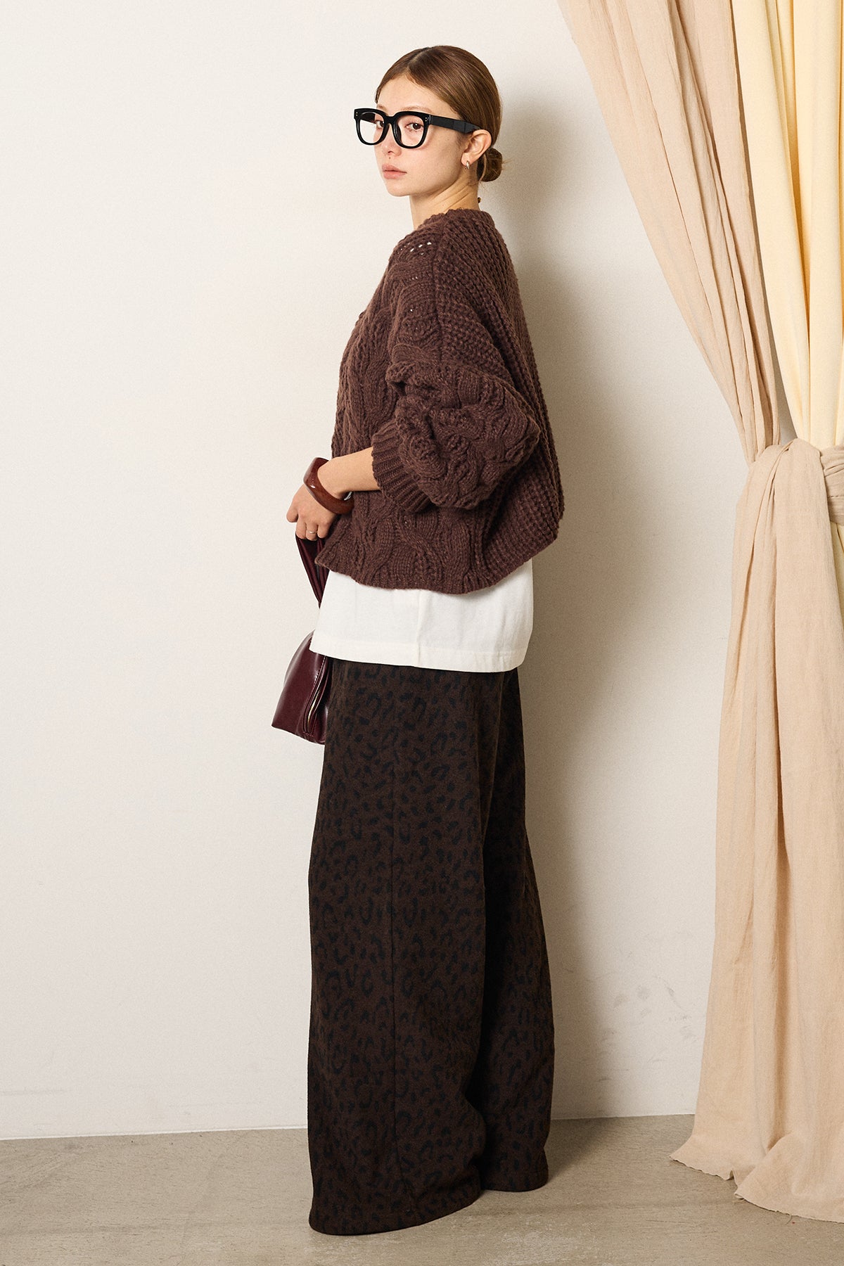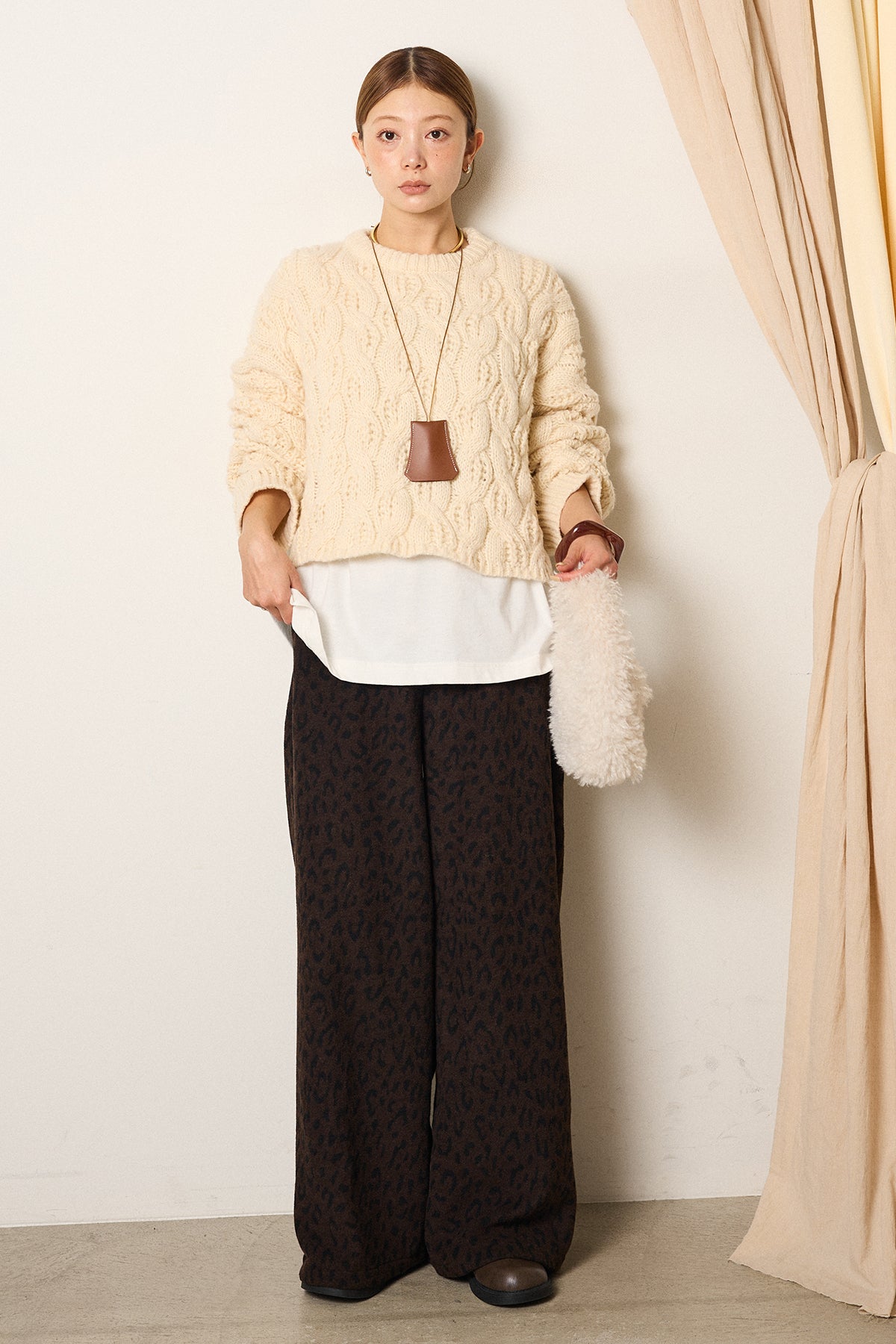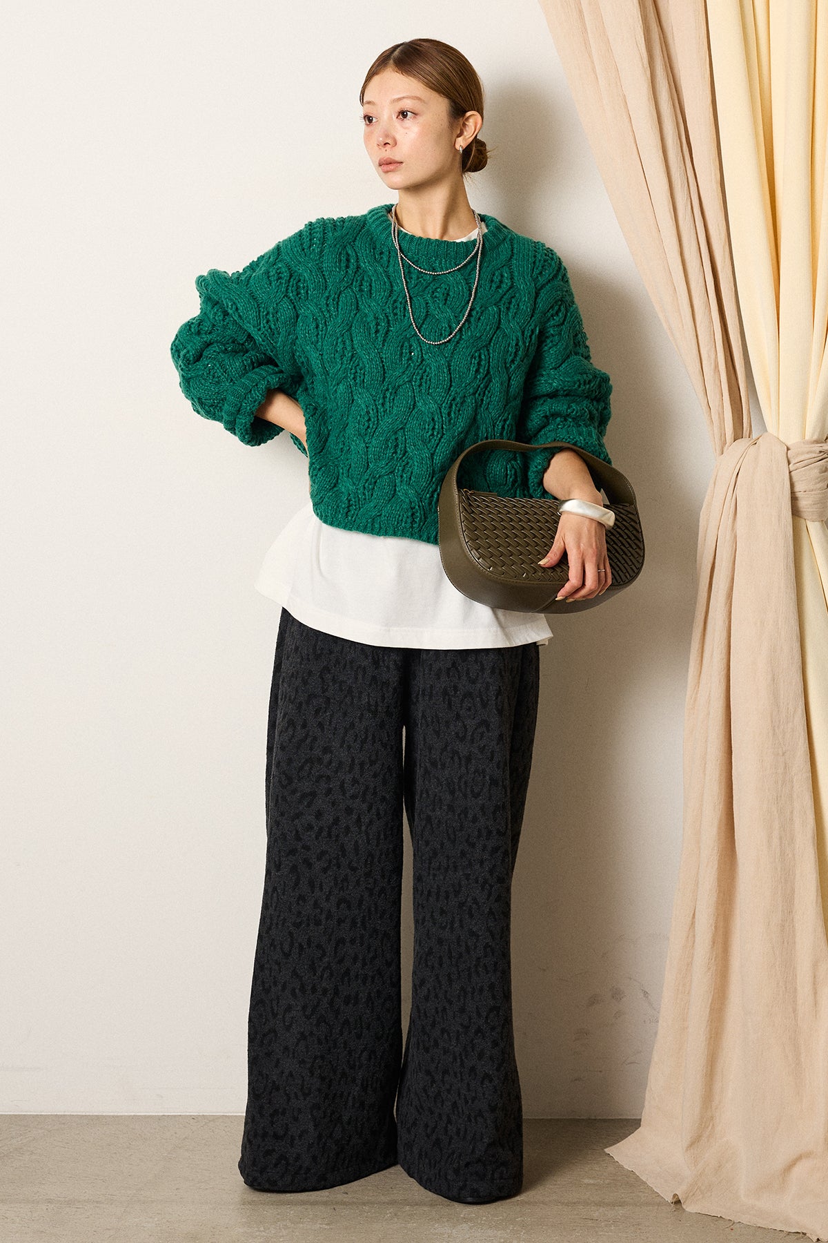 レオパード柄をジャガードで表現したニットパンツ。 程よい厚みと柔らかさのある素材で、リラックス感のある穿き心地が魅力です。 ウエストはドローストリング仕様で調整がしやすく、こなれた雰囲気をプラス。 シンプルなトップスを合わせるだけで、存在感のあるスタイルが完成します。 大人の抜け感を楽しめる、シーズンムード漂うアイテムです。