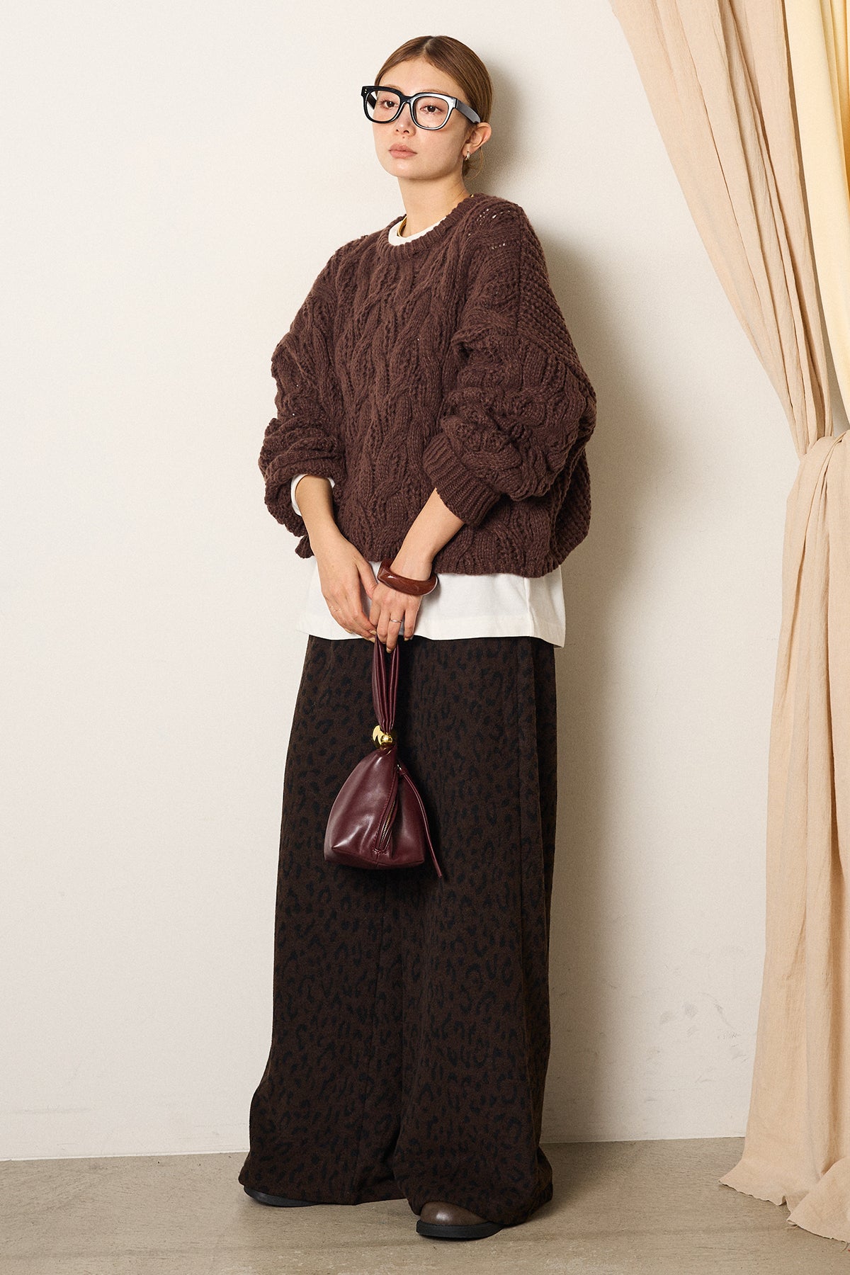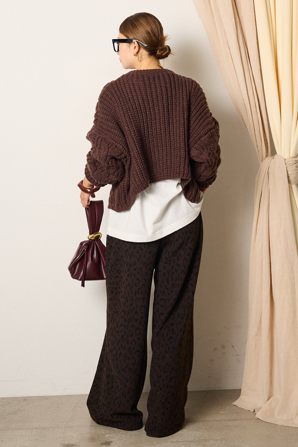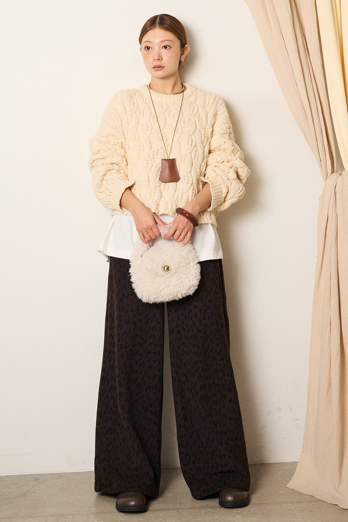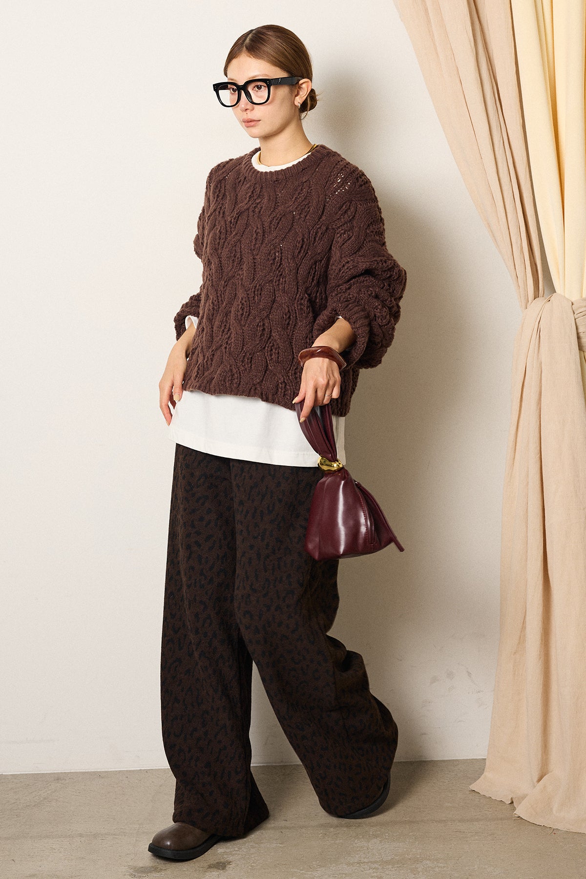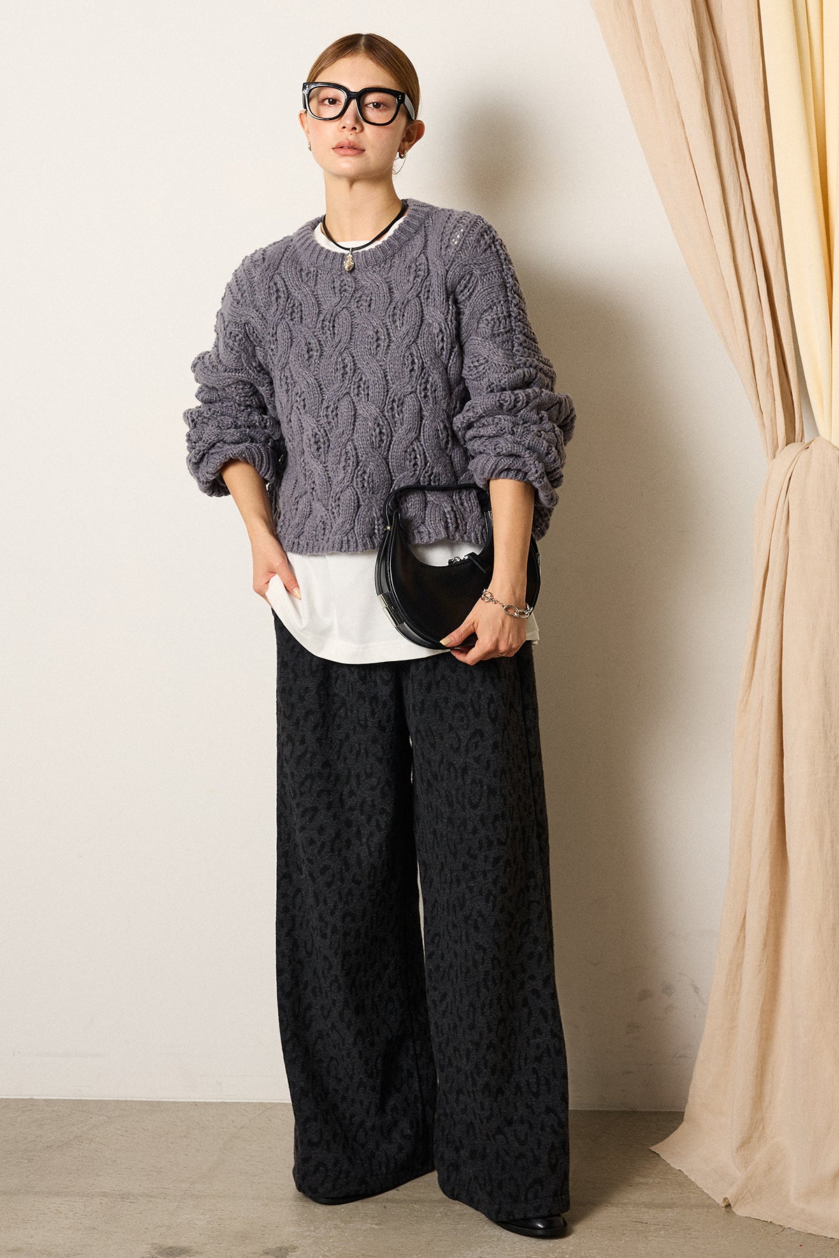 レオパード柄をジャガードで表現したニットパンツ。 程よい厚みと柔らかさのある素材で、リラックス感のある穿き心地が魅力です。 ウエストはドローストリング仕様で調整がしやすく、こなれた雰囲気をプラス。 シンプルなトップスを合わせるだけで、存在感のあるスタイルが完成します。 大人の抜け感を楽しめる、シーズンムード漂うアイテムです。