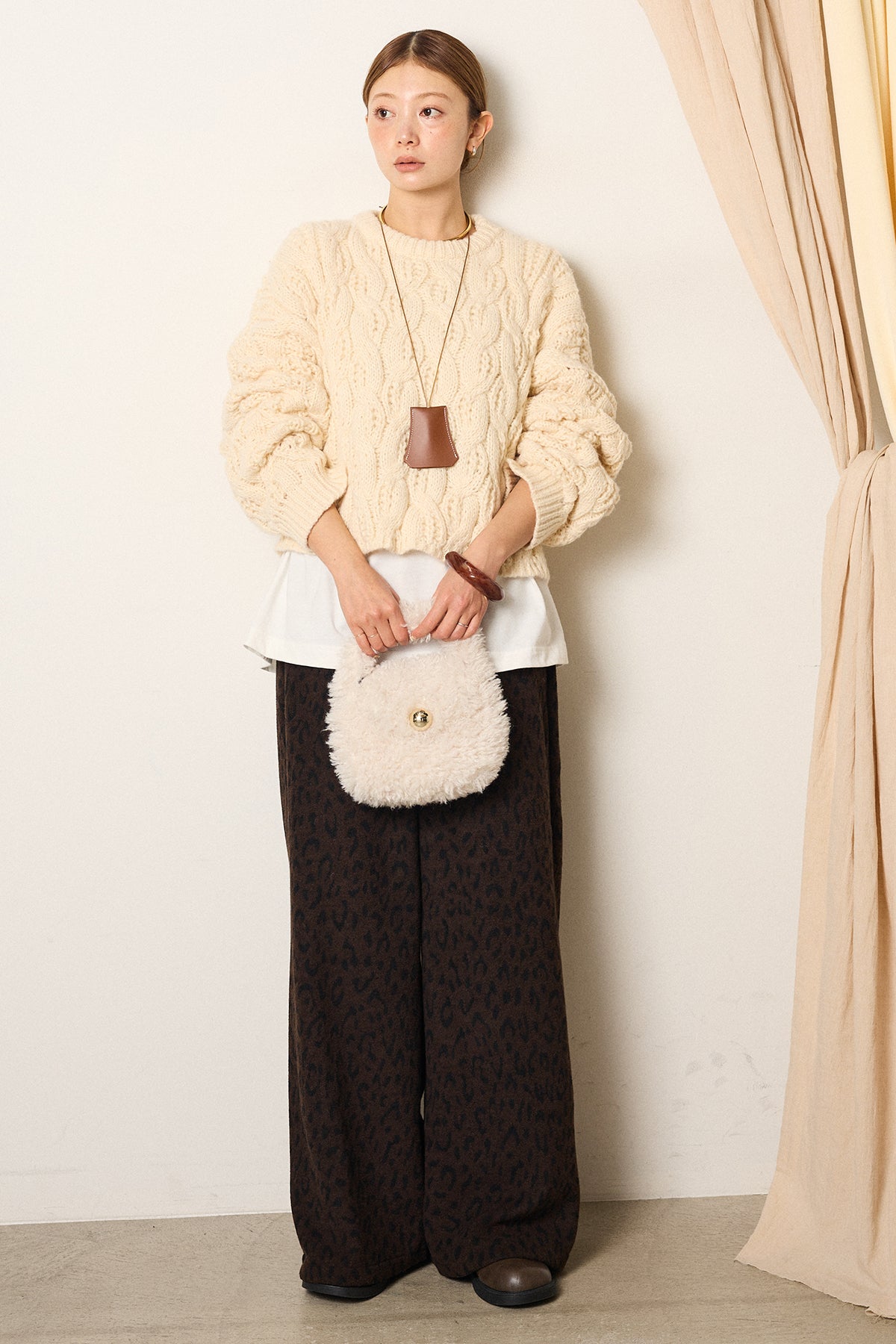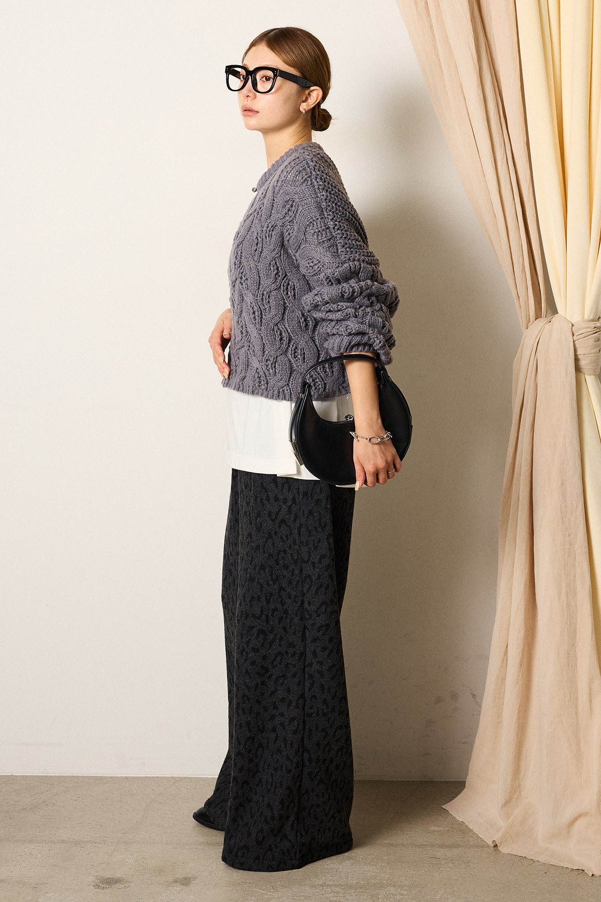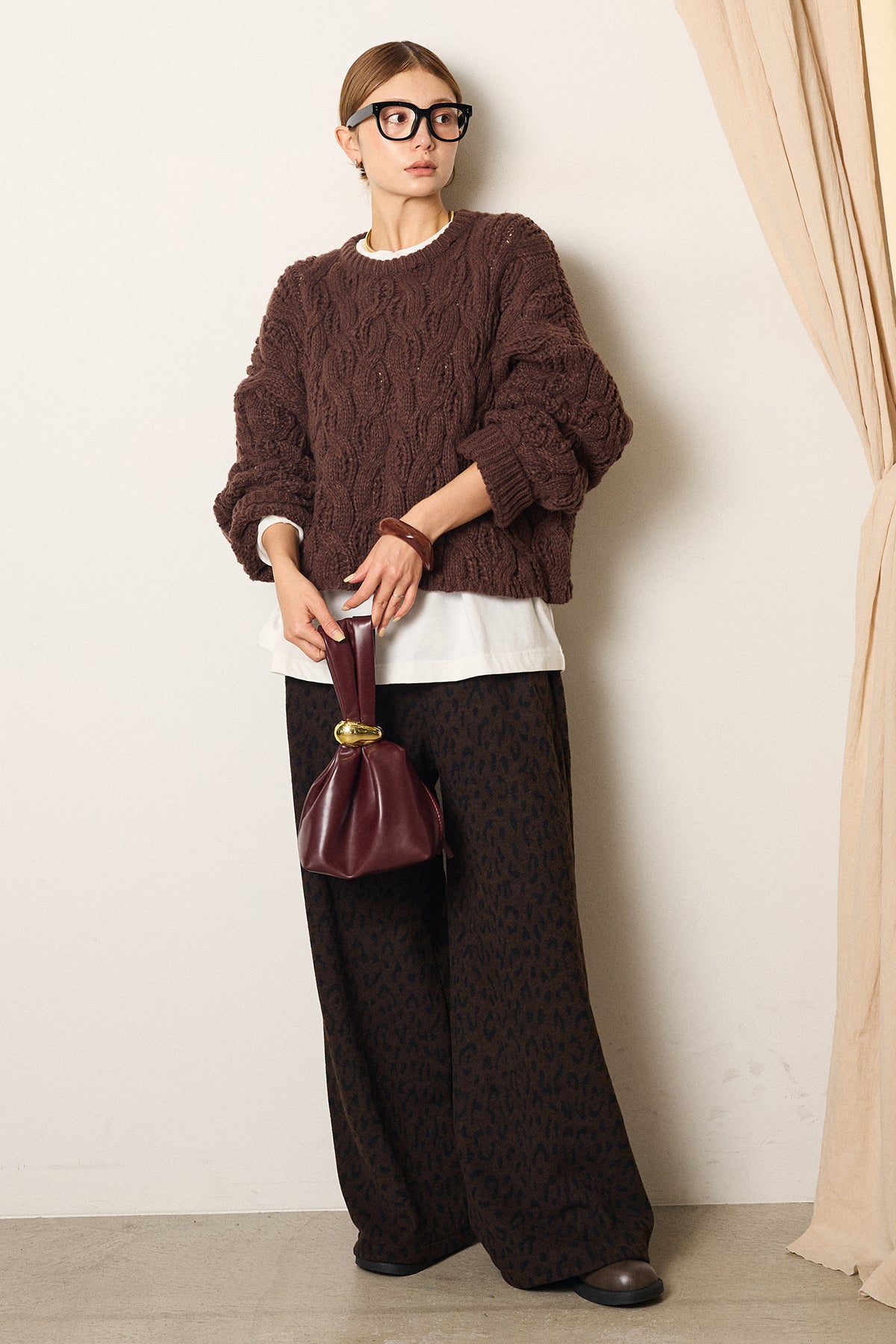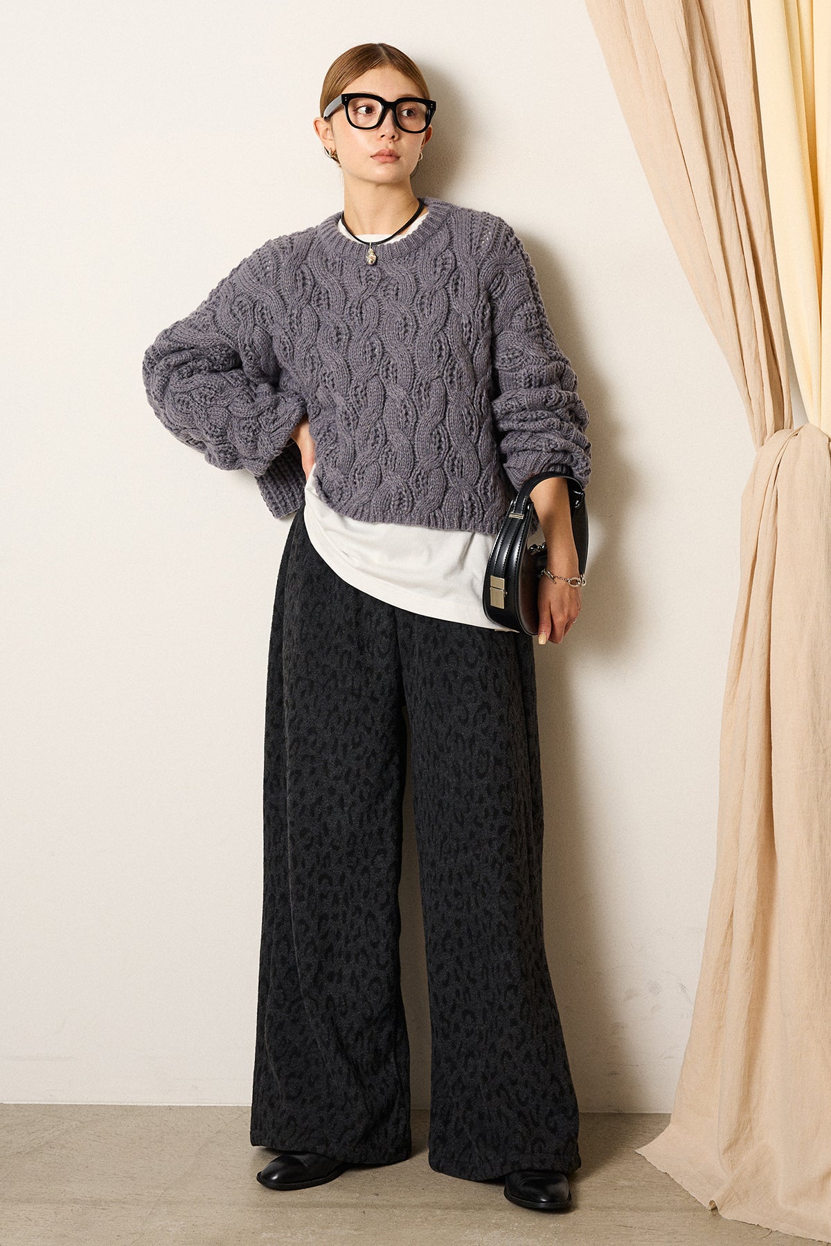 レオパード柄をジャガードで表現したニットパンツ。 程よい厚みと柔らかさのある素材で、リラックス感のある穿き心地が魅力です。 ウエストはドローストリング仕様で調整がしやすく、こなれた雰囲気をプラス。 シンプルなトップスを合わせるだけで、存在感のあるスタイルが完成します。 大人の抜け感を楽しめる、シーズンムード漂うアイテムです。
