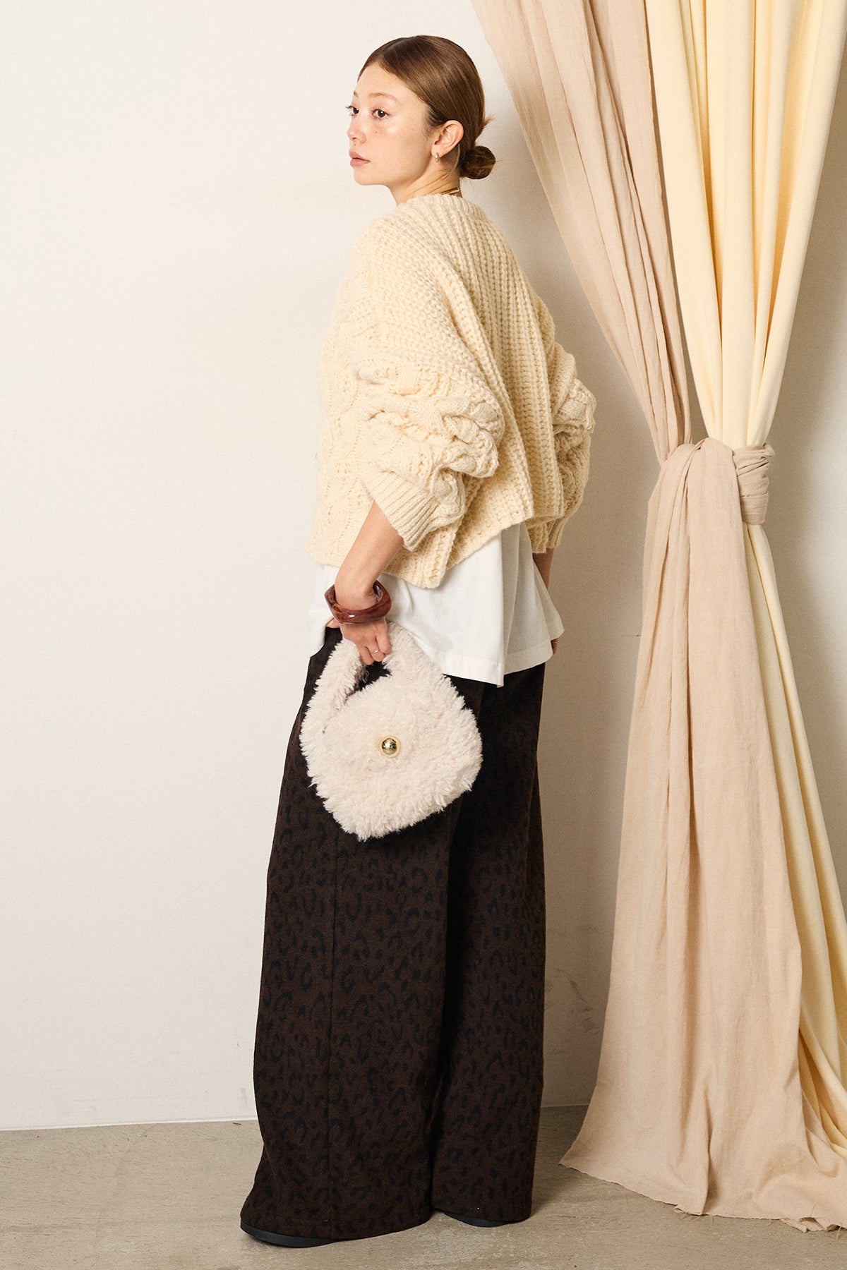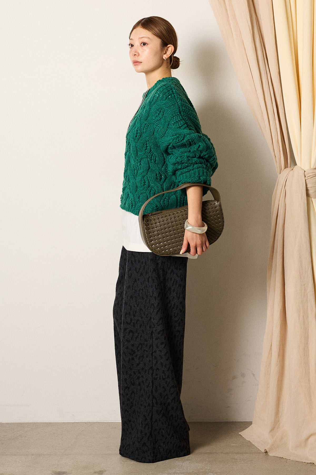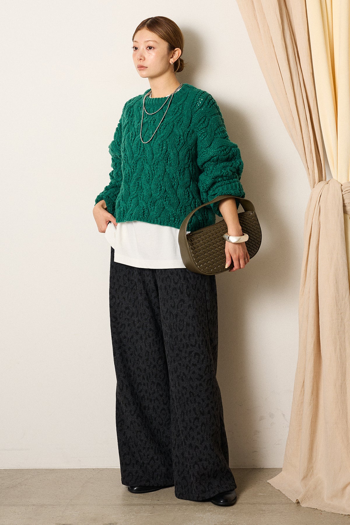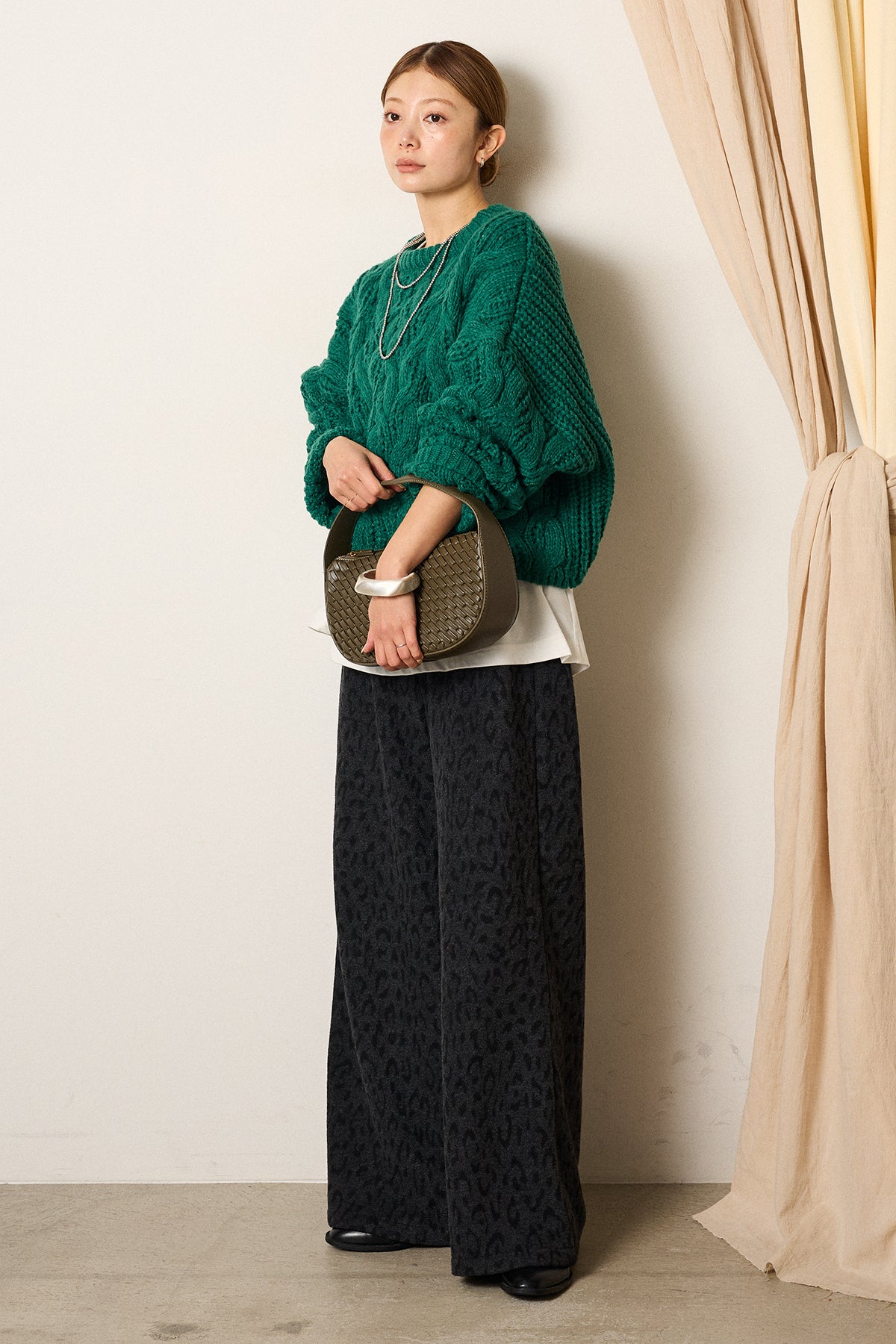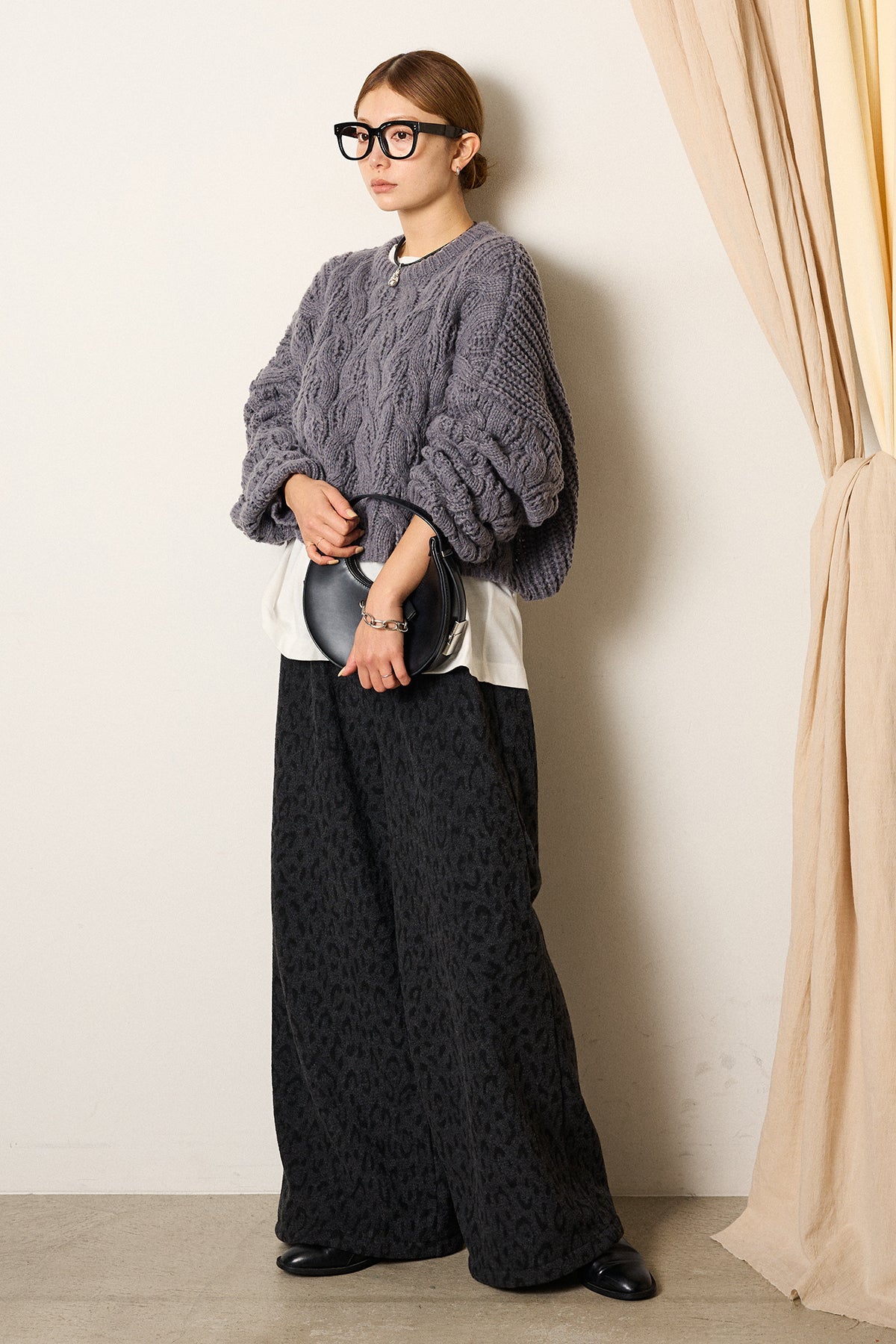 レオパード柄をジャガードで表現したニットパンツ。 程よい厚みと柔らかさのある素材で、リラックス感のある穿き心地が魅力です。 ウエストはドローストリング仕様で調整がしやすく、こなれた雰囲気をプラス。 シンプルなトップスを合わせるだけで、存在感のあるスタイルが完成します。 大人の抜け感を楽しめる、シーズンムード漂うアイテムです。