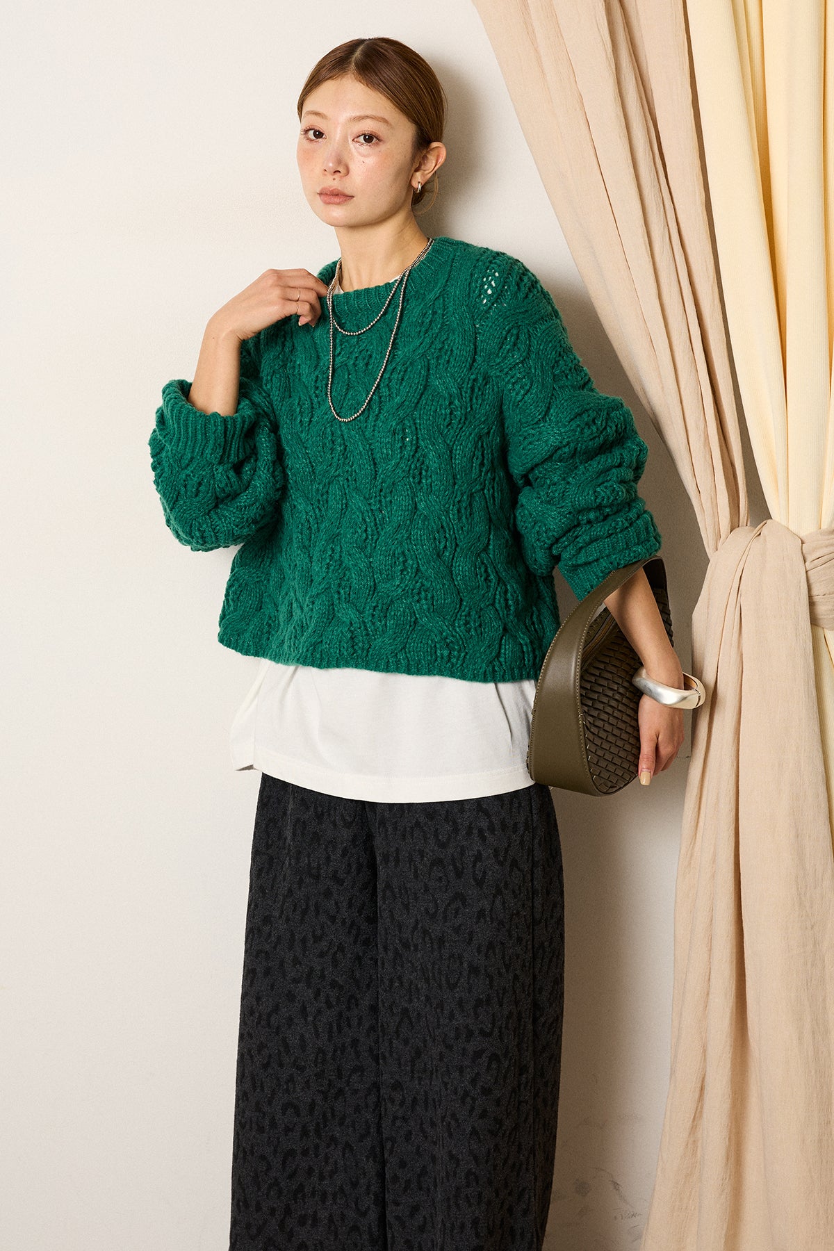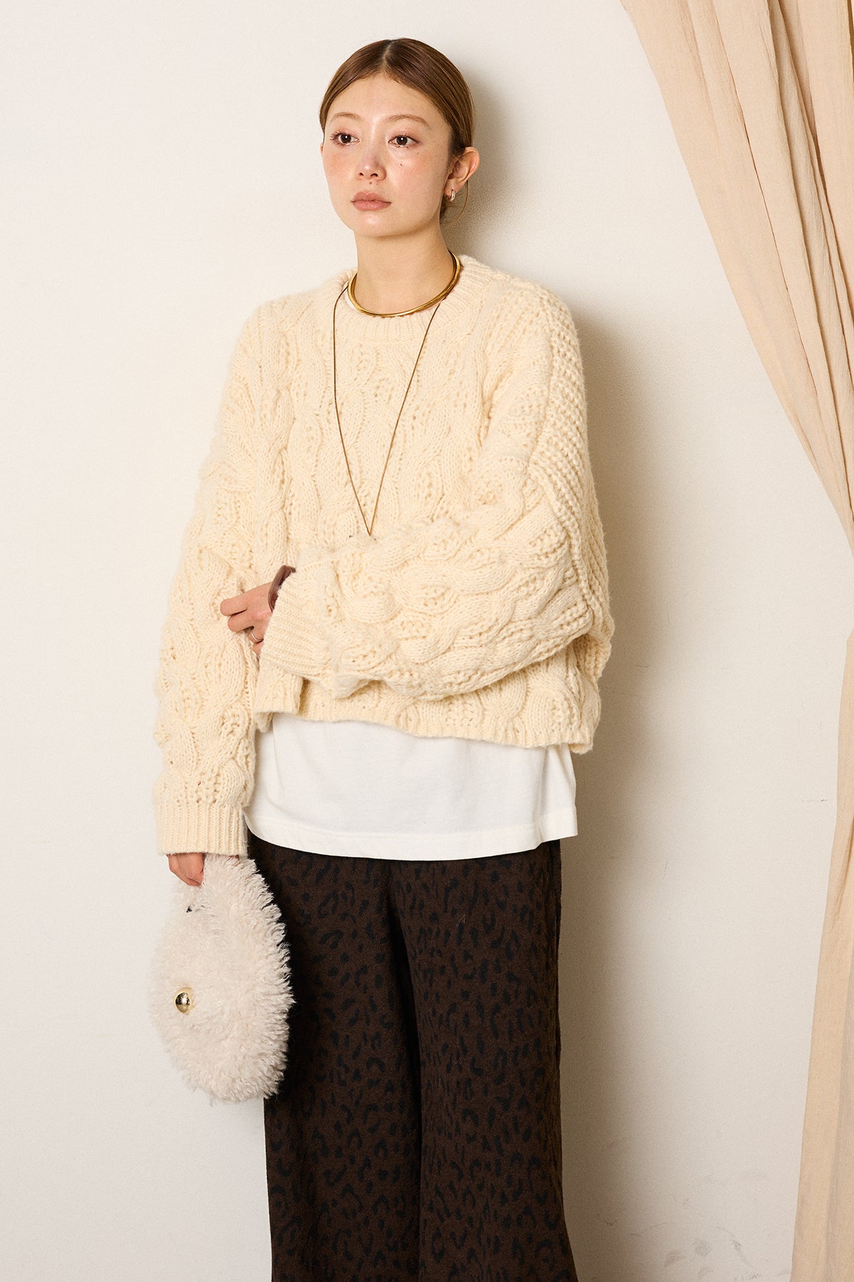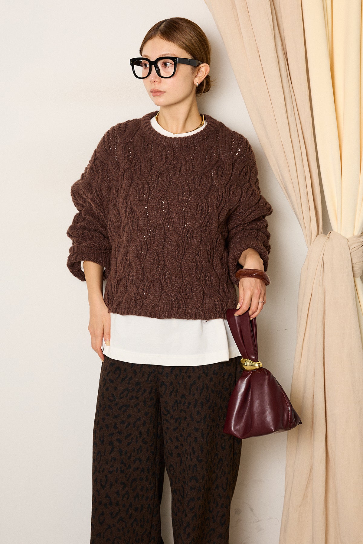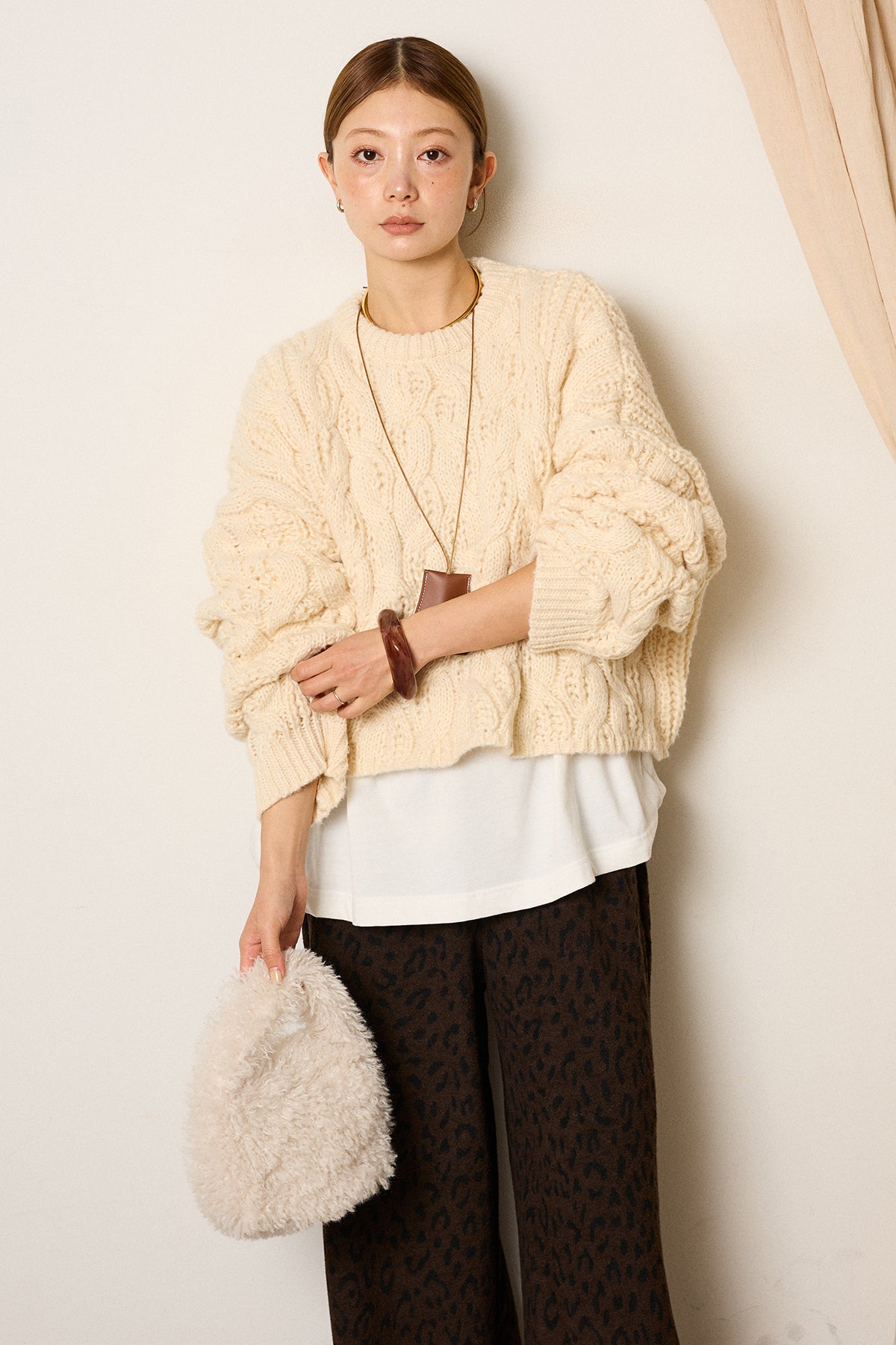立体感のあるケーブル編みが目を惹くショートニット。 ふんわりとした編み地が優しい雰囲気をつくり、程よい厚みで暖かさも抜群です。 リラックス感のあるゆったりシルエットながら、短めの着丈でバランス良くまとまります。 ハイウエストボトムと合わせれば、スタイルアップも叶う万能アイテムです。
