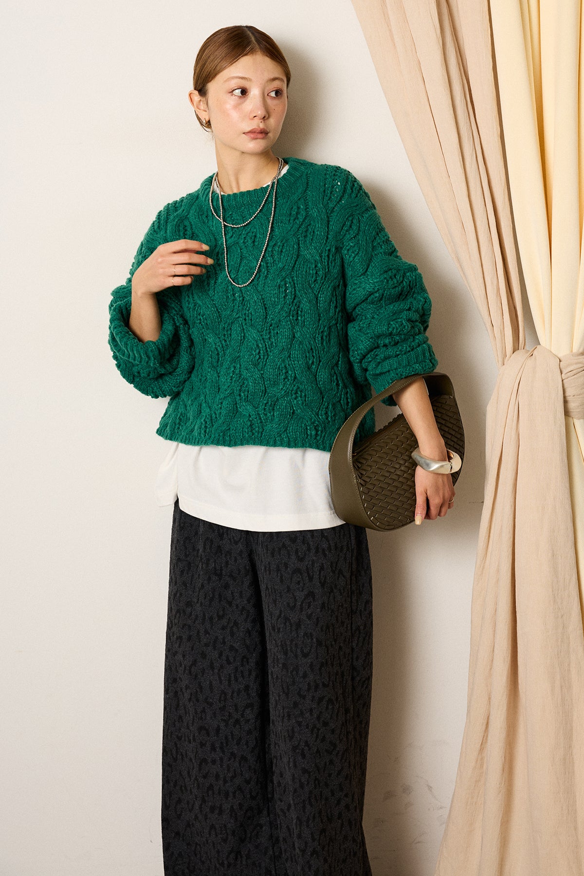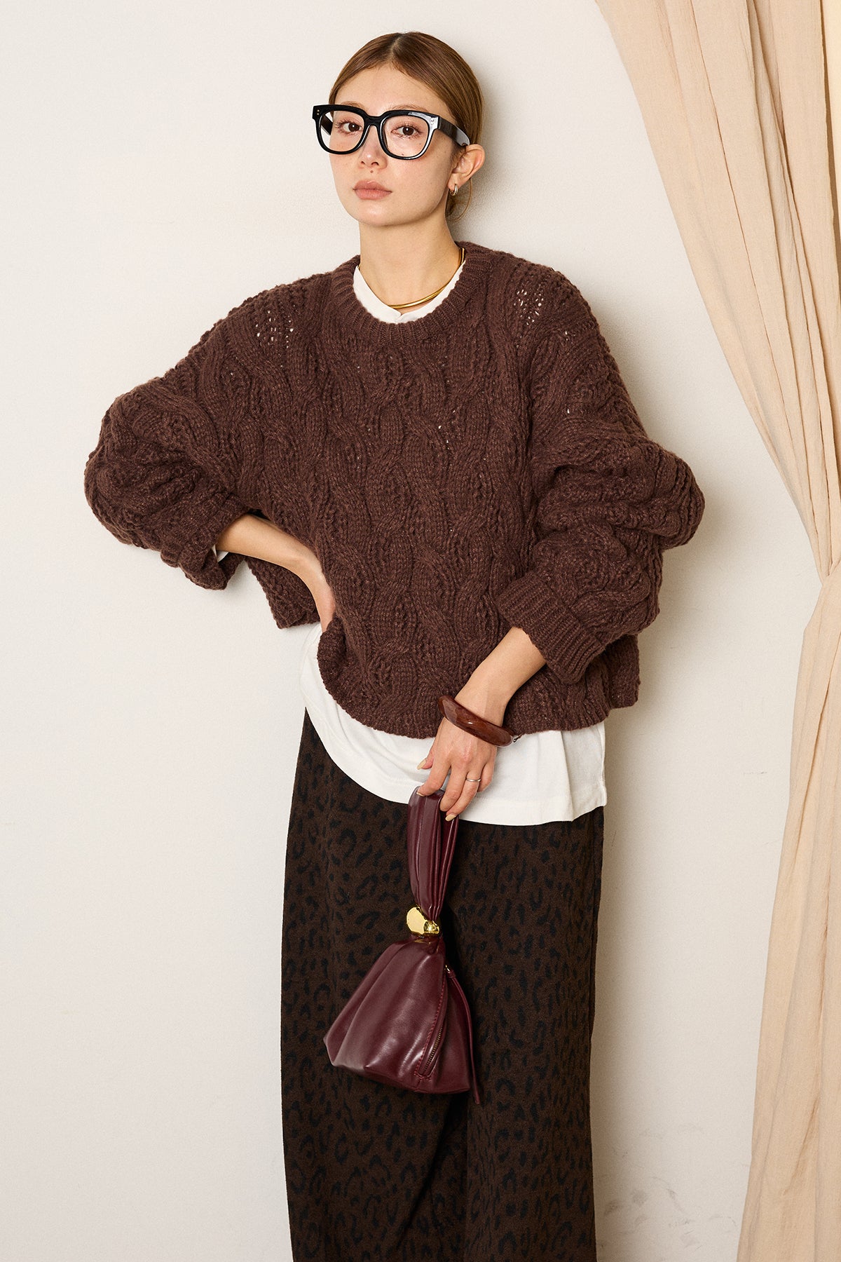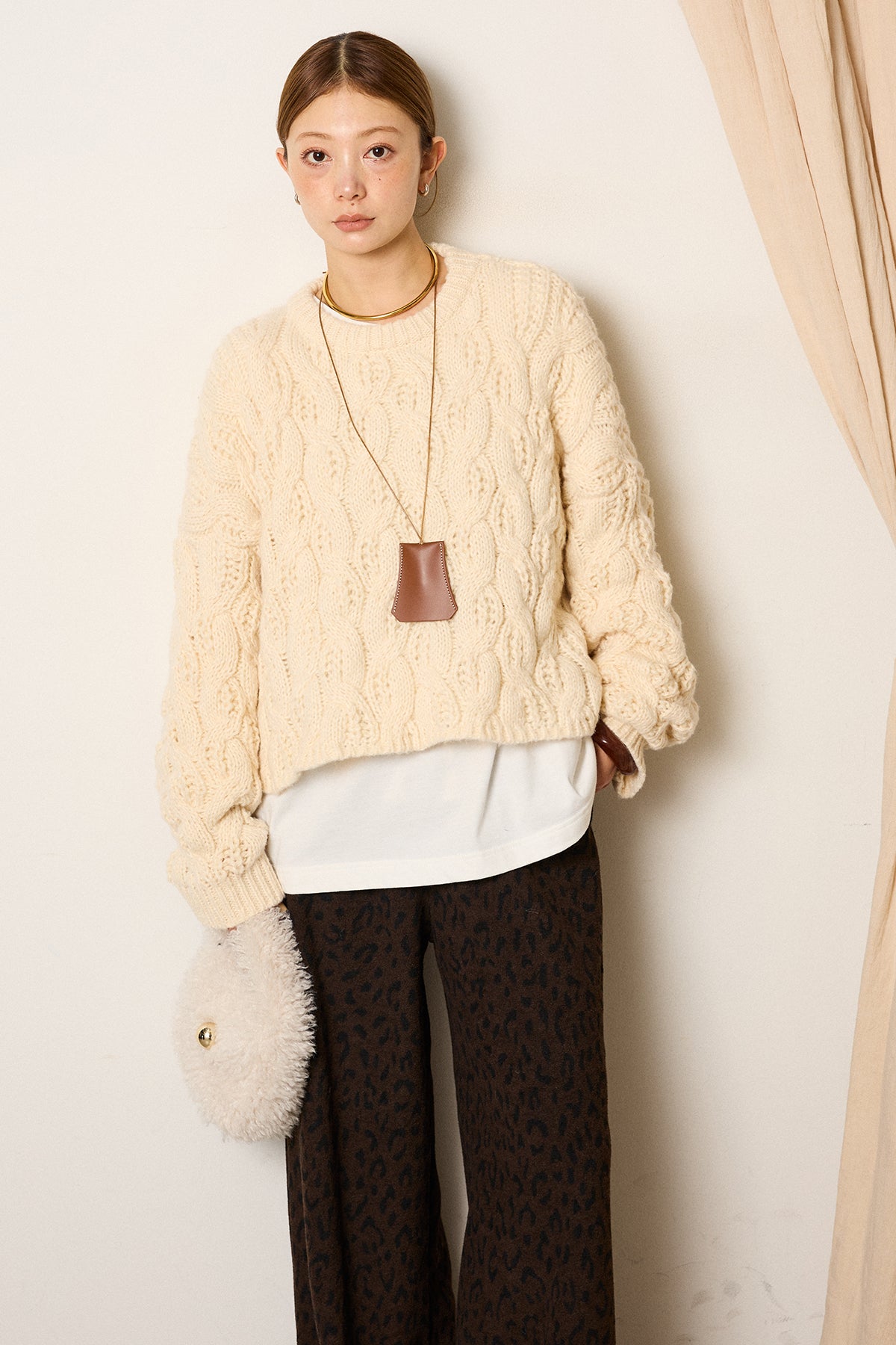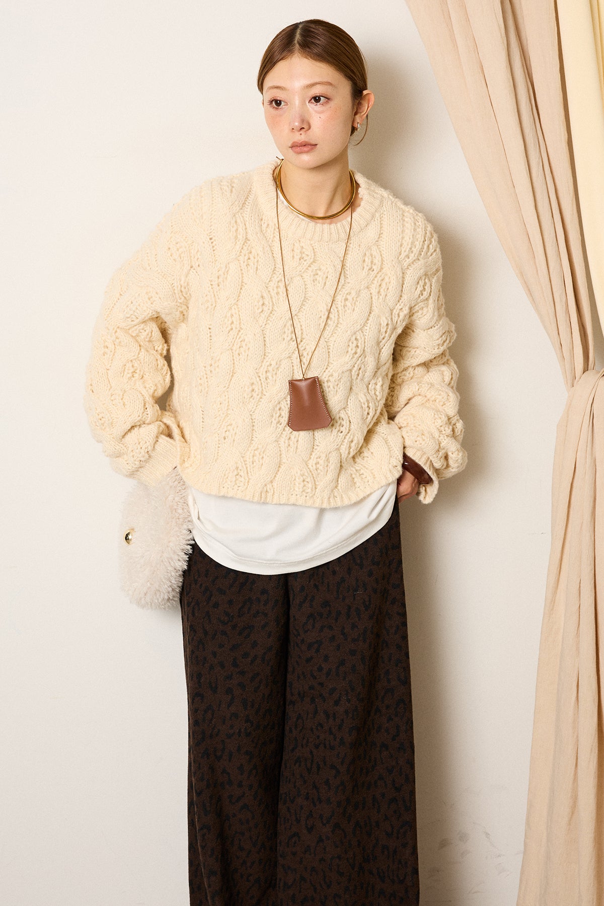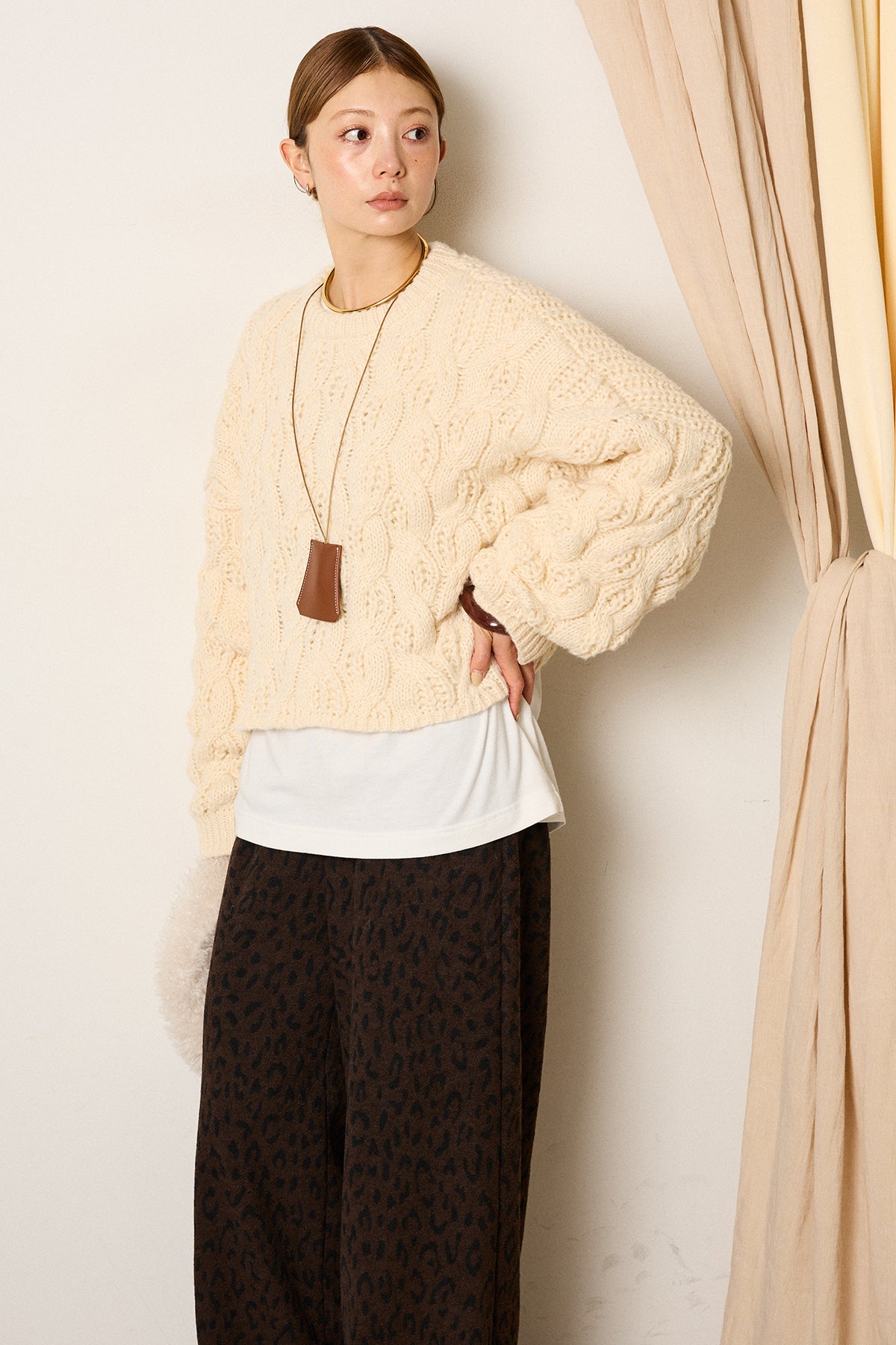 立体感のあるケーブル編みが目を惹くショートニット。 ふんわりとした編み地が優しい雰囲気をつくり、程よい厚みで暖かさも抜群です。 リラックス感のあるゆったりシルエットながら、短めの着丈でバランス良くまとまります。 ハイウエストボトムと合わせれば、スタイルアップも叶う万能アイテムです。