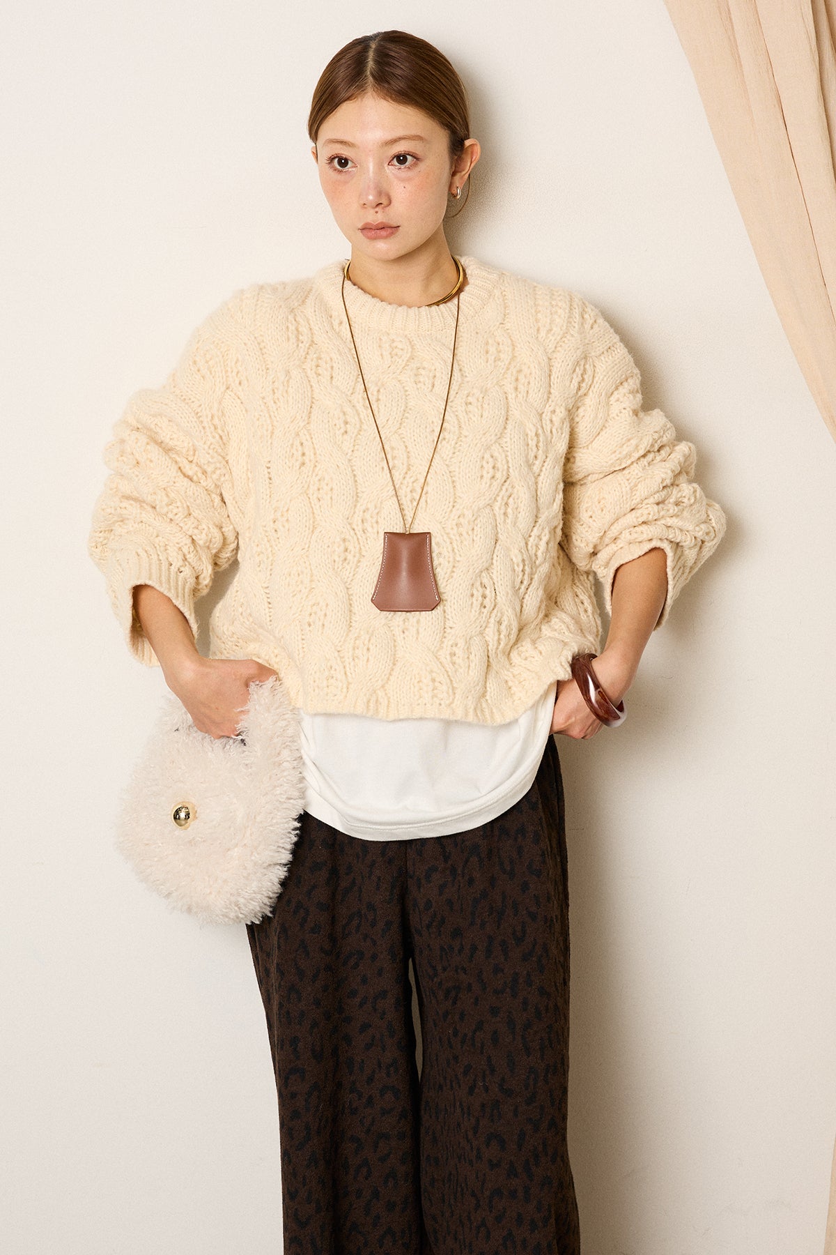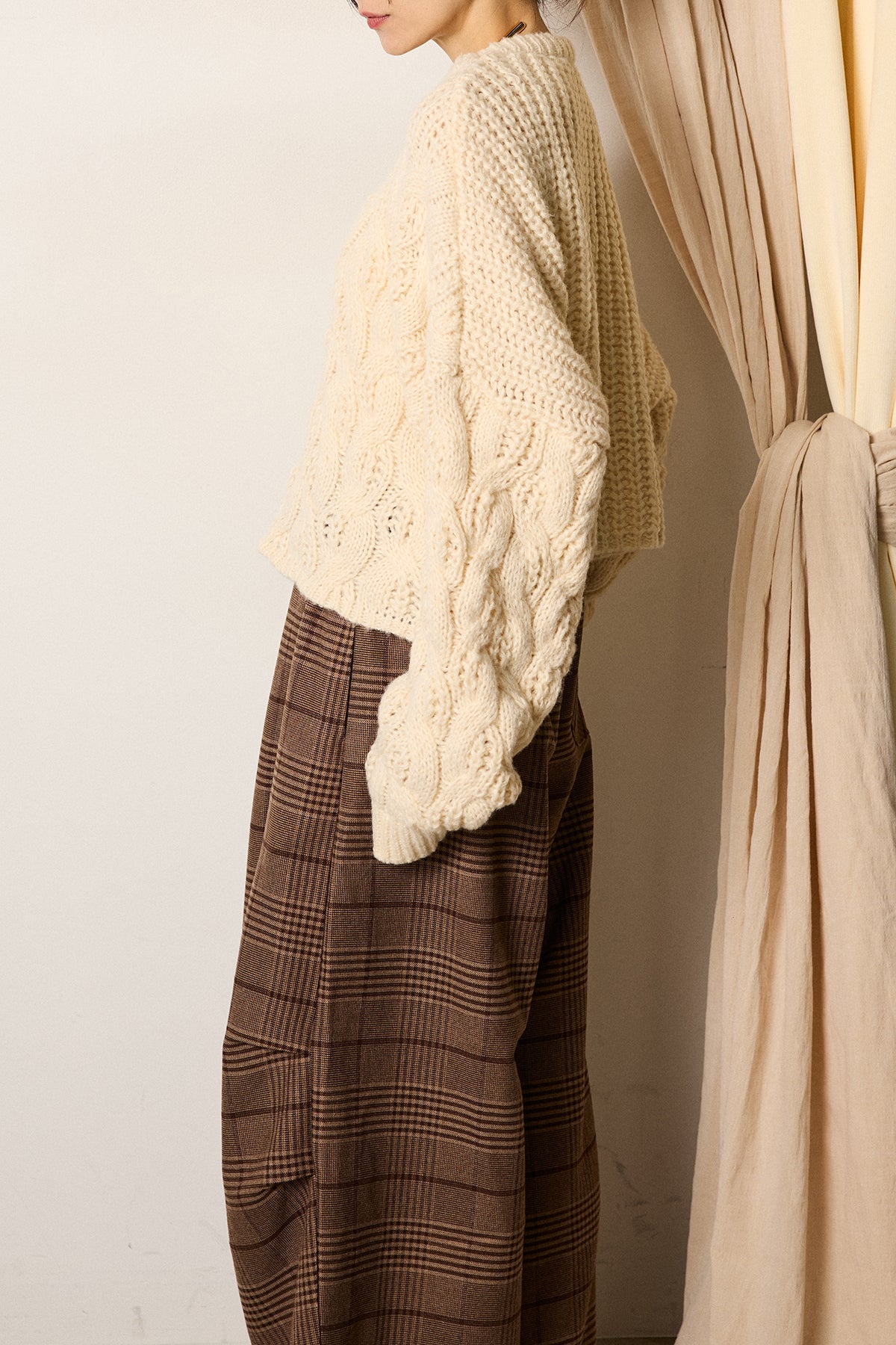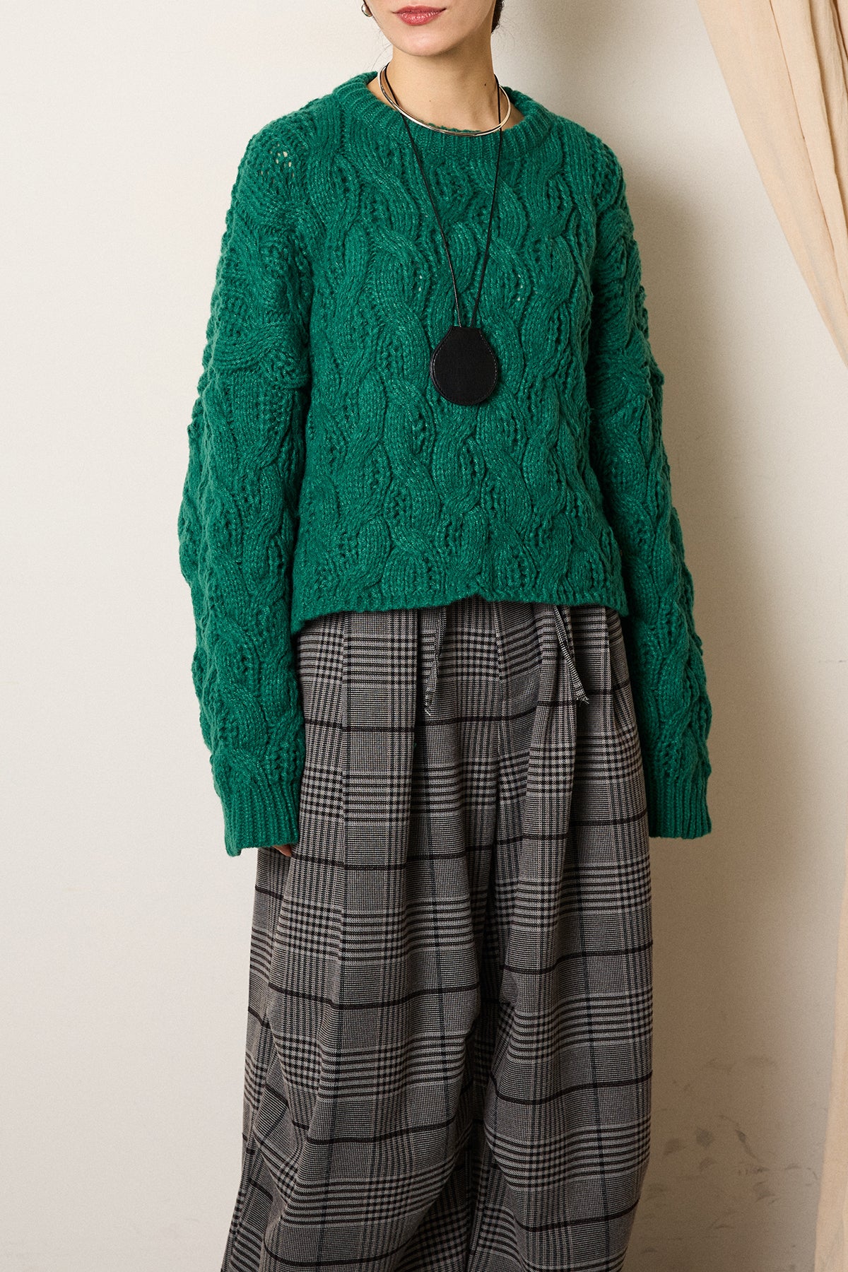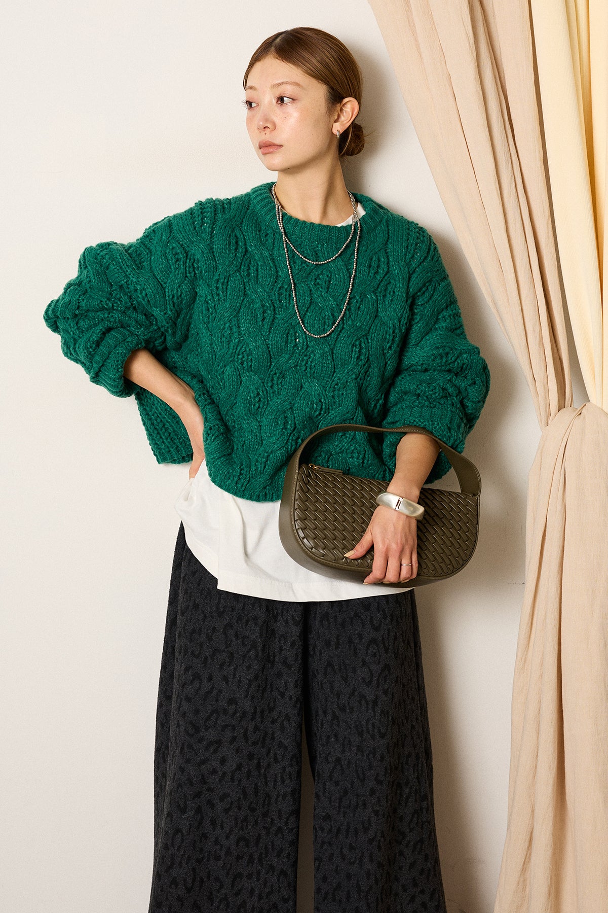 立体感のあるケーブル編みが目を惹くショートニット。 ふんわりとした編み地が優しい雰囲気をつくり、程よい厚みで暖かさも抜群です。 リラックス感のあるゆったりシルエットながら、短めの着丈でバランス良くまとまります。 ハイウエストボトムと合わせれば、スタイルアップも叶う万能アイテムです。