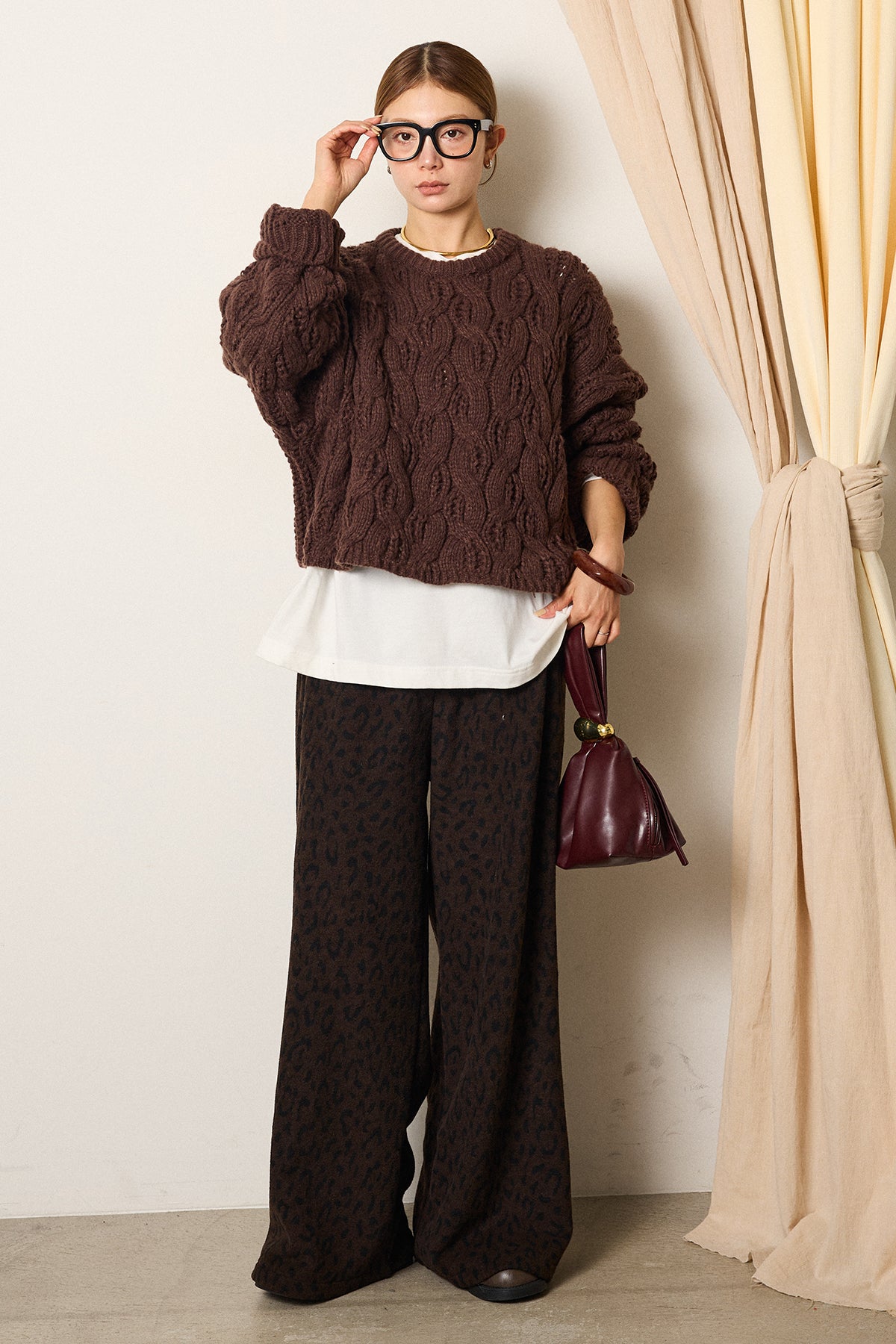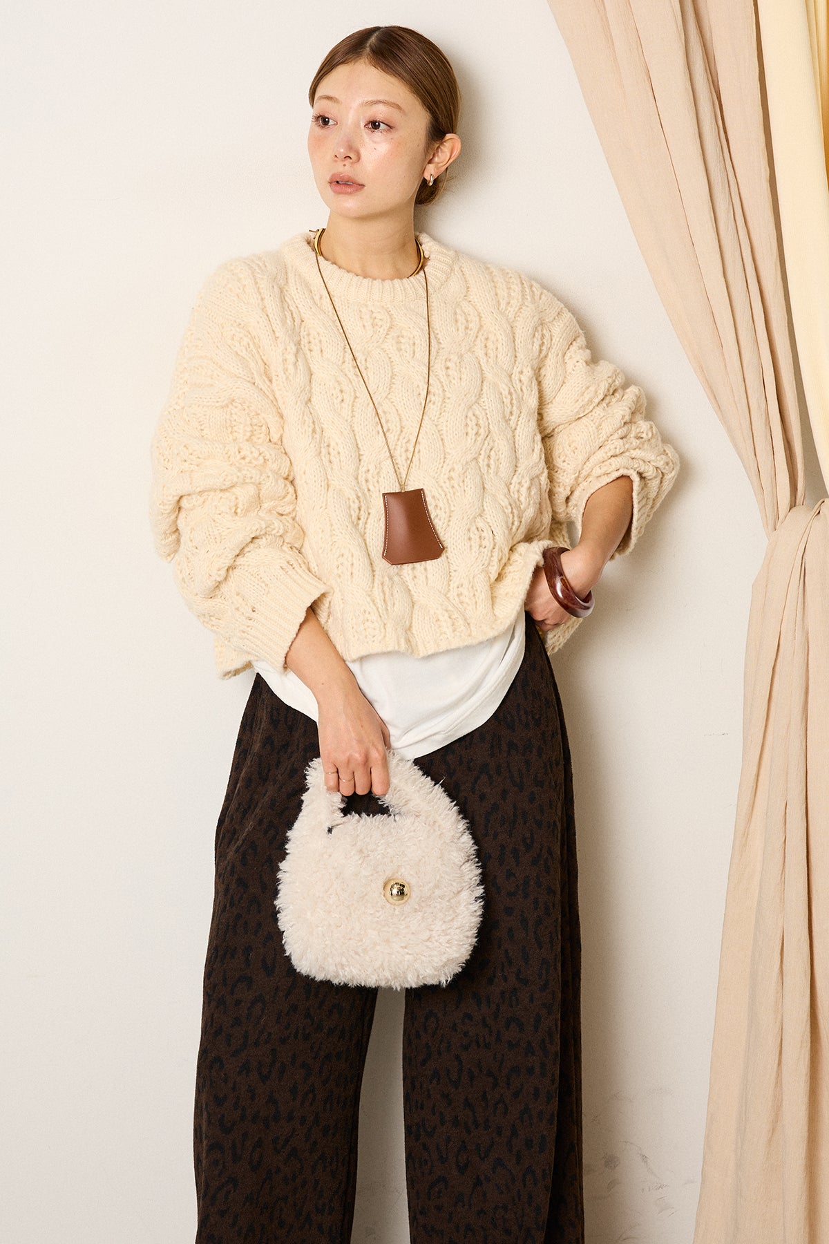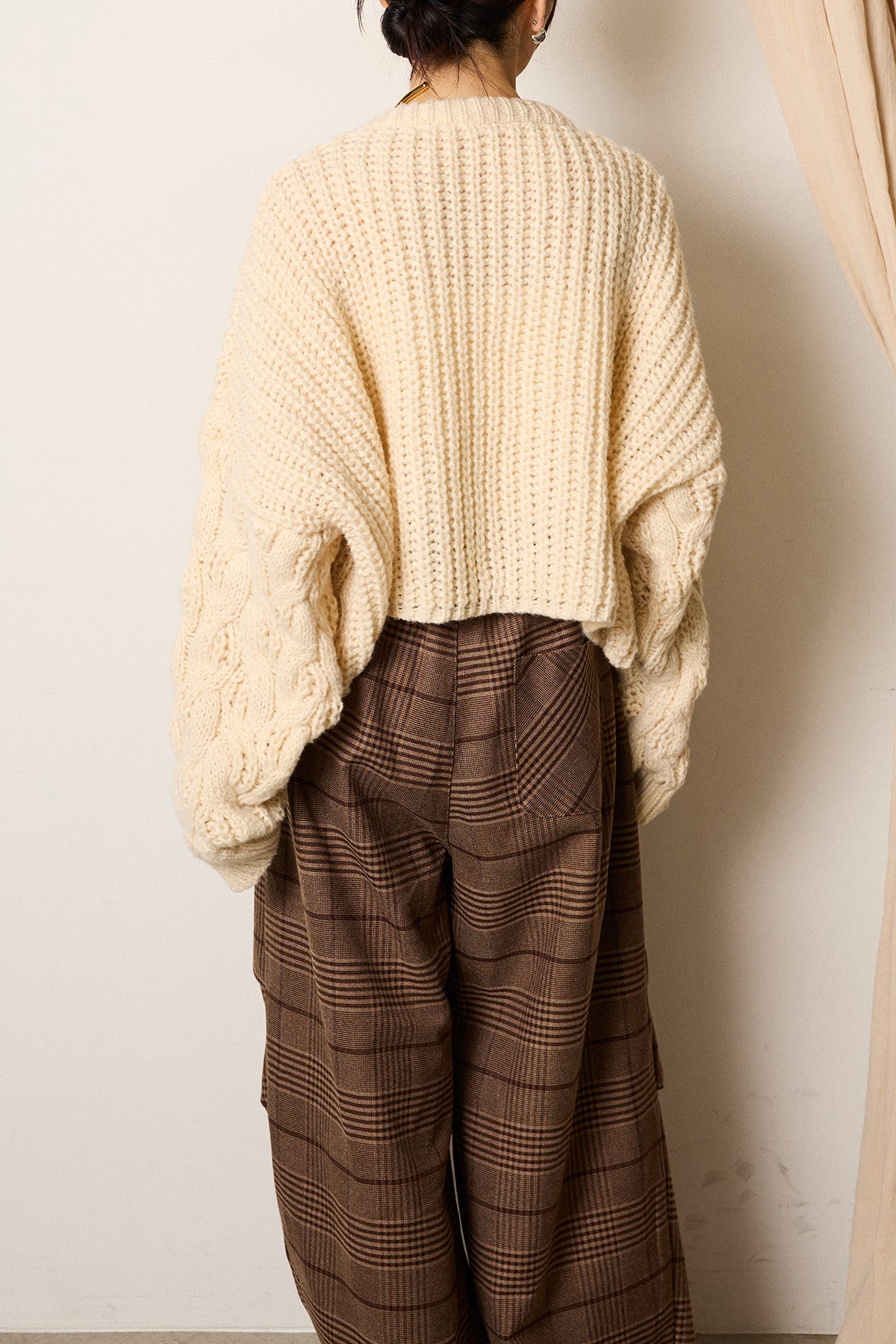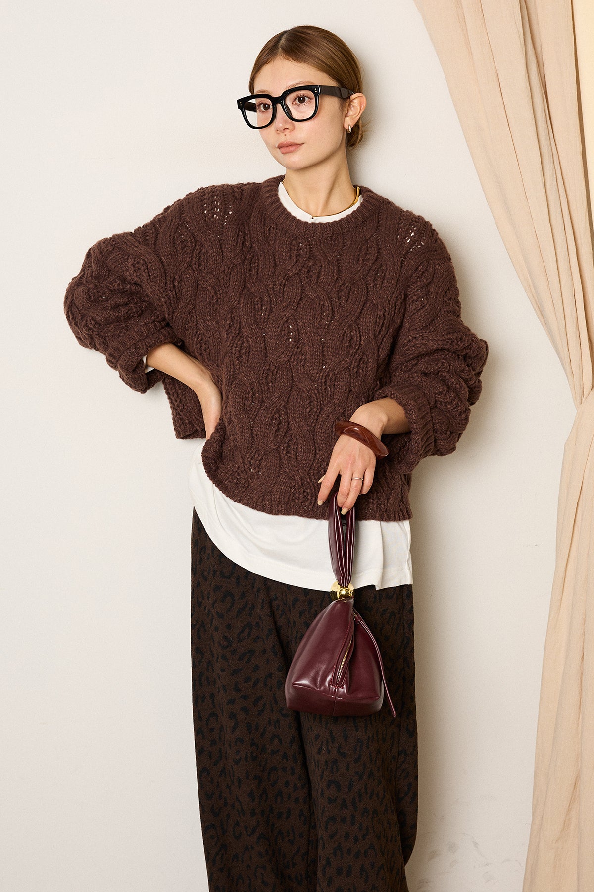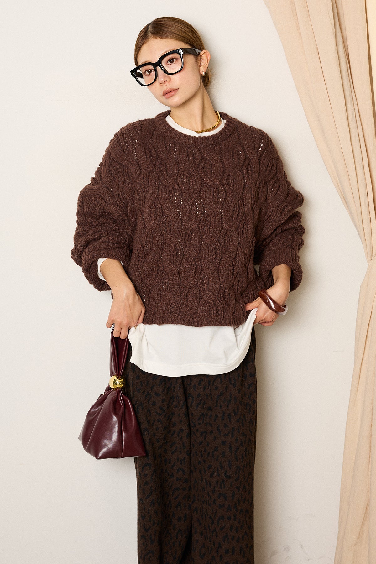 立体感のあるケーブル編みが目を惹くショートニット。 ふんわりとした編み地が優しい雰囲気をつくり、程よい厚みで暖かさも抜群です。 リラックス感のあるゆったりシルエットながら、短めの着丈でバランス良くまとまります。 ハイウエストボトムと合わせれば、スタイルアップも叶う万能アイテムです。