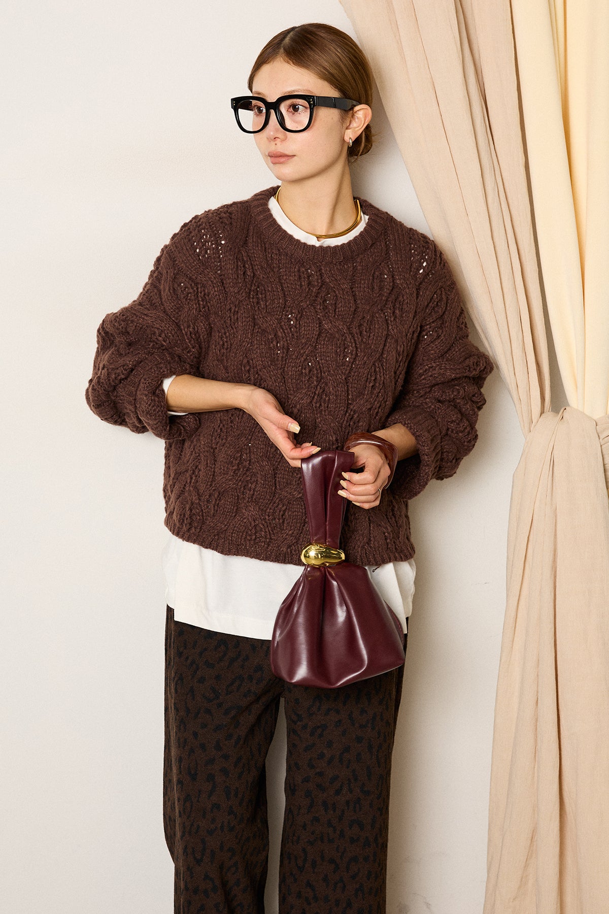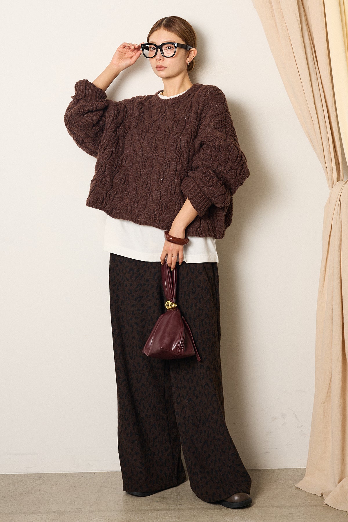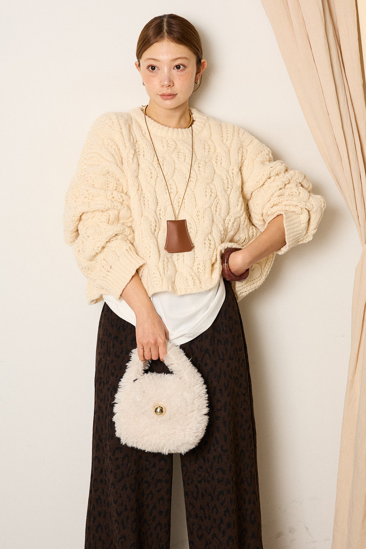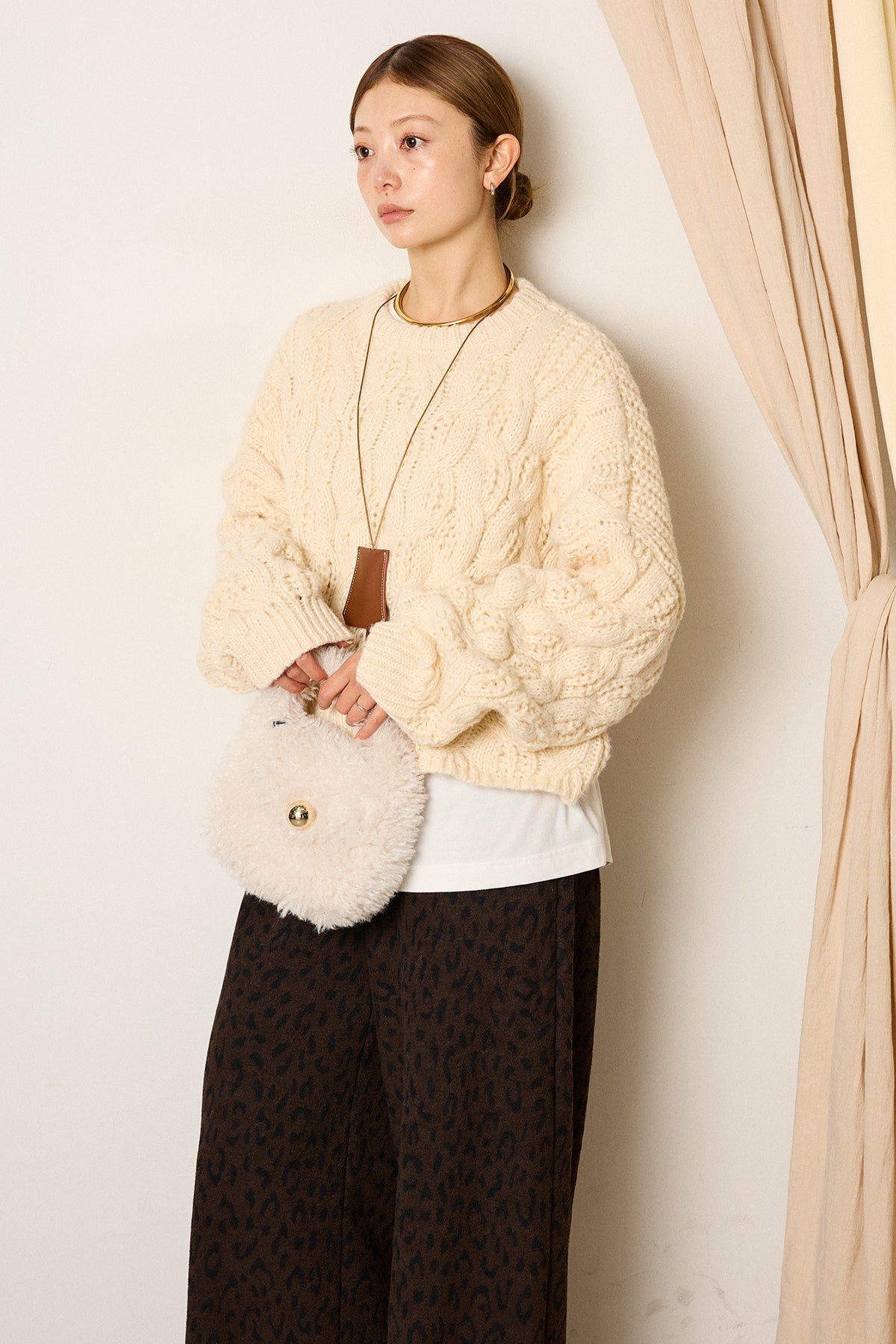 立体感のあるケーブル編みが目を惹くショートニット。 ふんわりとした編み地が優しい雰囲気をつくり、程よい厚みで暖かさも抜群です。 リラックス感のあるゆったりシルエットながら、短めの着丈でバランス良くまとまります。 ハイウエストボトムと合わせれば、スタイルアップも叶う万能アイテムです。