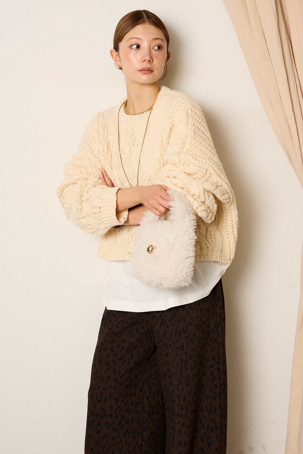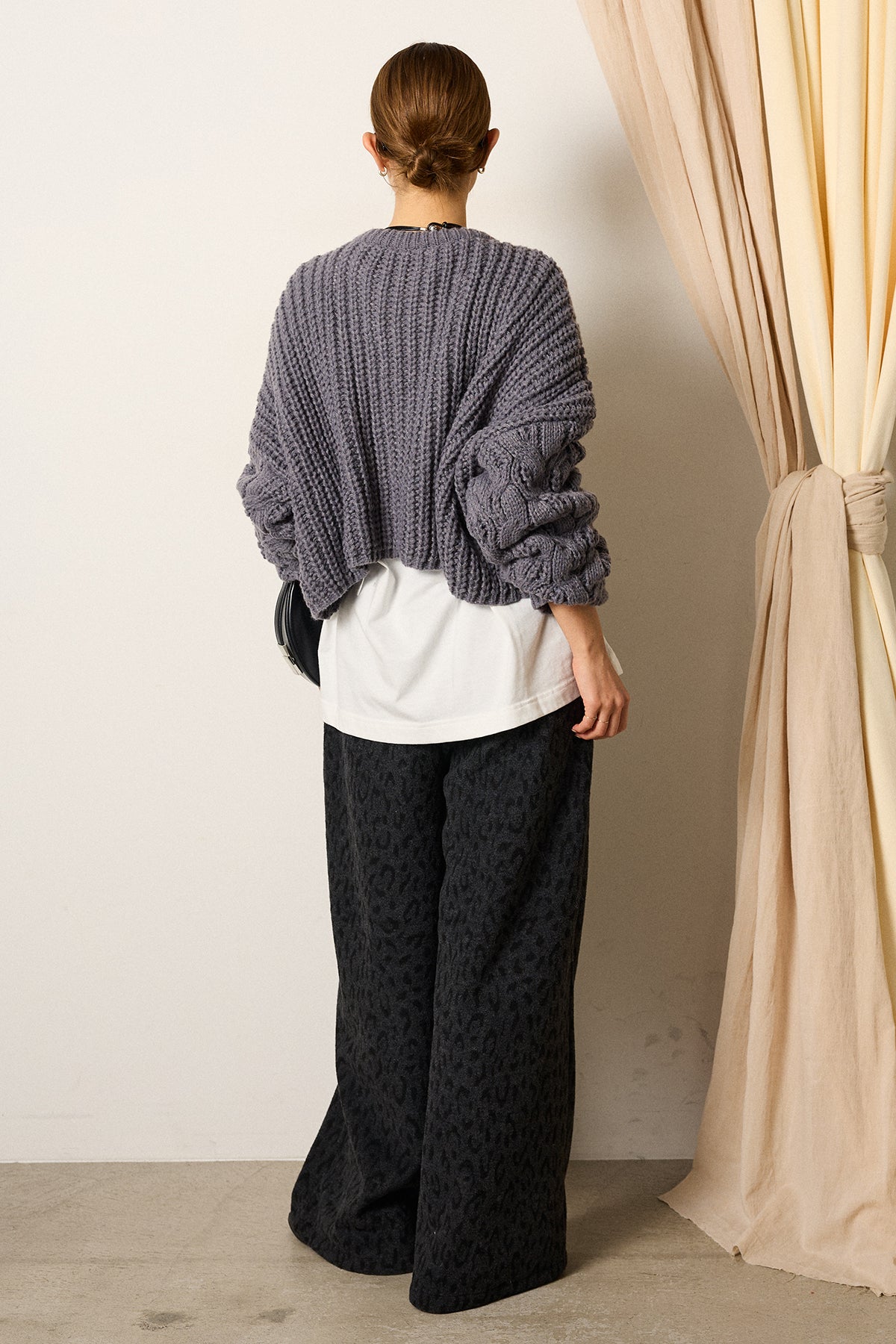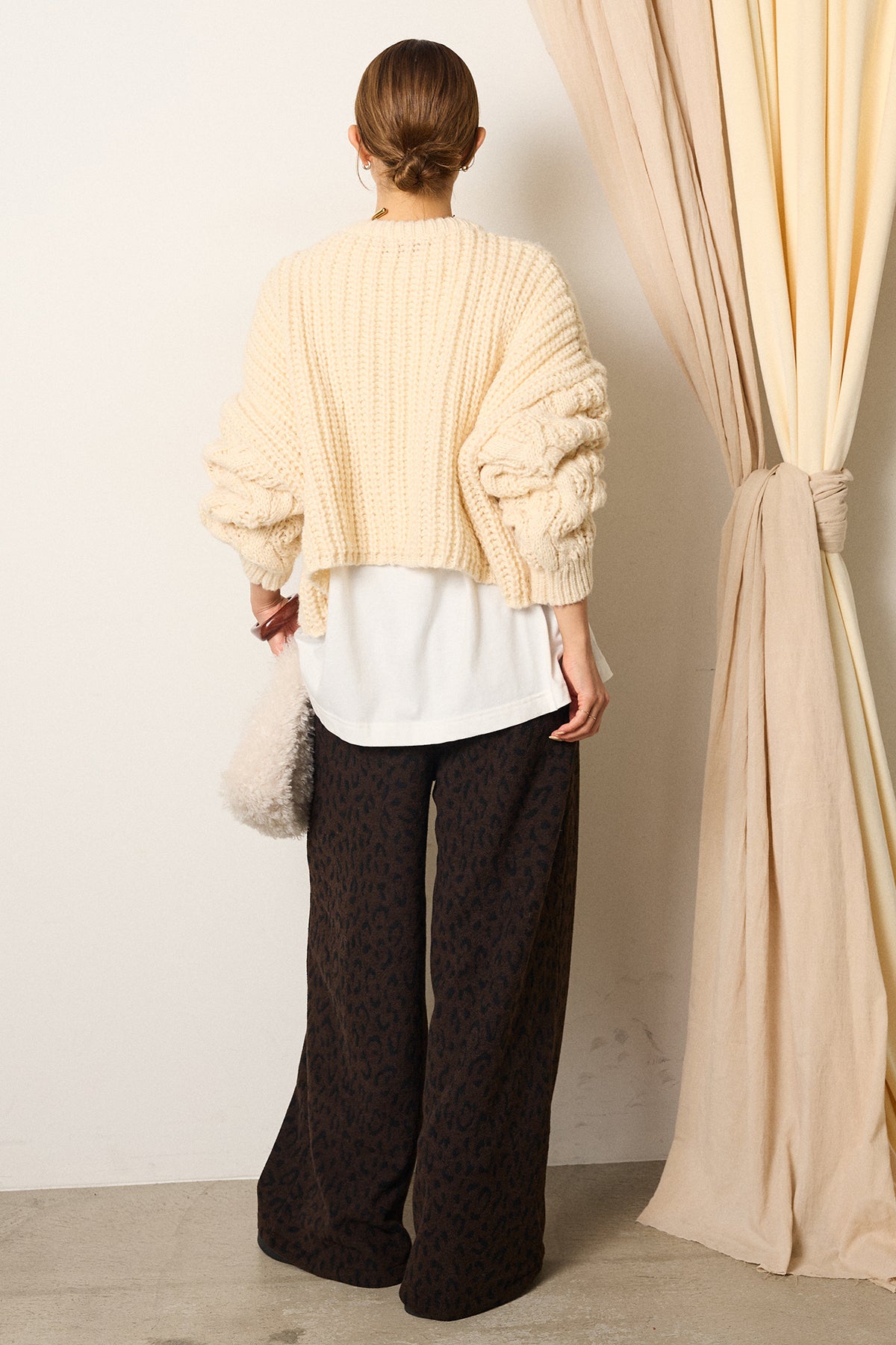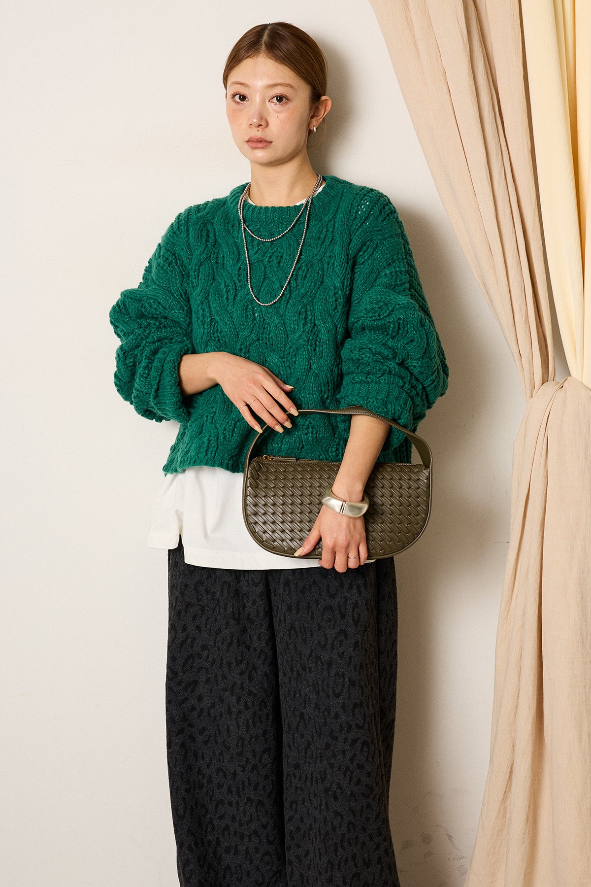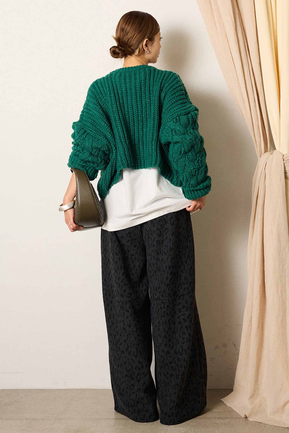 立体感のあるケーブル編みが目を惹くショートニット。 ふんわりとした編み地が優しい雰囲気をつくり、程よい厚みで暖かさも抜群です。 リラックス感のあるゆったりシルエットながら、短めの着丈でバランス良くまとまります。 ハイウエストボトムと合わせれば、スタイルアップも叶う万能アイテムです。