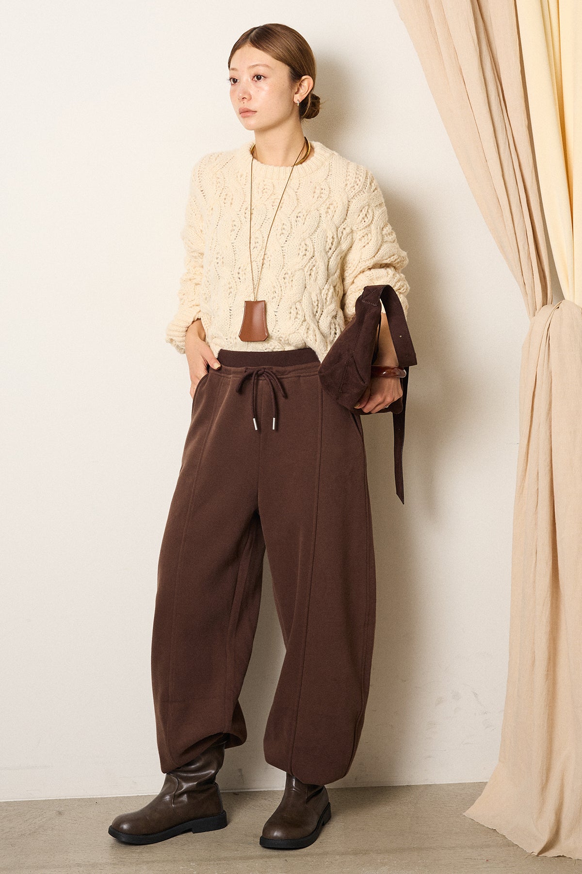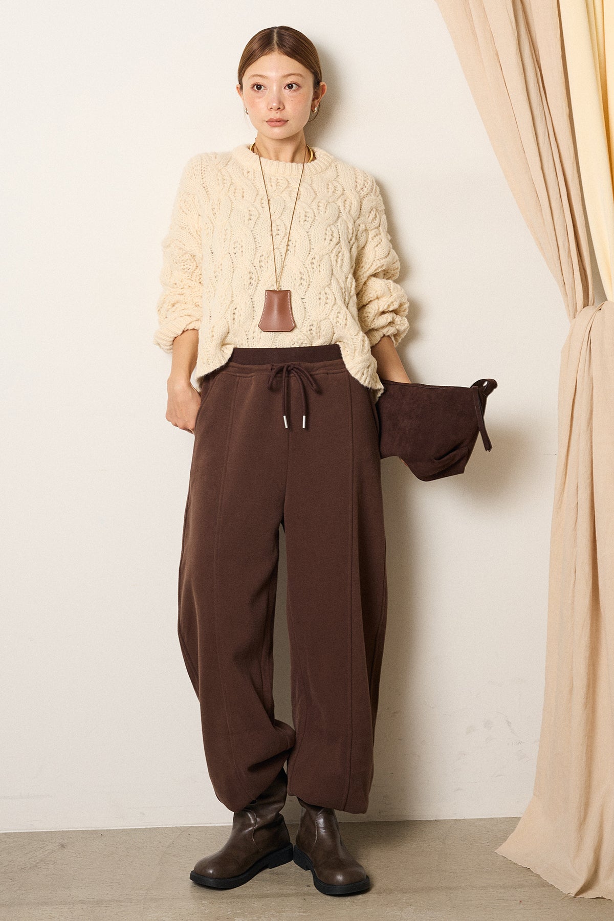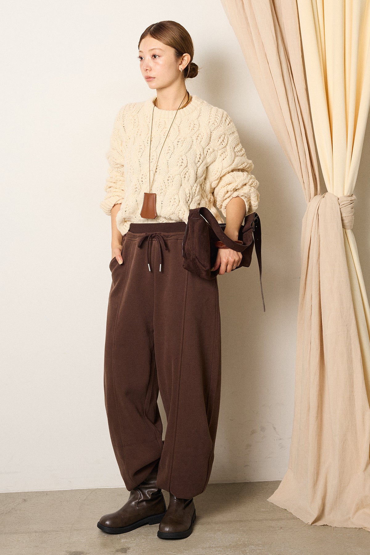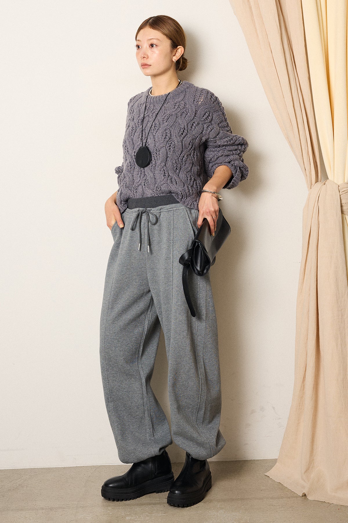 立体的なカーブシルエットが魅力のスウェットパンツ。 柔らかな素材感でリラックスした穿き心地ながら、ラインを拾いすぎずモードな印象に仕上がります。 裾にかけて程よくボリュームを持たせたシルエットが、こなれ感を演出。 カジュアルなトップスはもちろん、シャツやジャケットとのミックススタイルもおすすめです。