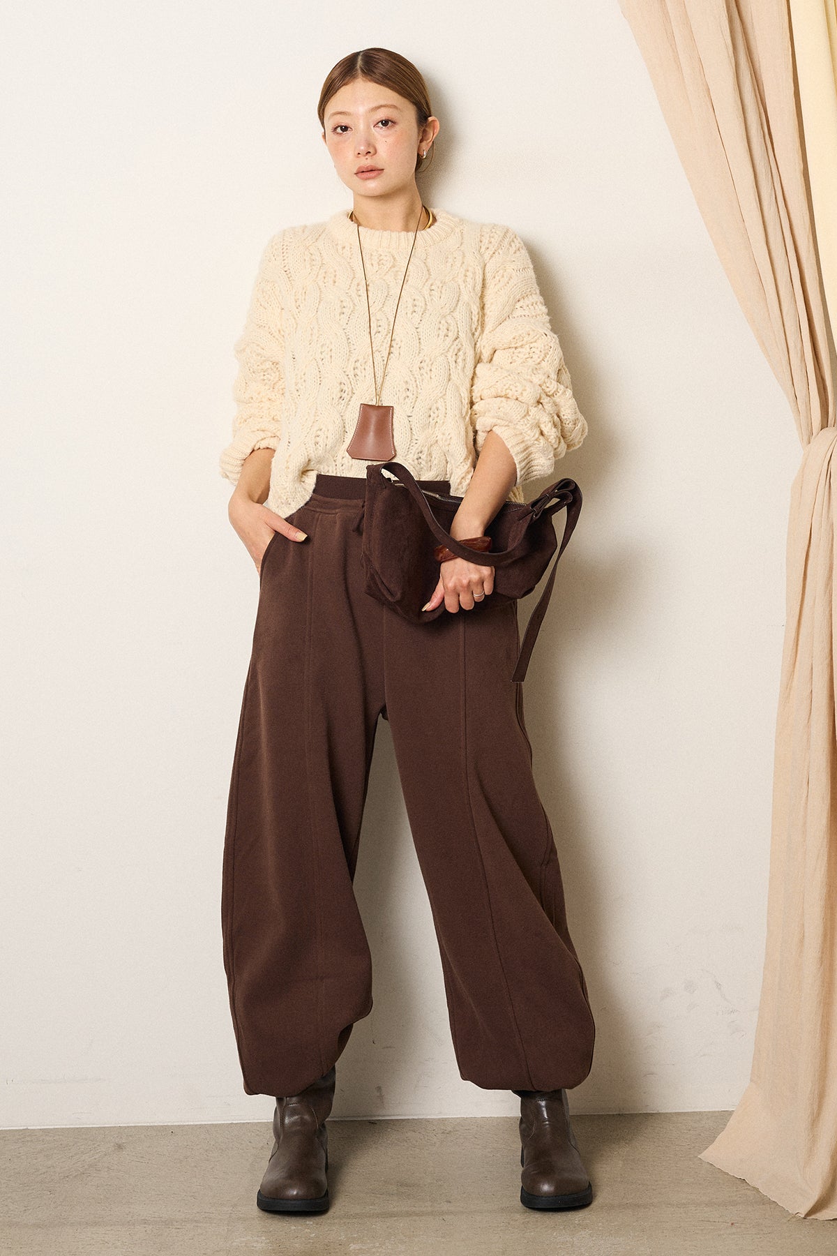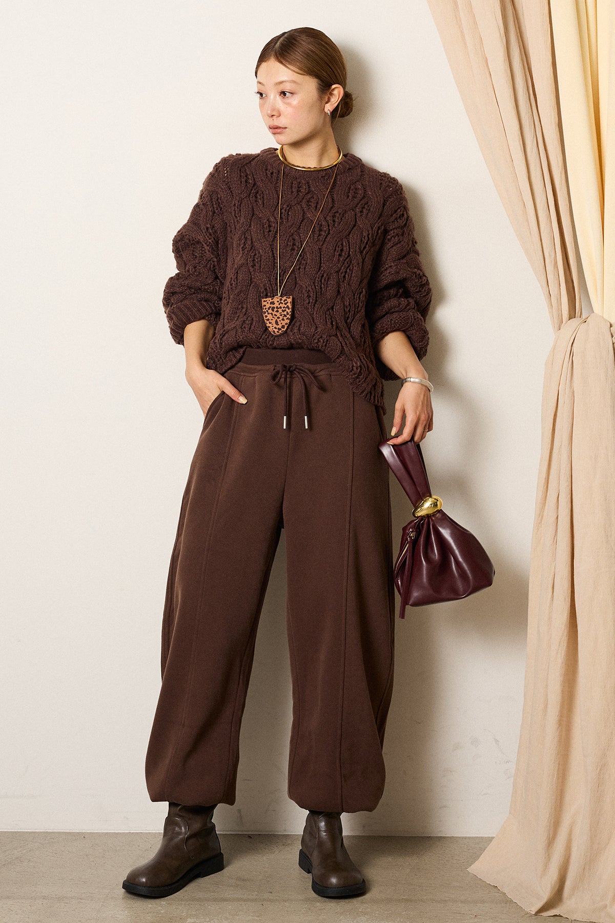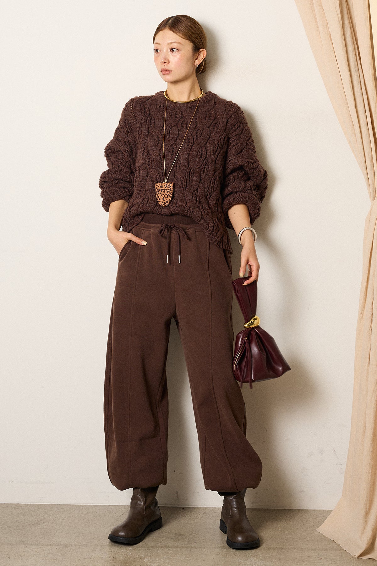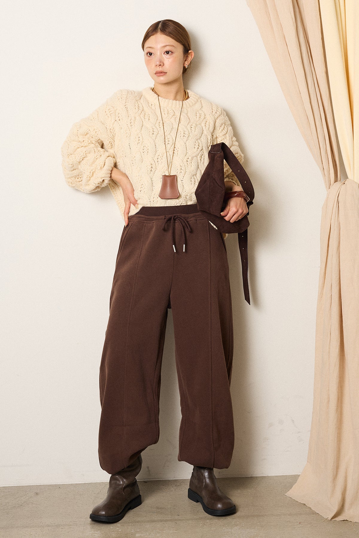 立体的なカーブシルエットが魅力のスウェットパンツ。 柔らかな素材感でリラックスした穿き心地ながら、ラインを拾いすぎずモードな印象に仕上がります。 裾にかけて程よくボリュームを持たせたシルエットが、こなれ感を演出。 カジュアルなトップスはもちろん、シャツやジャケットとのミックススタイルもおすすめです。