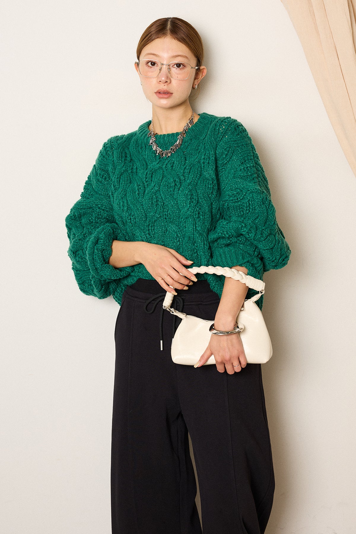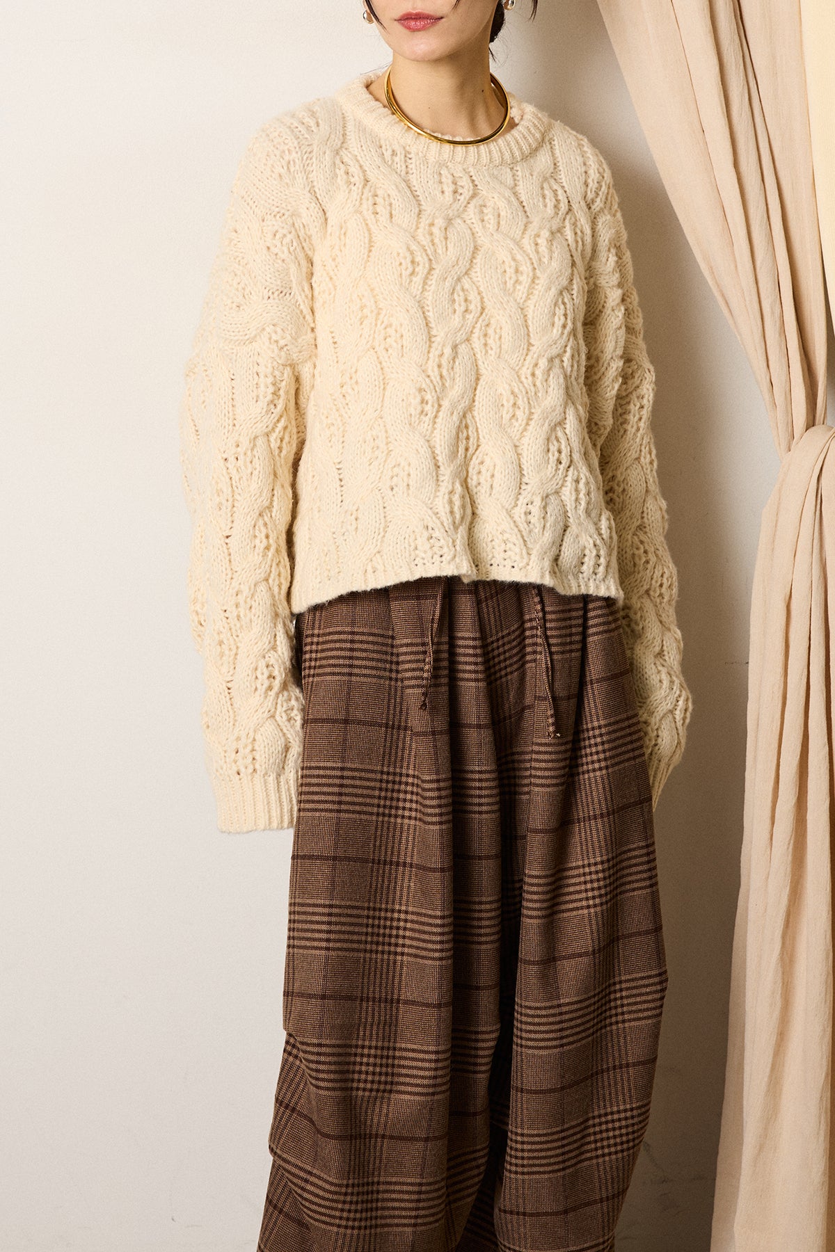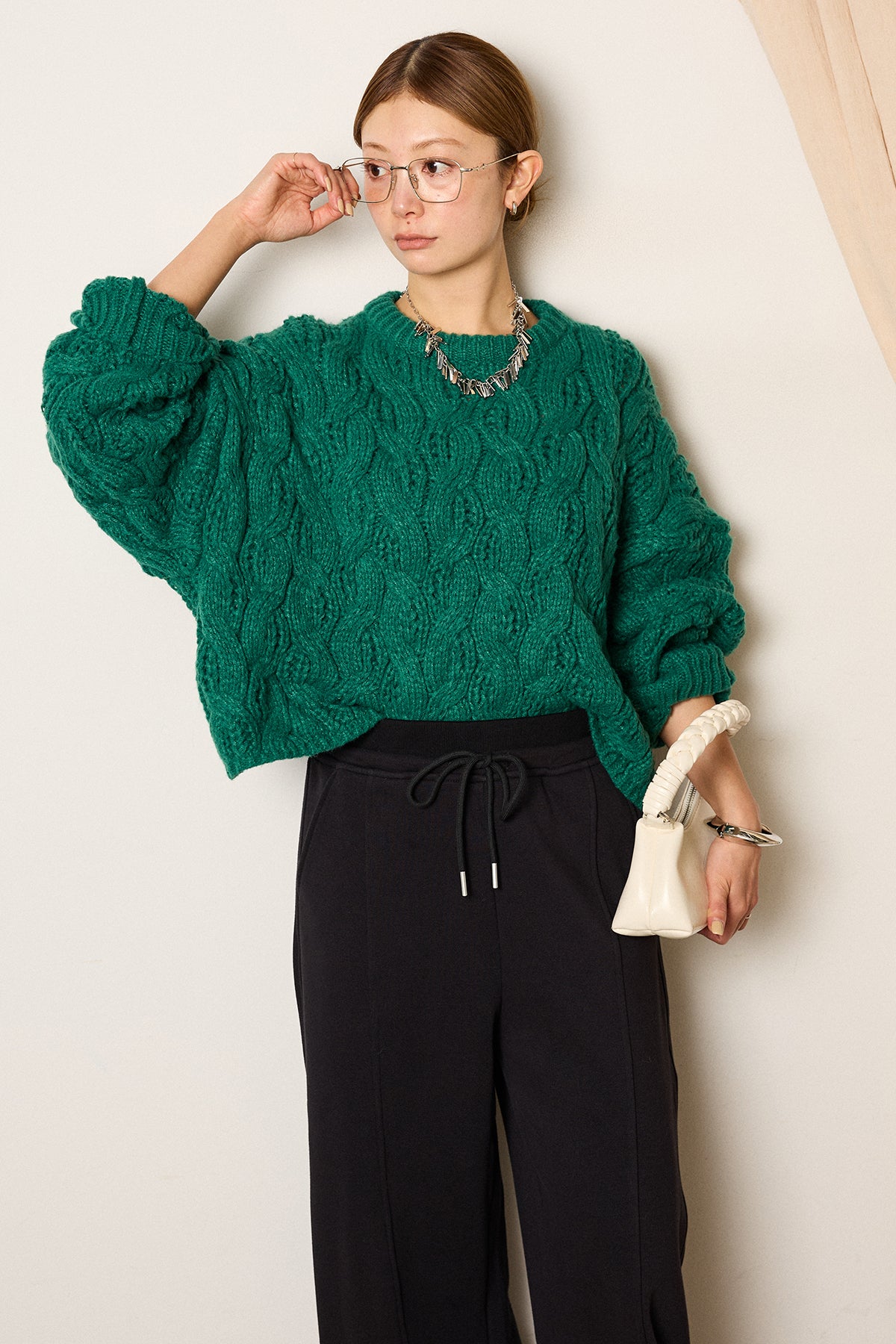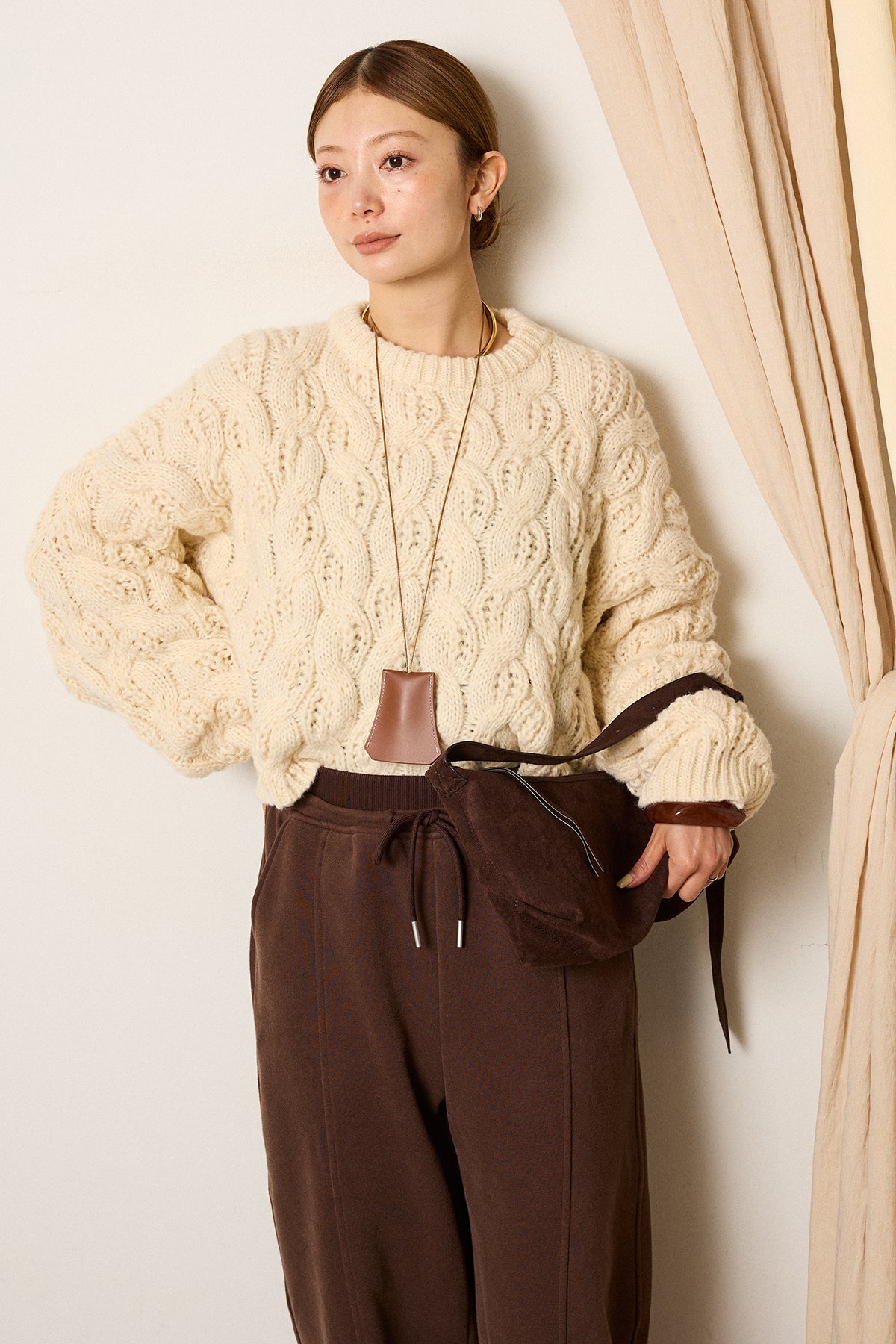 立体感のあるケーブル編みが目を惹くショートニット。 ふんわりとした編み地が優しい雰囲気をつくり、程よい厚みで暖かさも抜群です。 リラックス感のあるゆったりシルエットながら、短めの着丈でバランス良くまとまります。 ハイウエストボトムと合わせれば、スタイルアップも叶う万能アイテムです。