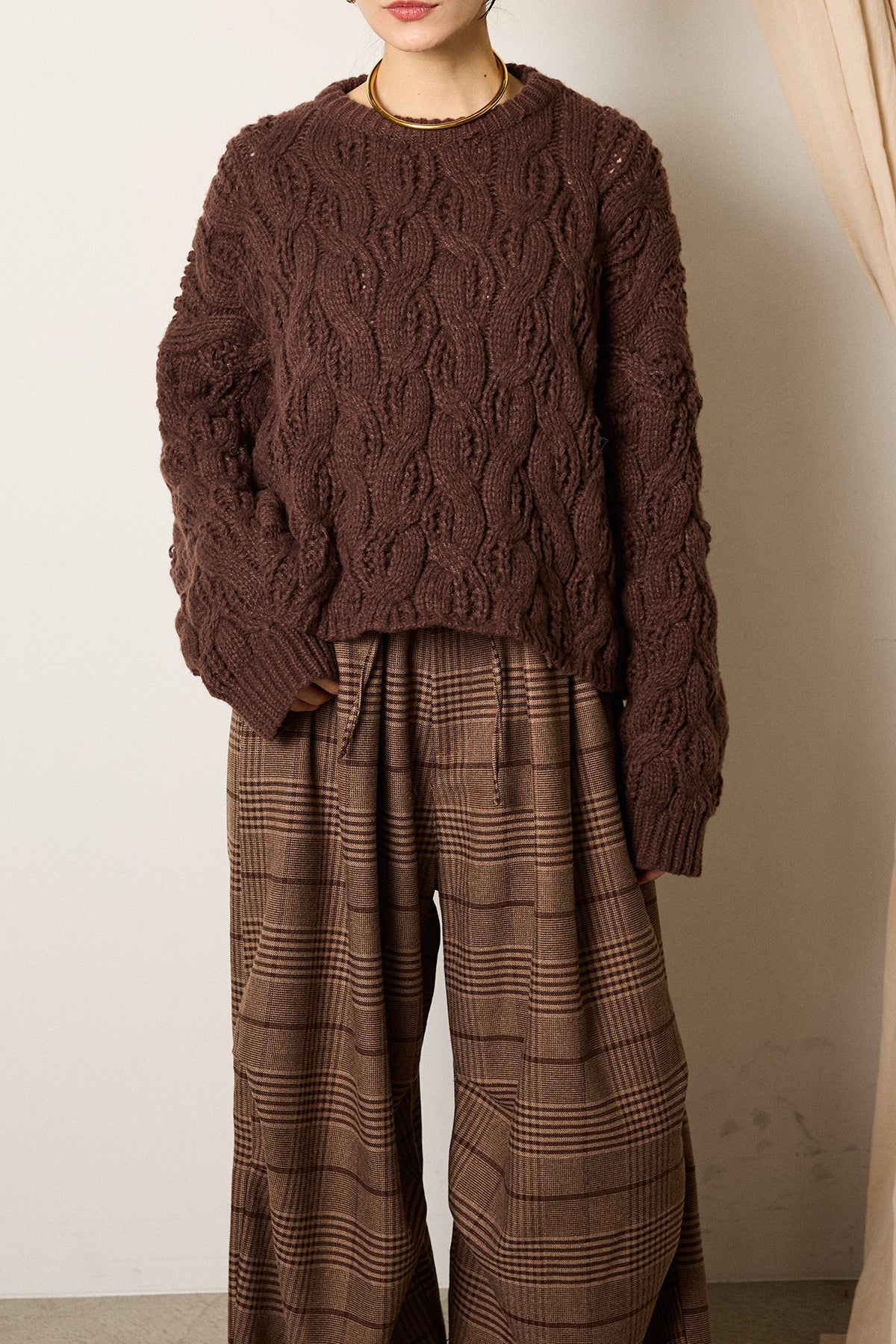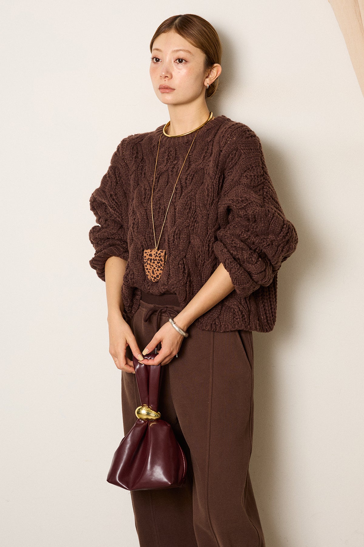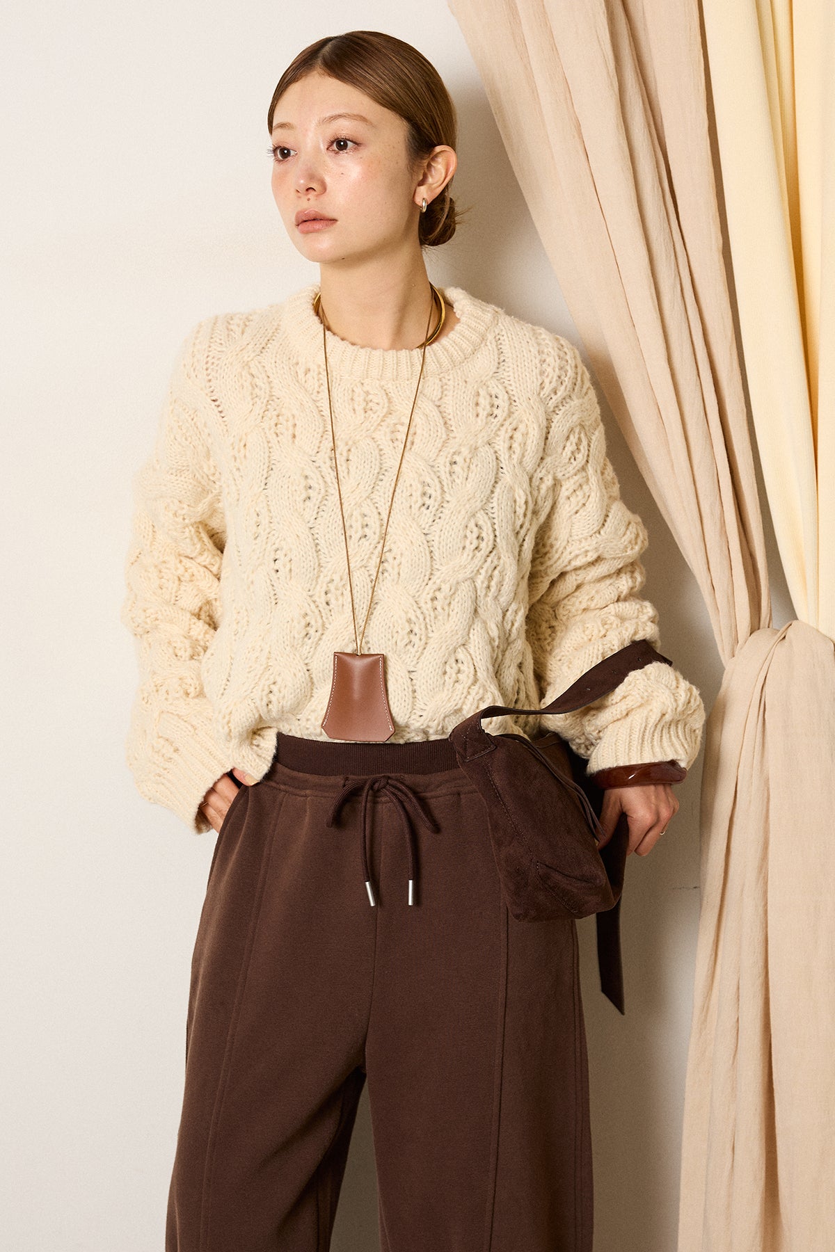 立体感のあるケーブル編みが目を惹くショートニット。 ふんわりとした編み地が優しい雰囲気をつくり、程よい厚みで暖かさも抜群です。 リラックス感のあるゆったりシルエットながら、短めの着丈でバランス良くまとまります。 ハイウエストボトムと合わせれば、スタイルアップも叶う万能アイテムです。