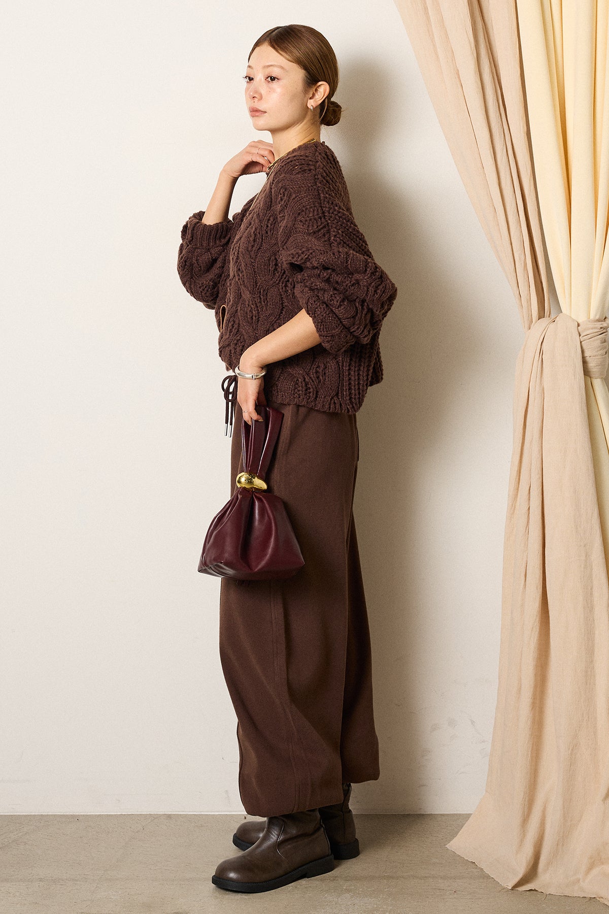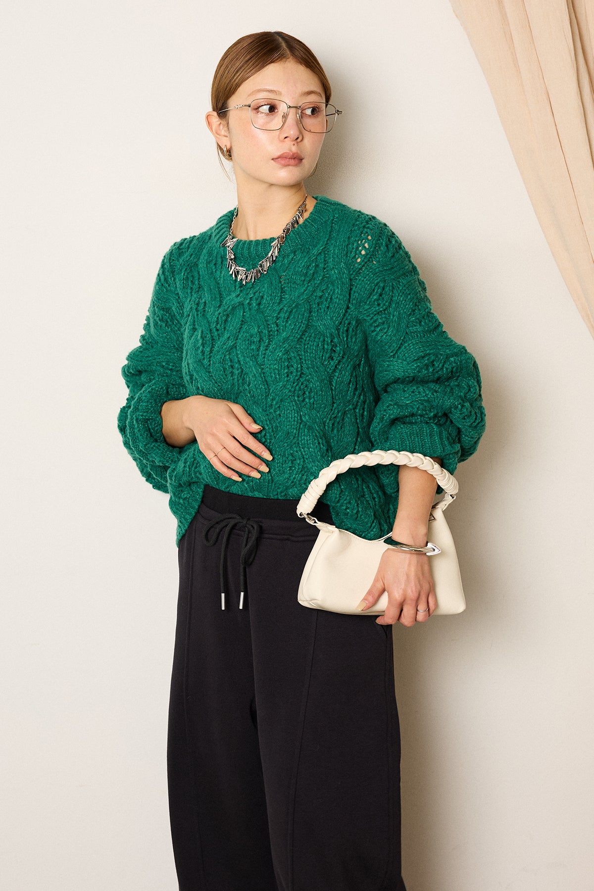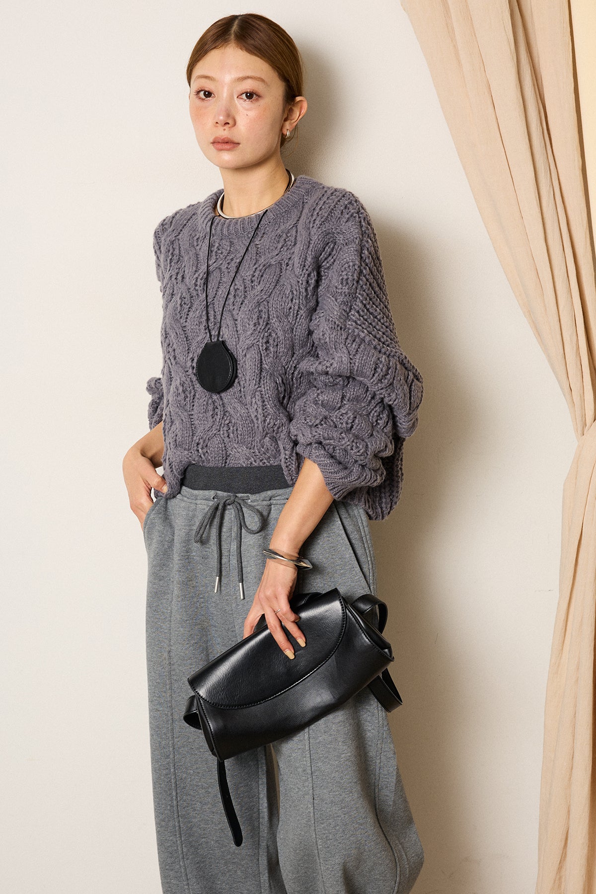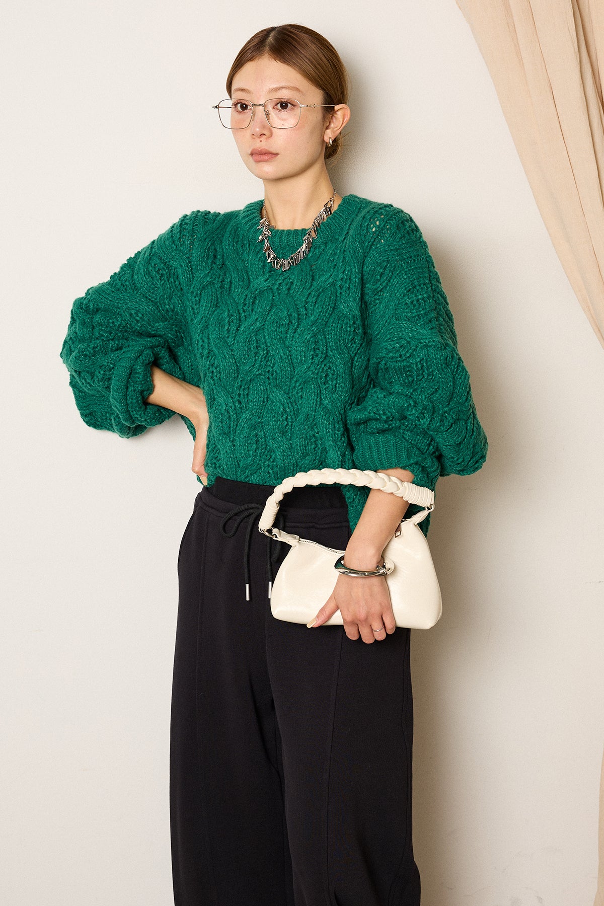 立体感のあるケーブル編みが目を惹くショートニット。 ふんわりとした編み地が優しい雰囲気をつくり、程よい厚みで暖かさも抜群です。 リラックス感のあるゆったりシルエットながら、短めの着丈でバランス良くまとまります。 ハイウエストボトムと合わせれば、スタイルアップも叶う万能アイテムです。