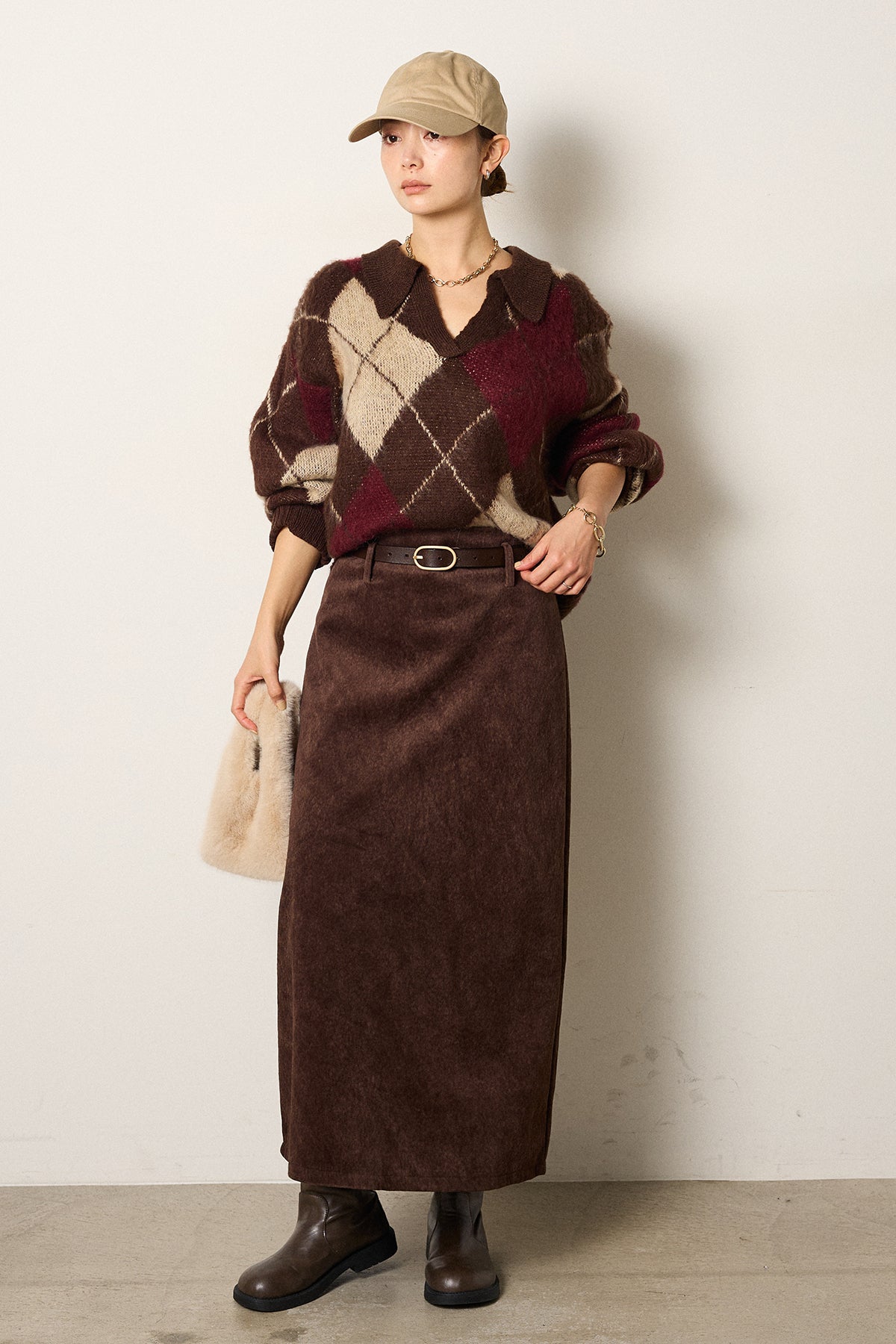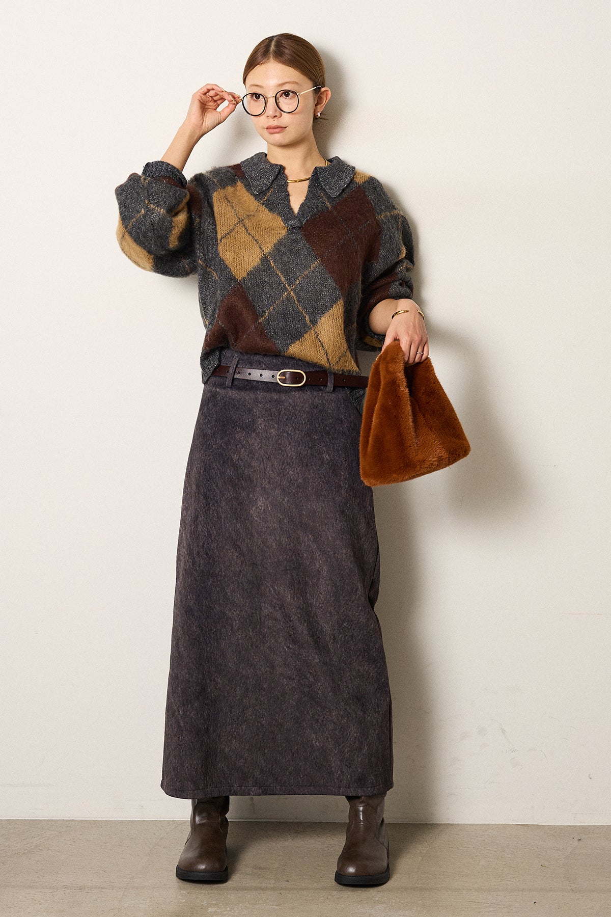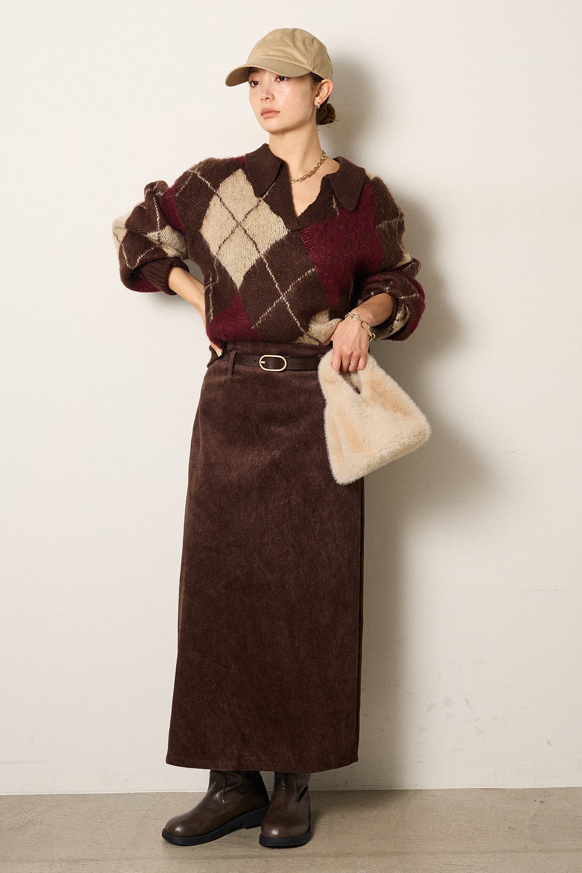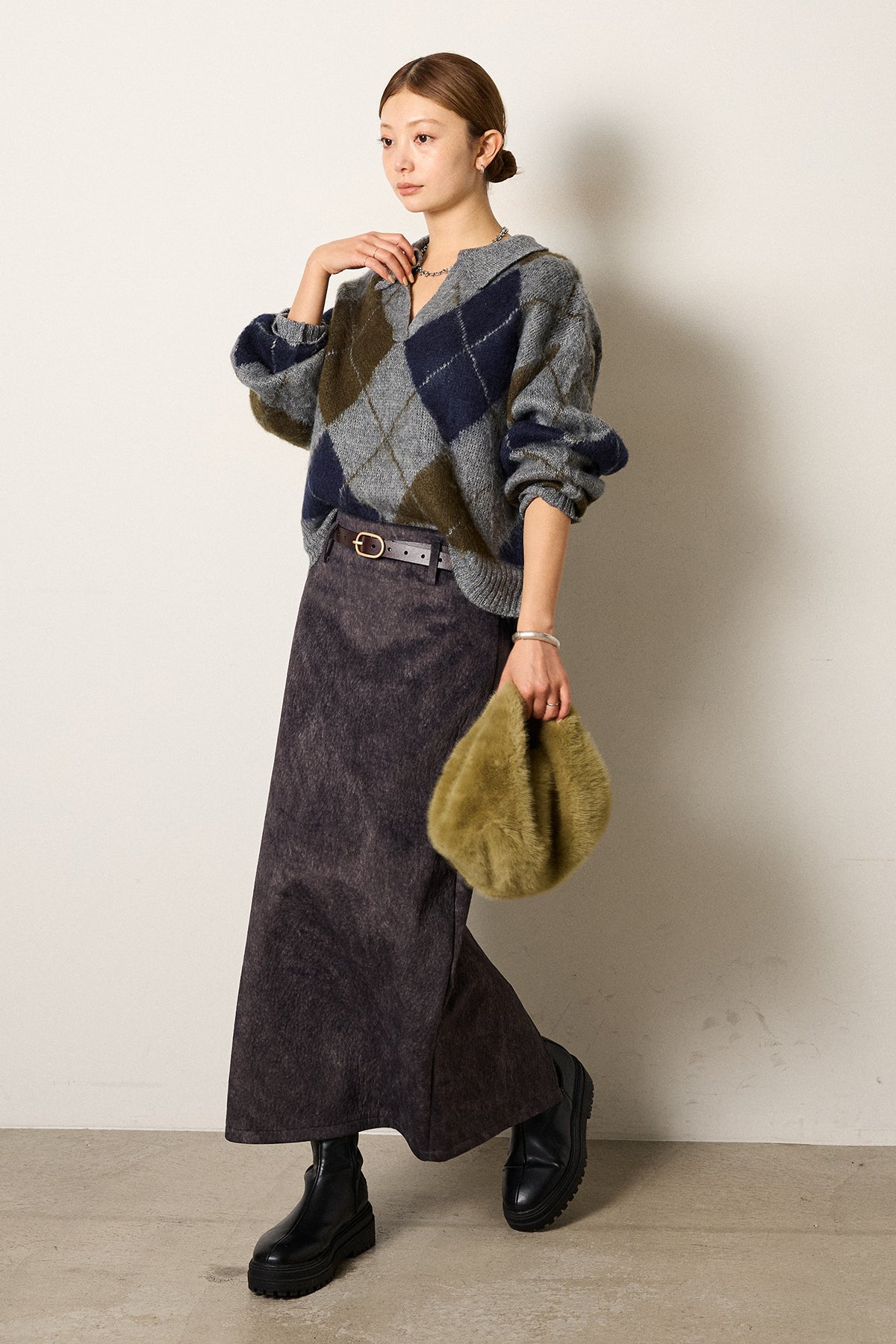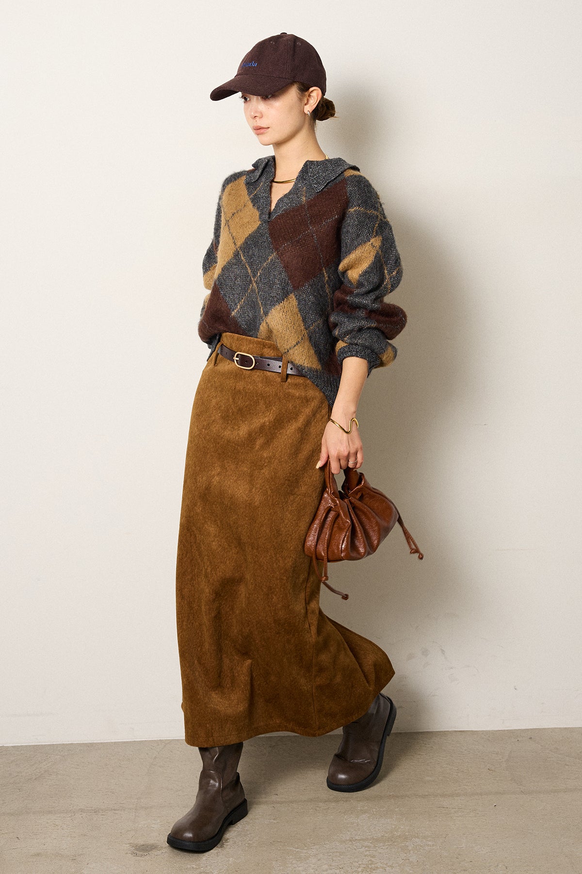 [SET]アクリルモヘアアーガイルキーネックプルオーバー+ロープベルト付きスウェード調スカート(2set)