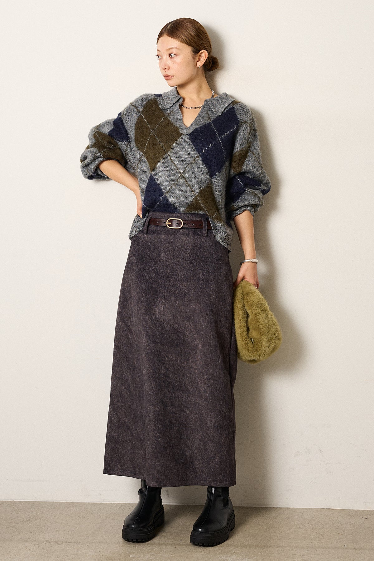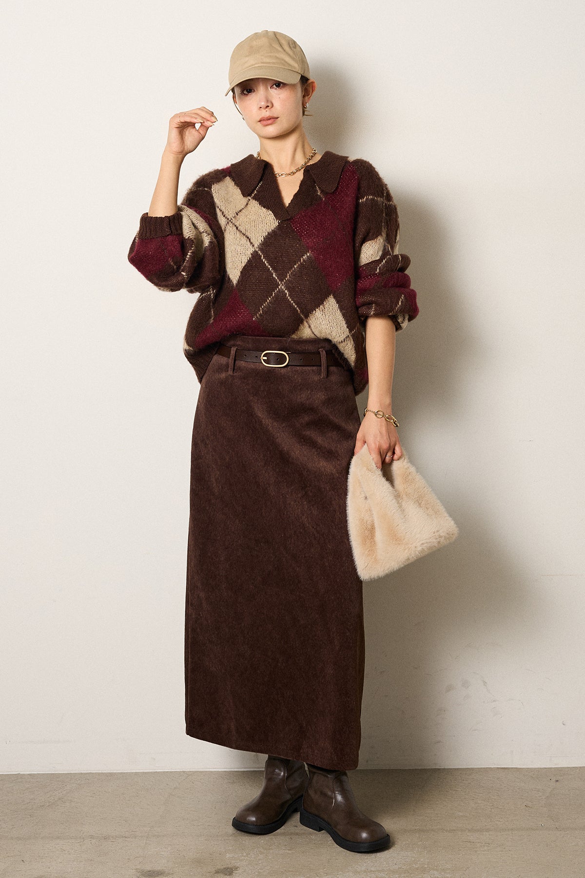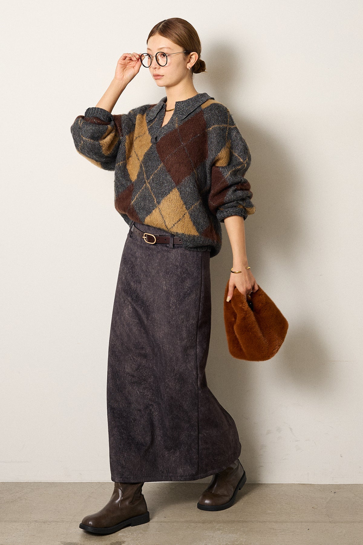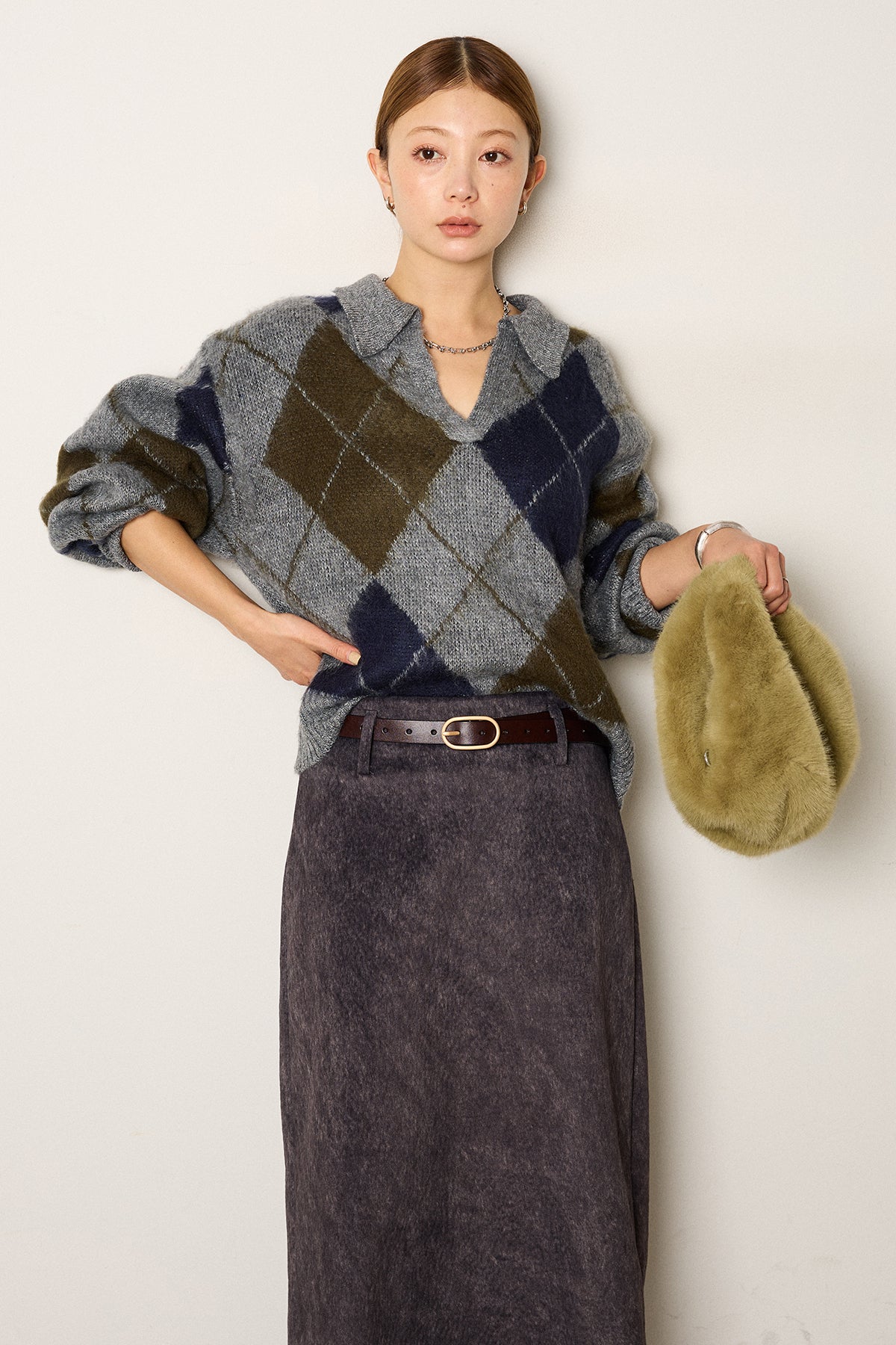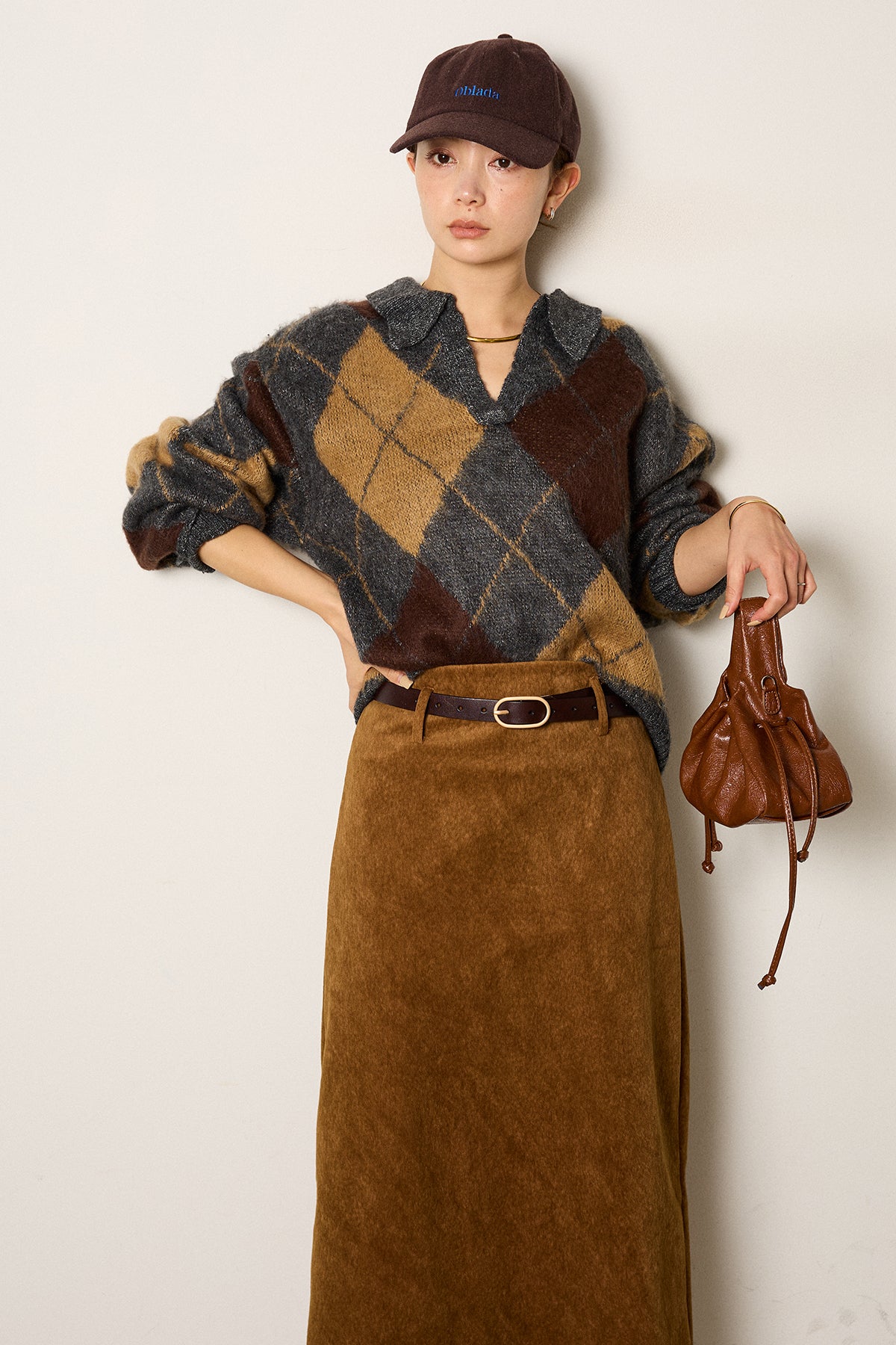 [SET]アクリルモヘアアーガイルキーネックプルオーバー+ロープベルト付きスウェード調スカート(2set)