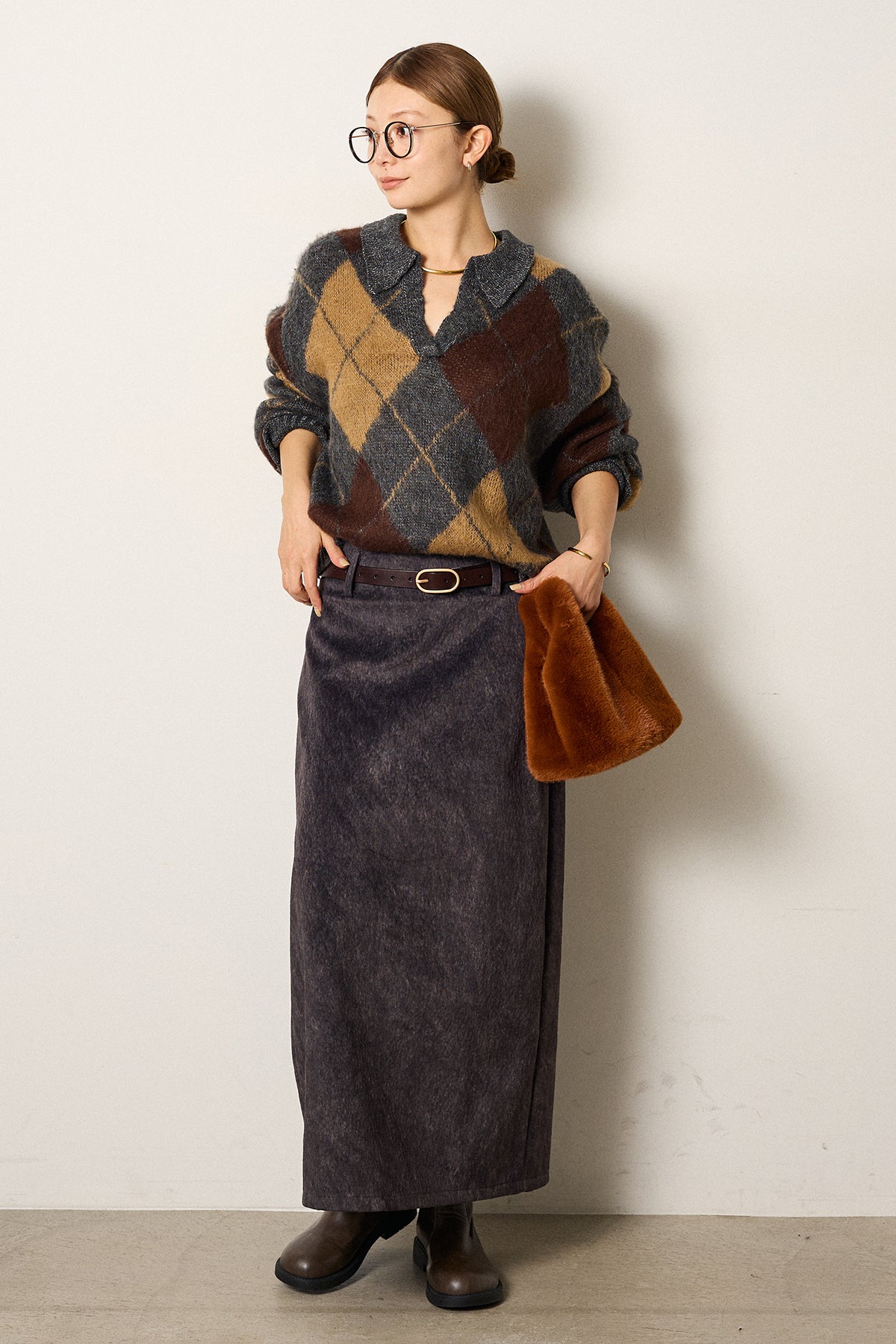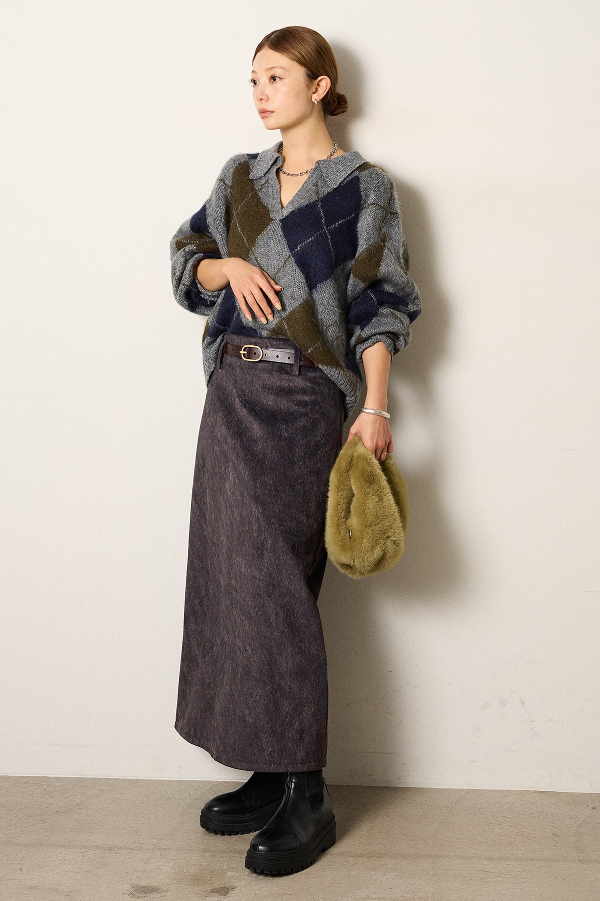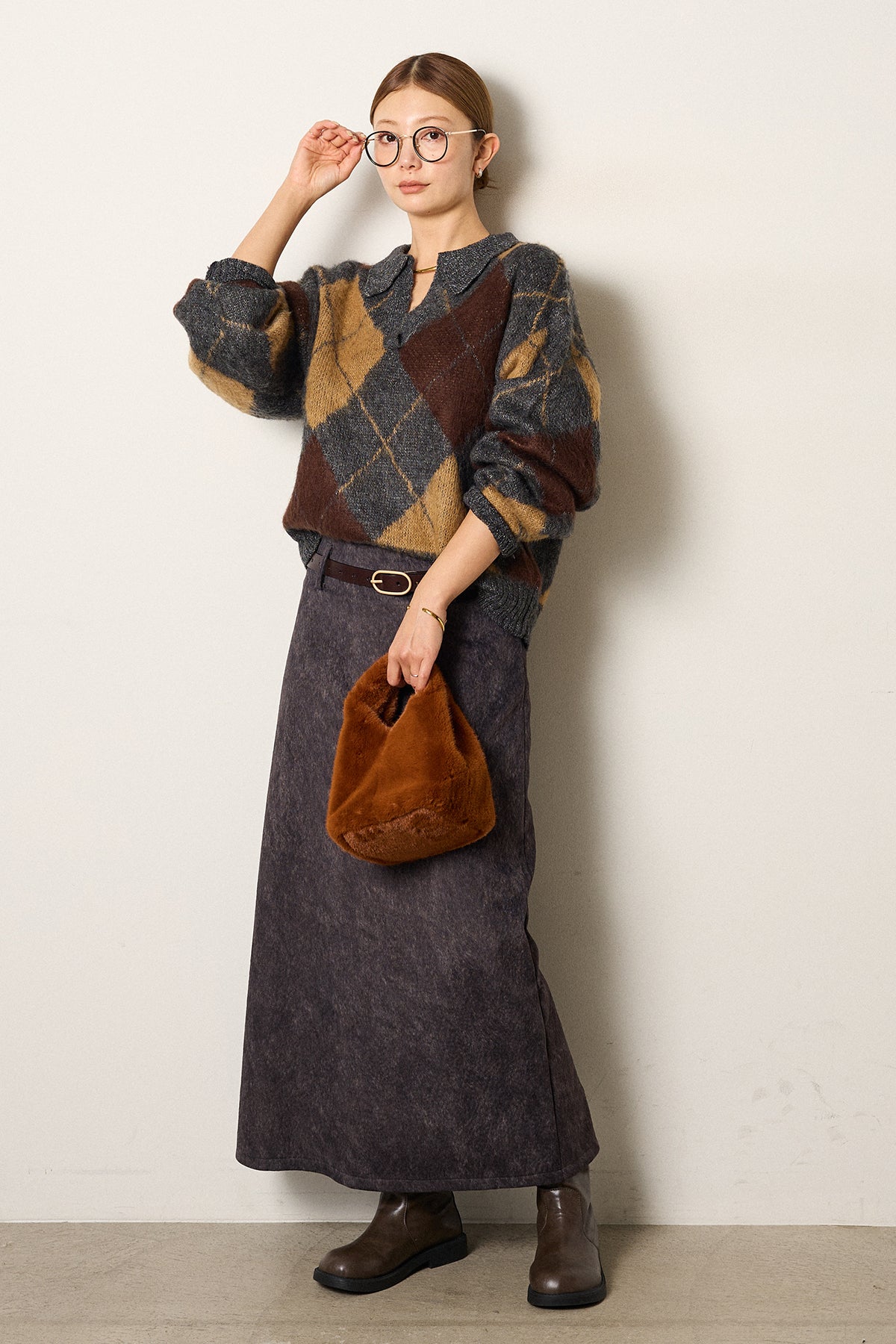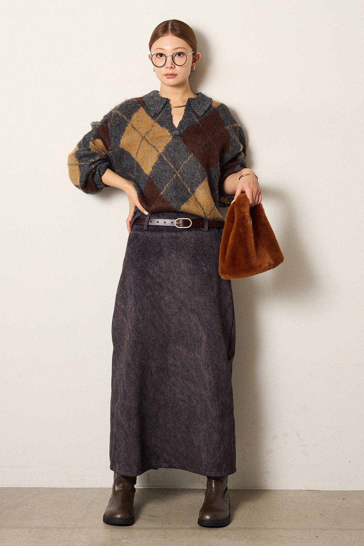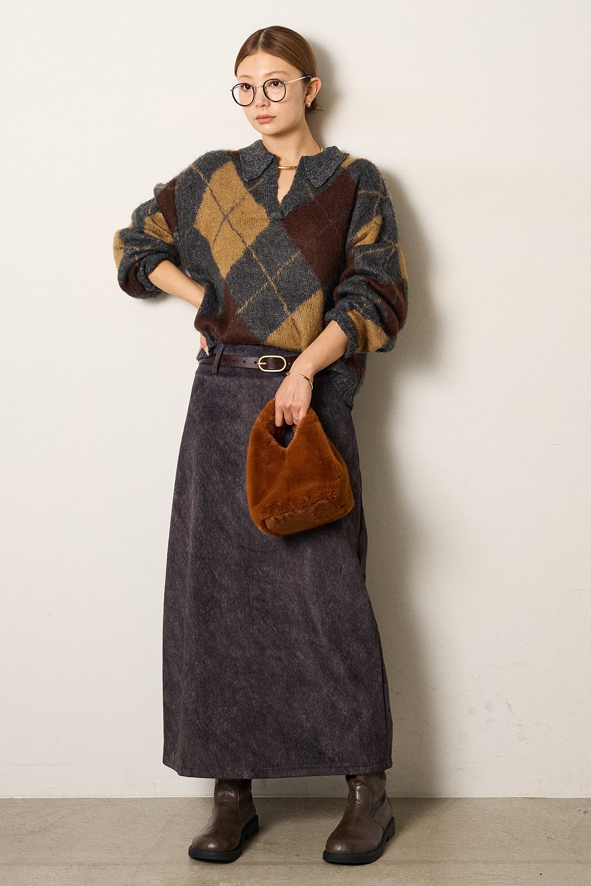 [SET]アクリルモヘアアーガイルキーネックプルオーバー+ロープベルト付きスウェード調スカート(2set)
