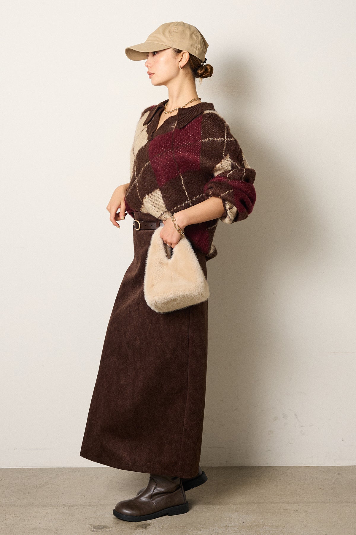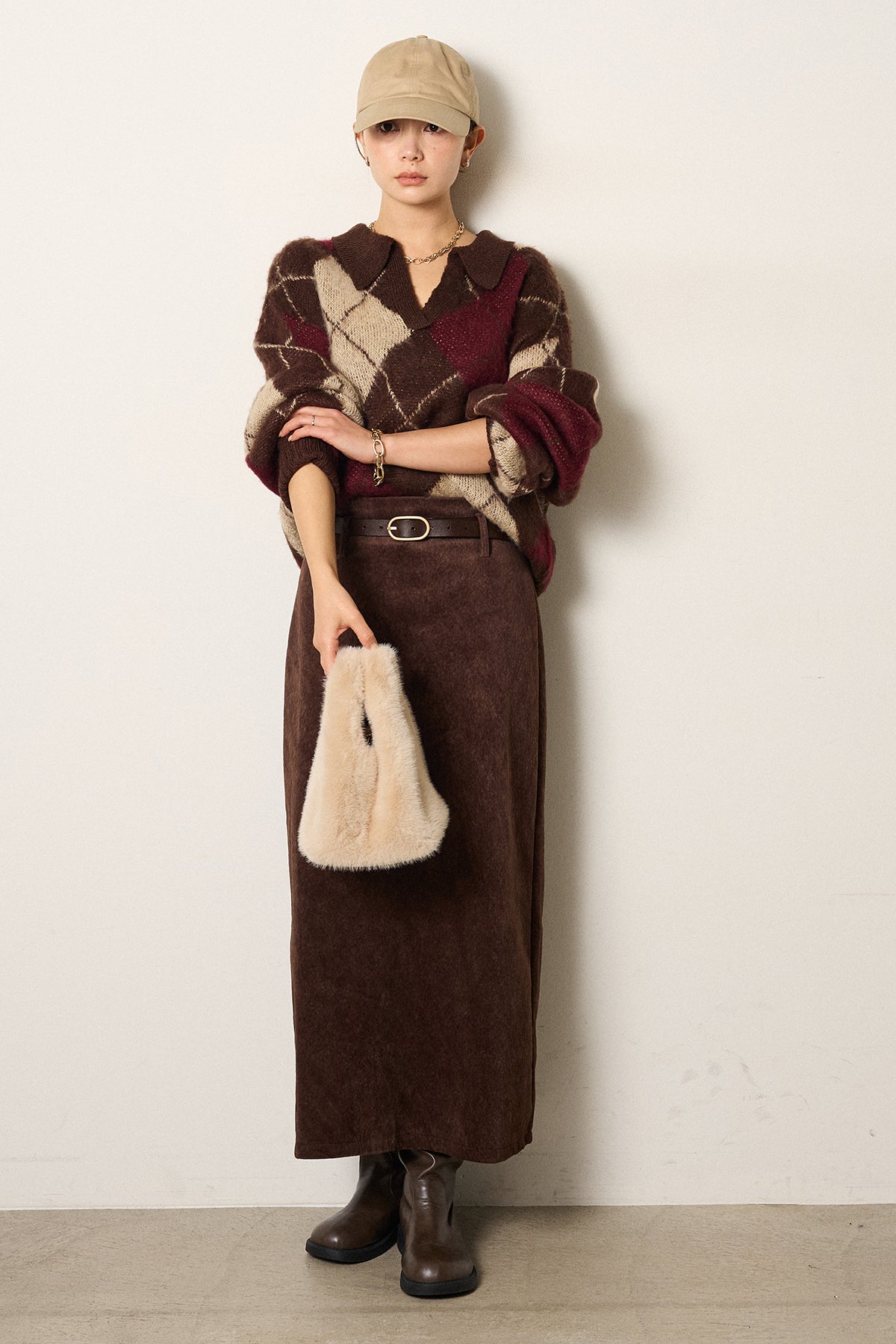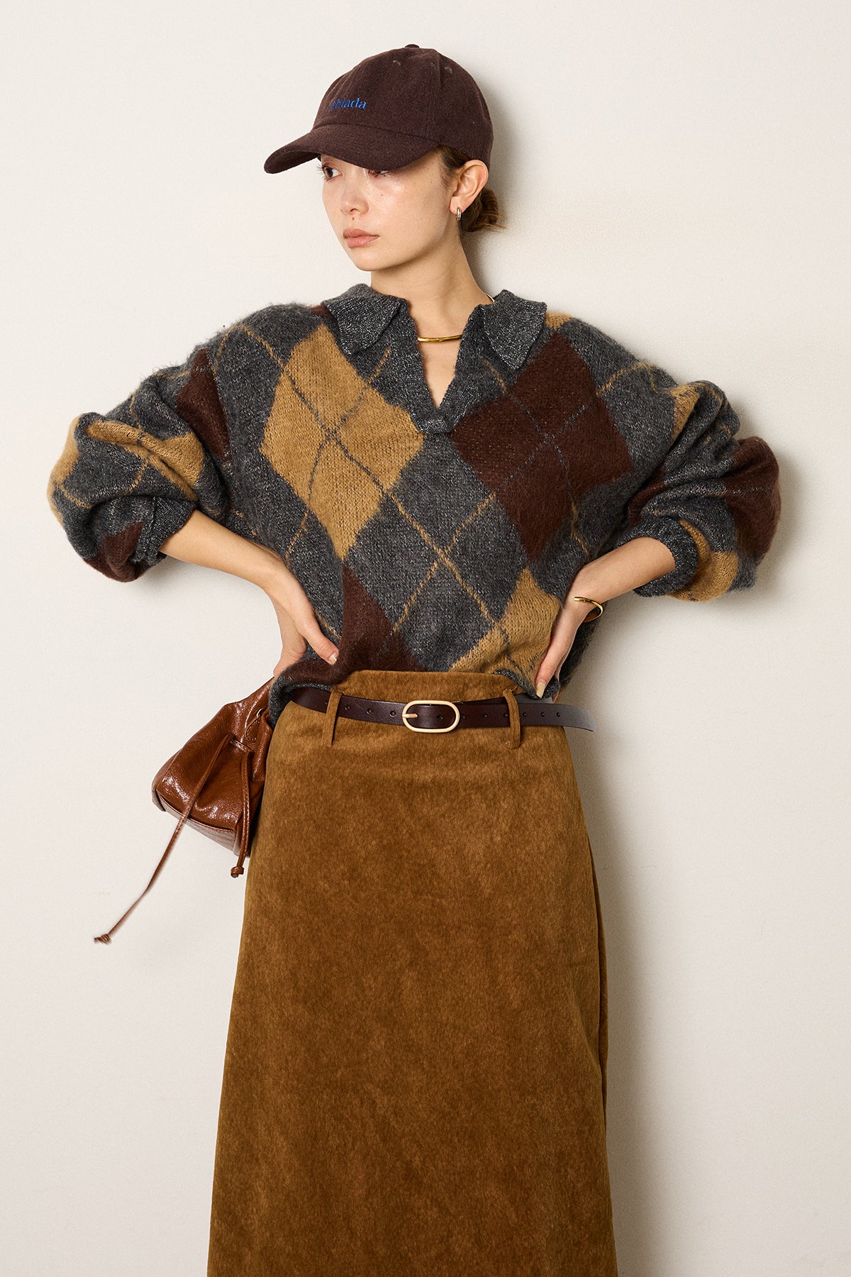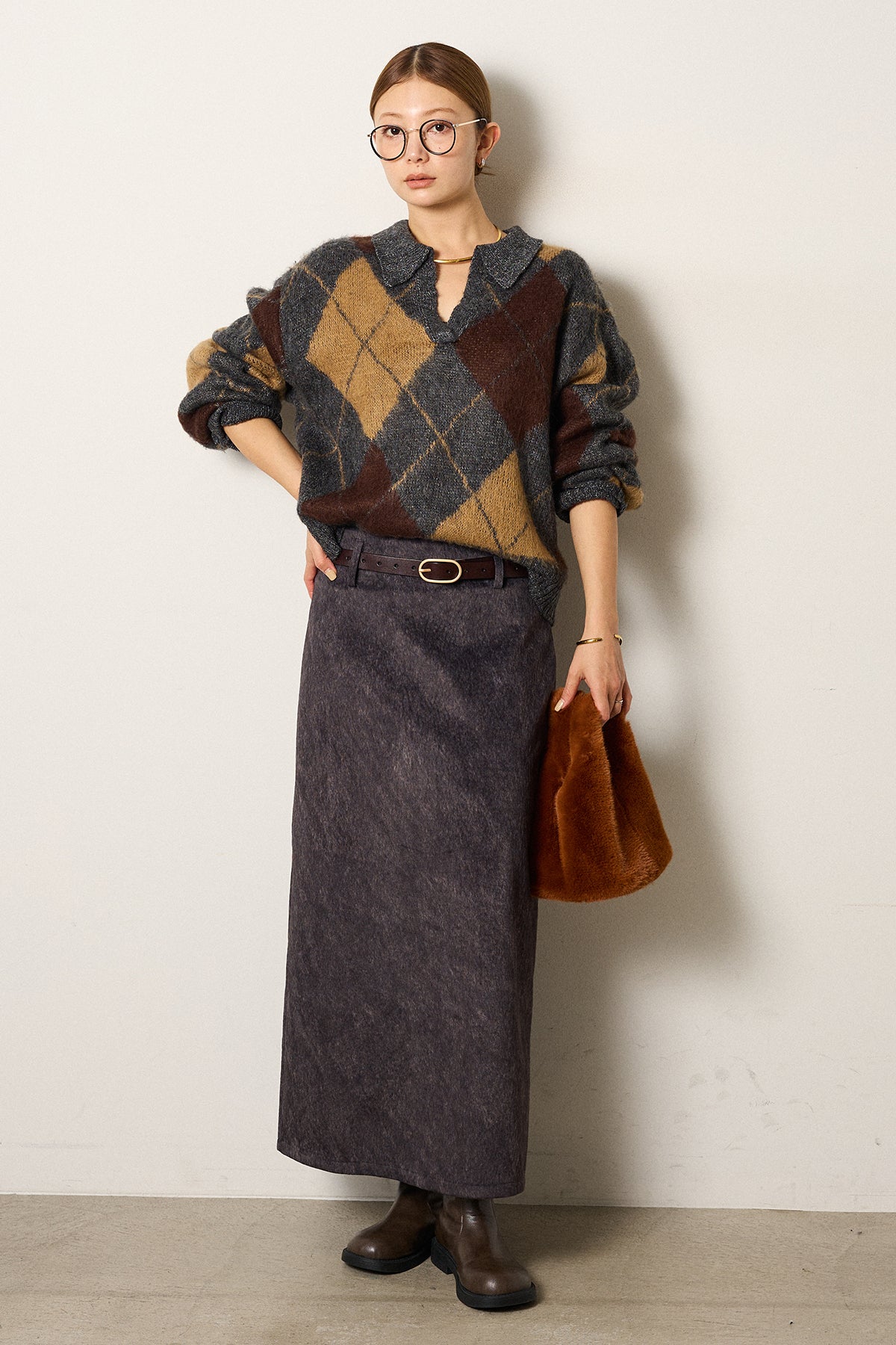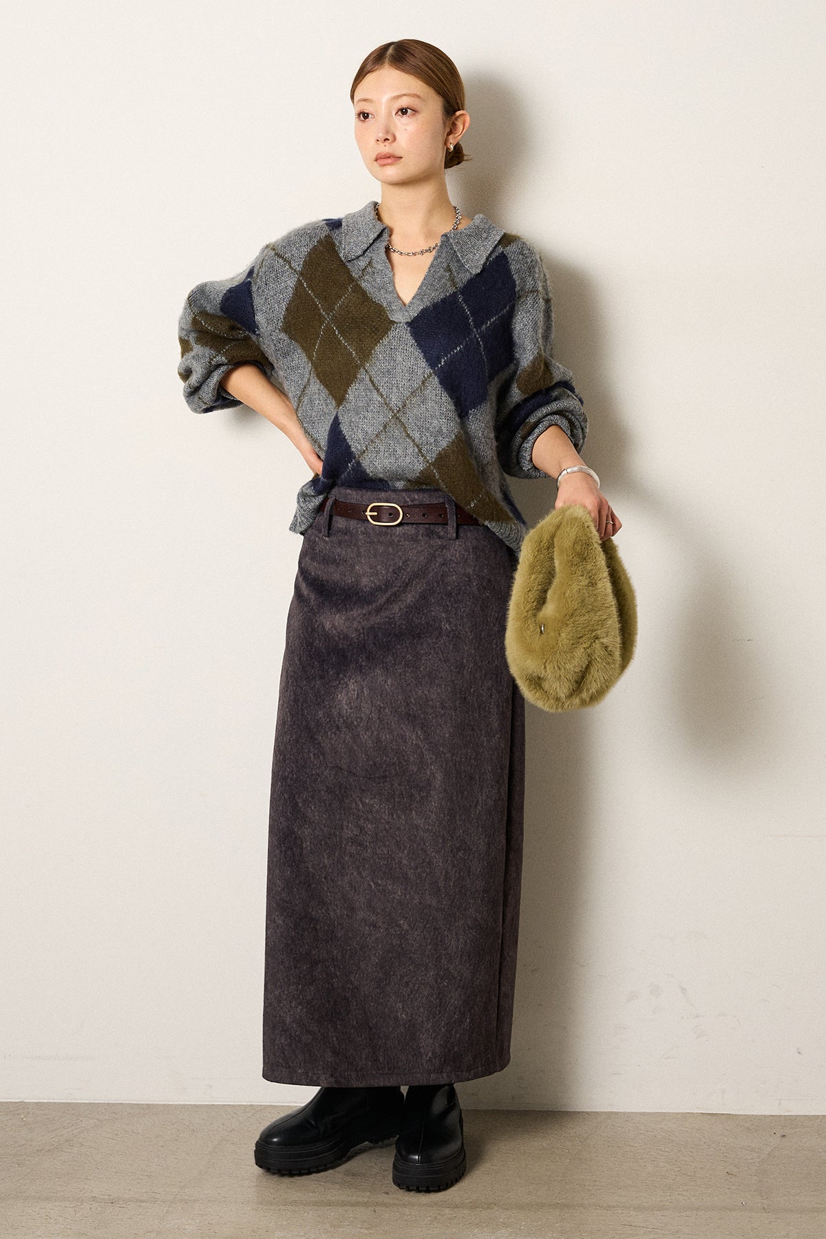 [SET]アクリルモヘアアーガイルキーネックプルオーバー+ロープベルト付きスウェード調スカート(2set)