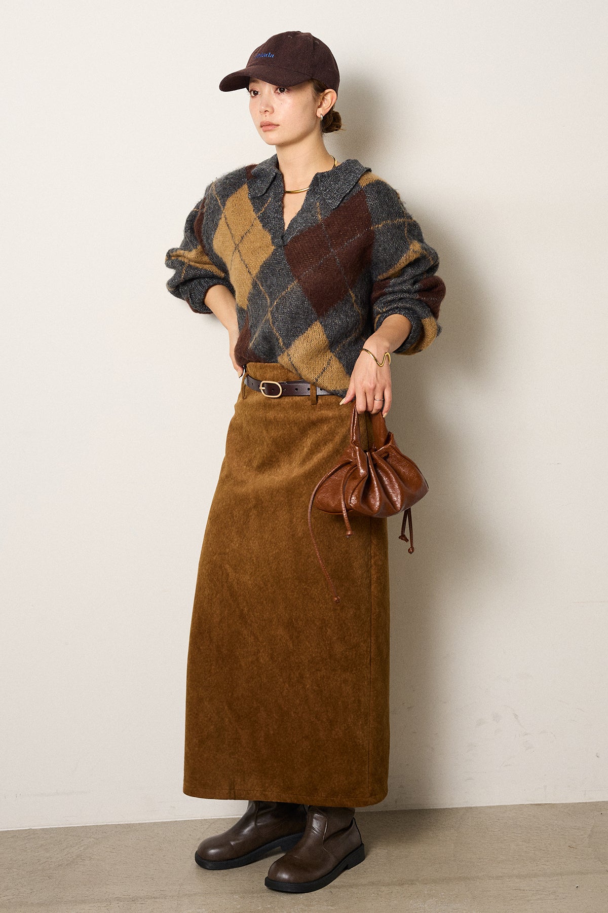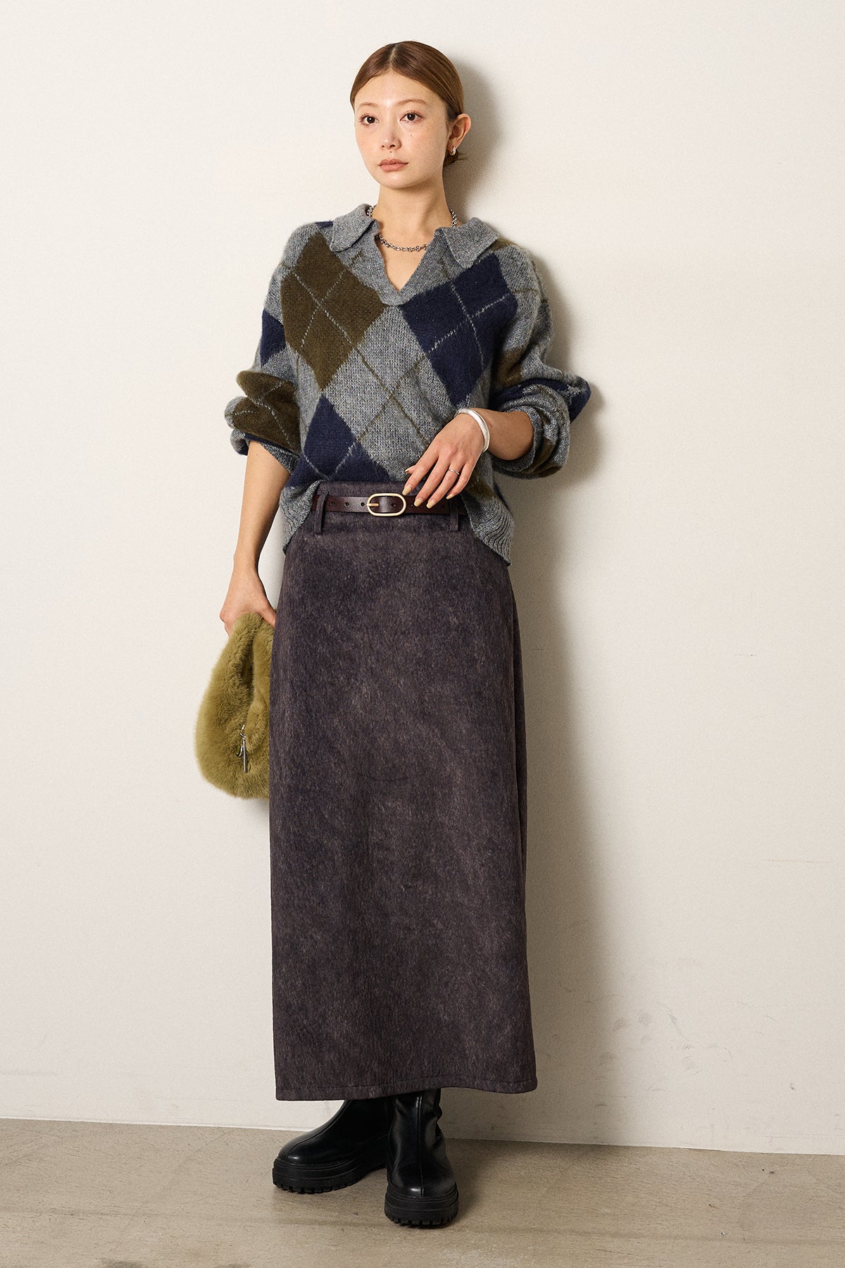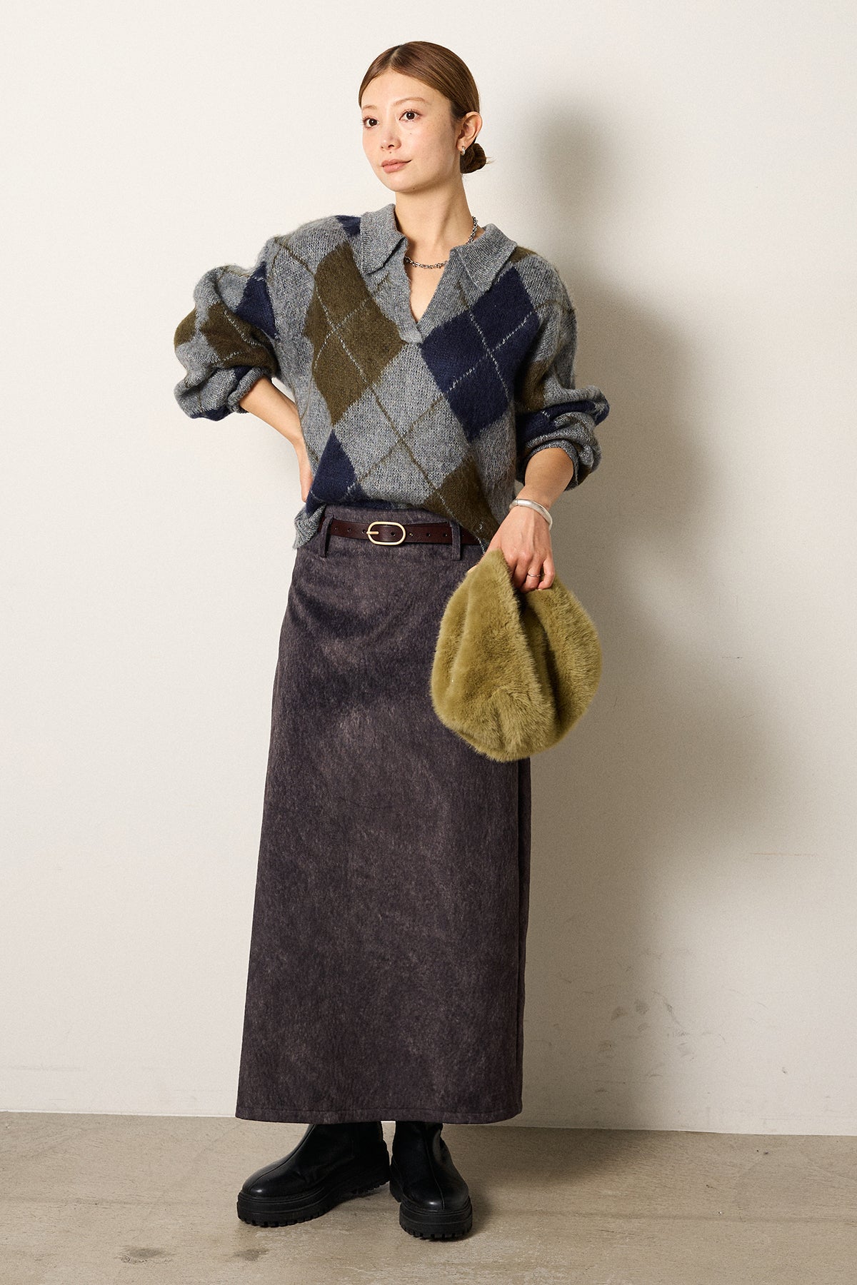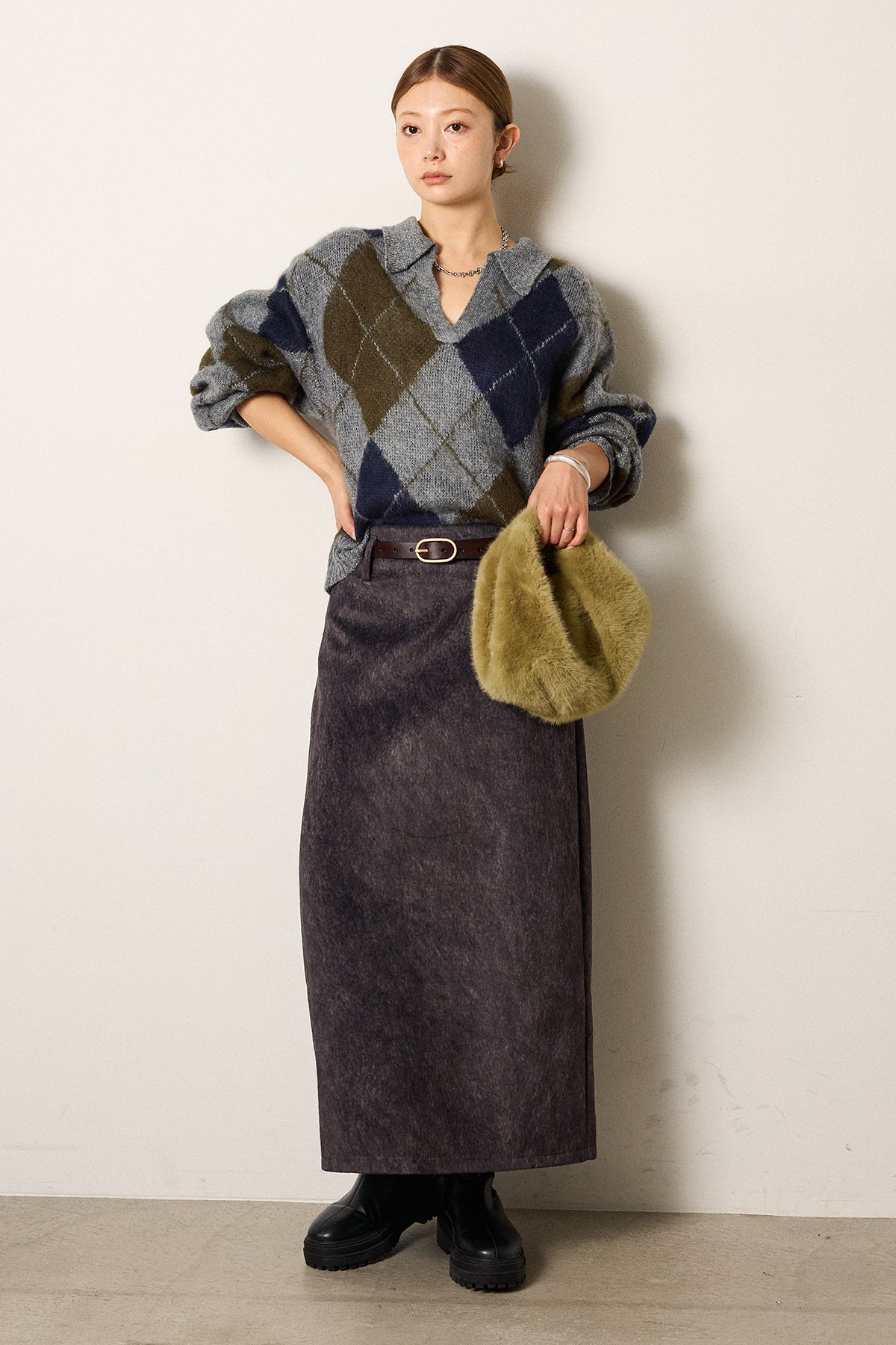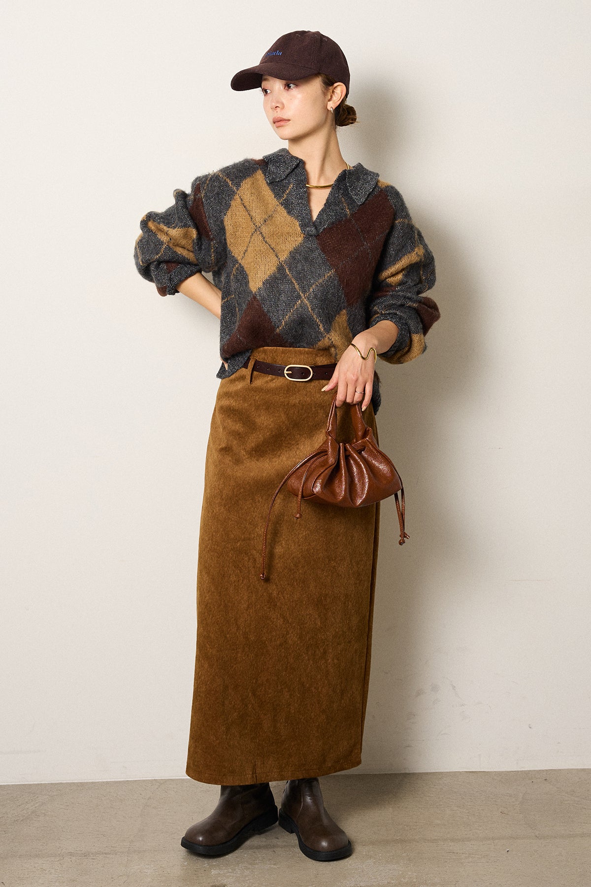 [SET]アクリルモヘアアーガイルキーネックプルオーバー+ロープベルト付きスウェード調スカート(2set)