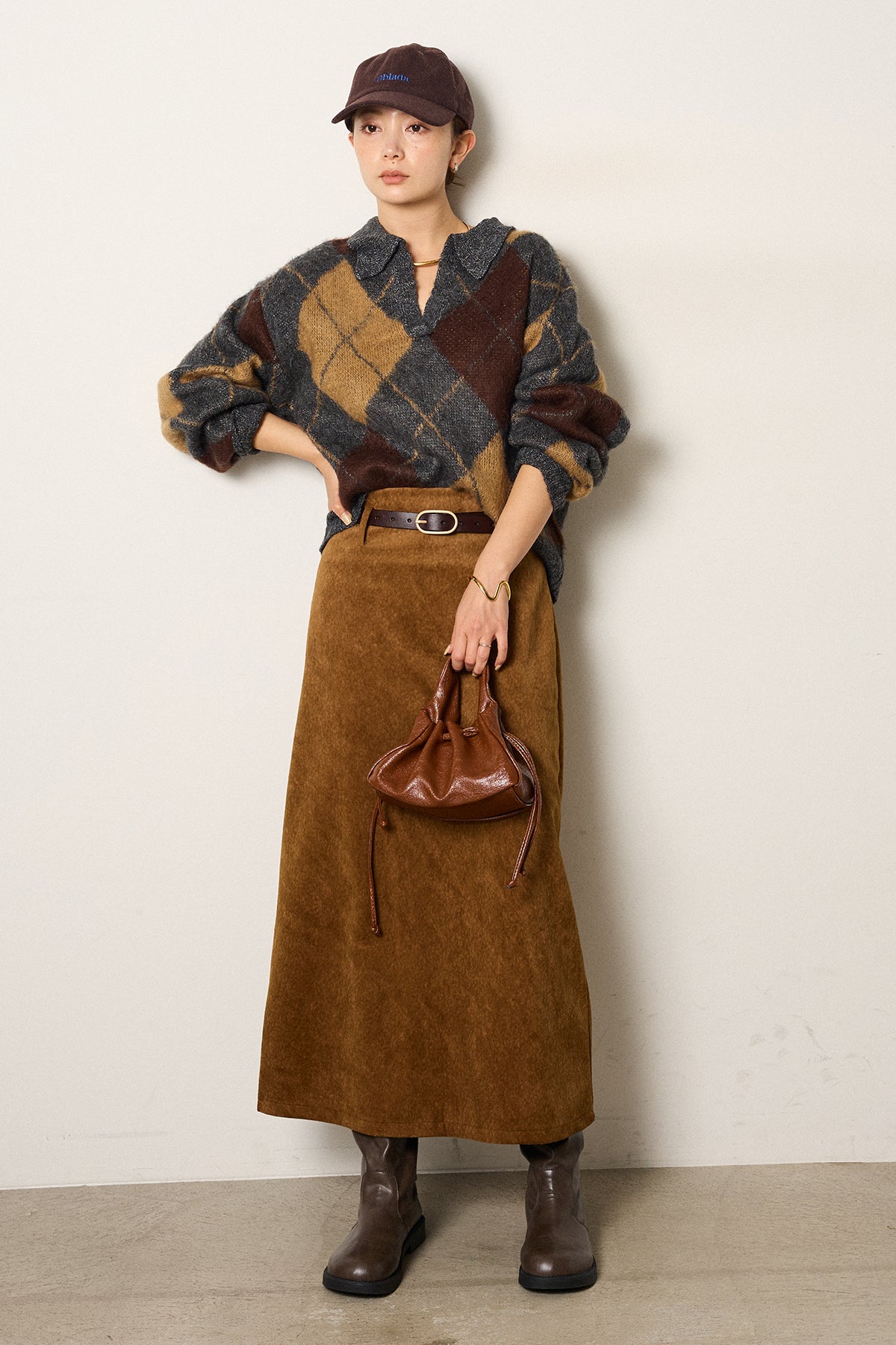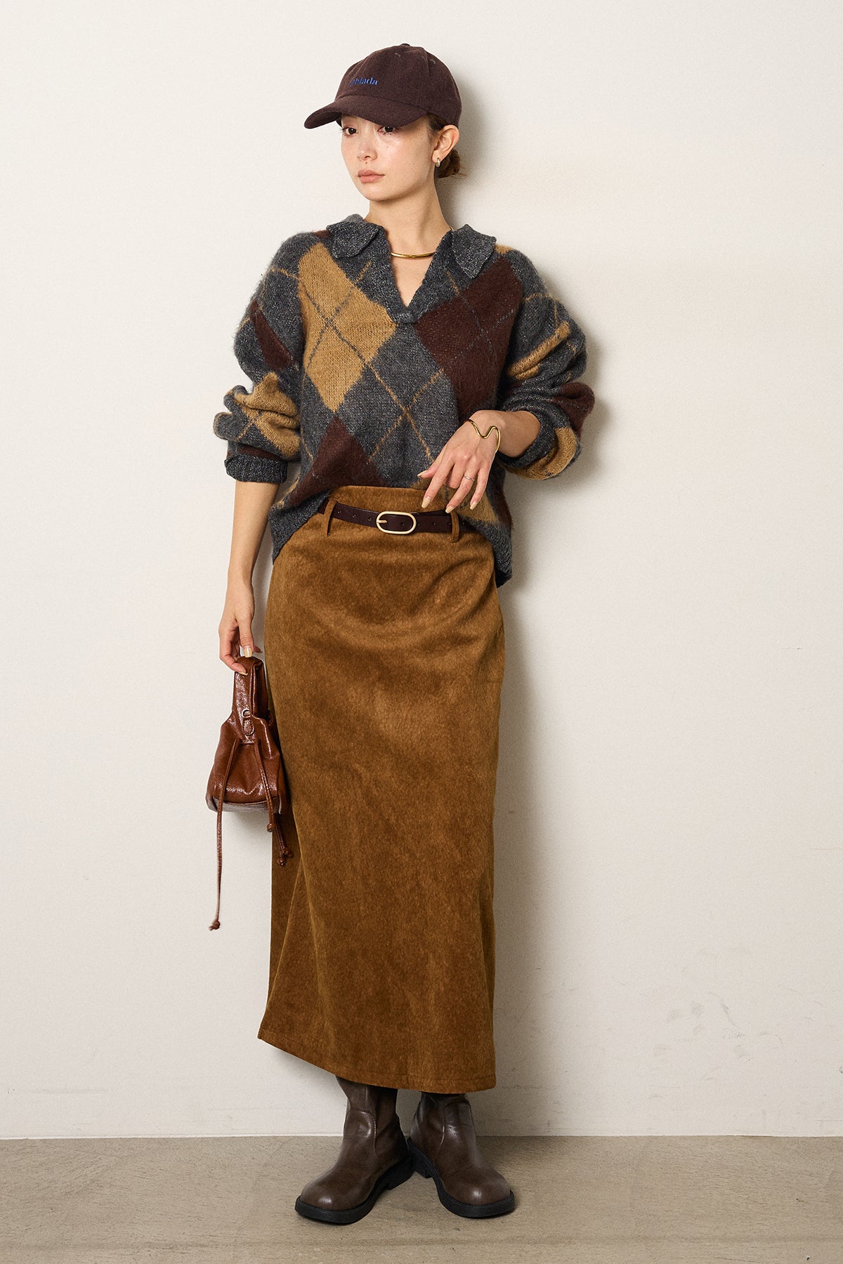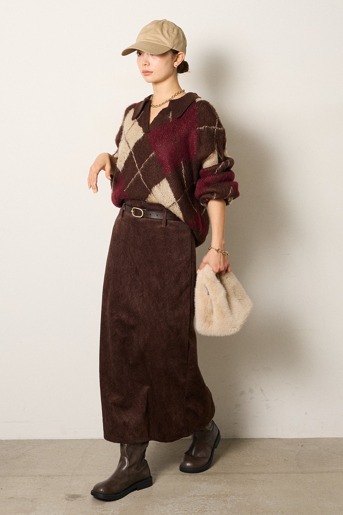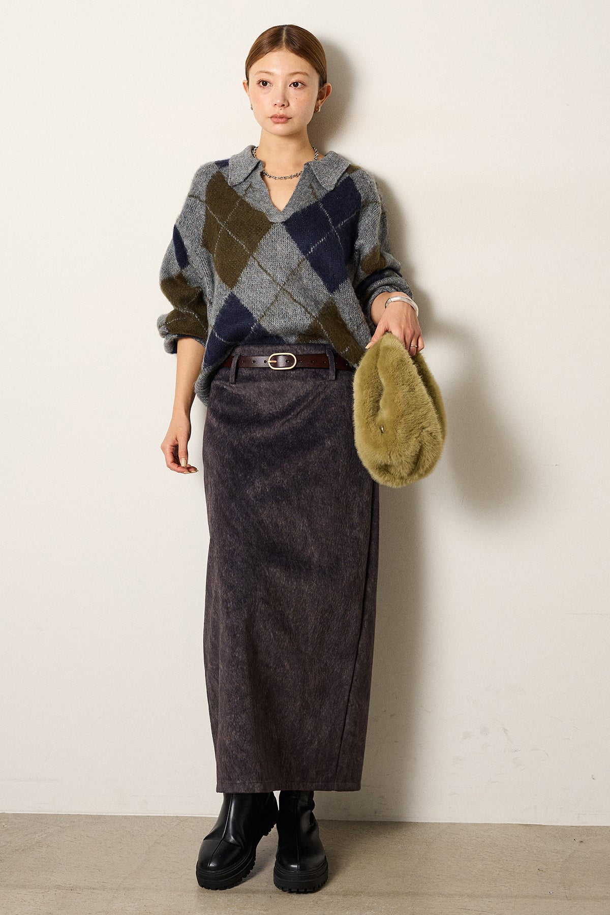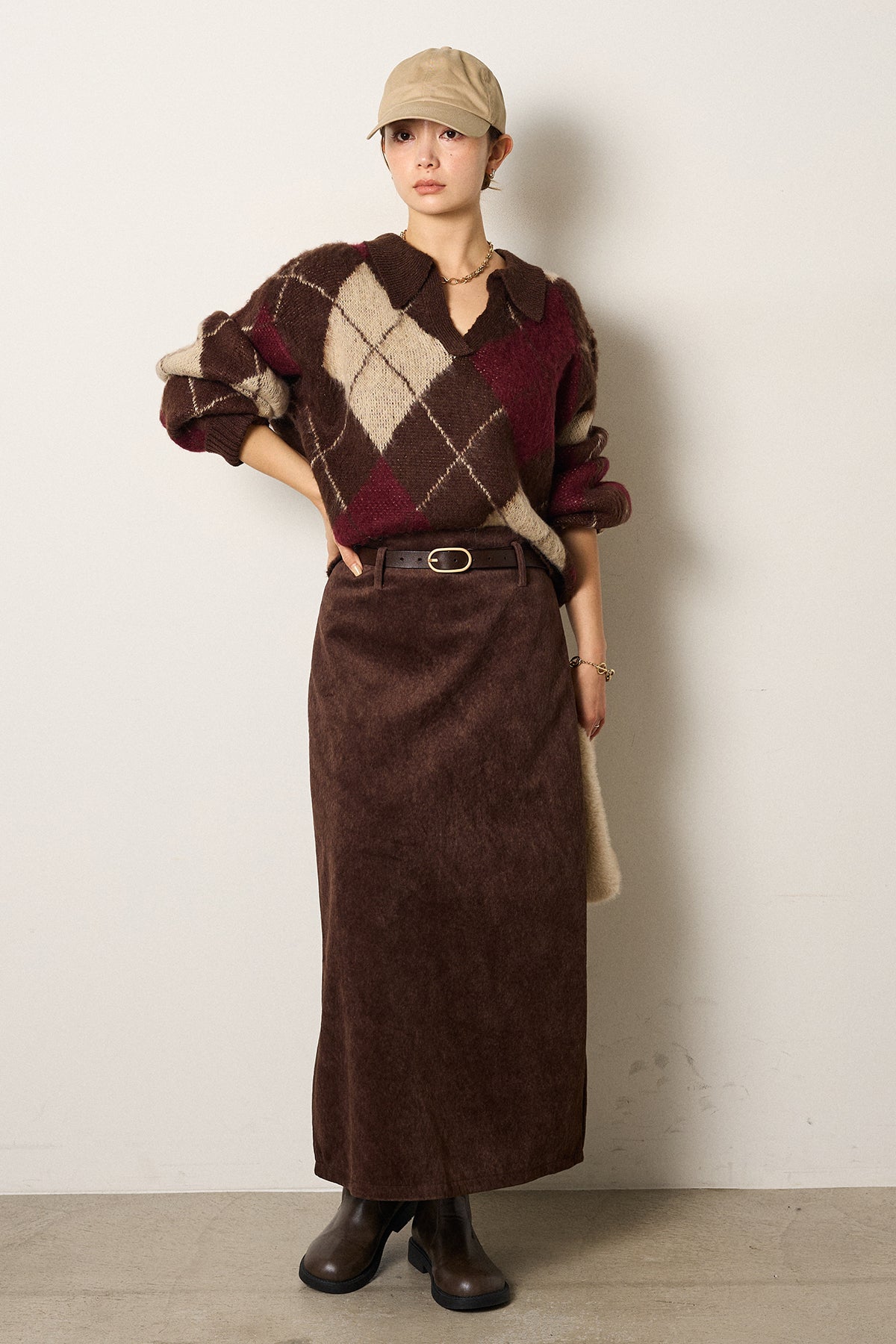 [SET]アクリルモヘアアーガイルキーネックプルオーバー+ロープベルト付きスウェード調スカート(2set)