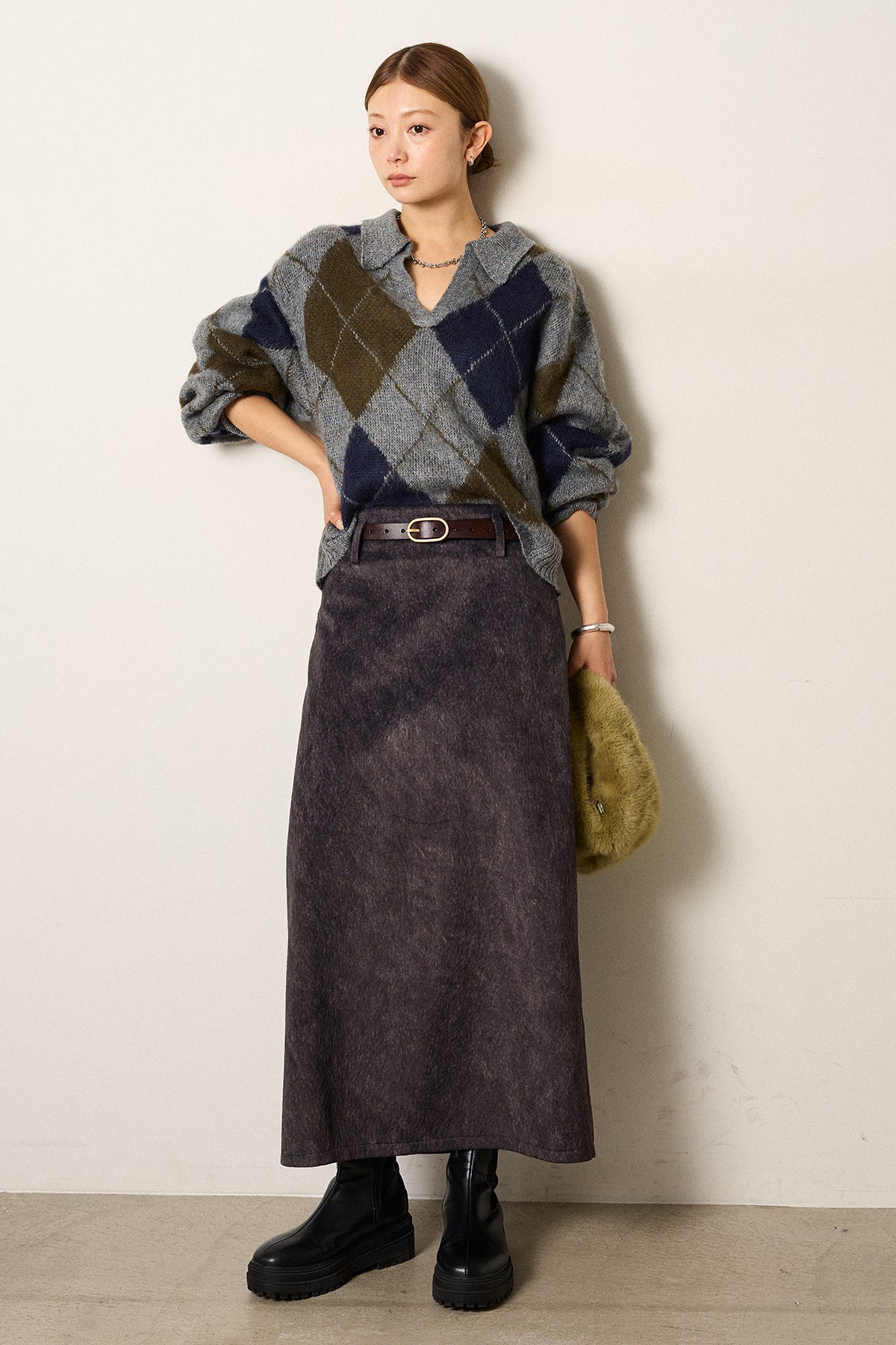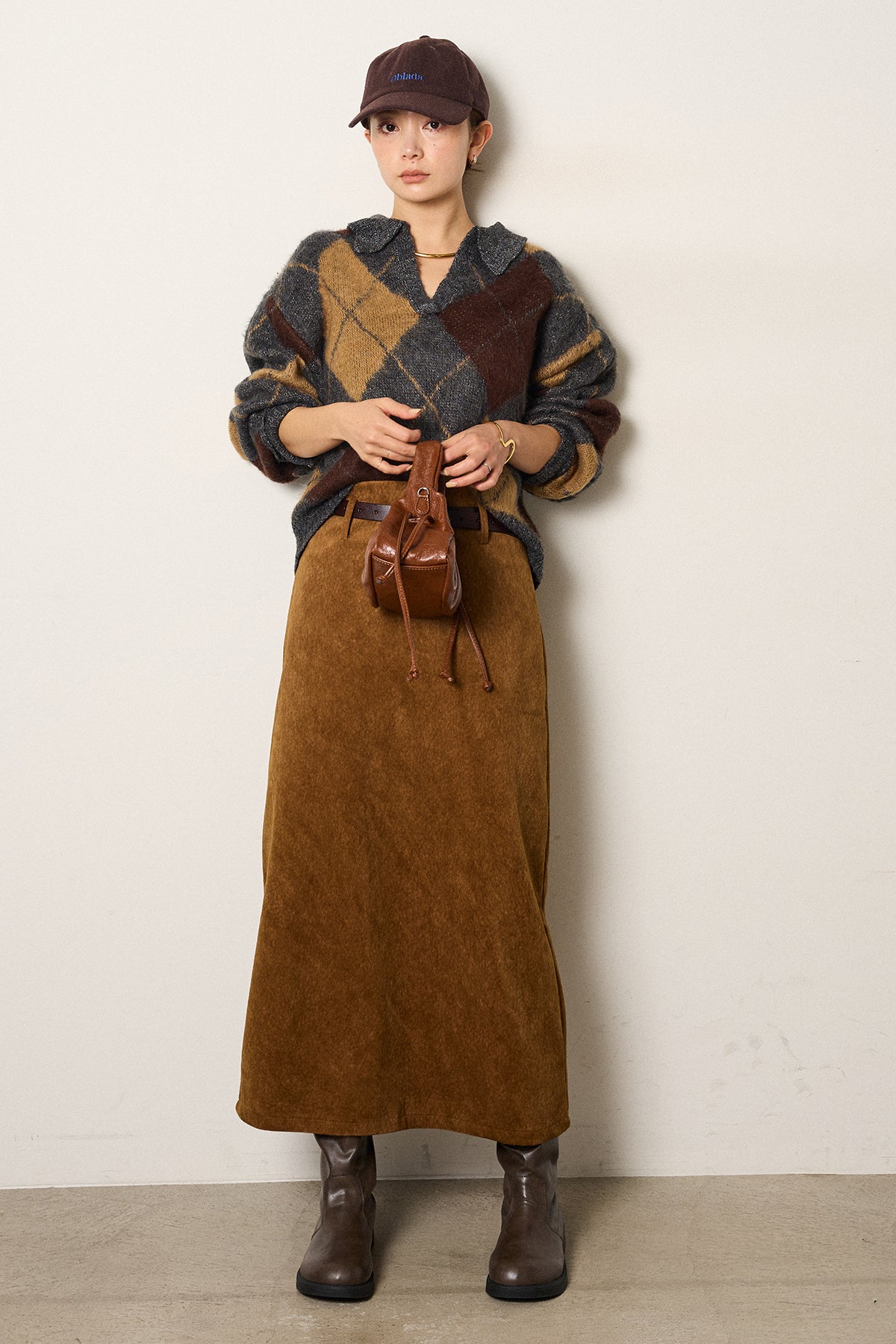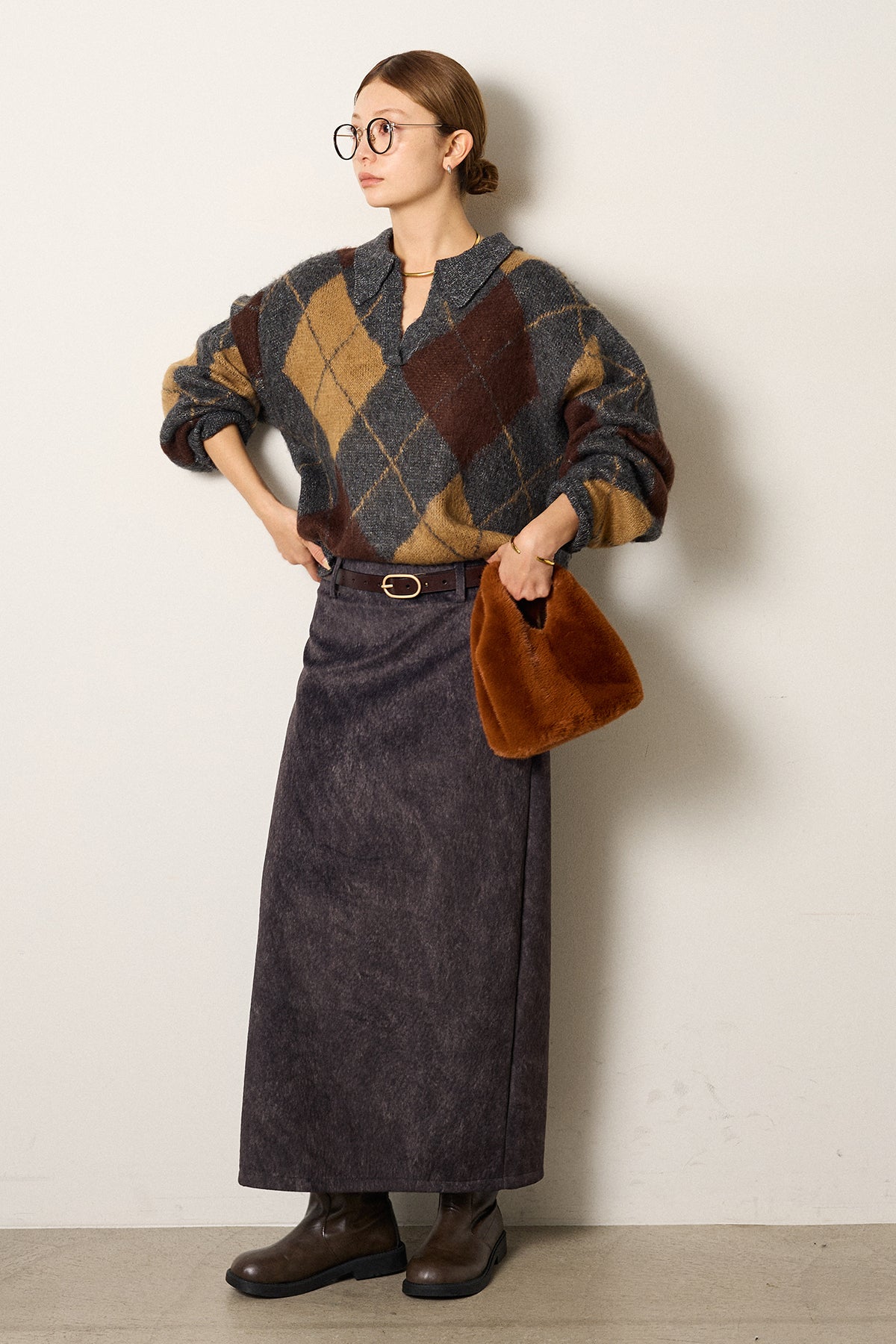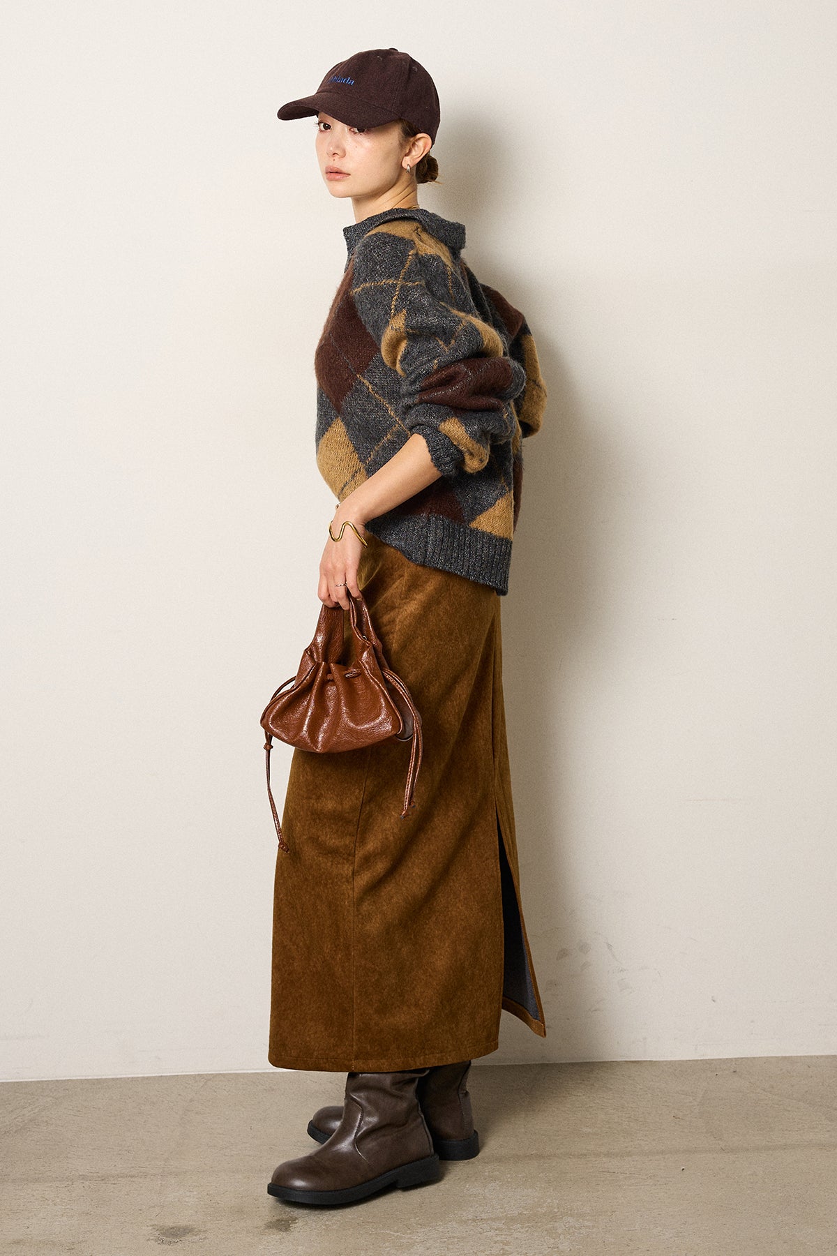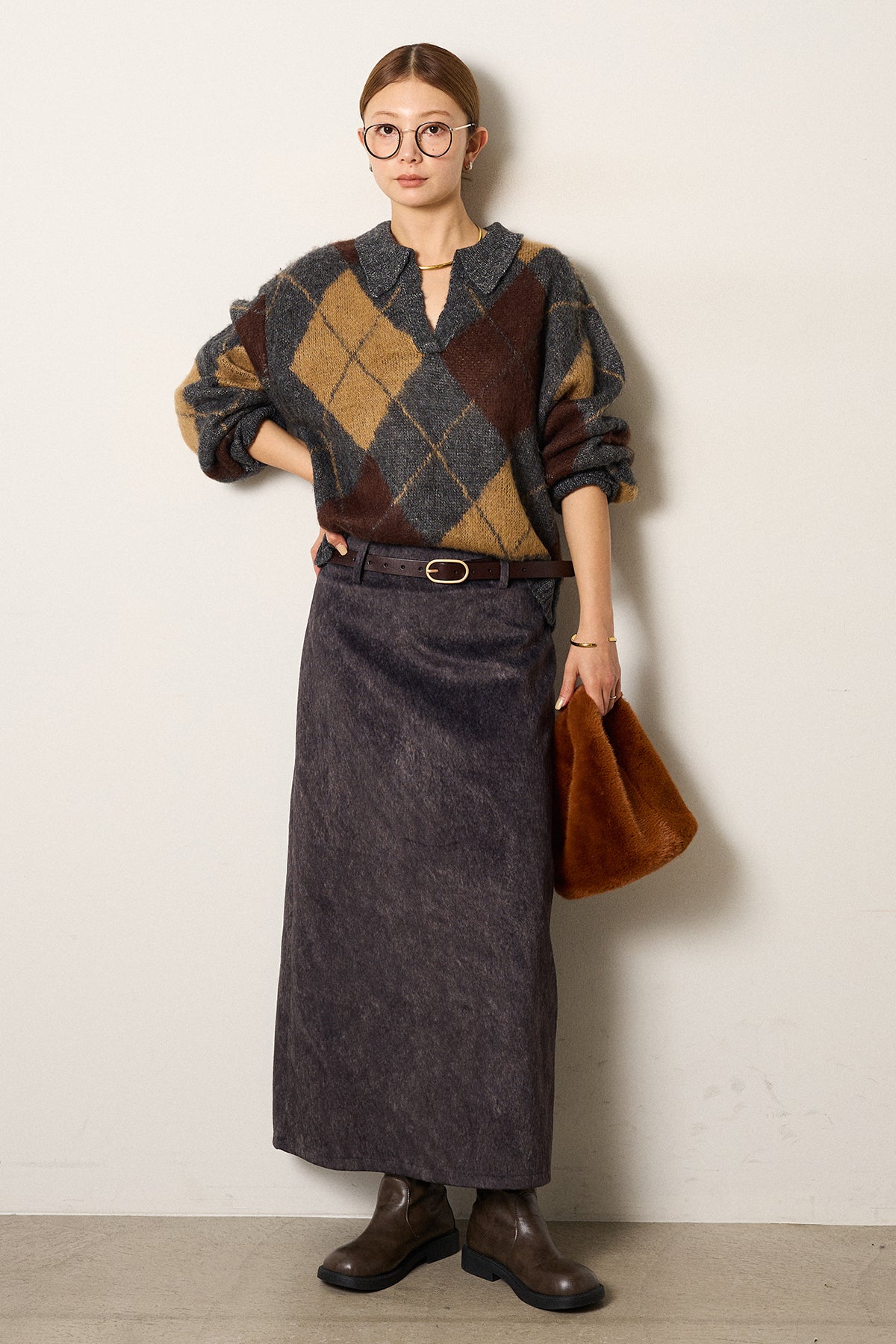 [SET]アクリルモヘアアーガイルキーネックプルオーバー+ロープベルト付きスウェード調スカート(2set)