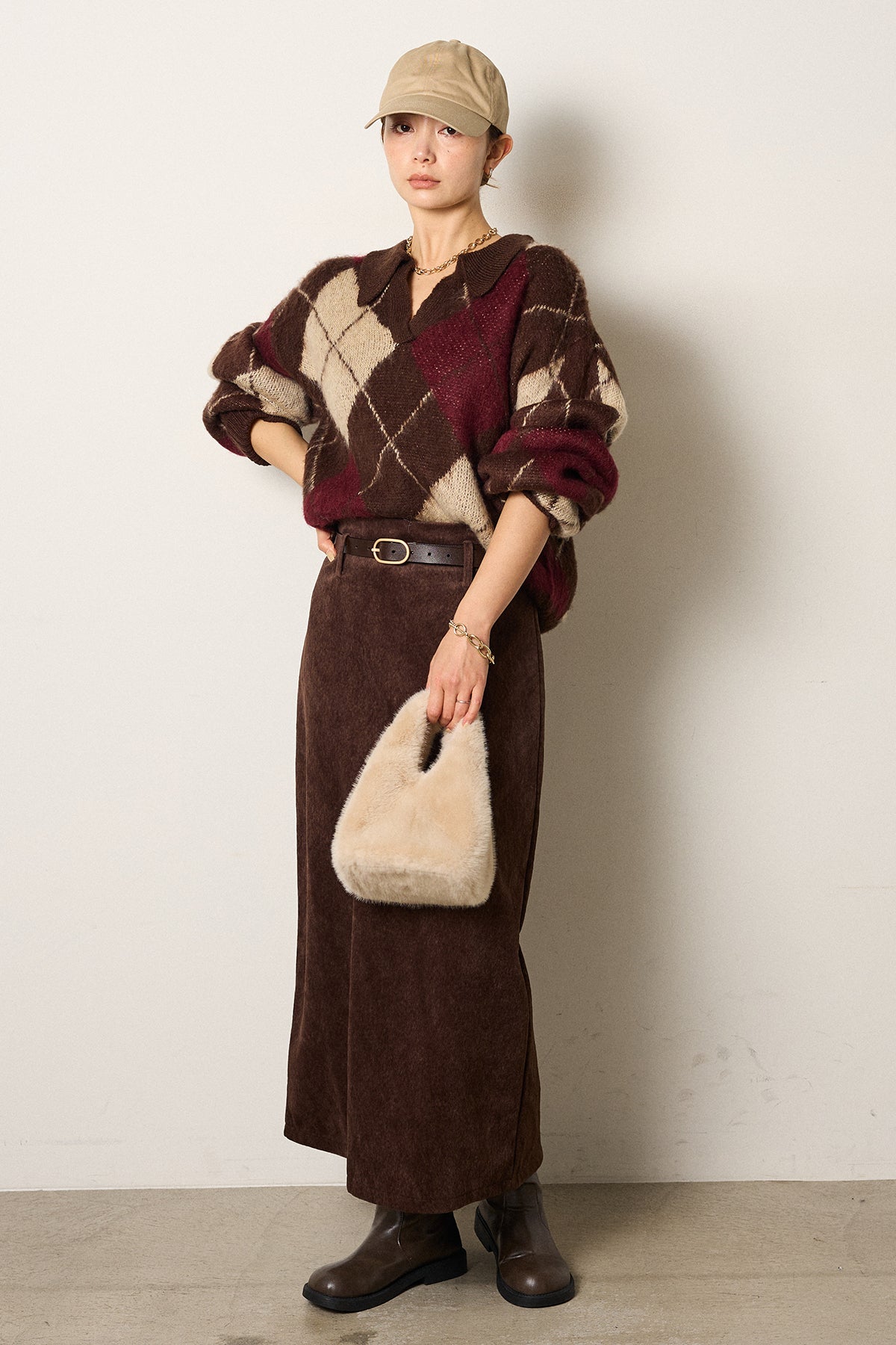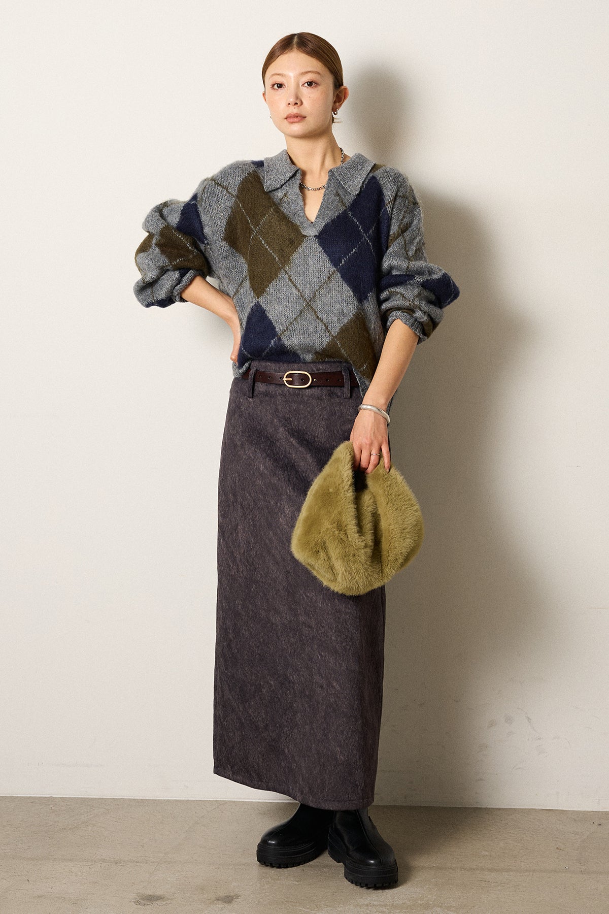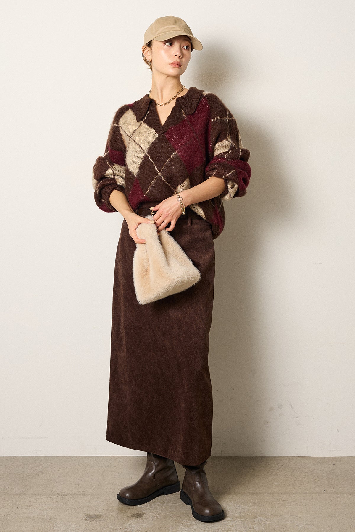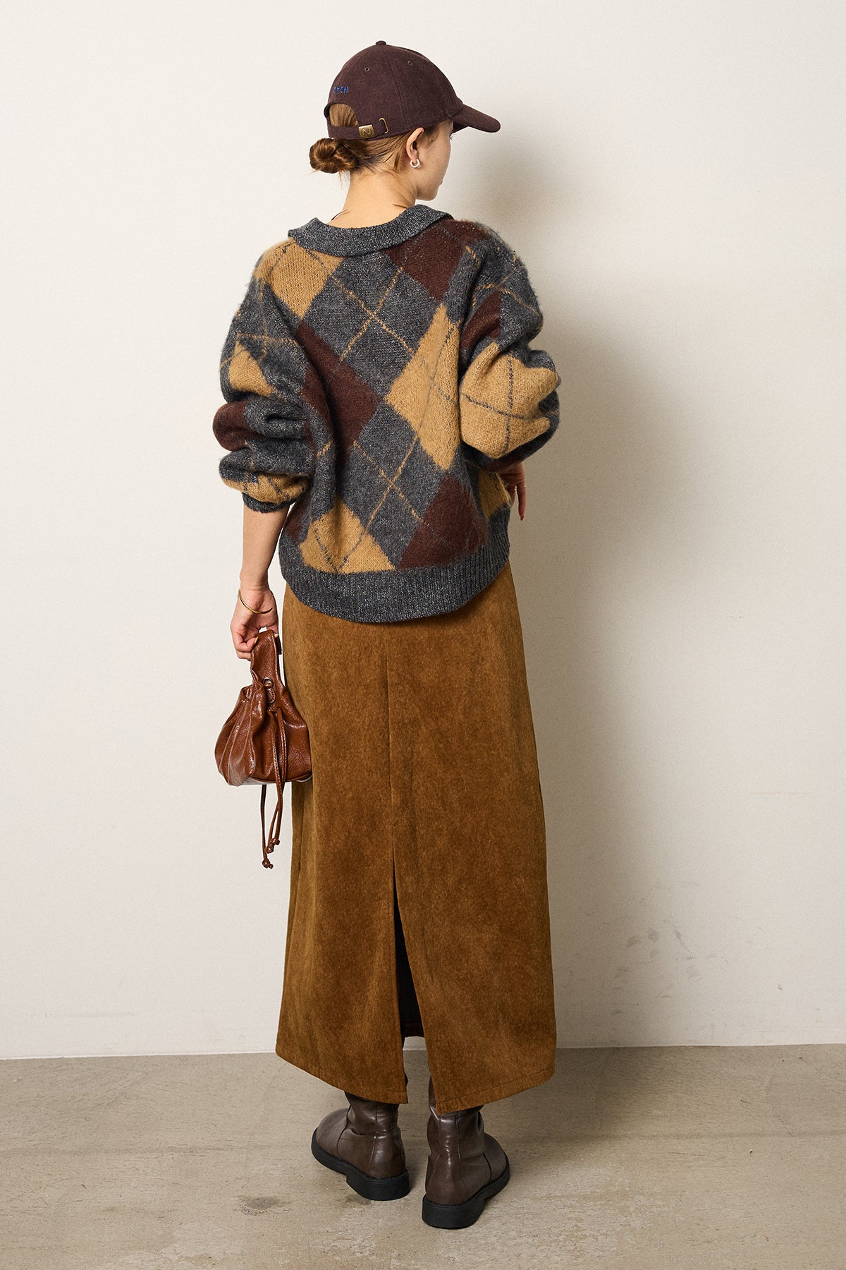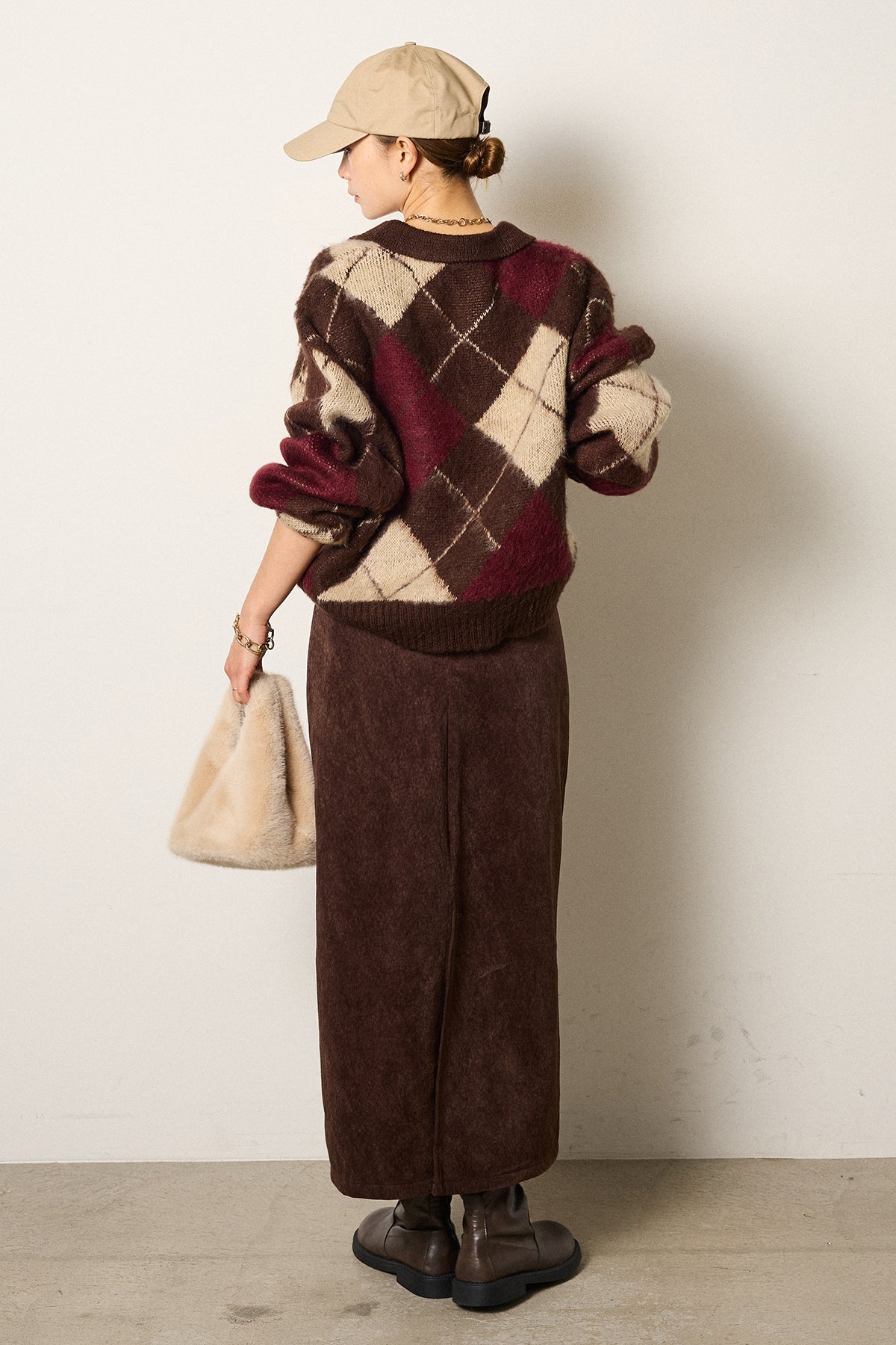 [SET]アクリルモヘアアーガイルキーネックプルオーバー+ロープベルト付きスウェード調スカート(2set)