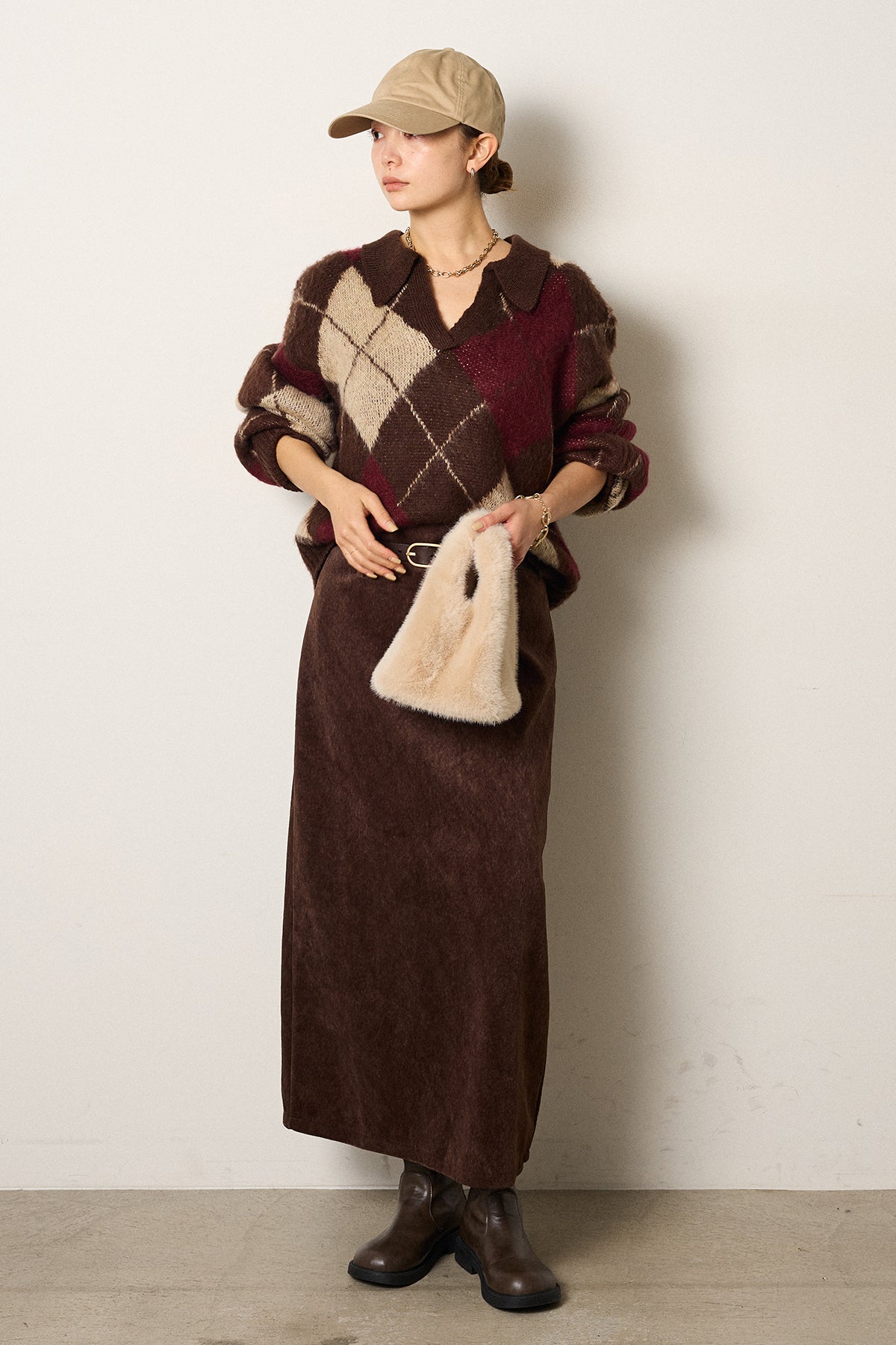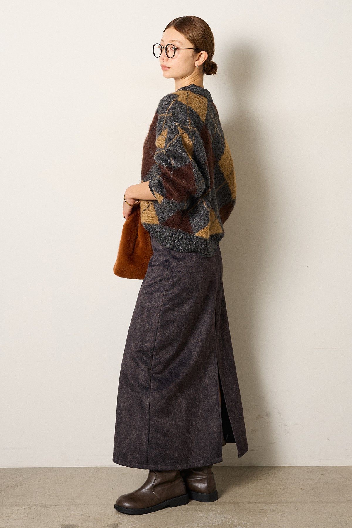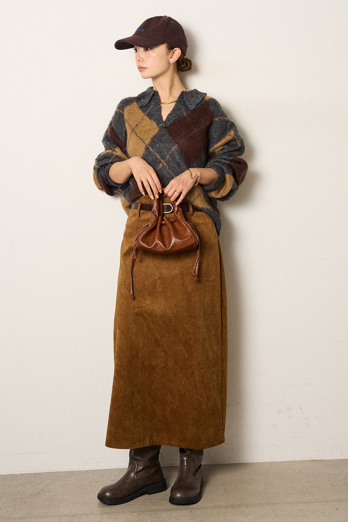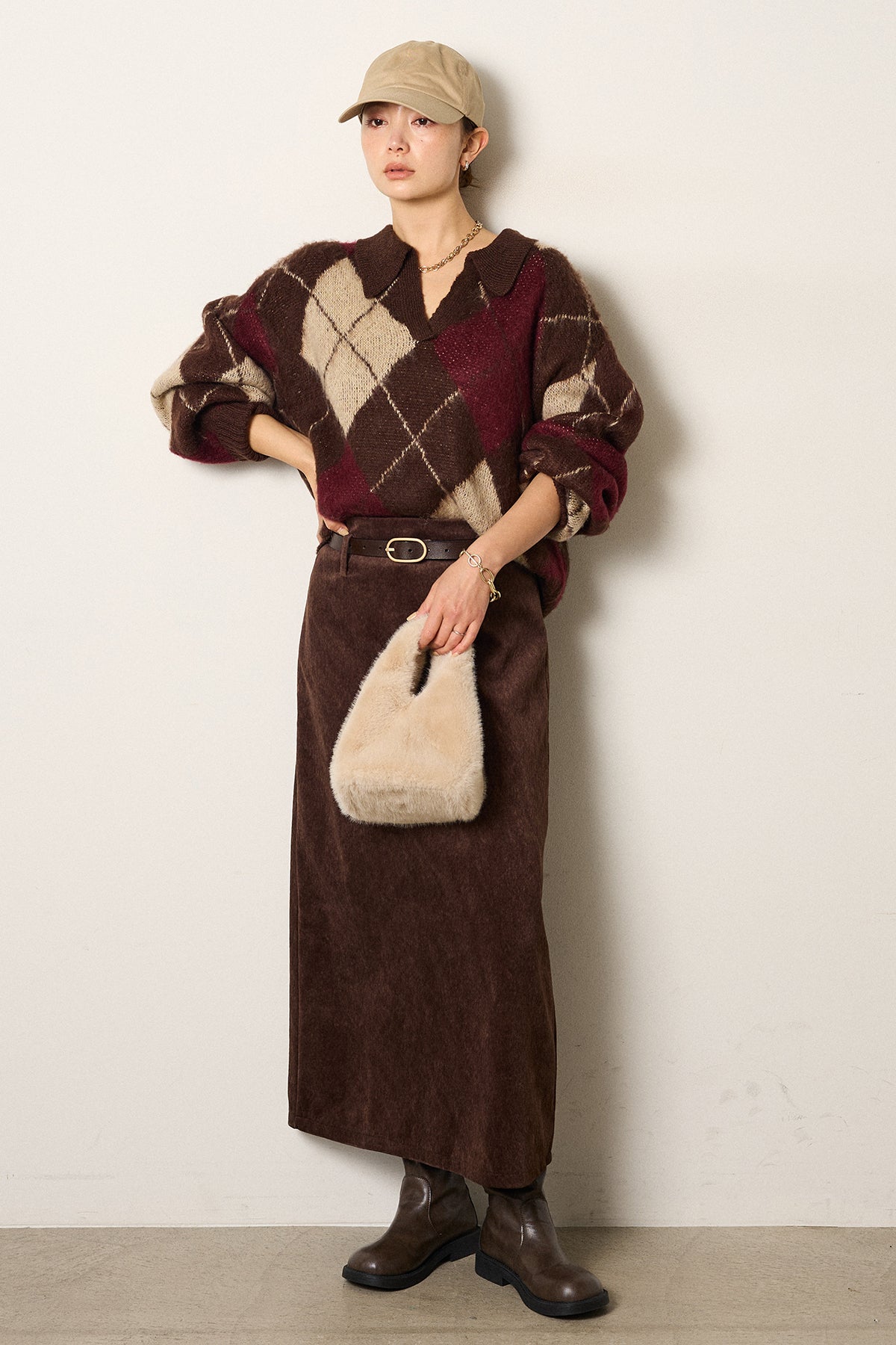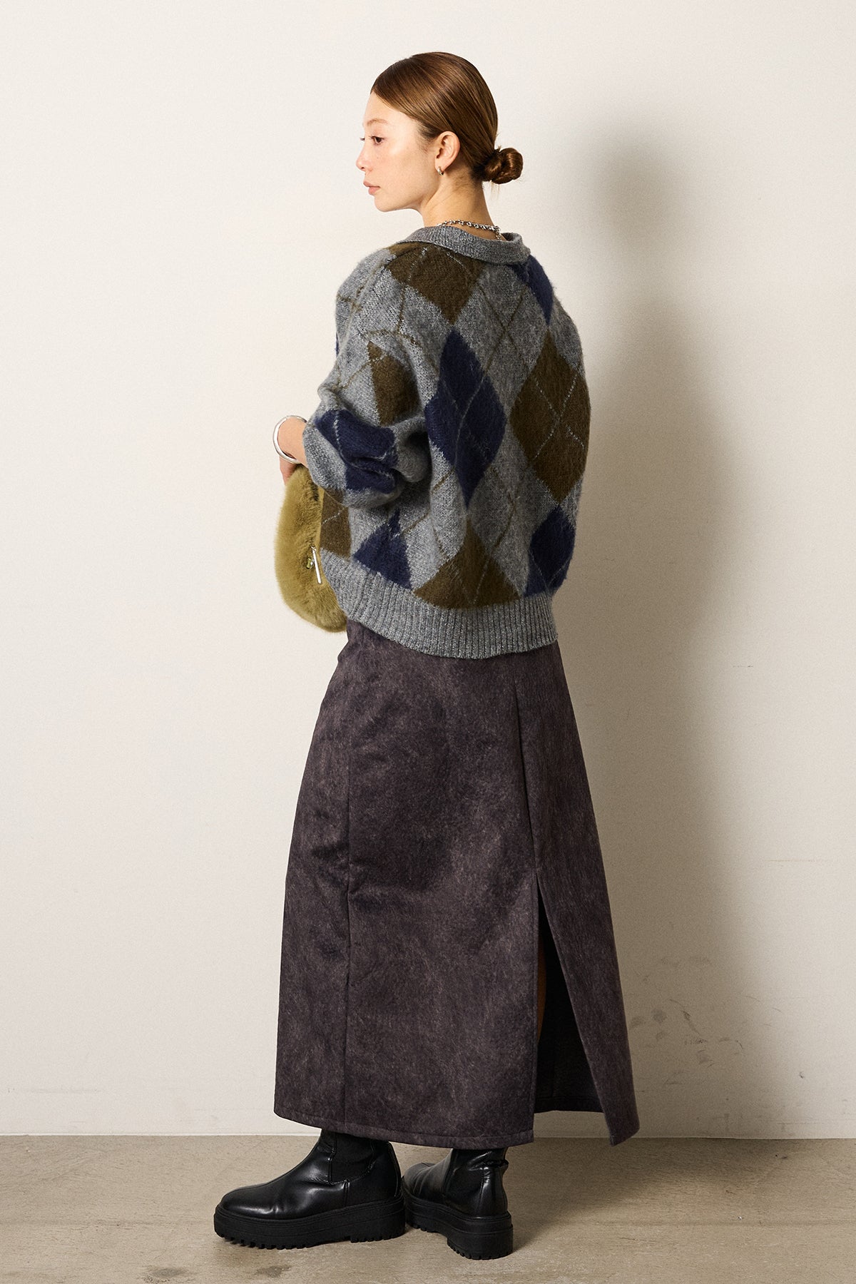 [SET]アクリルモヘアアーガイルキーネックプルオーバー+ロープベルト付きスウェード調スカート(2set)