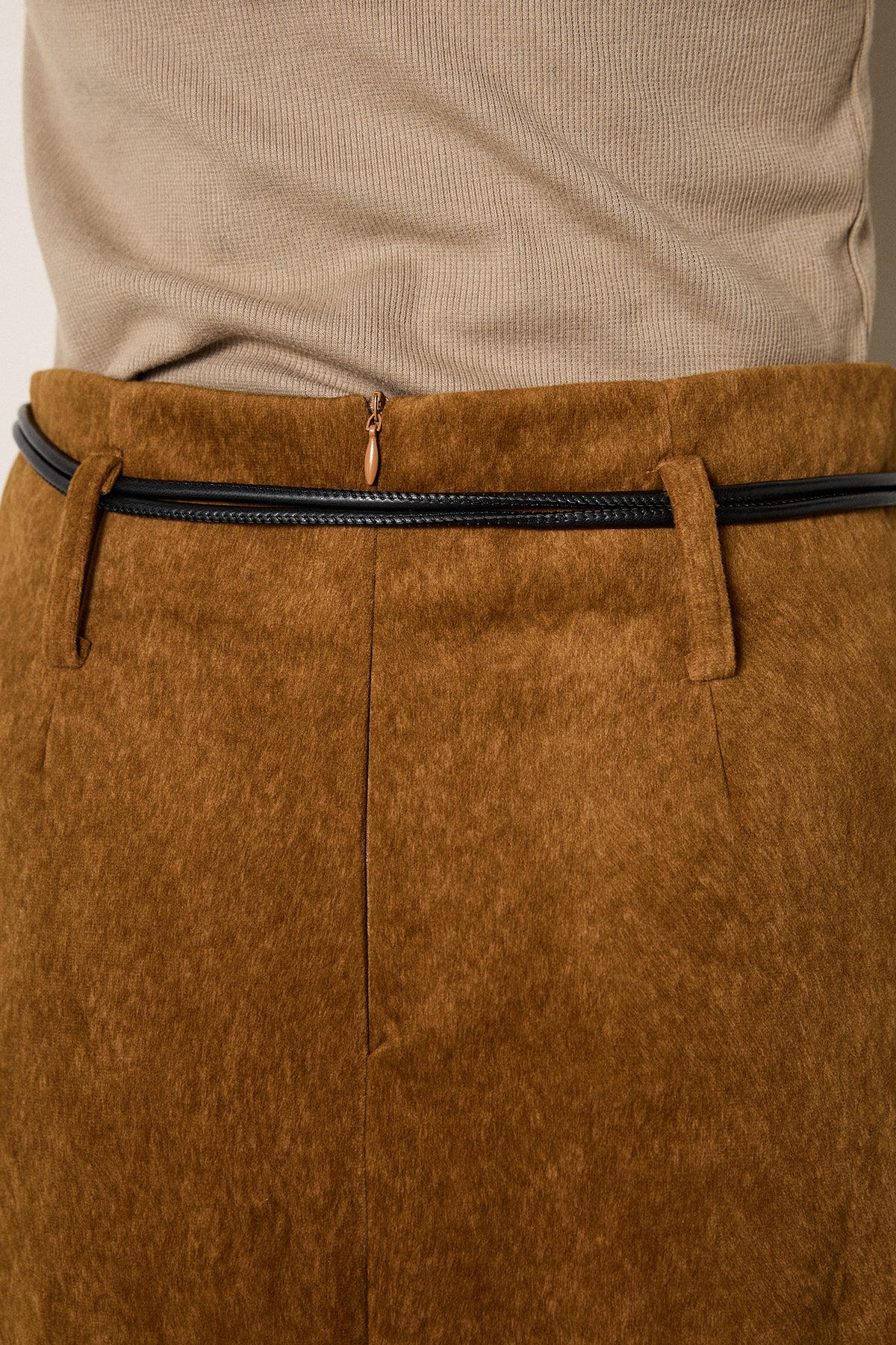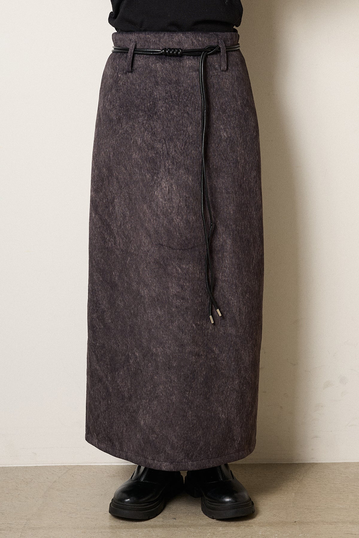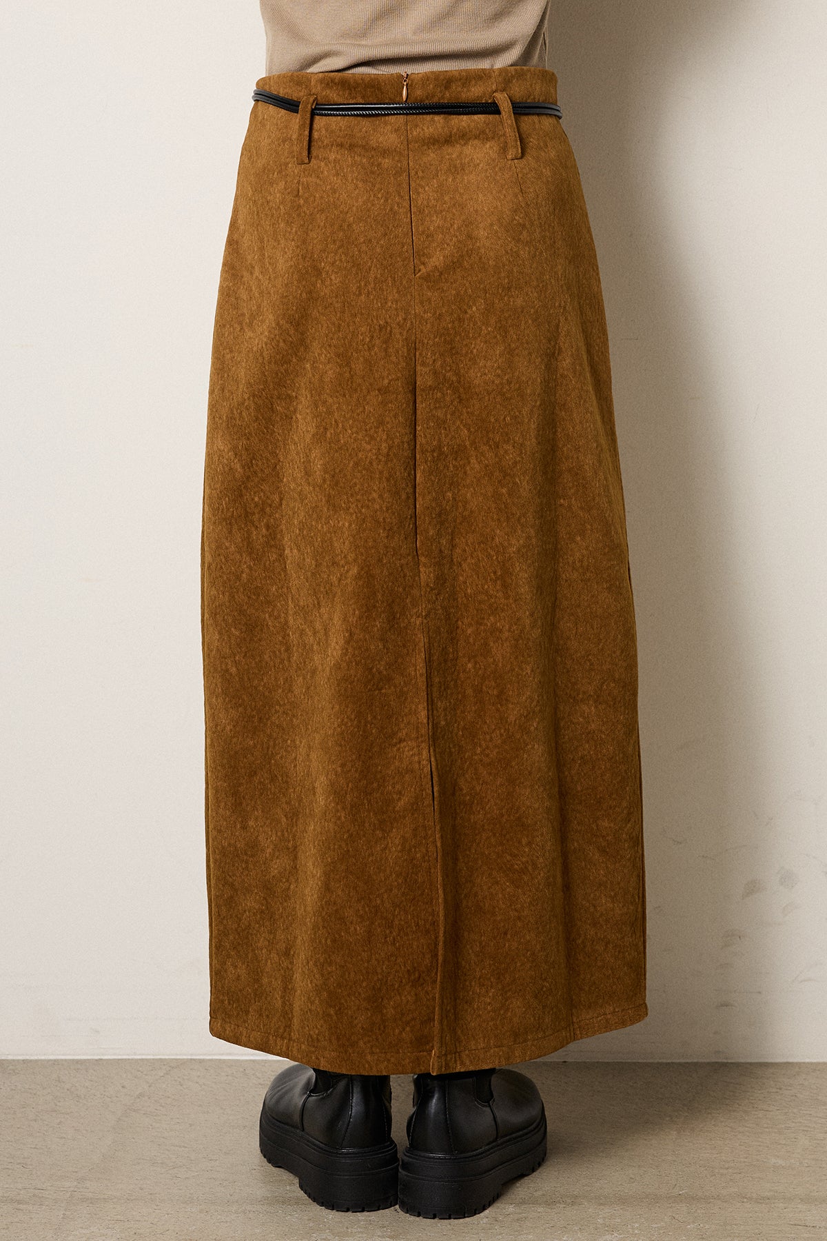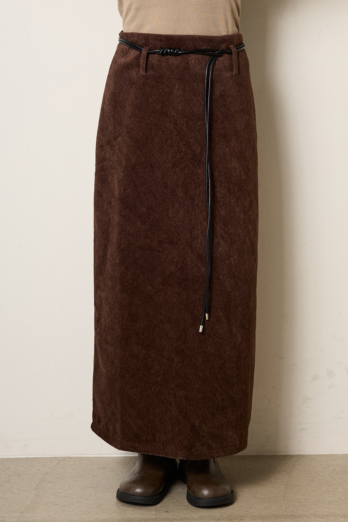 起毛感のあるスウェード調素材で、シーズンムード漂うロングスカート。 すっきりとしたストレートシルエットが美しく、付属のロープベルトがさりげないアクセントに。 柔らかな質感がスタイリングに温かみを与え、トップスをインすればメリハリのあるバランスに仕上がります。 ブーツとの相性も良く、秋冬の装いに取り入れやすい一枚です。