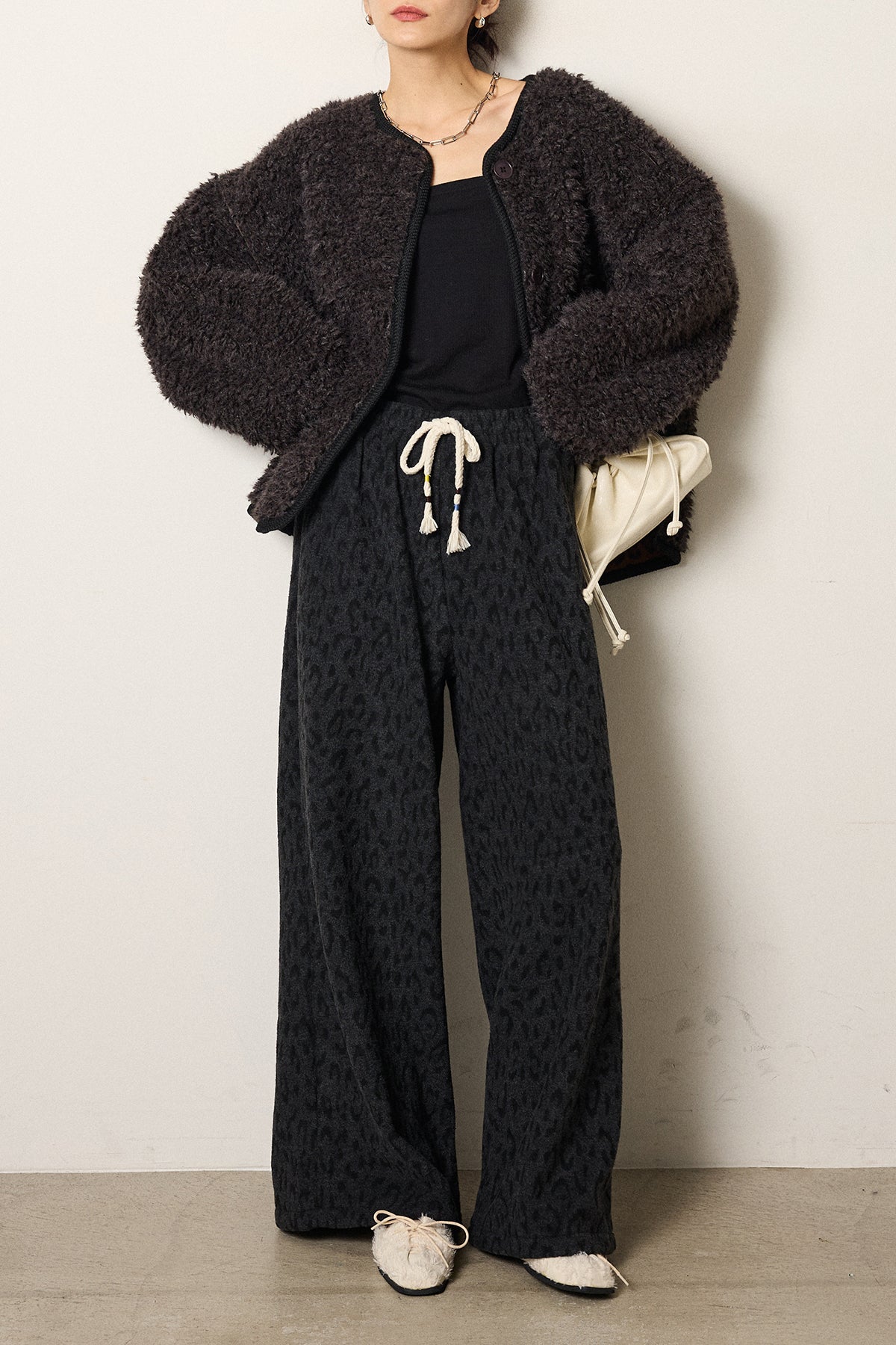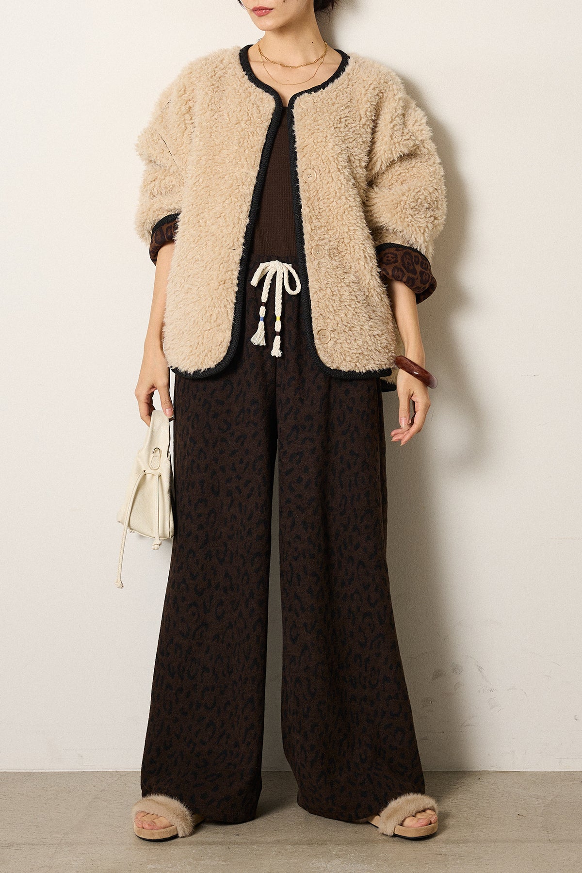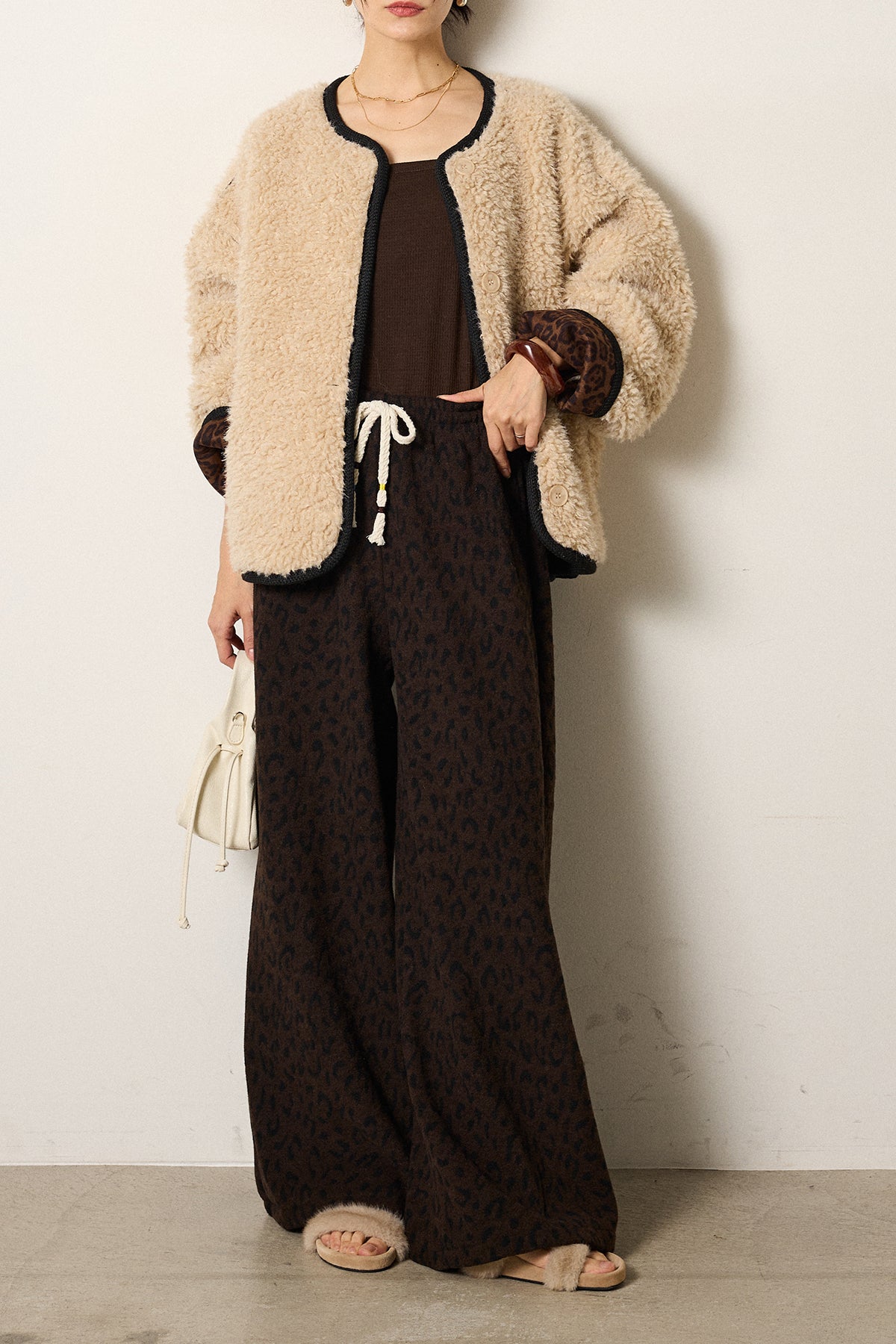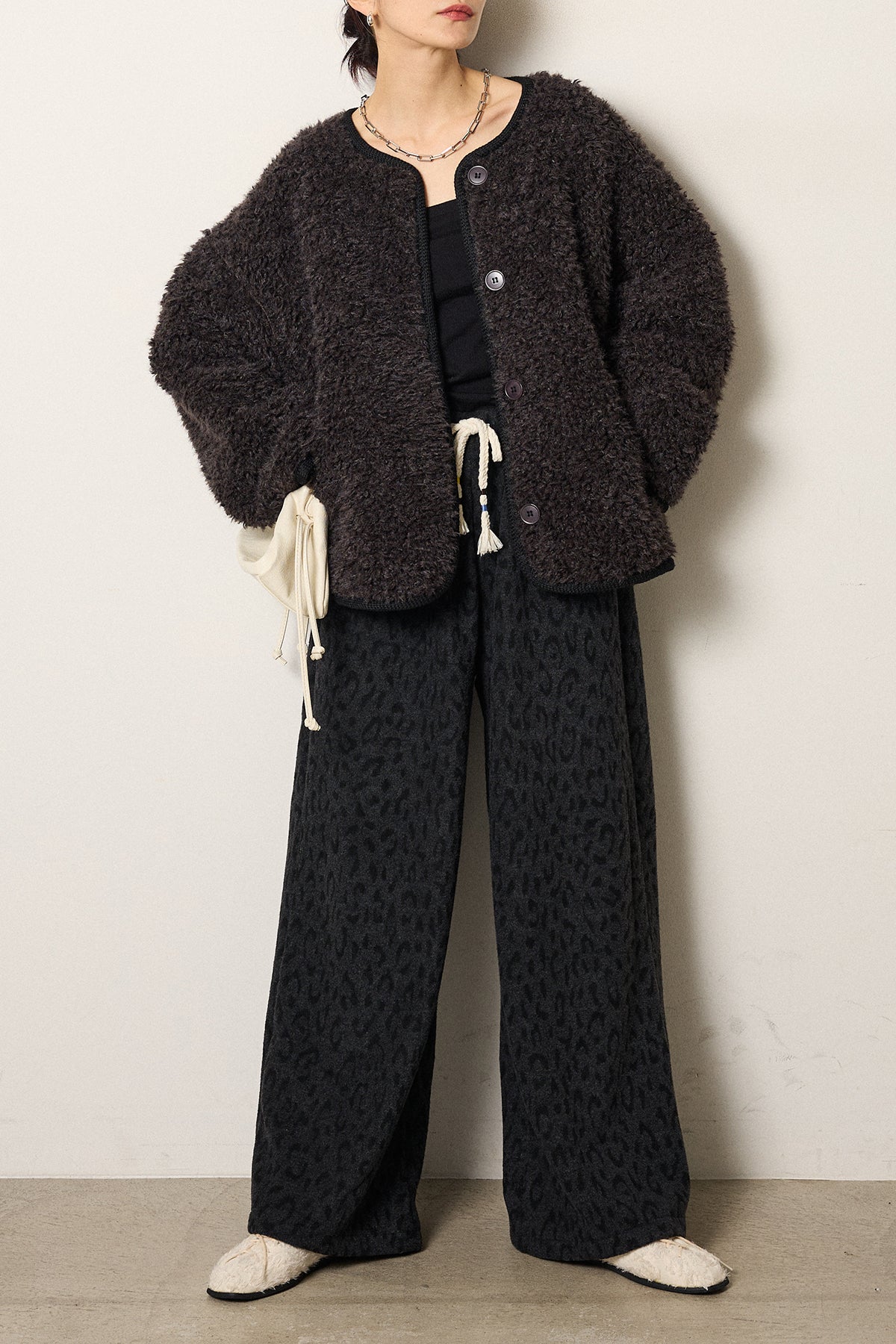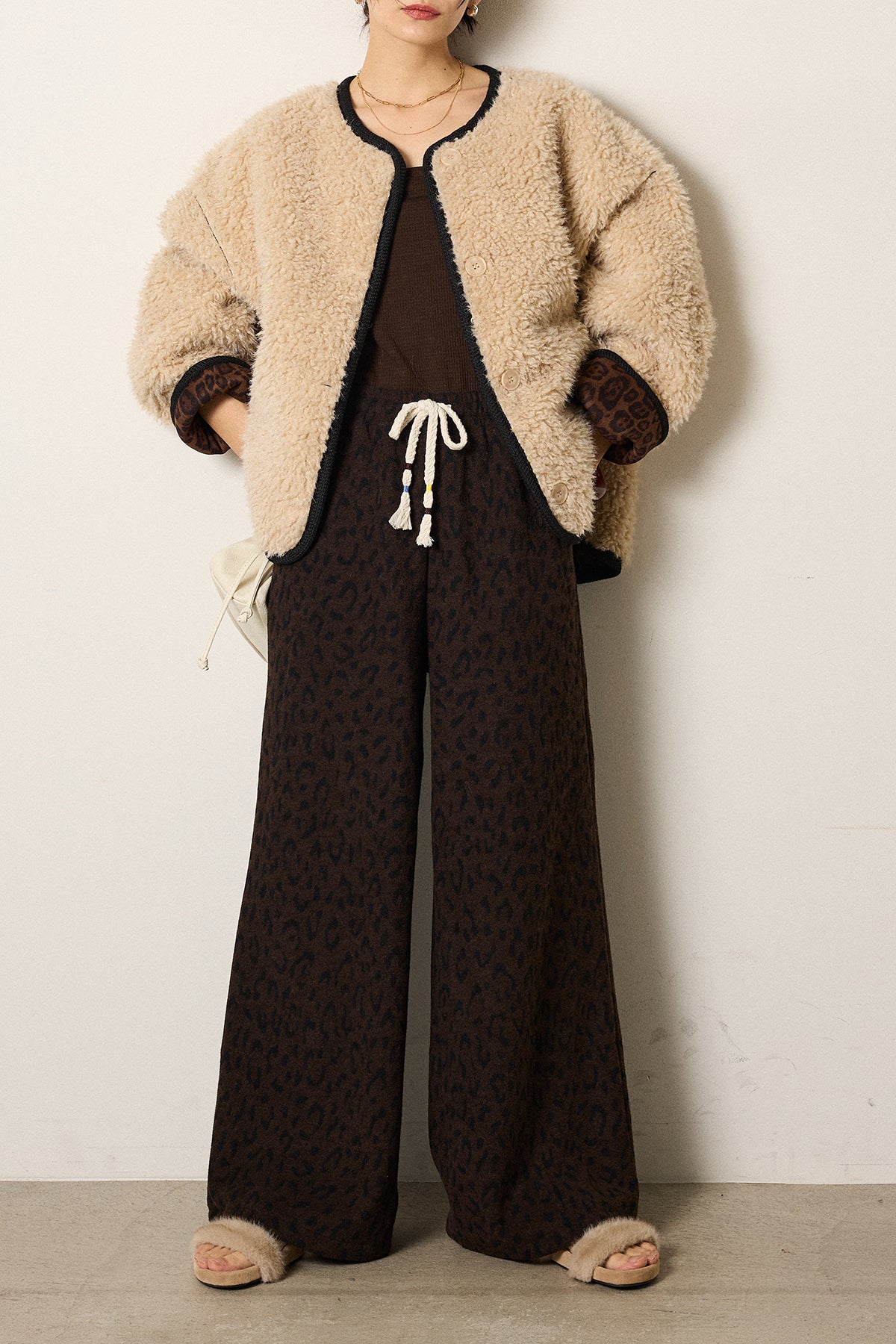 [SET]ノーカラー裏地レオパードボアアウター+レオパードジャガードニットパンツ(2set)