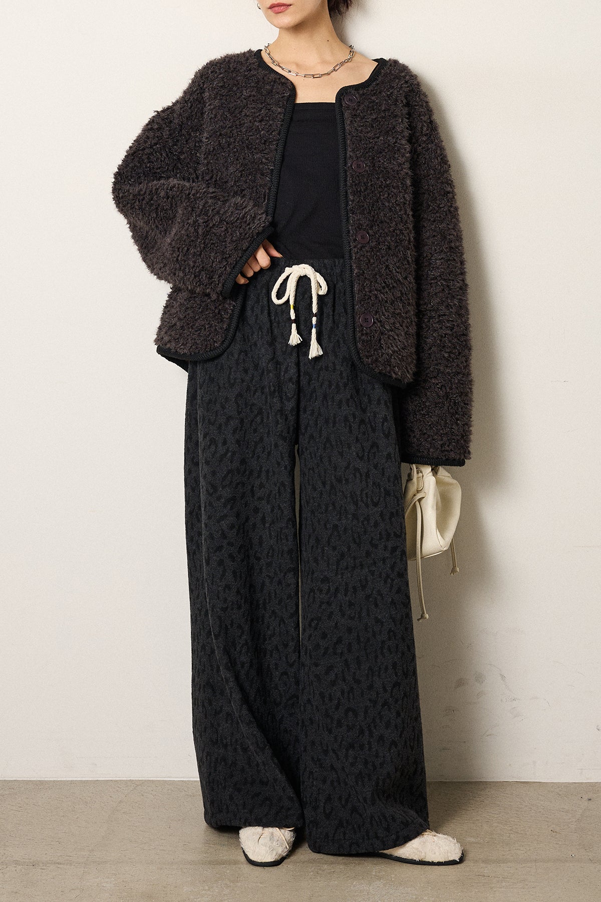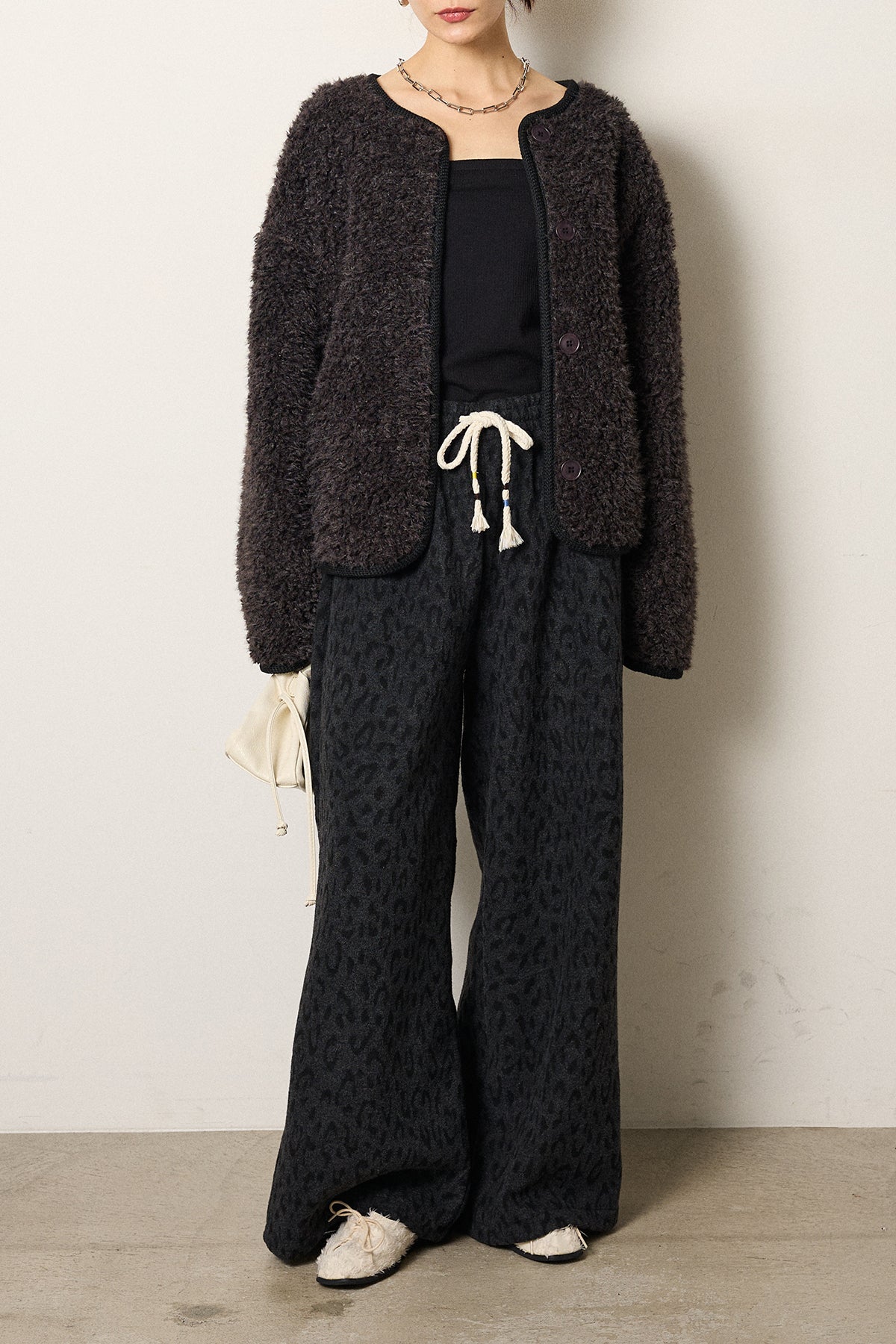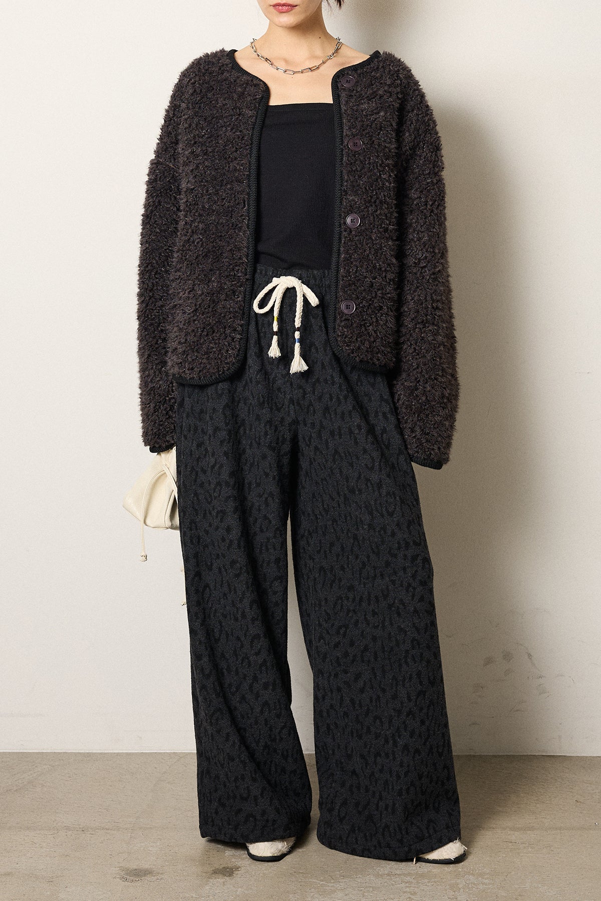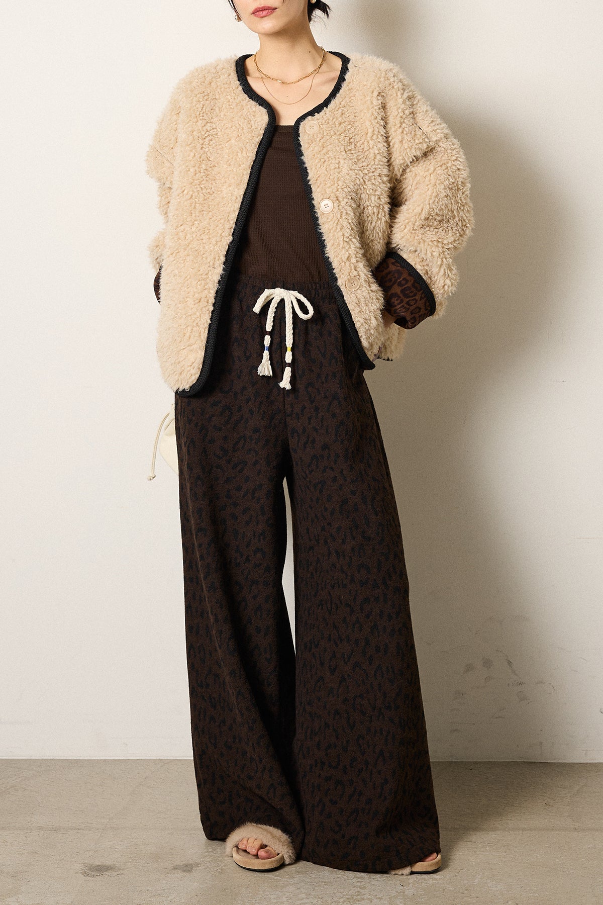 [SET]ノーカラー裏地レオパードボアアウター+レオパードジャガードニットパンツ(2set)