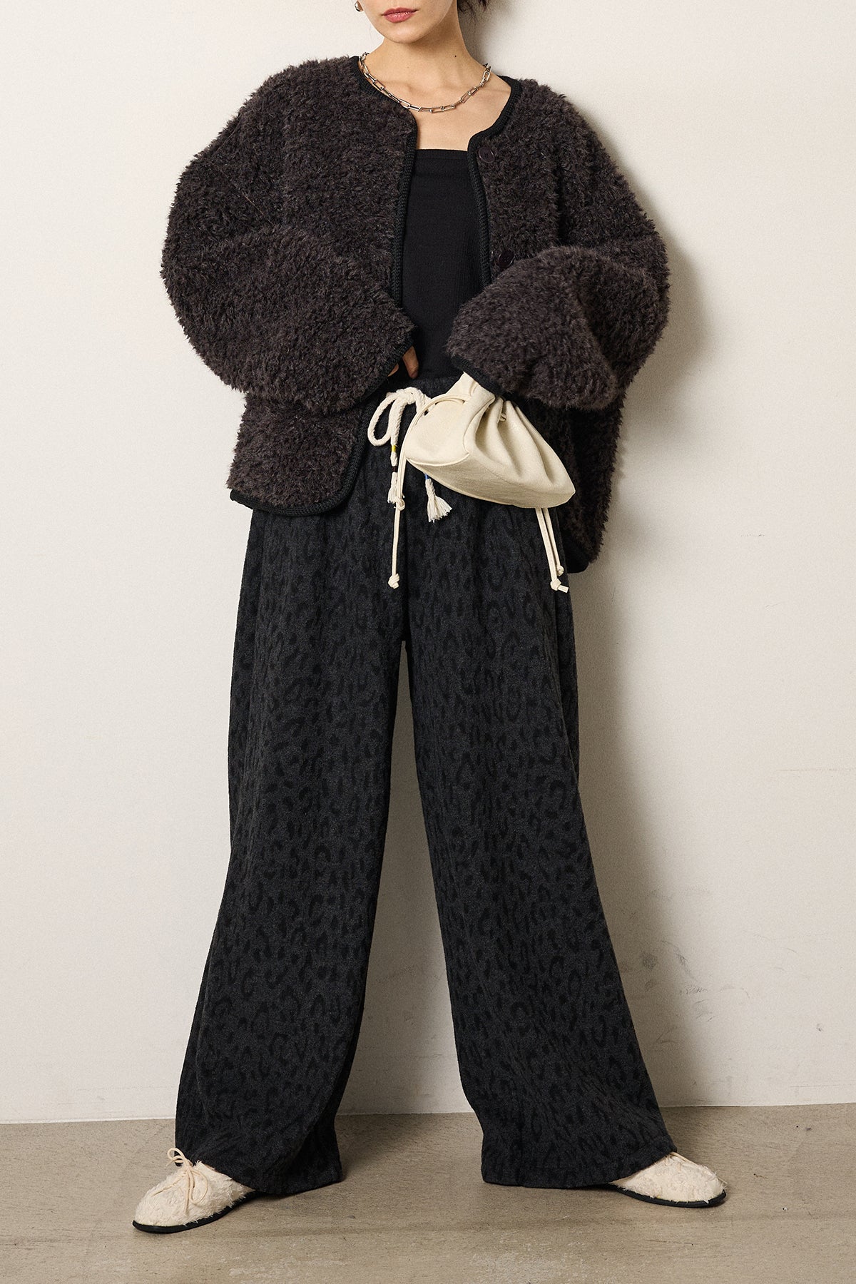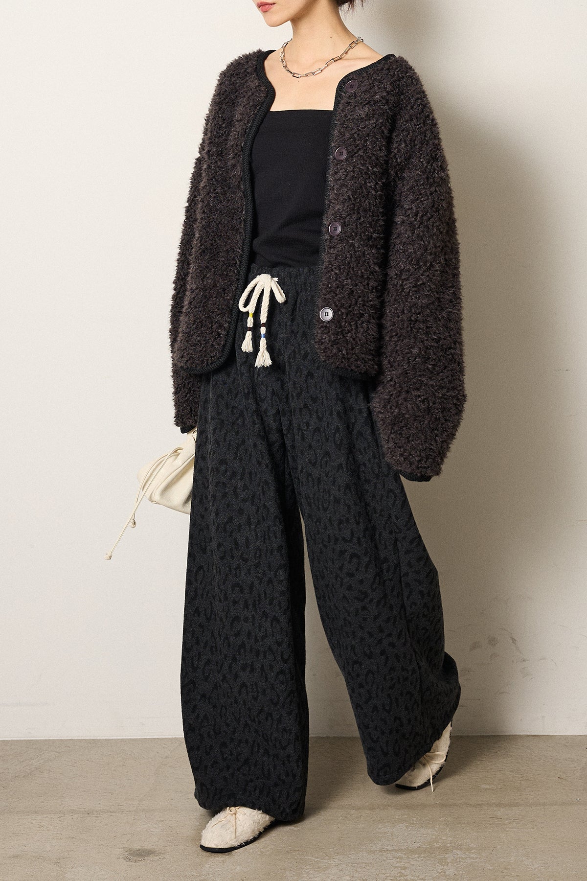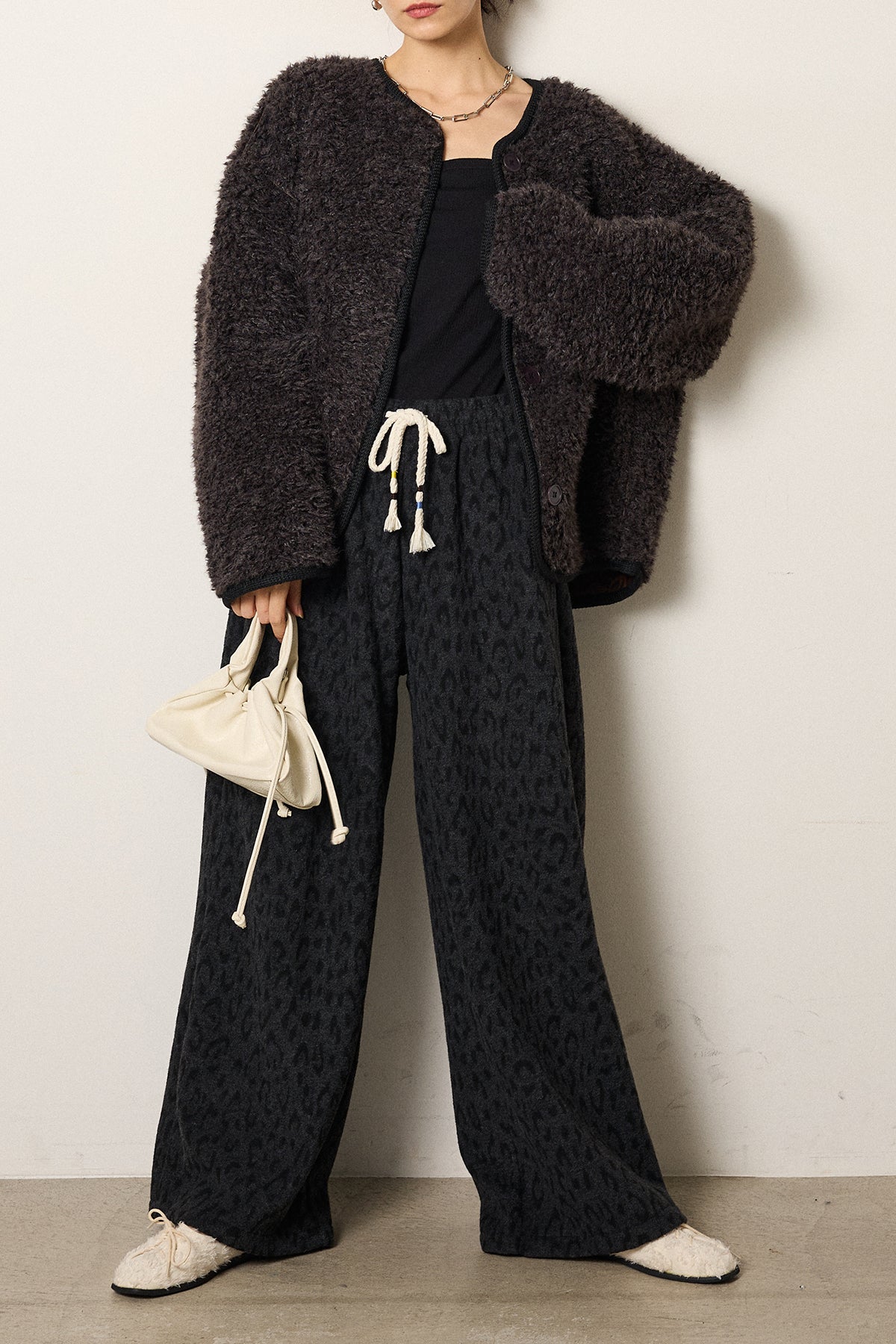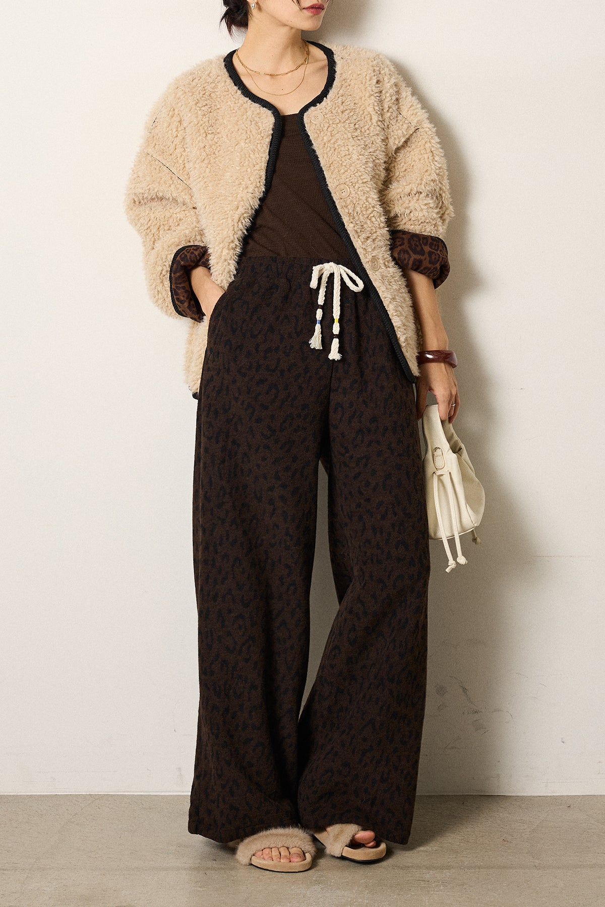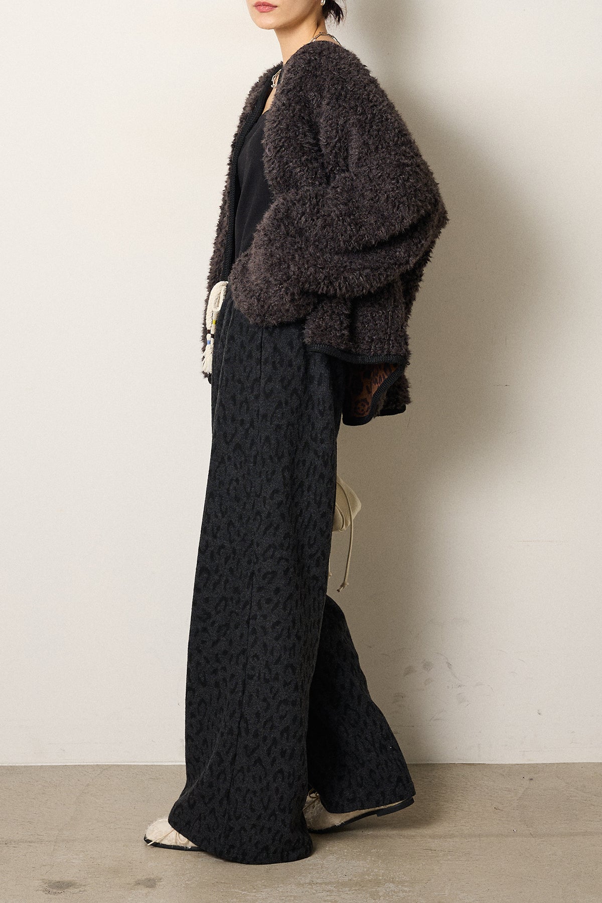 [SET]ノーカラー裏地レオパードボアアウター+レオパードジャガードニットパンツ(2set)