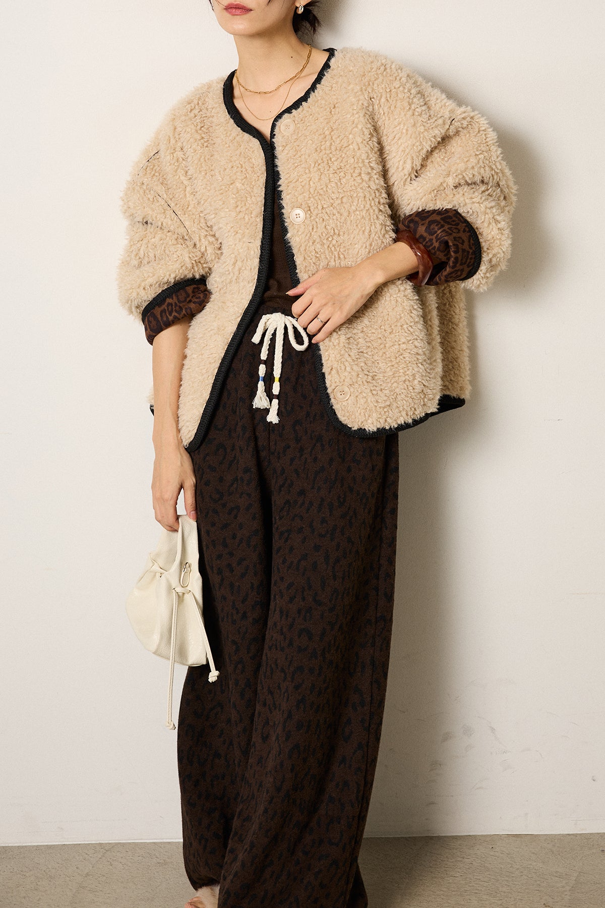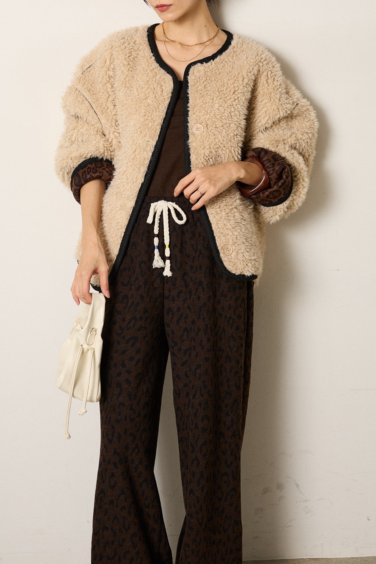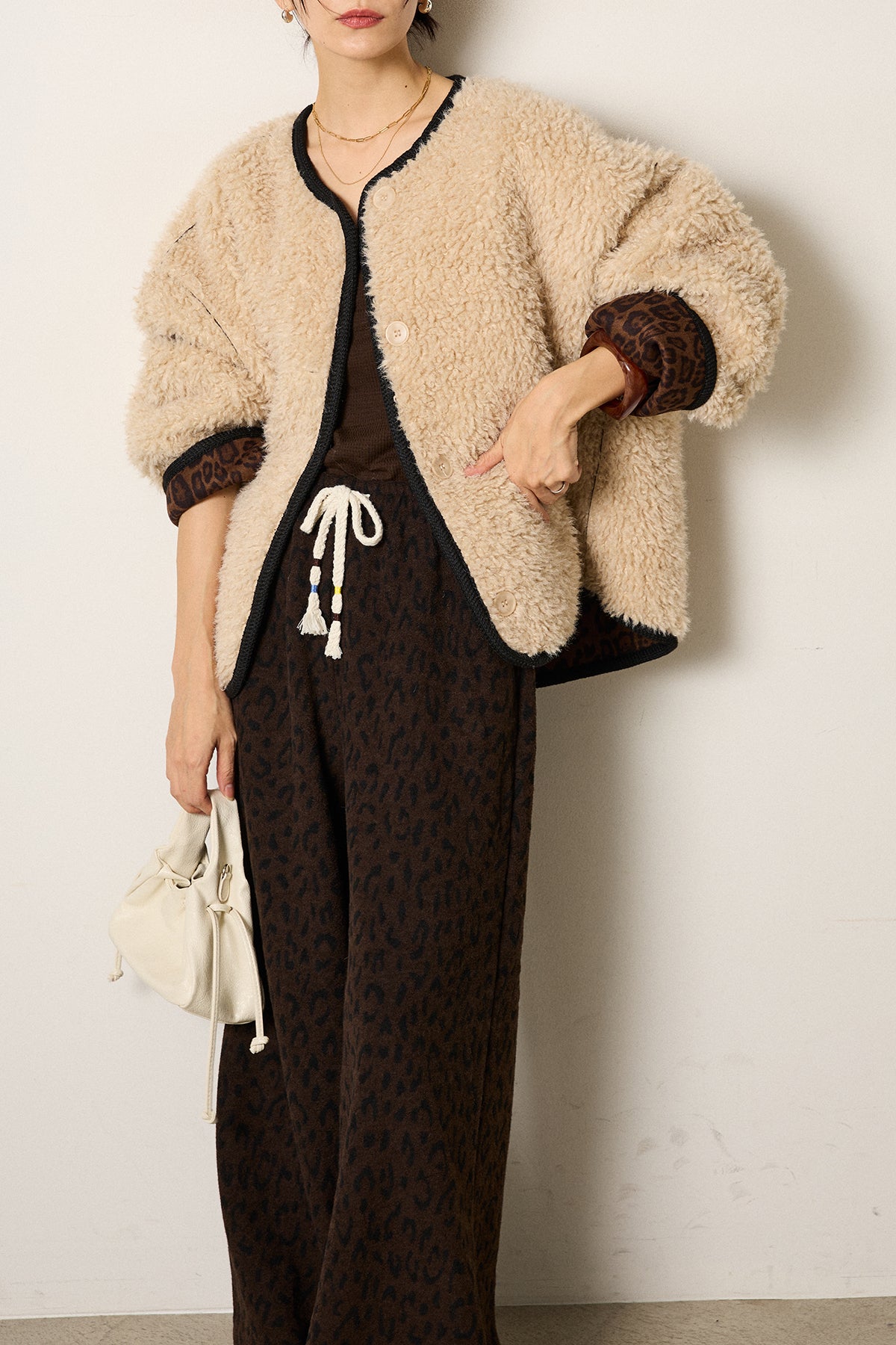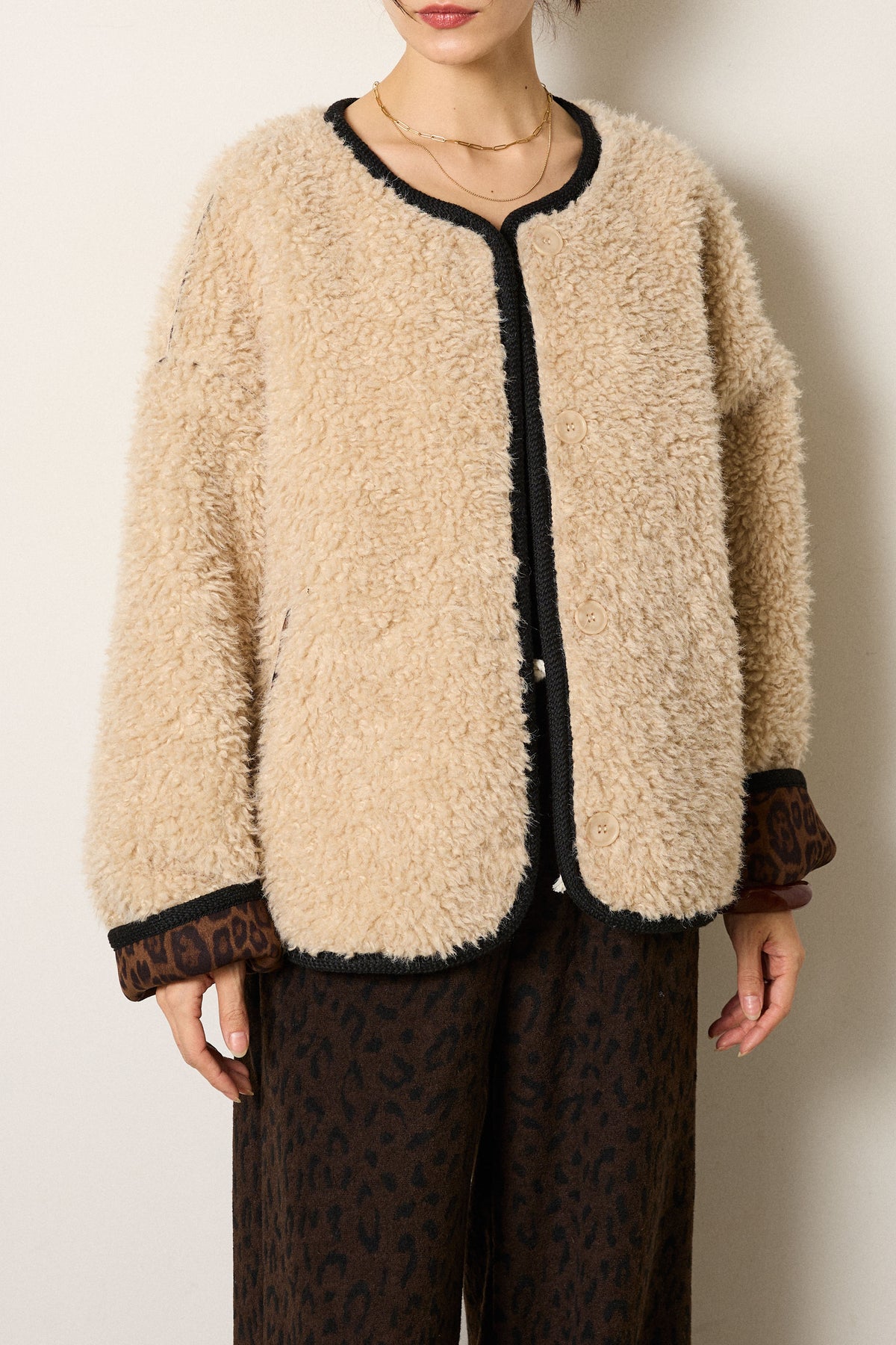 ノーカラー裏地レオパードボアアウター