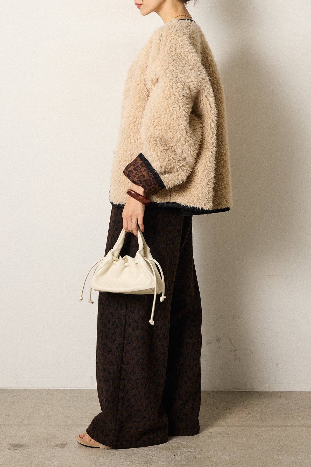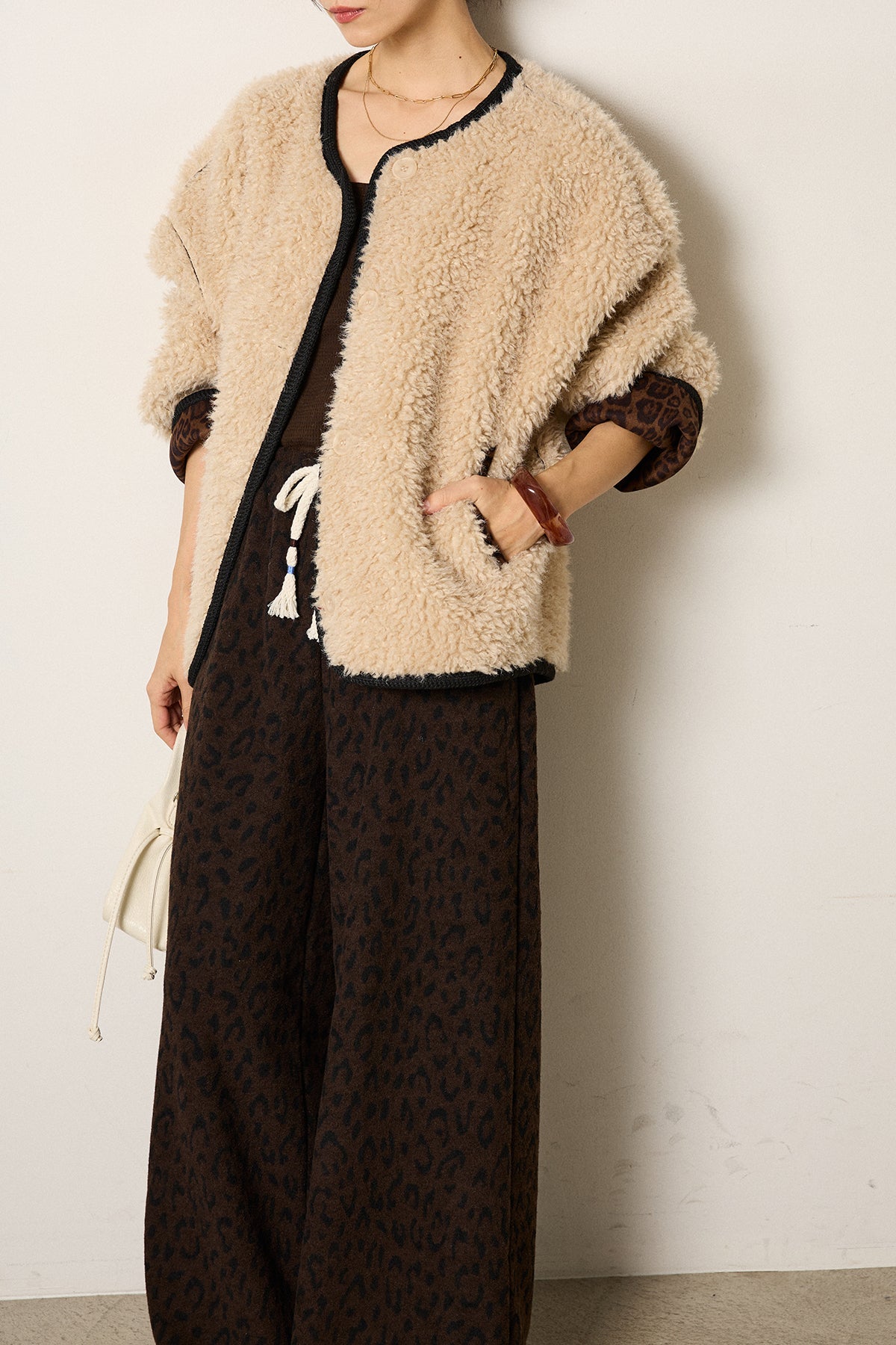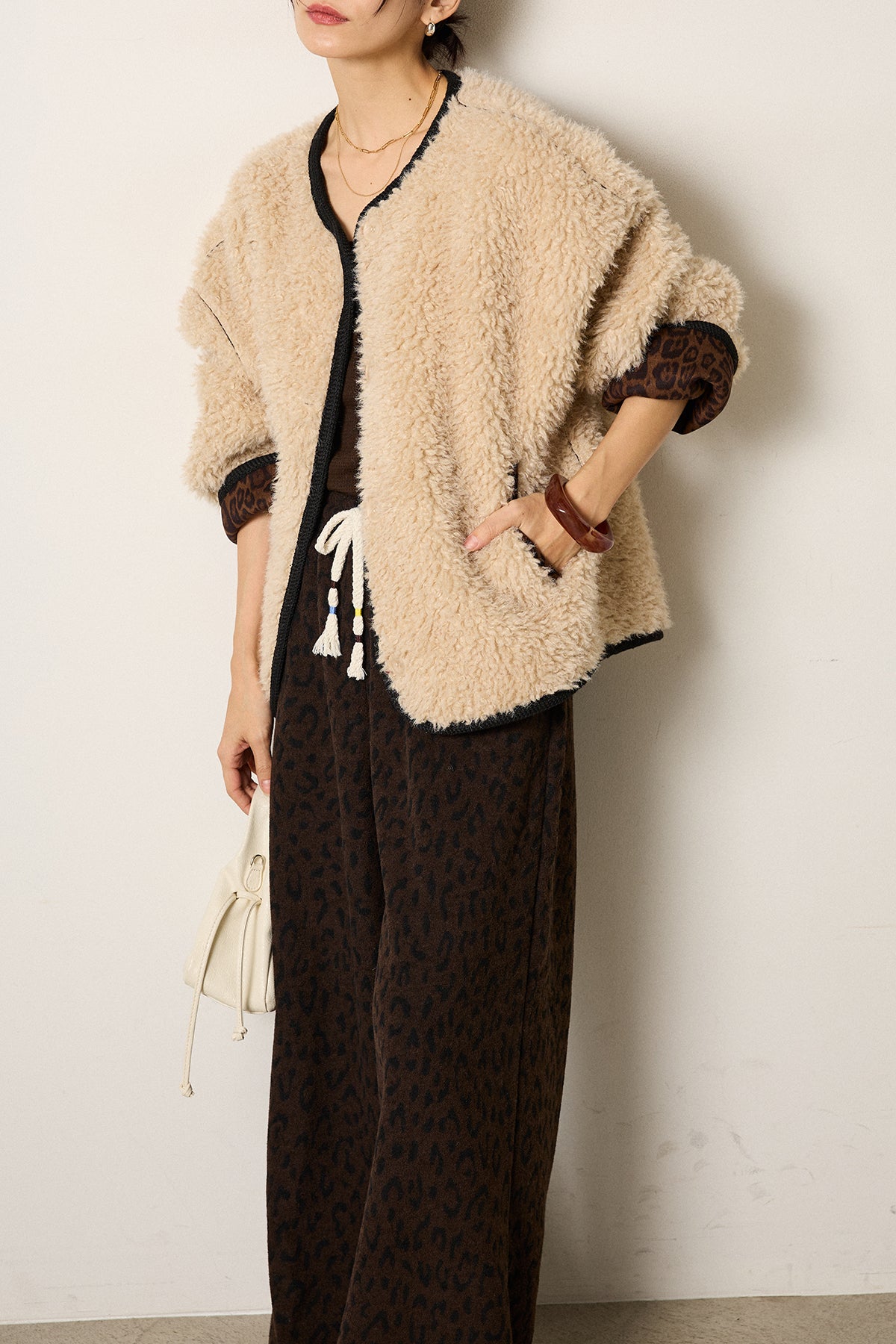 ノーカラー裏地レオパードボアアウター