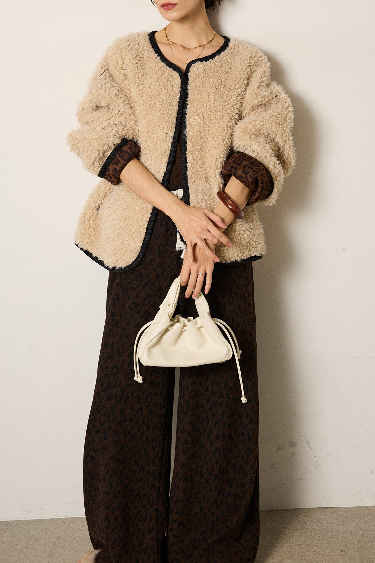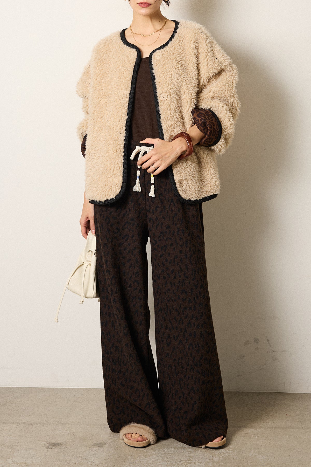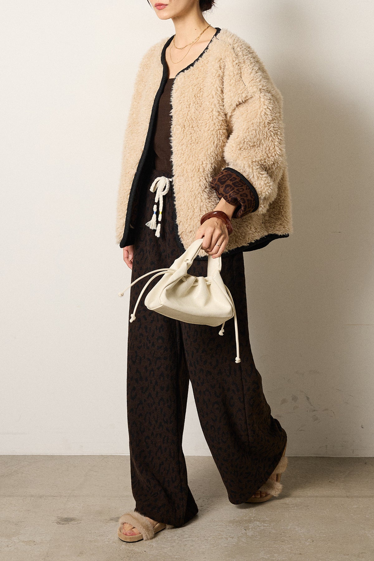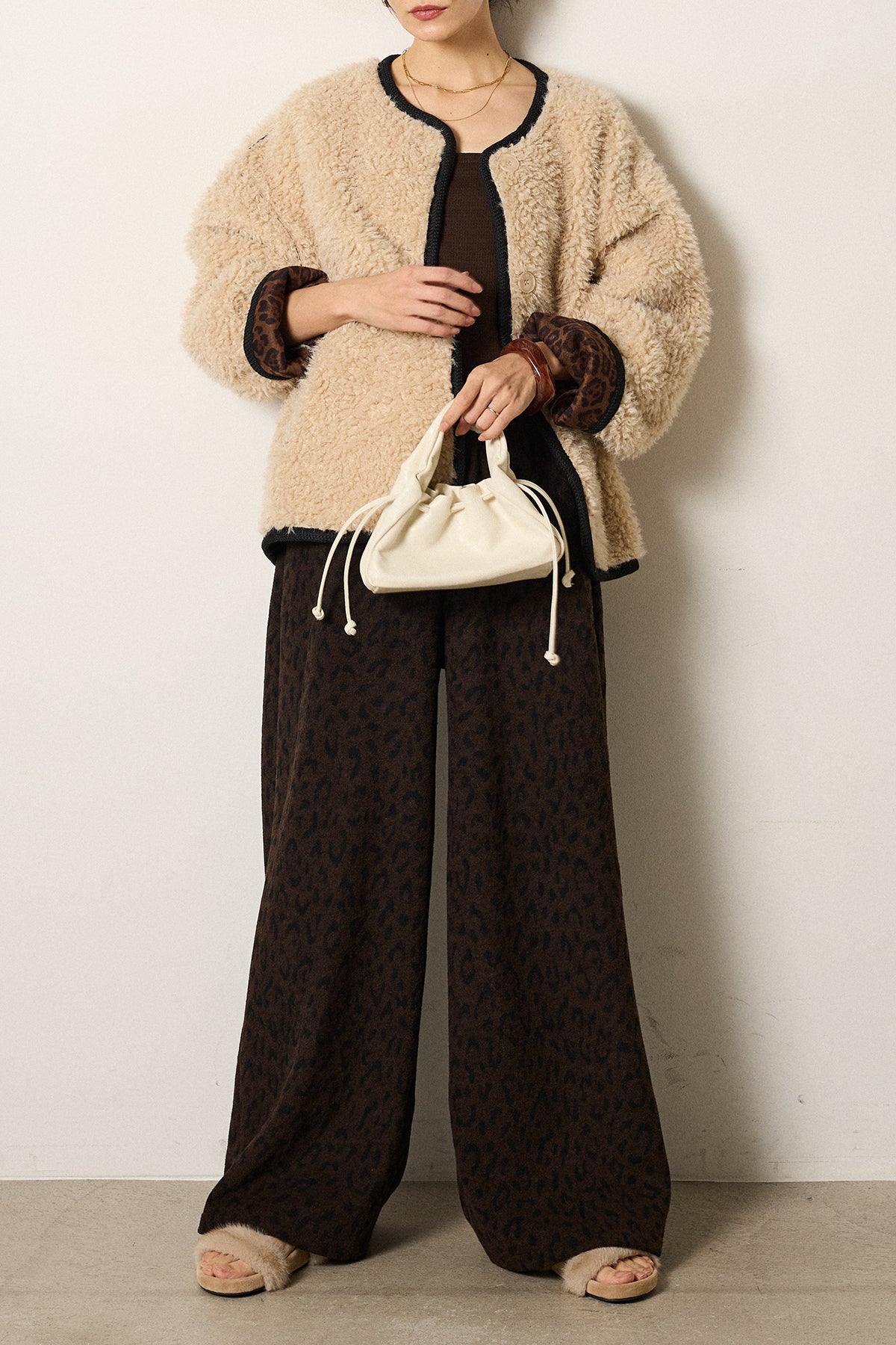 ノーカラー裏地レオパードボアアウター