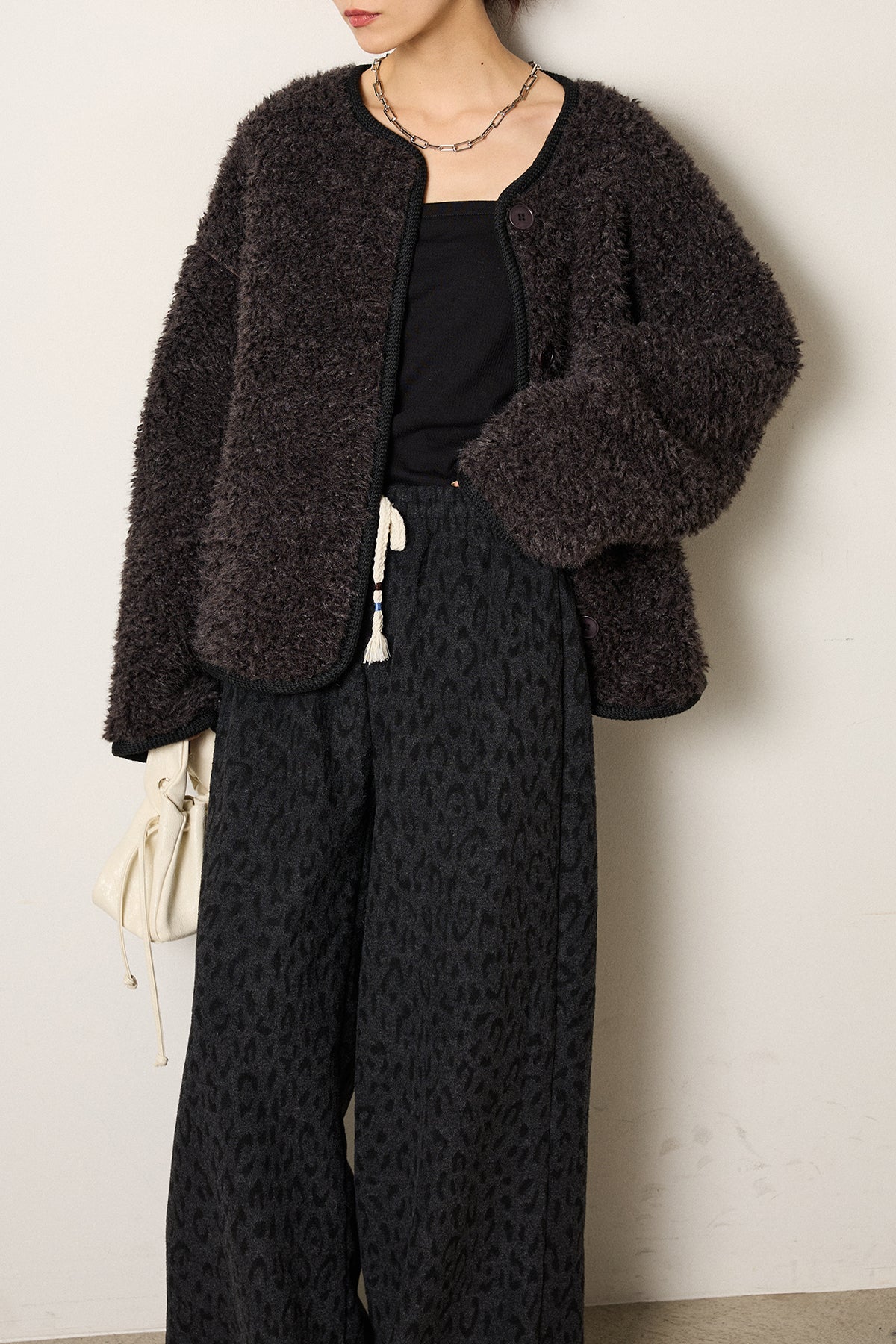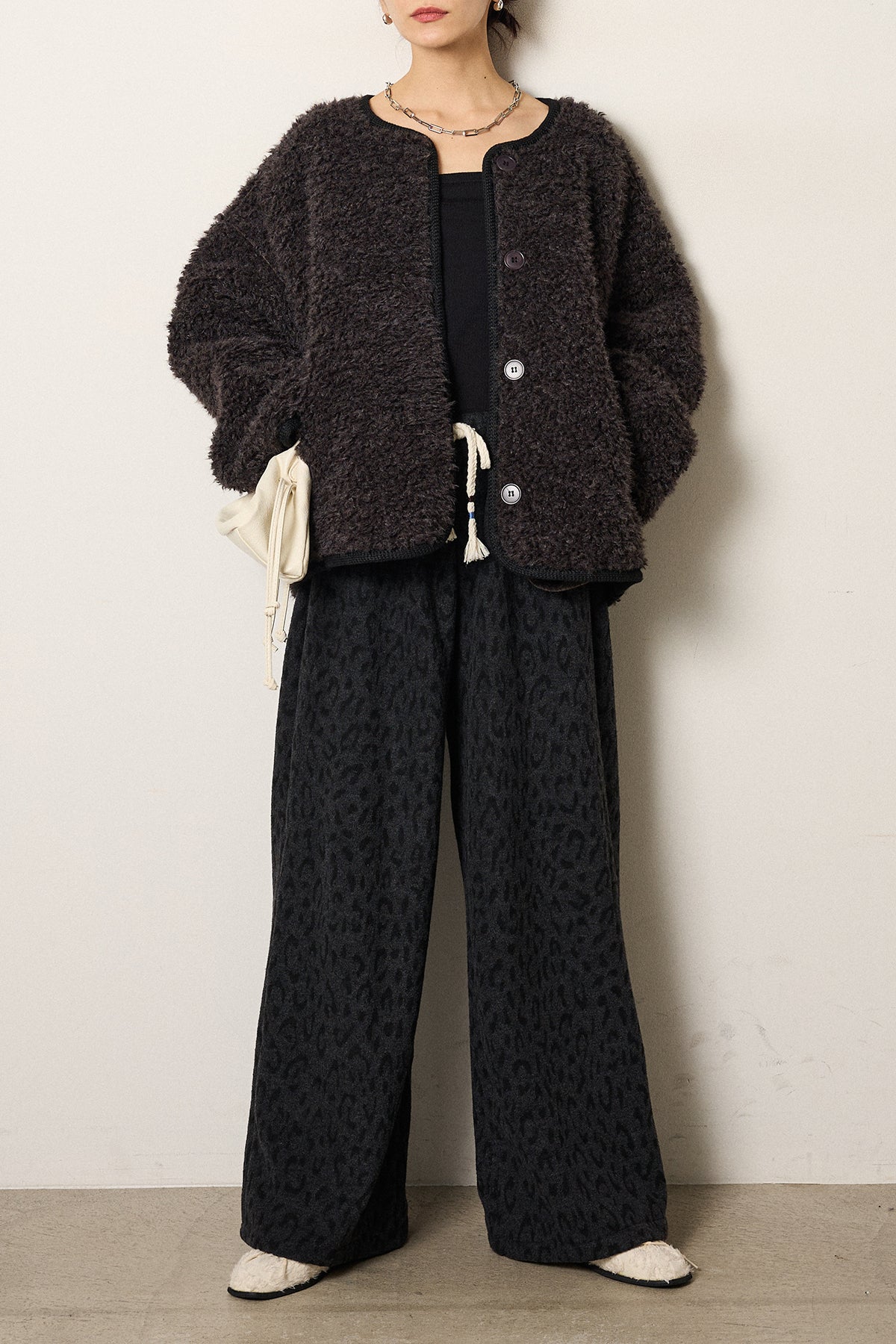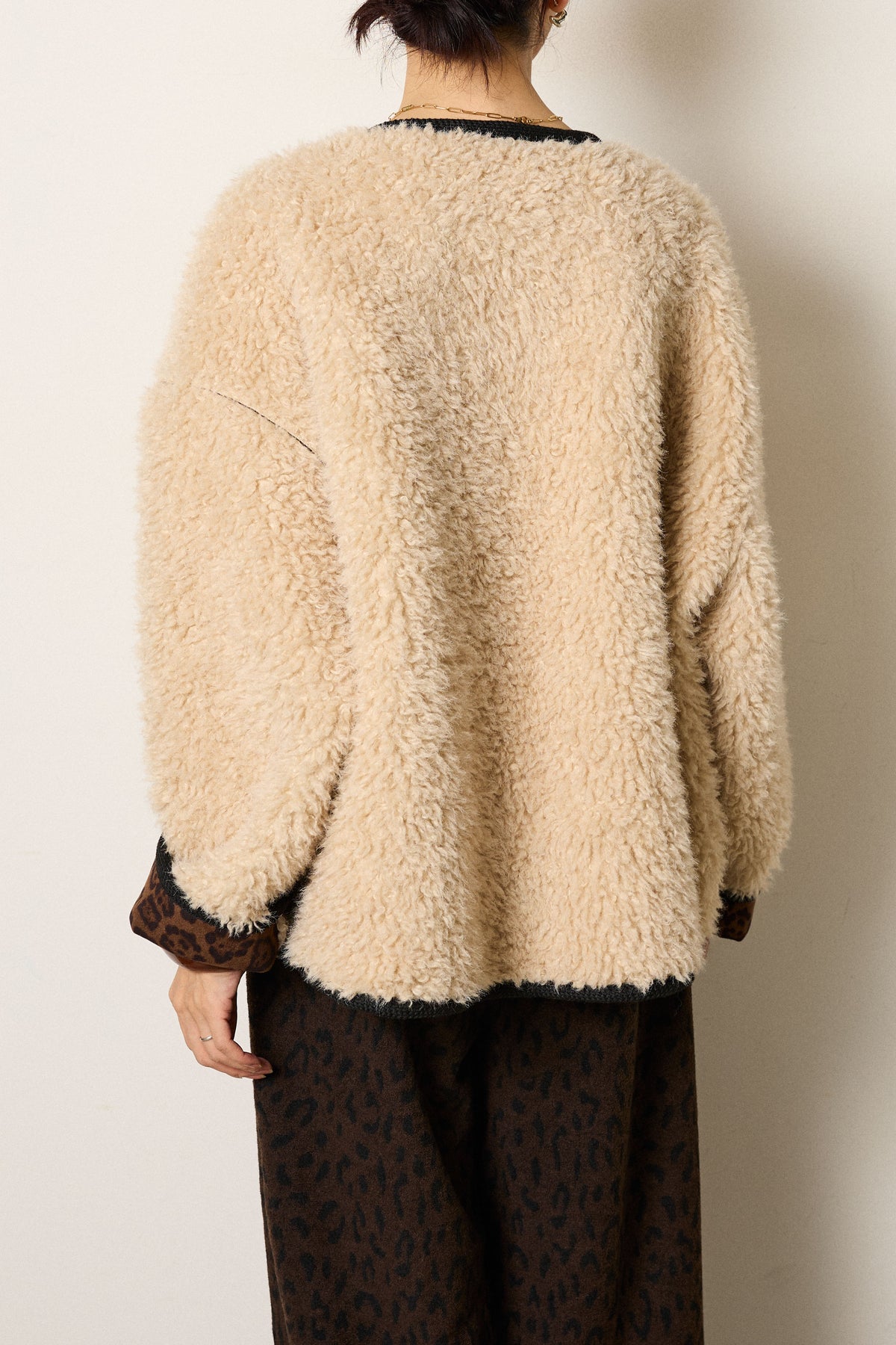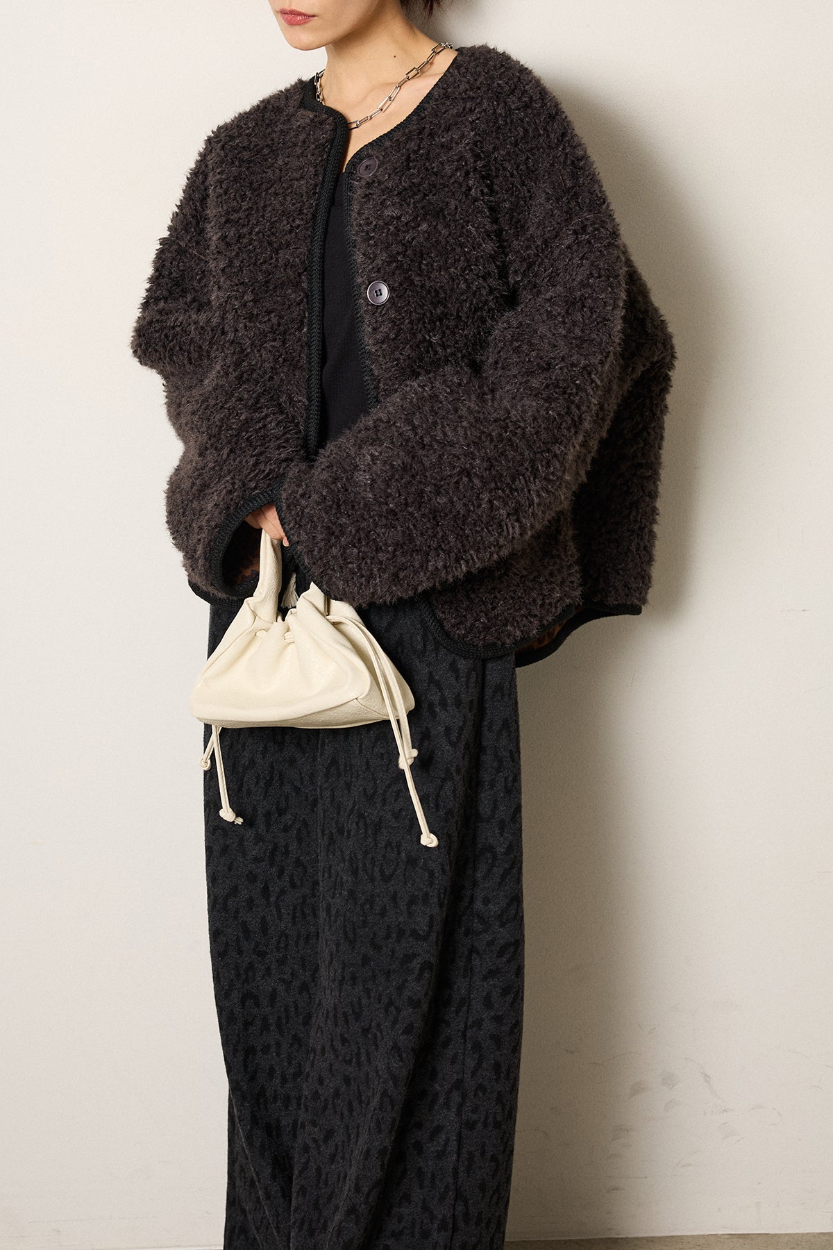 ふんわりとした起毛感が魅力のノーカラーボアアウター。 裏地付きで軽くあたたかく、ゆとりのあるシルエットが抜け感をプラス。 ノーカラーのすっきりとした首元は、ハイネックやタートルネックとも好相性です。 大きめのボタンとポケットがアクセントになり、デイリー使いにも最適。 さりげなく見える裏地のレオパード調の風合いがモード感を添える、季節感たっぷりの一枚です。