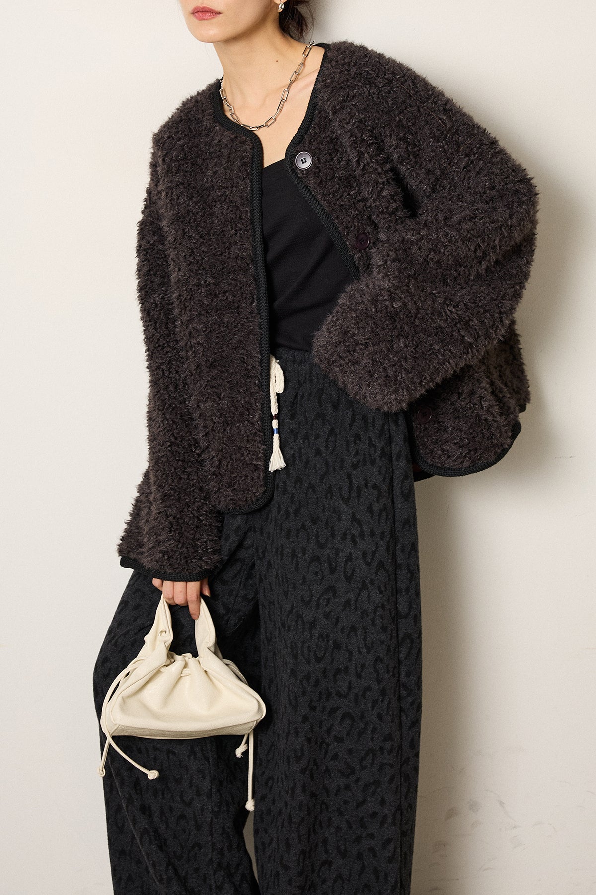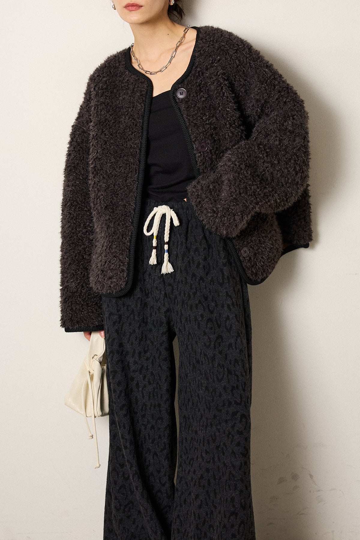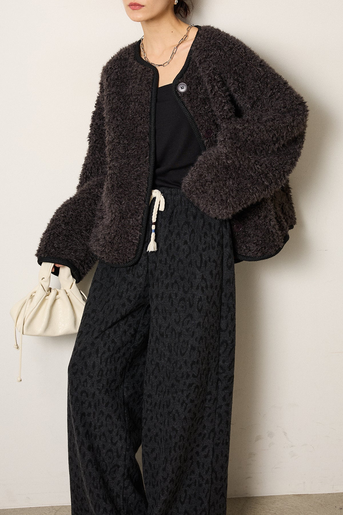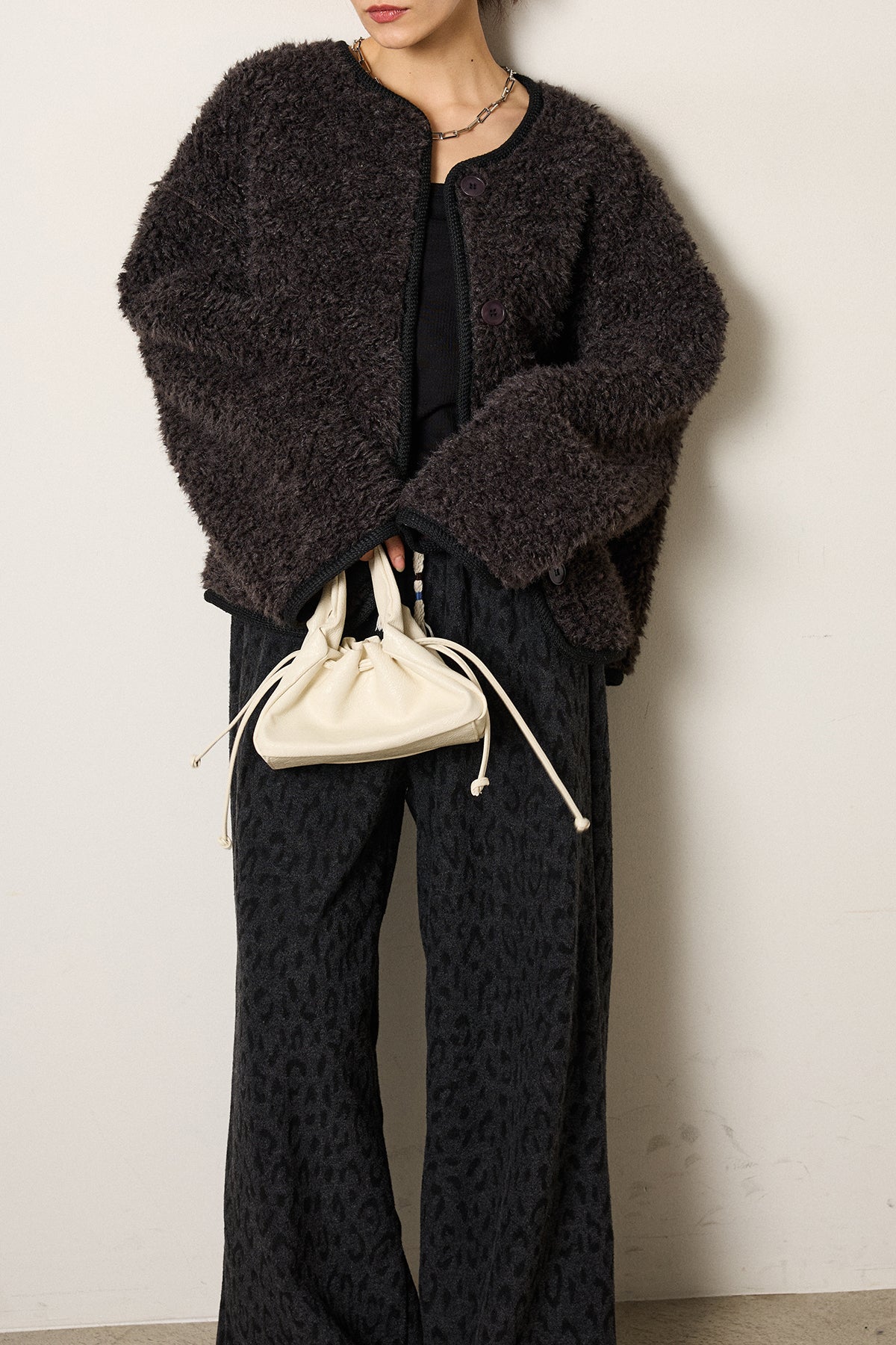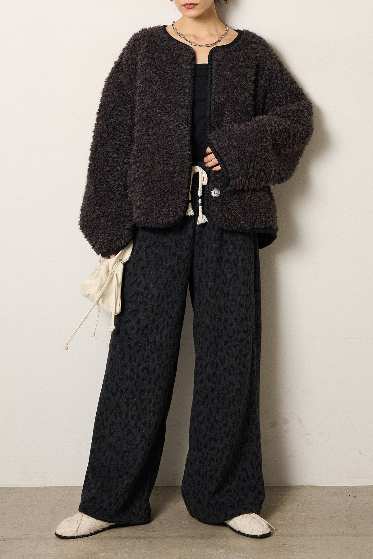 ふんわりとした起毛感が魅力のノーカラーボアアウター。 裏地付きで軽くあたたかく、ゆとりのあるシルエットが抜け感をプラス。 ノーカラーのすっきりとした首元は、ハイネックやタートルネックとも好相性です。 大きめのボタンとポケットがアクセントになり、デイリー使いにも最適。 さりげなく見える裏地のレオパード調の風合いがモード感を添える、季節感たっぷりの一枚です。