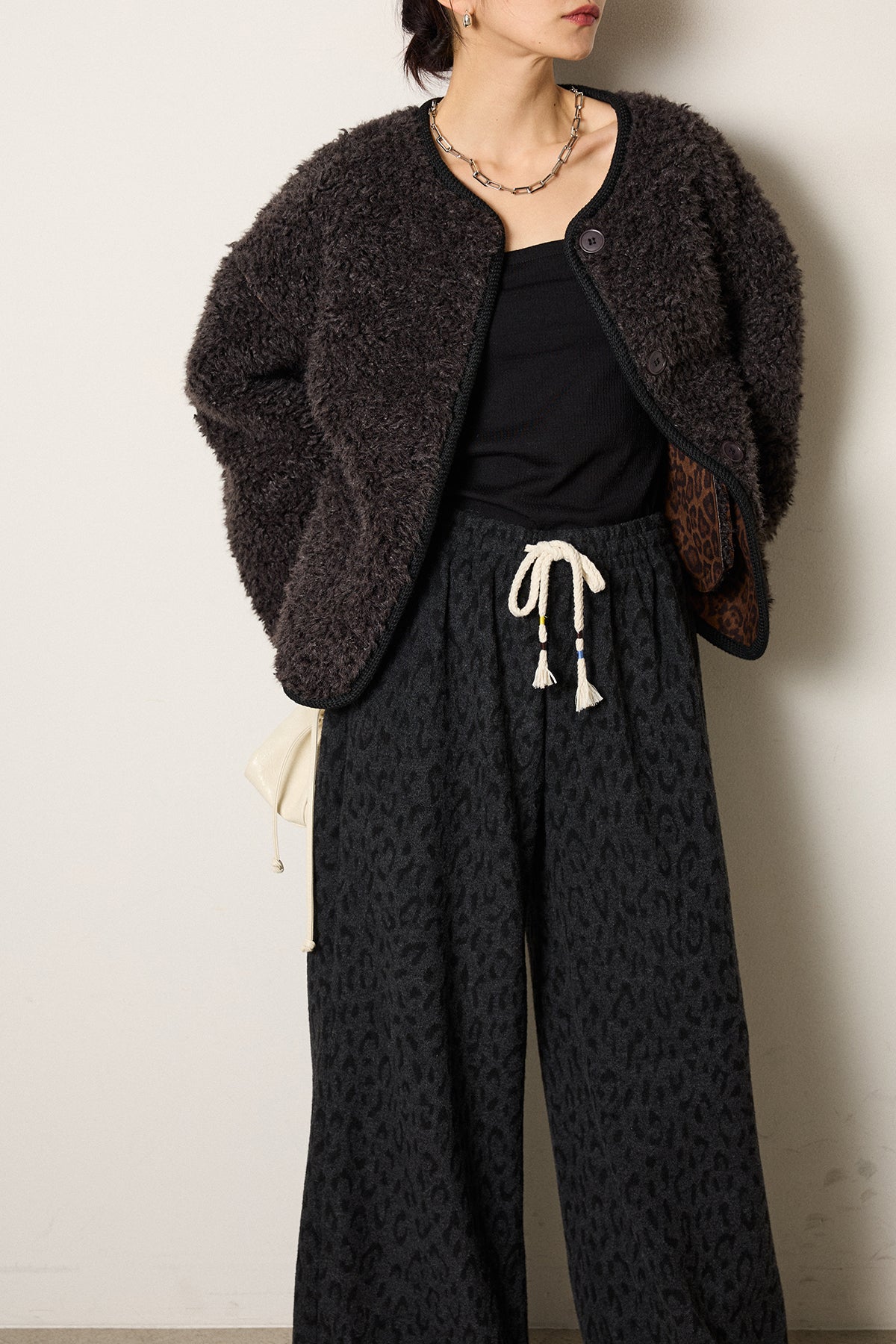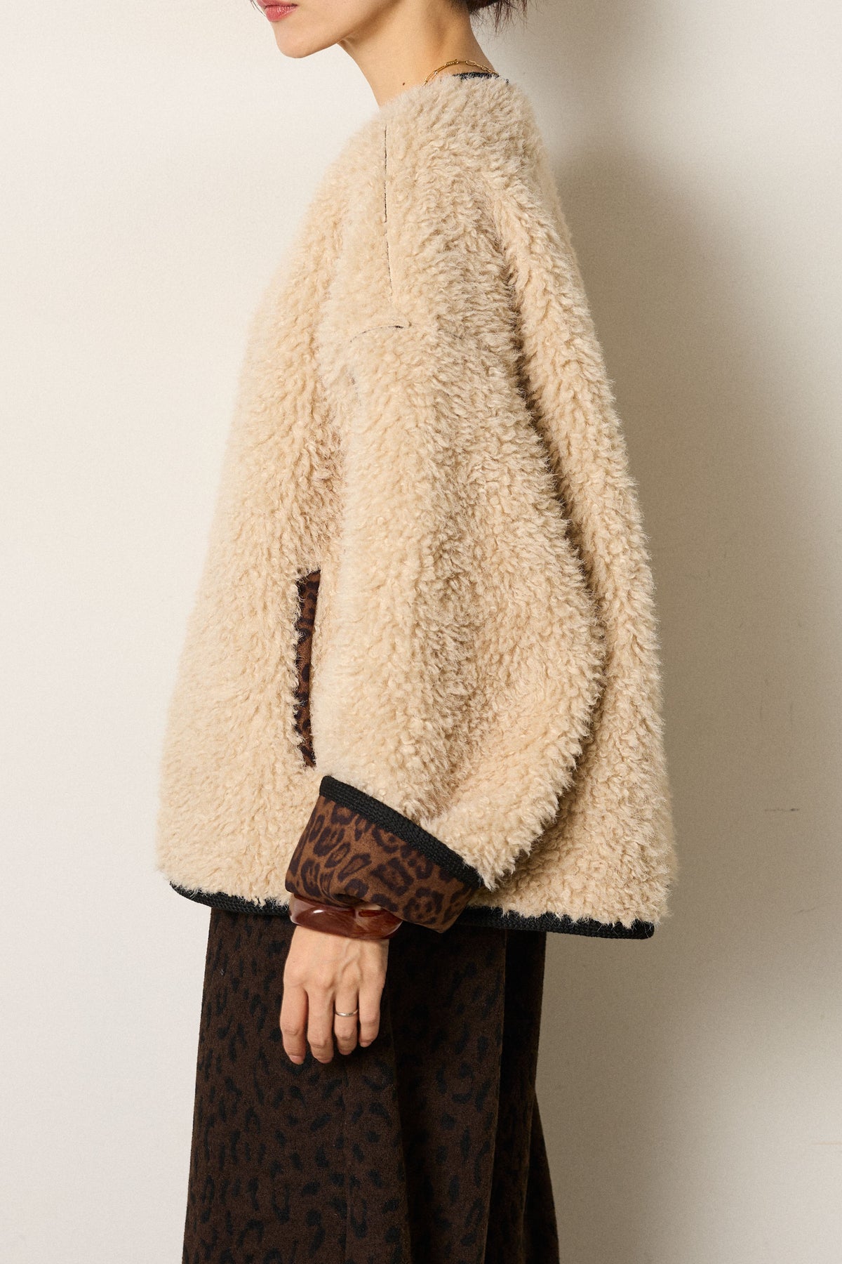 ◆ ノーカラー裏地レオパードボアアウター