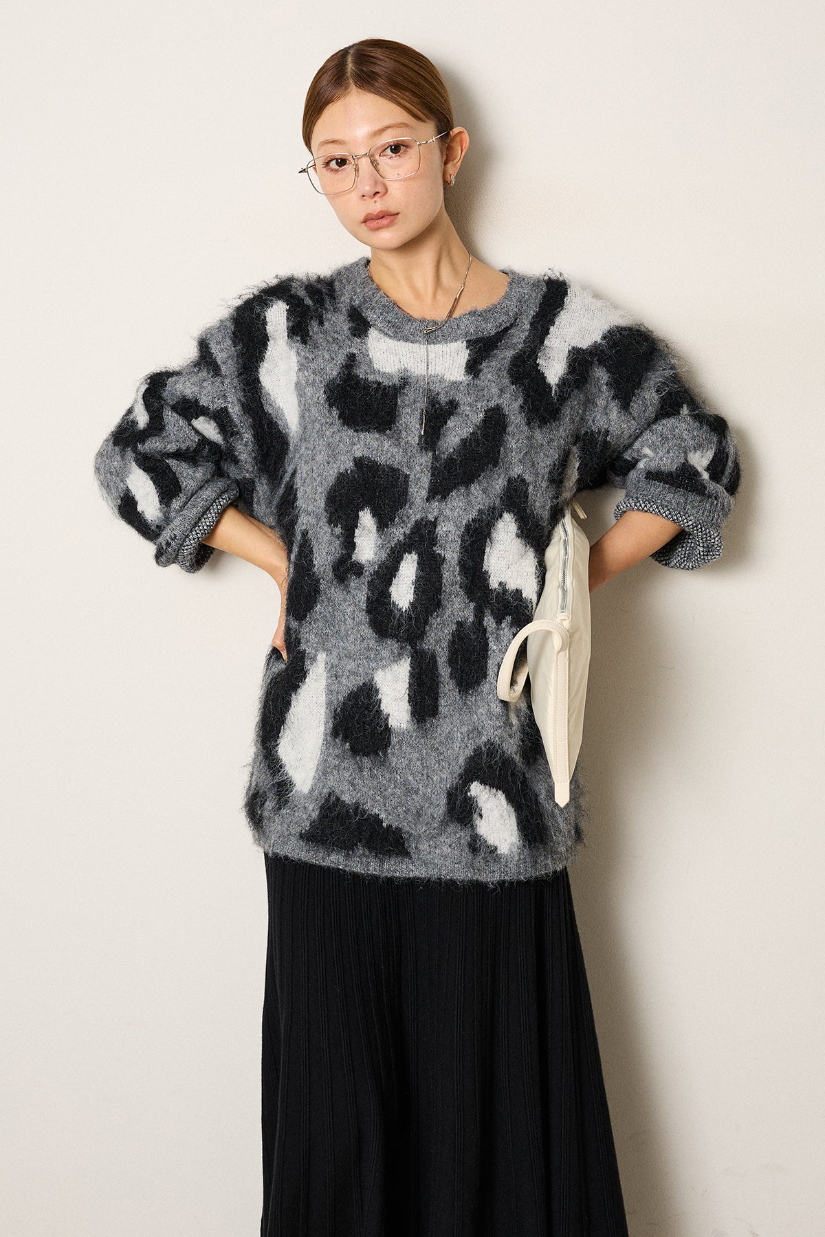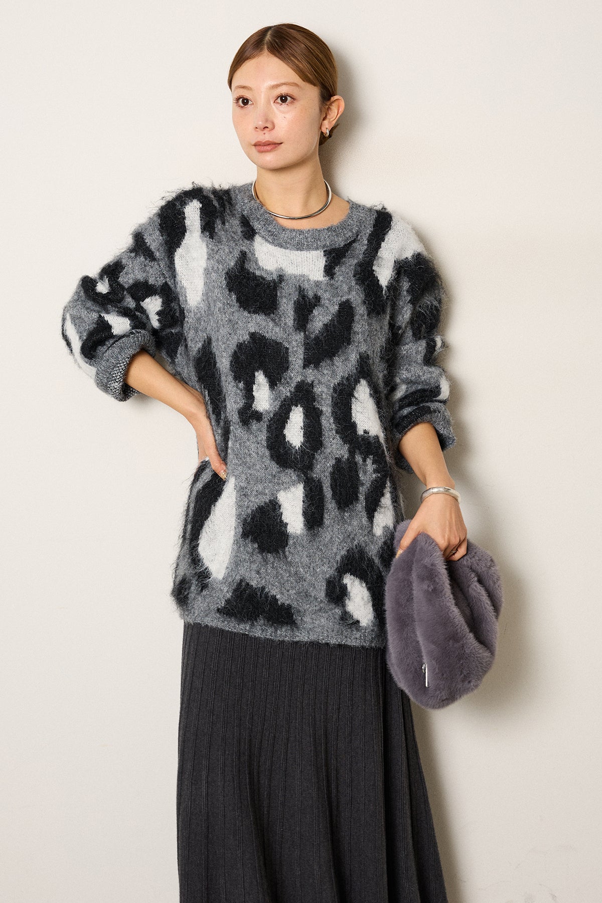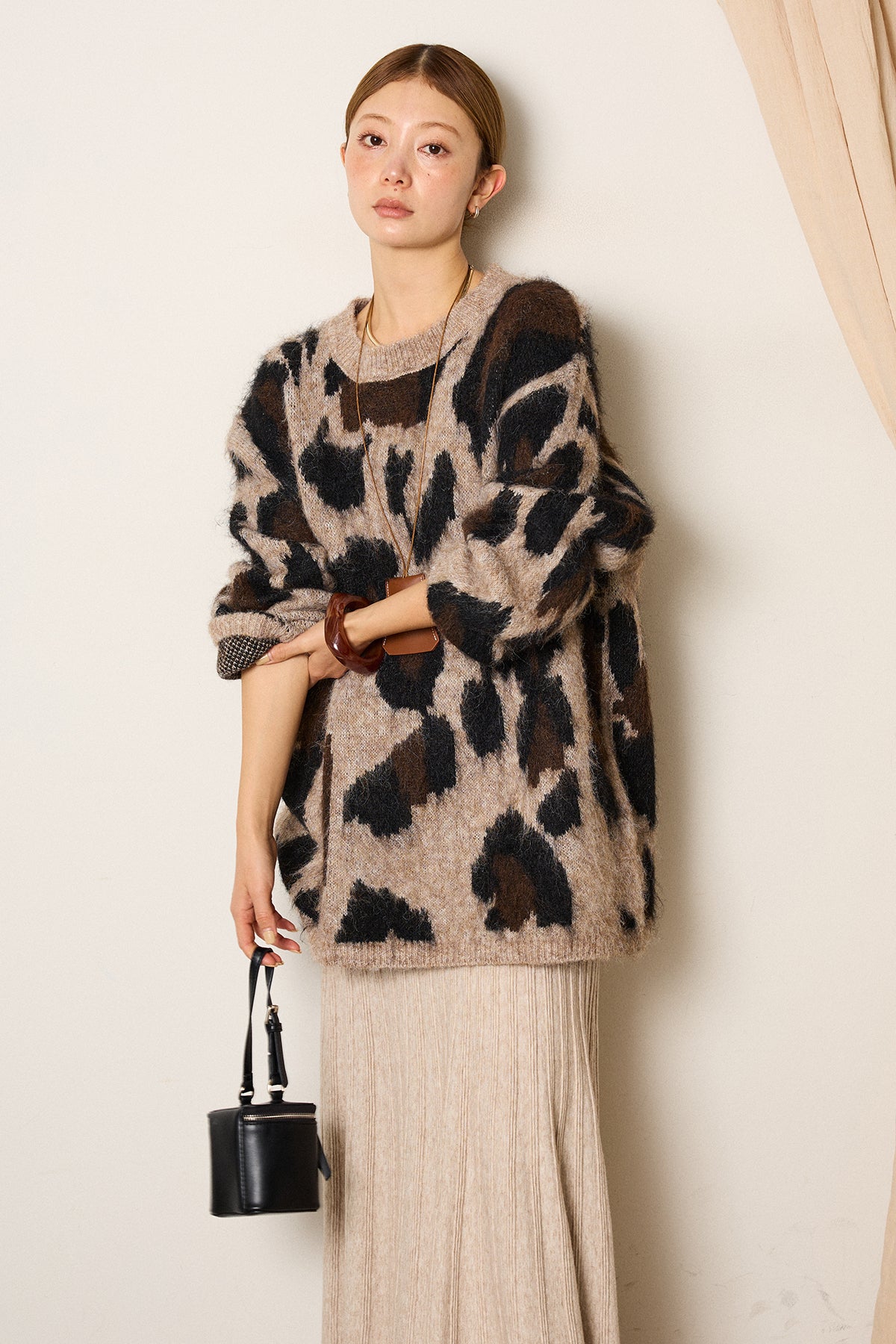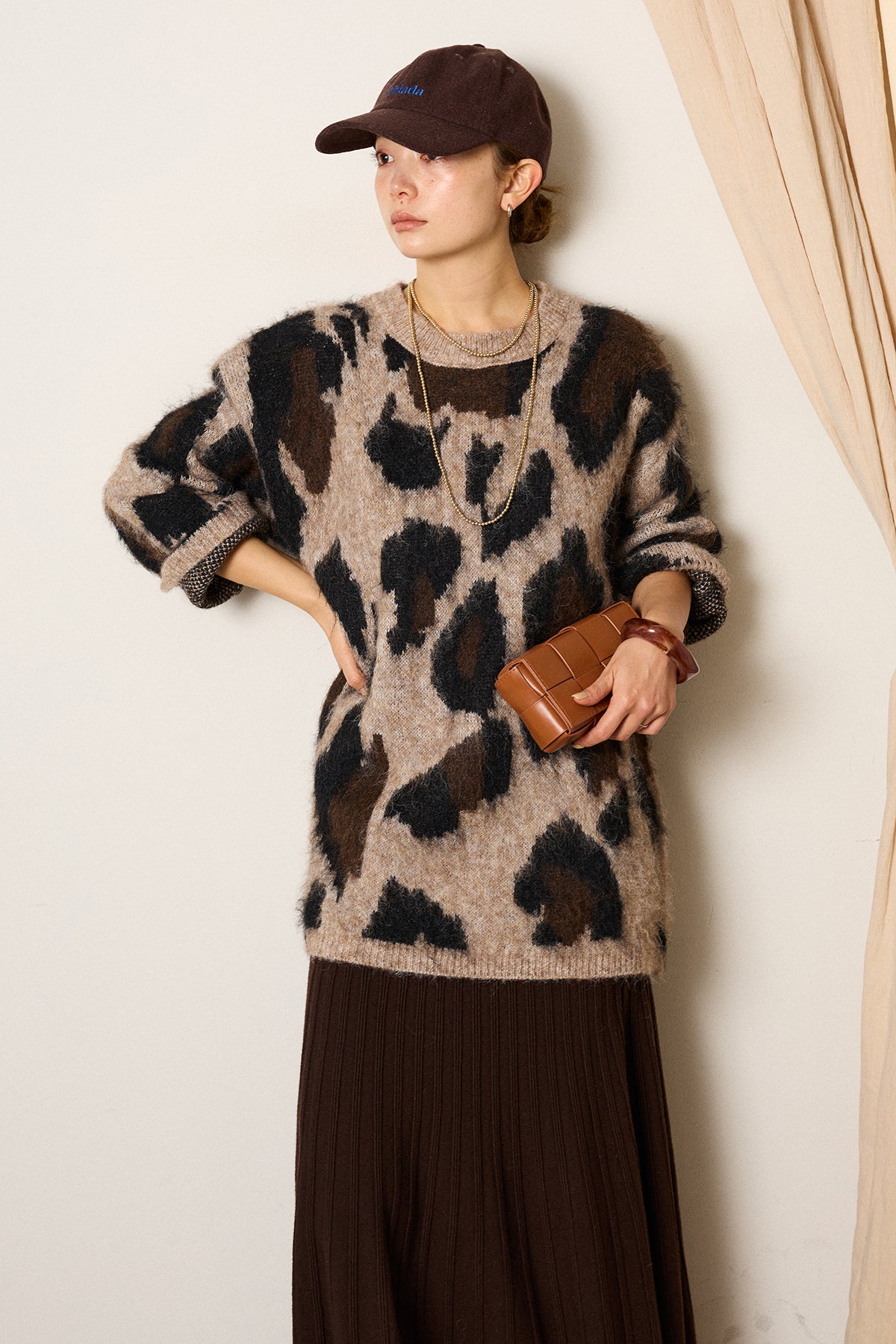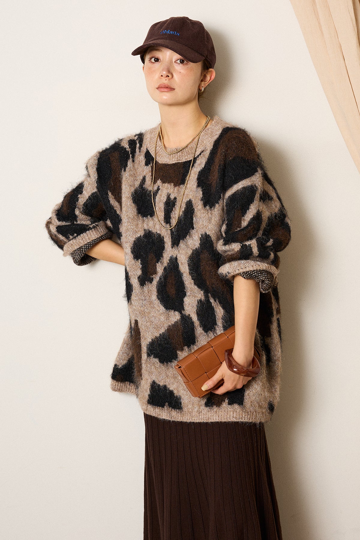 ふわふわとしたモヘア素材が魅力のルーズニット。 存在感のあるアニマル柄がスタイリングの主役になり、トレンド感と季節感を両立します。 ゆったりとしたシルエットでリラクシーな着心地ながら、ボリュームスリーブが程よい抜け感をプラス。 シンプルなボトムに合わせるだけで、大人のカジュアルスタイルが完成します。