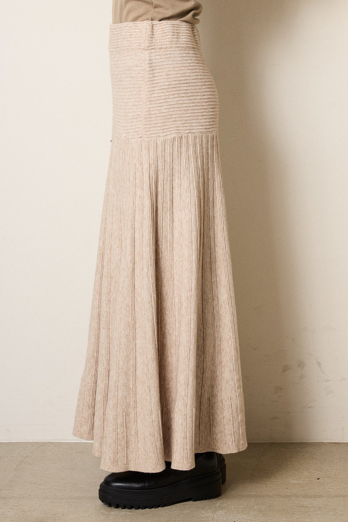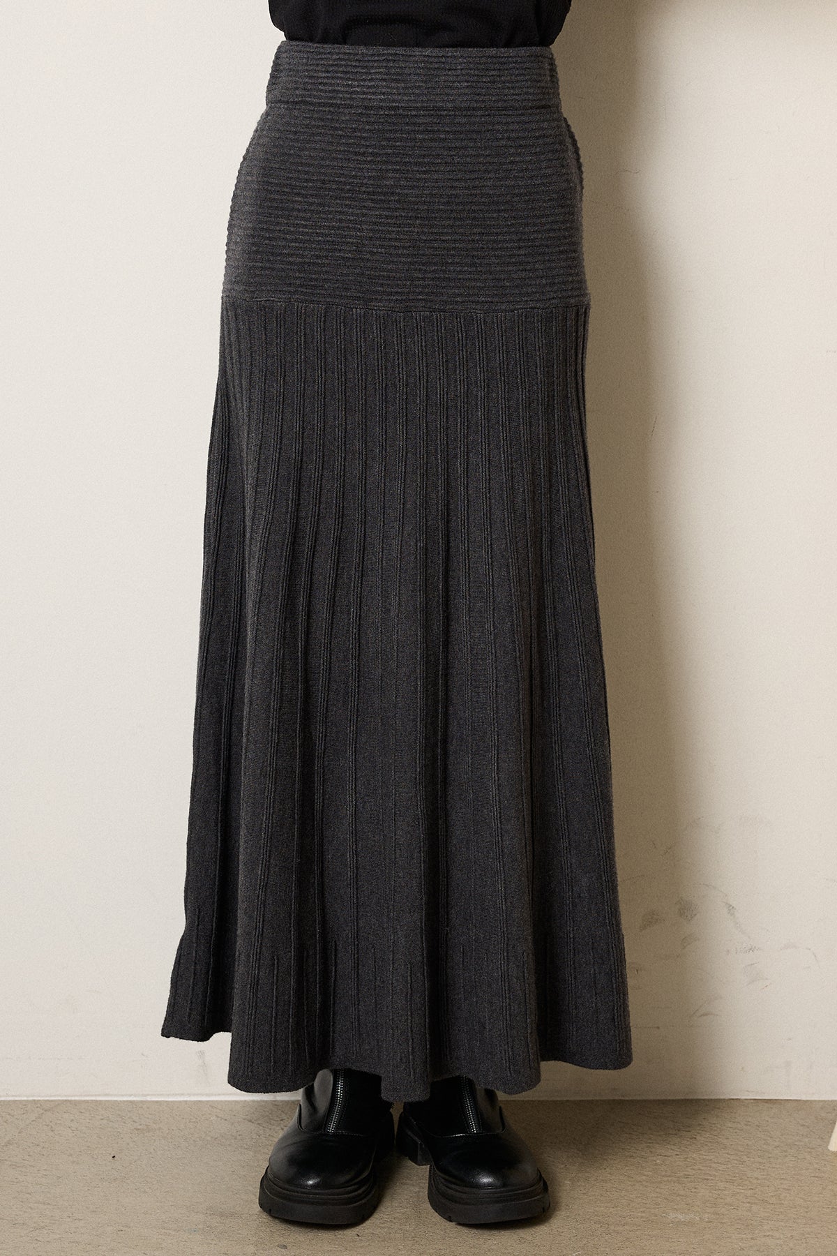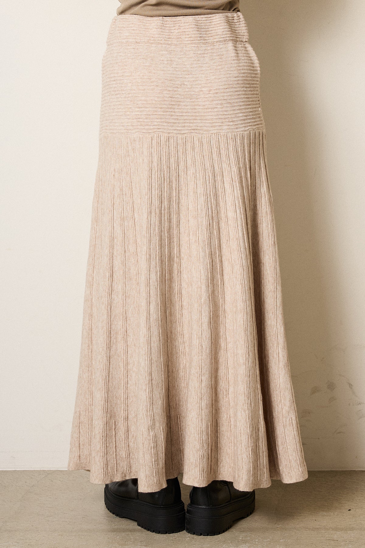編み地の切り替えが印象的なフレアニットスカート。 ウエストからヒップにかけてはリブ編みですっきり見せ、裾に向かって柔らかく広がるフレアシルエットが美しい一枚。 動くたびに揺れる軽やかなニット素材が、上品なニュアンスを添えます。 同素材のトップスと合わせたセットアップスタイルもおすすめです。