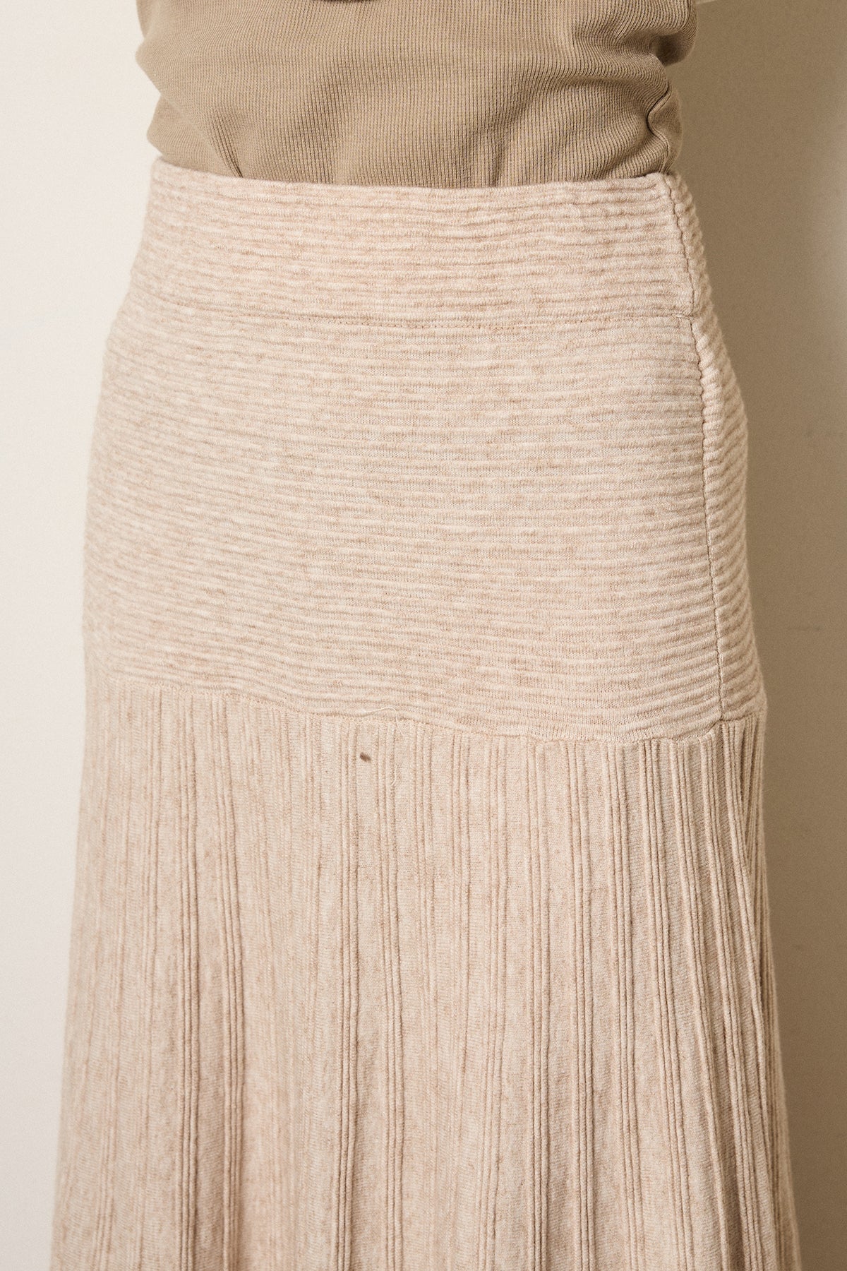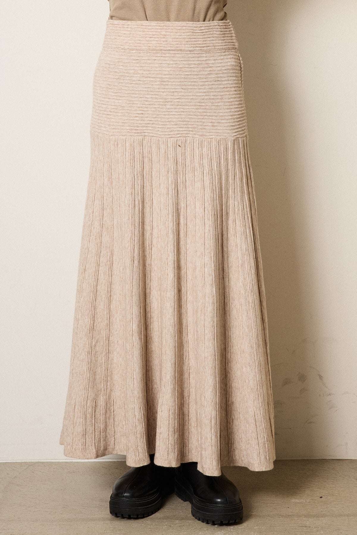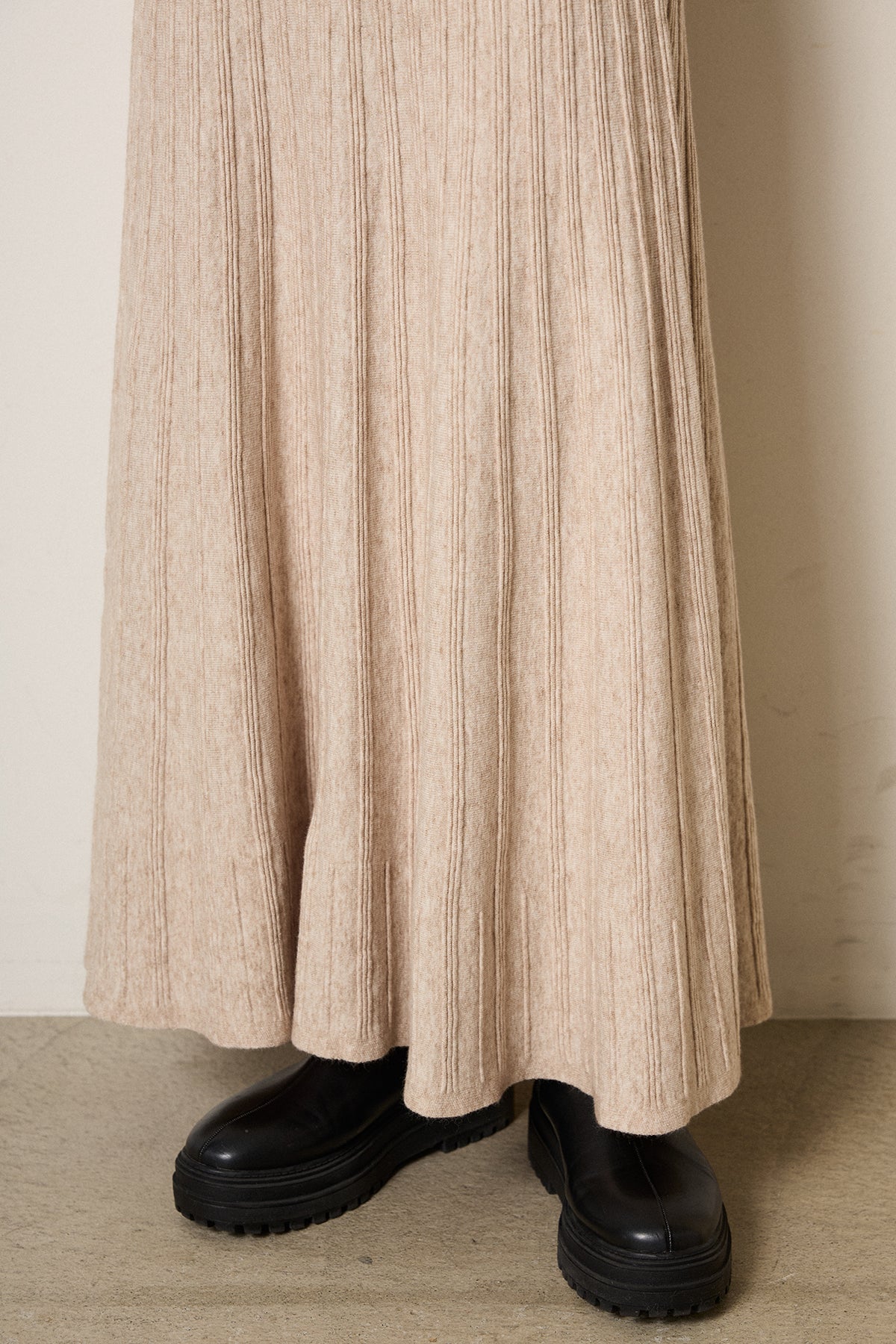 編み地の切り替えが印象的なフレアニットスカート。 ウエストからヒップにかけてはリブ編みですっきり見せ、裾に向かって柔らかく広がるフレアシルエットが美しい一枚。 動くたびに揺れる軽やかなニット素材が、上品なニュアンスを添えます。 同素材のトップスと合わせたセットアップスタイルもおすすめです。
