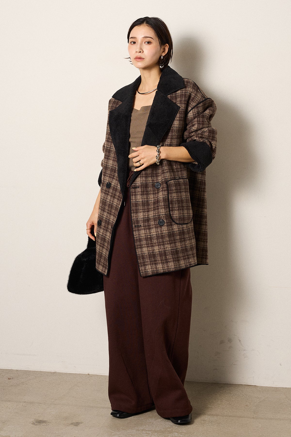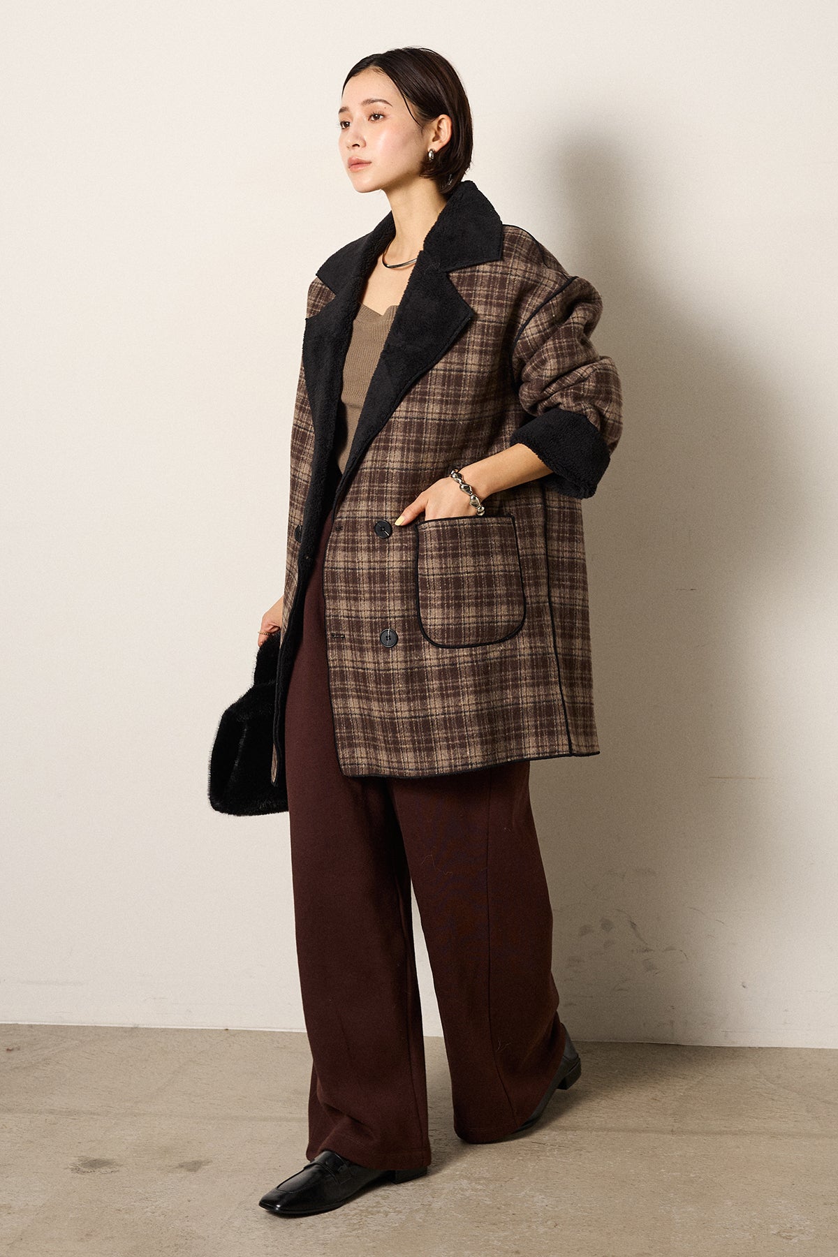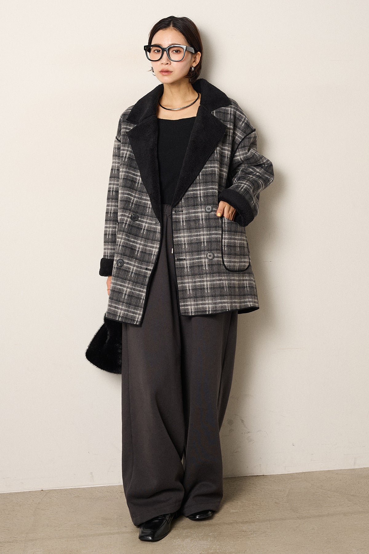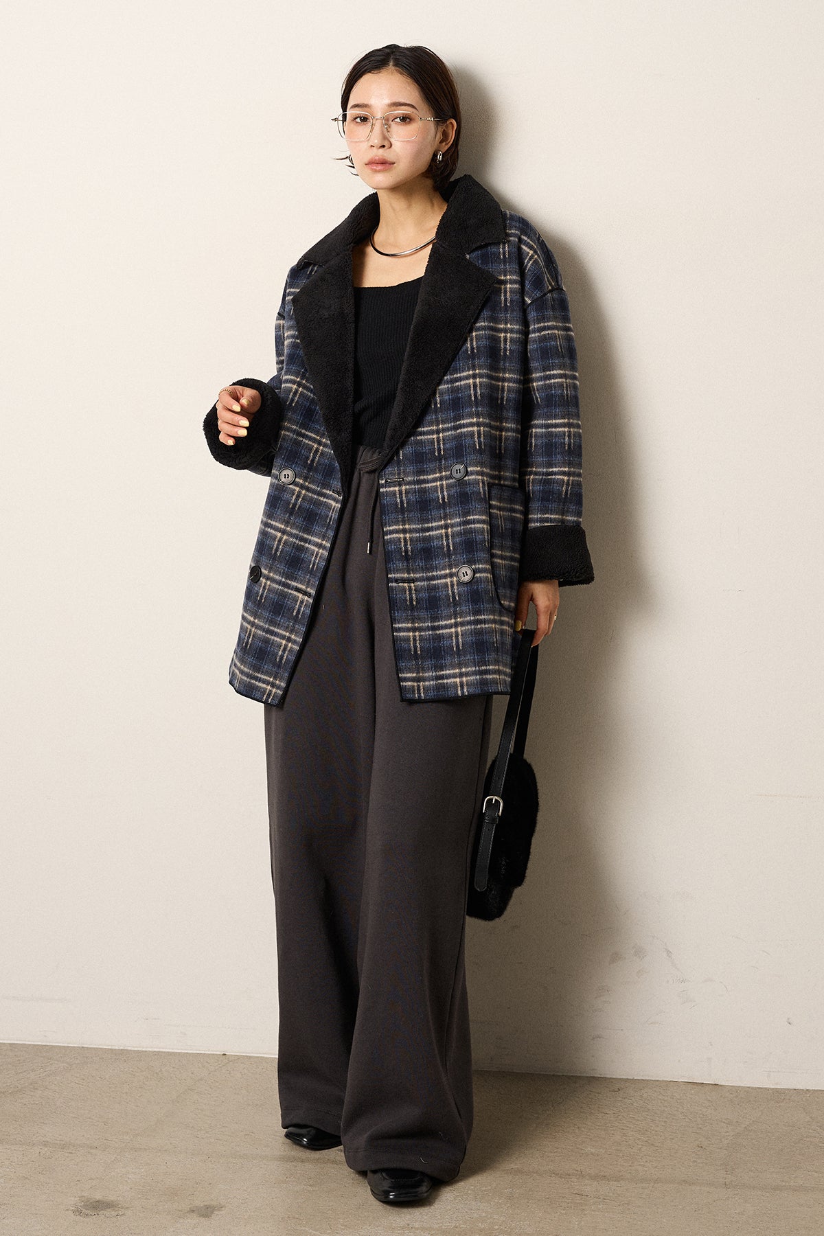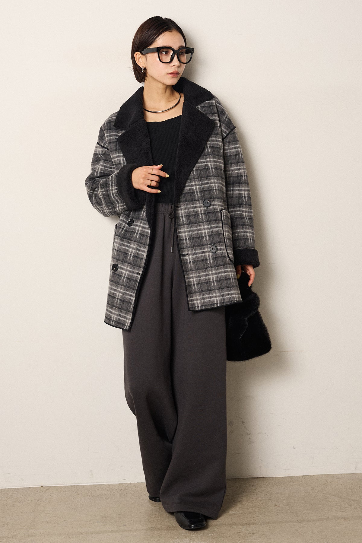 [SET]裏地ボアタータンチェック柄ミディアムコート+裏起毛スウェットワイドパンツ(2set)
