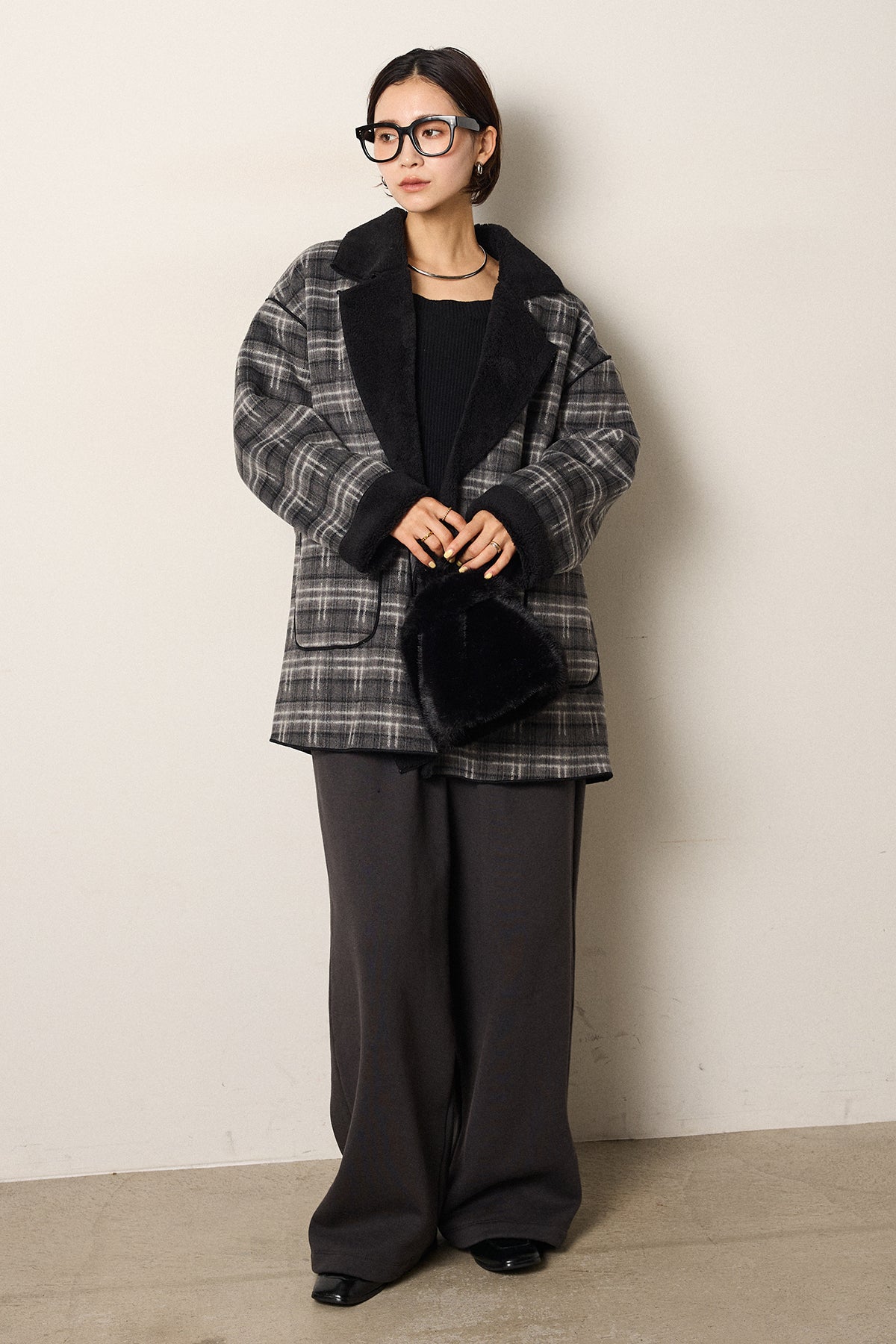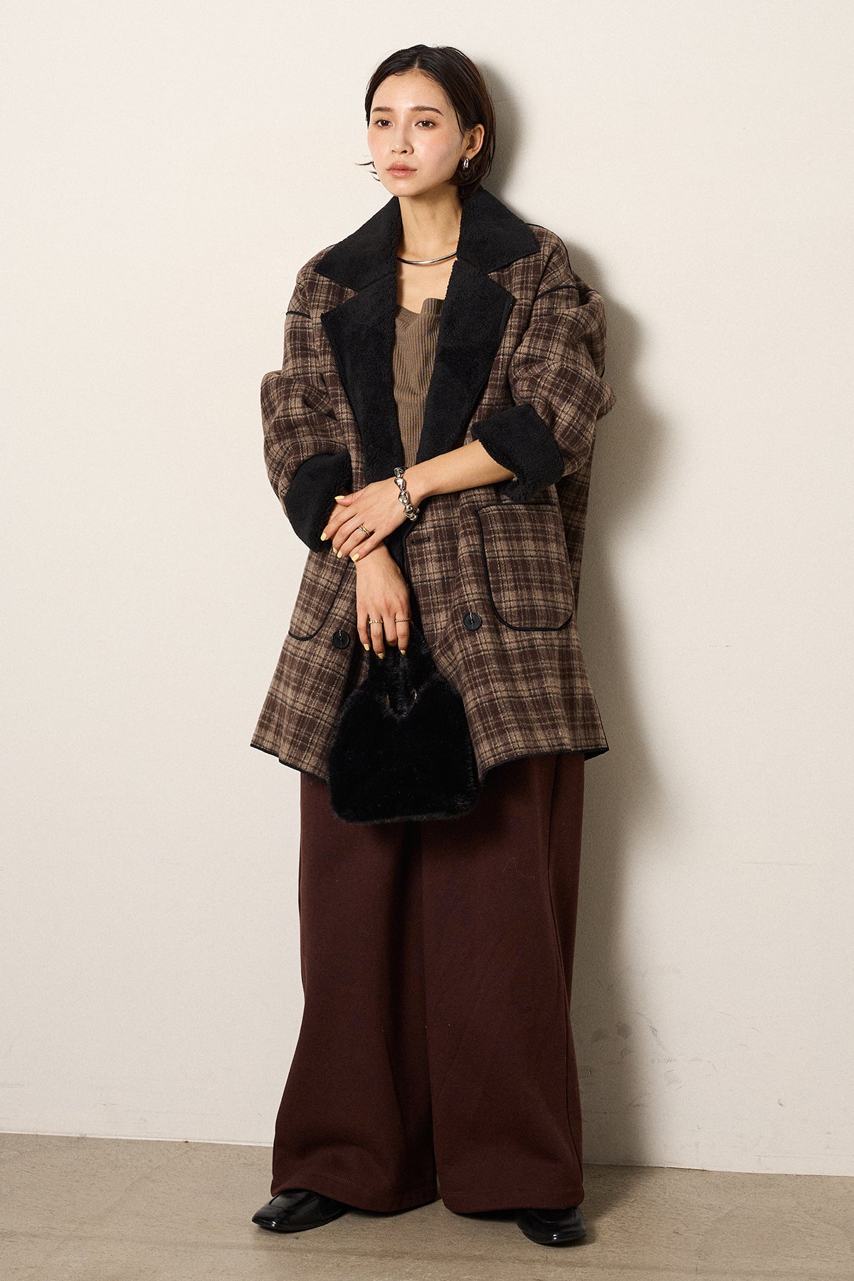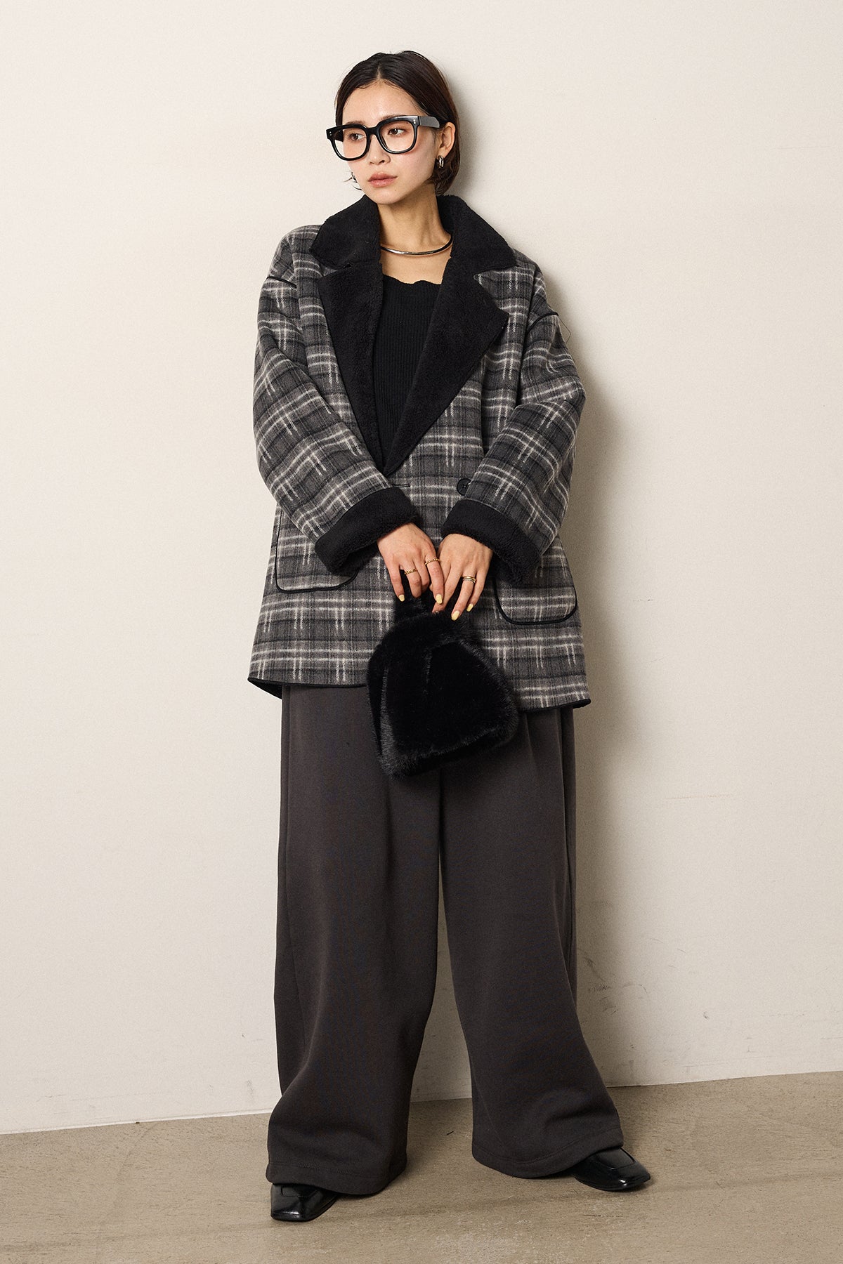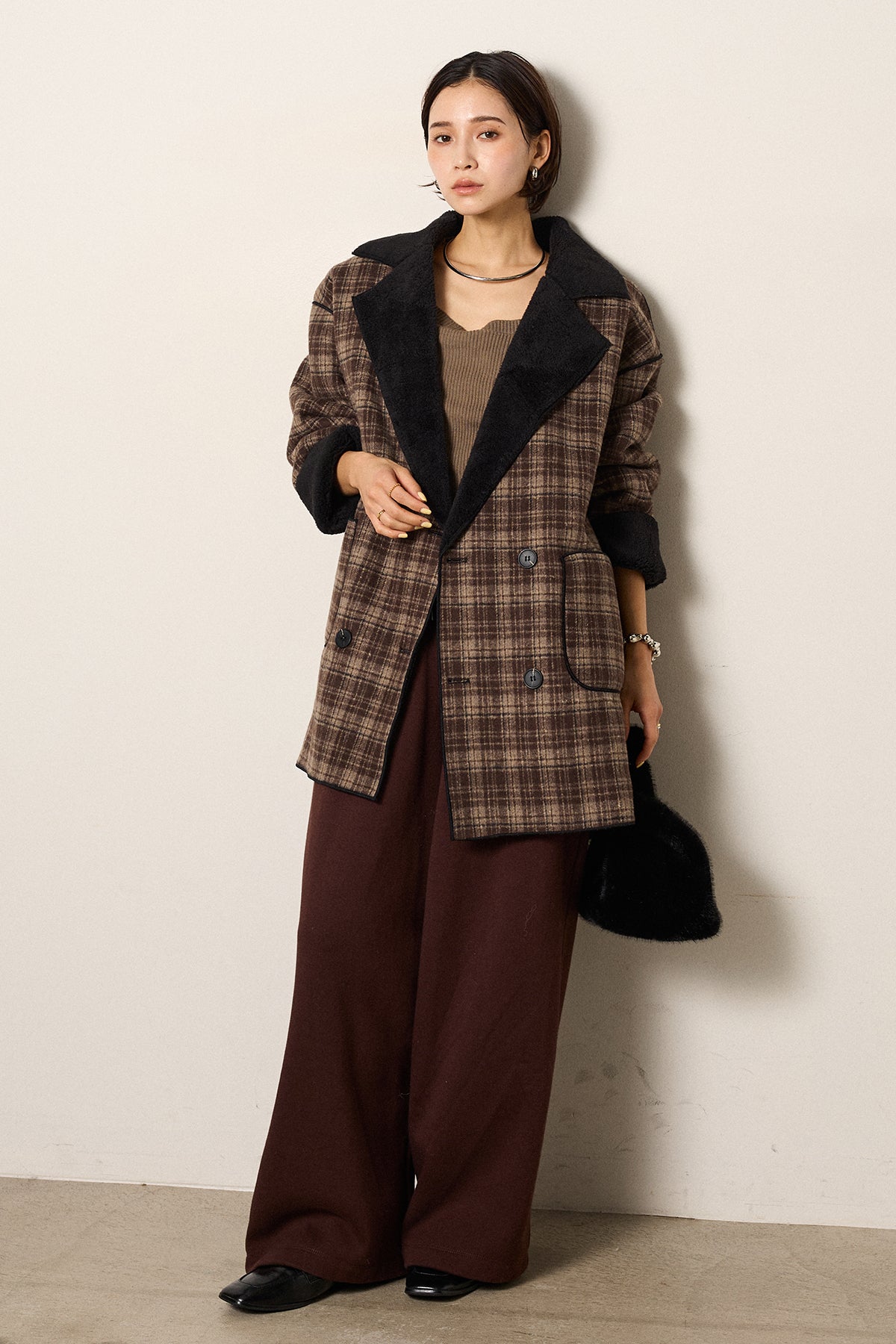 [SET]裏地ボアタータンチェック柄ミディアムコート+裏起毛スウェットワイドパンツ(2set)