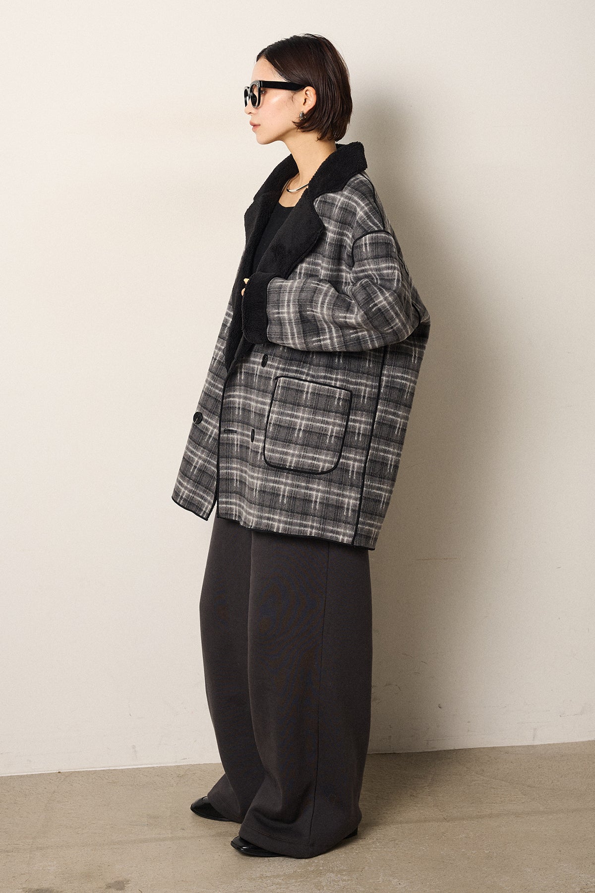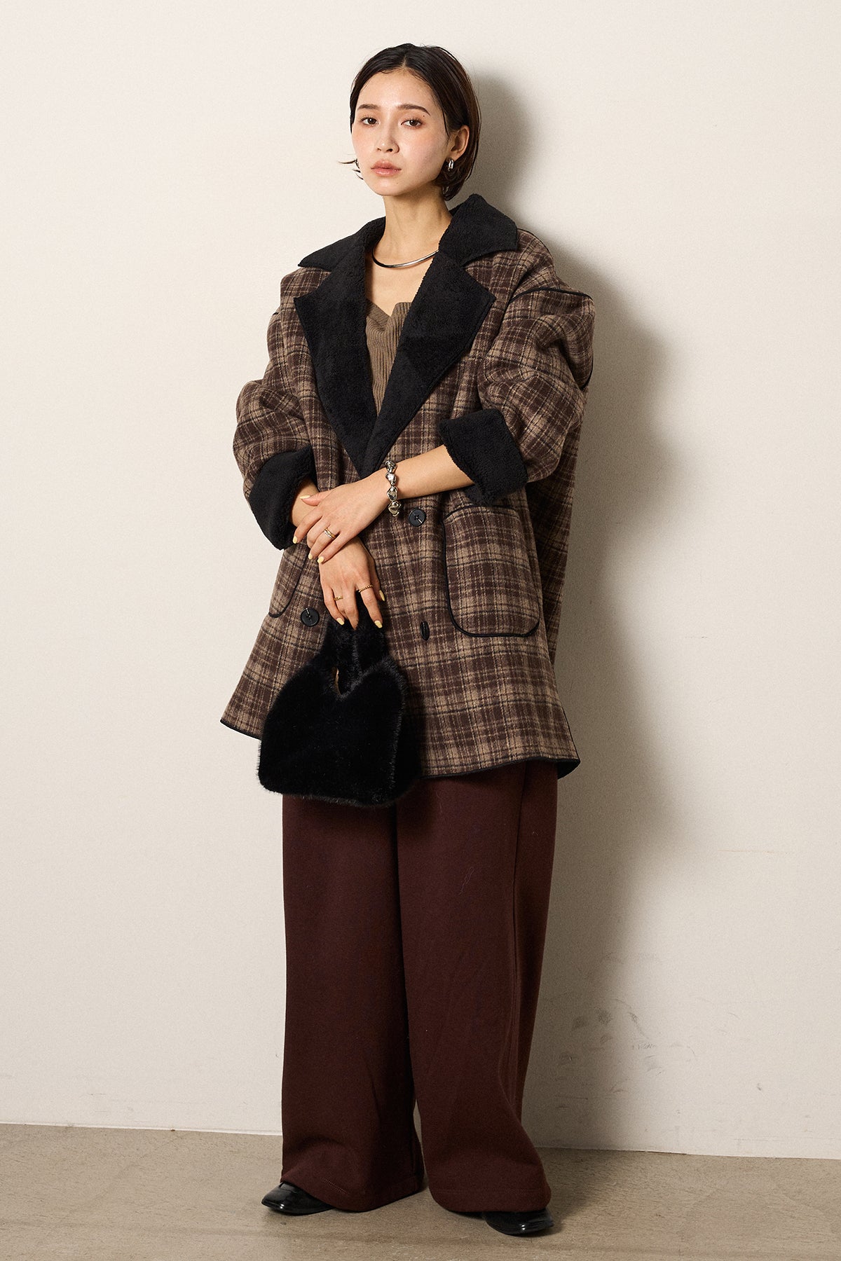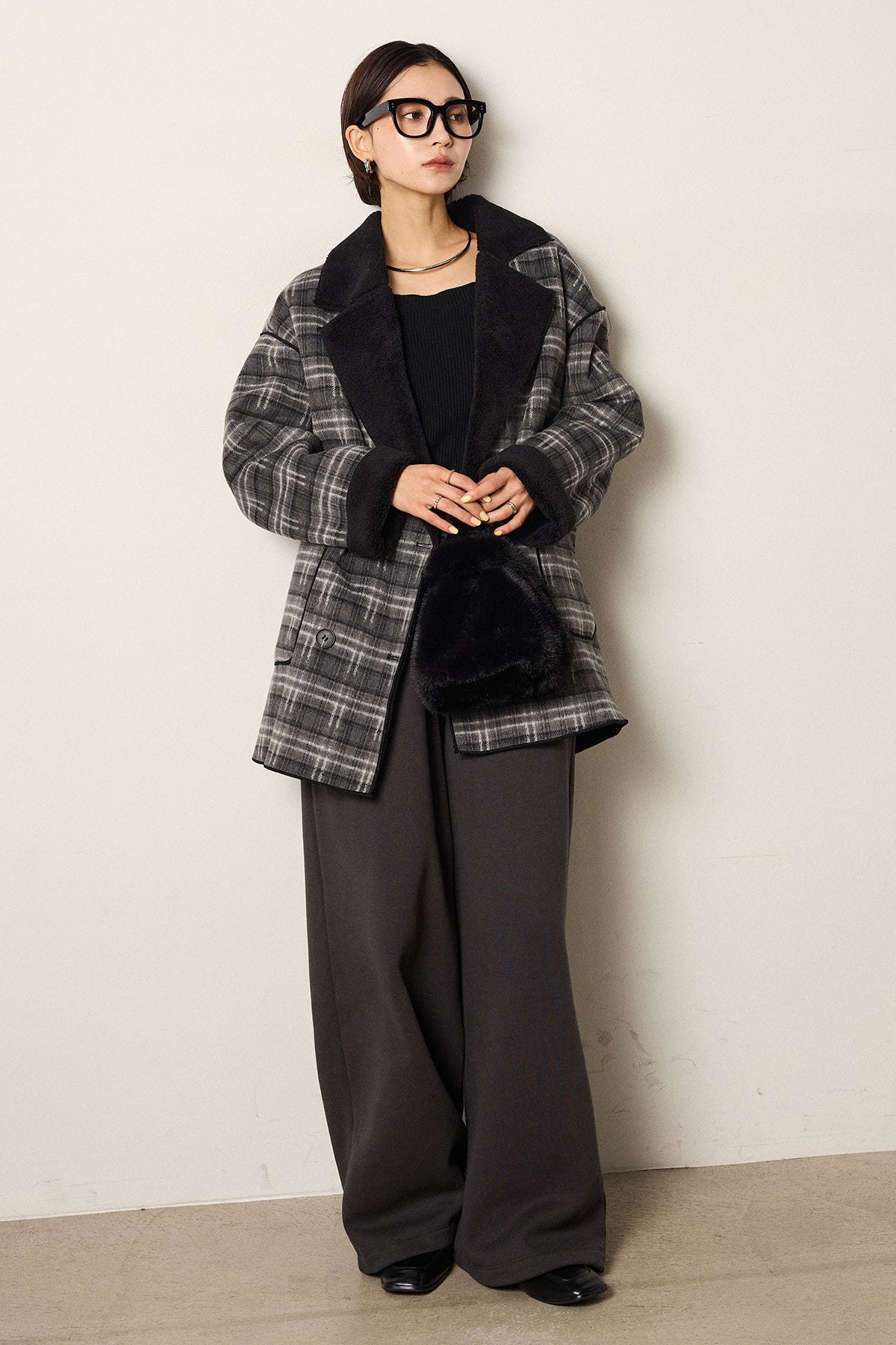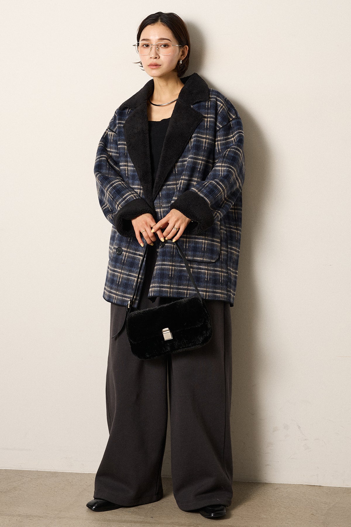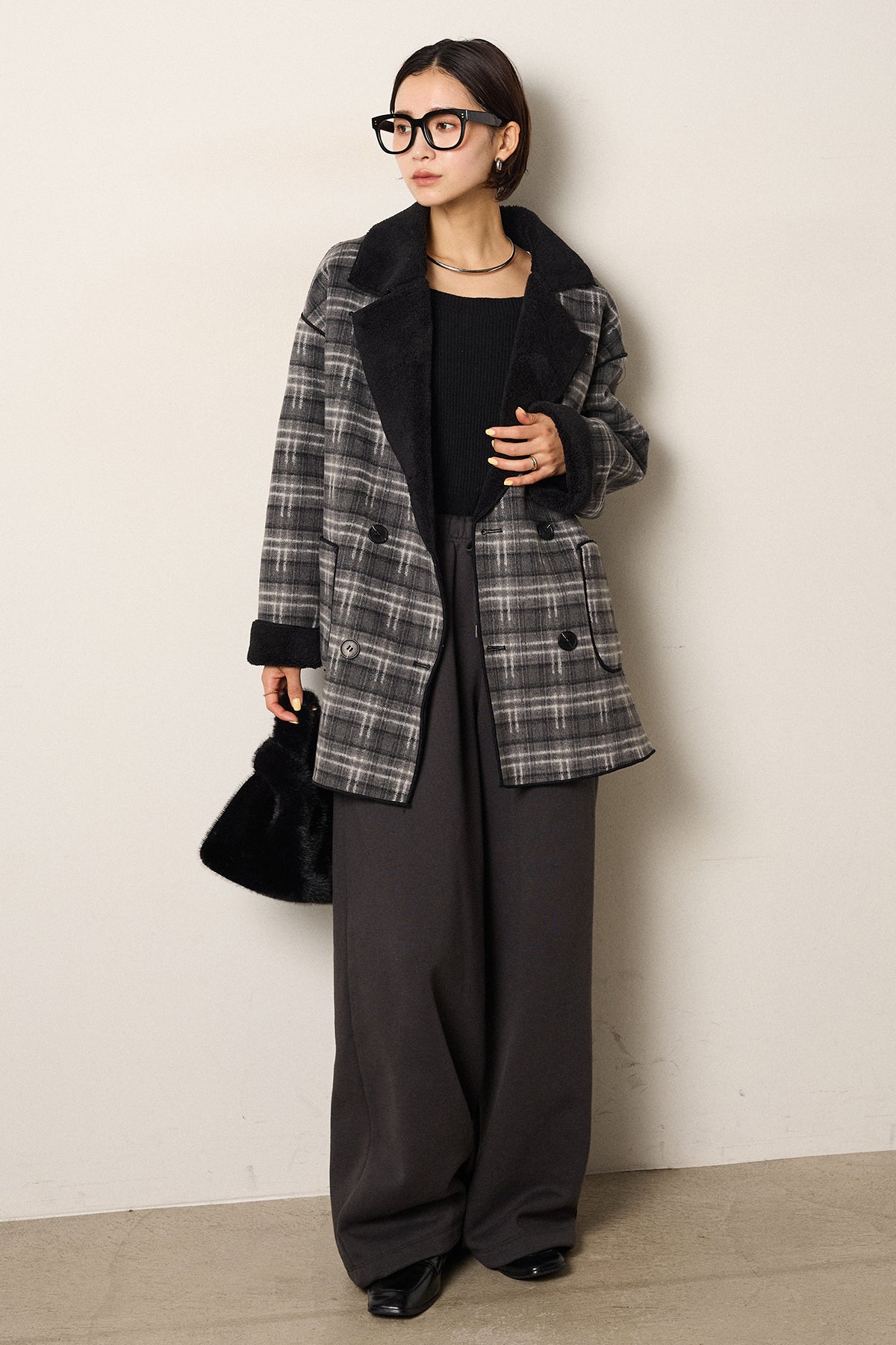[SET]裏地ボアタータンチェック柄ミディアムコート+裏起毛スウェットワイドパンツ(2set)